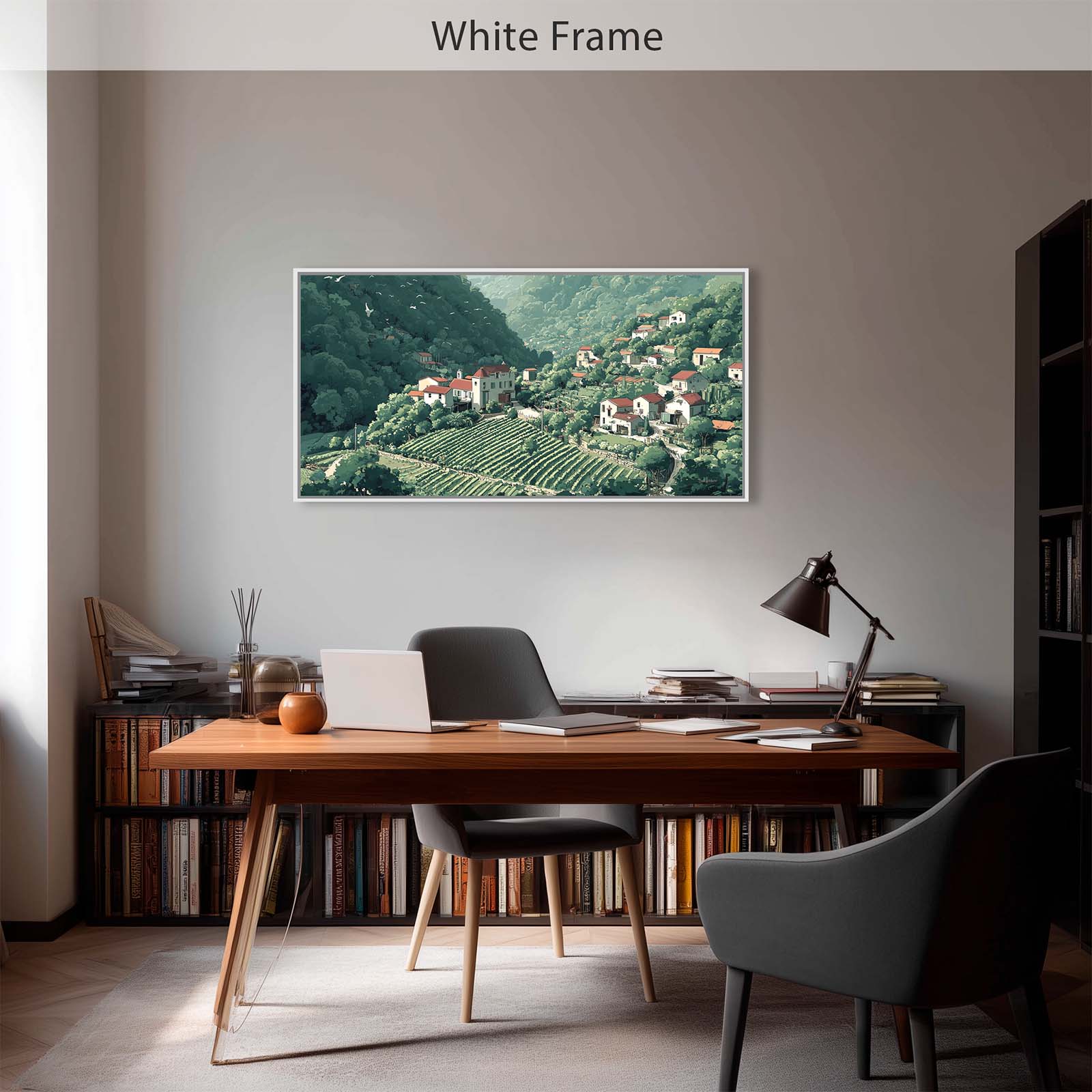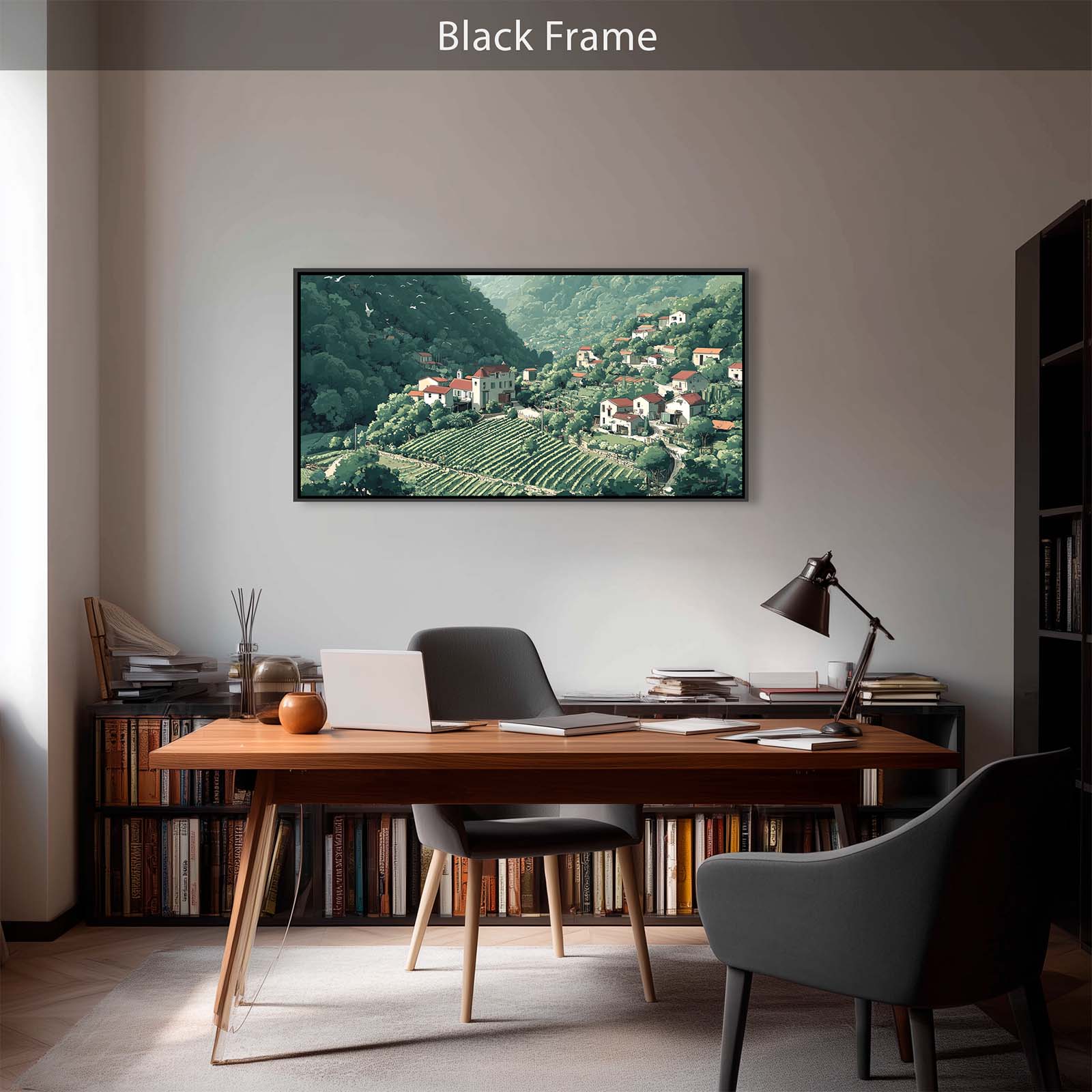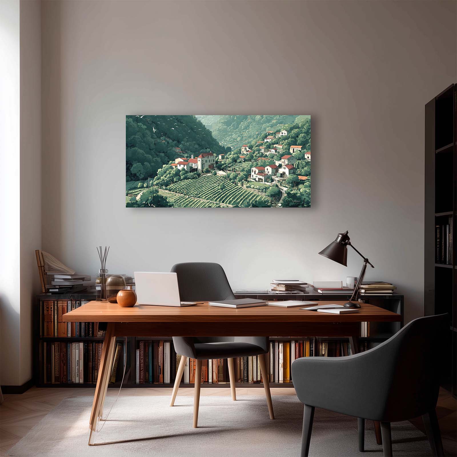 The scene’s gentle forms and harmonious palette bring a refined touch of nature and culture into your home or office, blending easily with a wide range of interior styles. Full of thoughtful detail, this piece celebrates the quiet bounty of life in a mountain village.