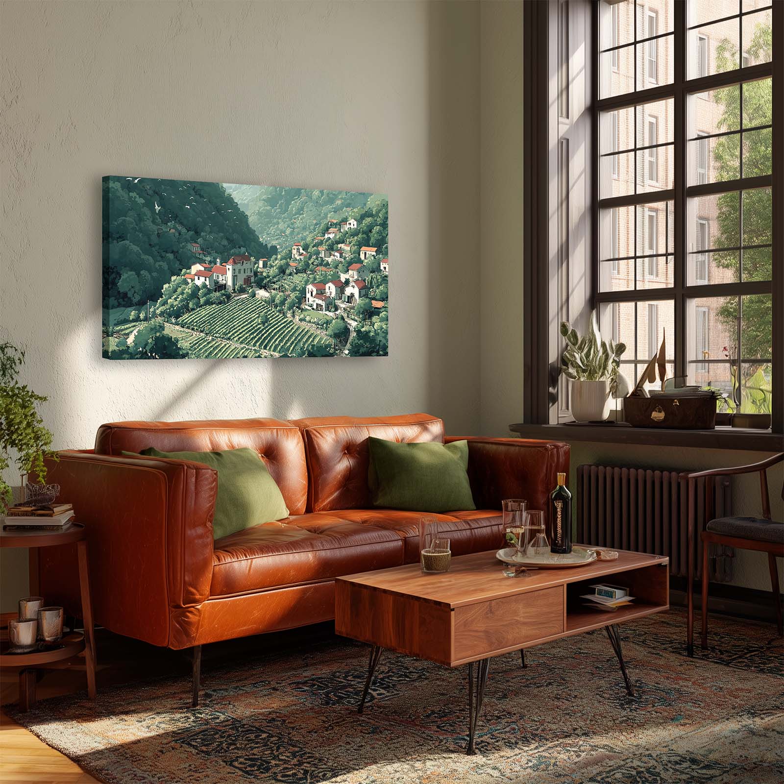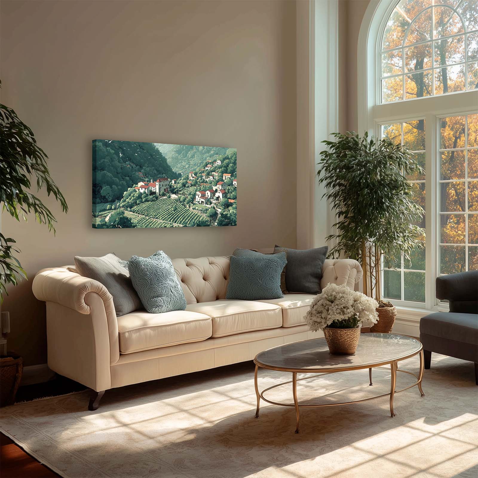Discover the quiet charm of northern Italy with Alpine Village, a warm and peaceful portrait of a village nestled in Italy's Aosta Valley. This artwork invites you into a sunlit landscape of soft greens, rich terra cotta tones and timeless beauty.
