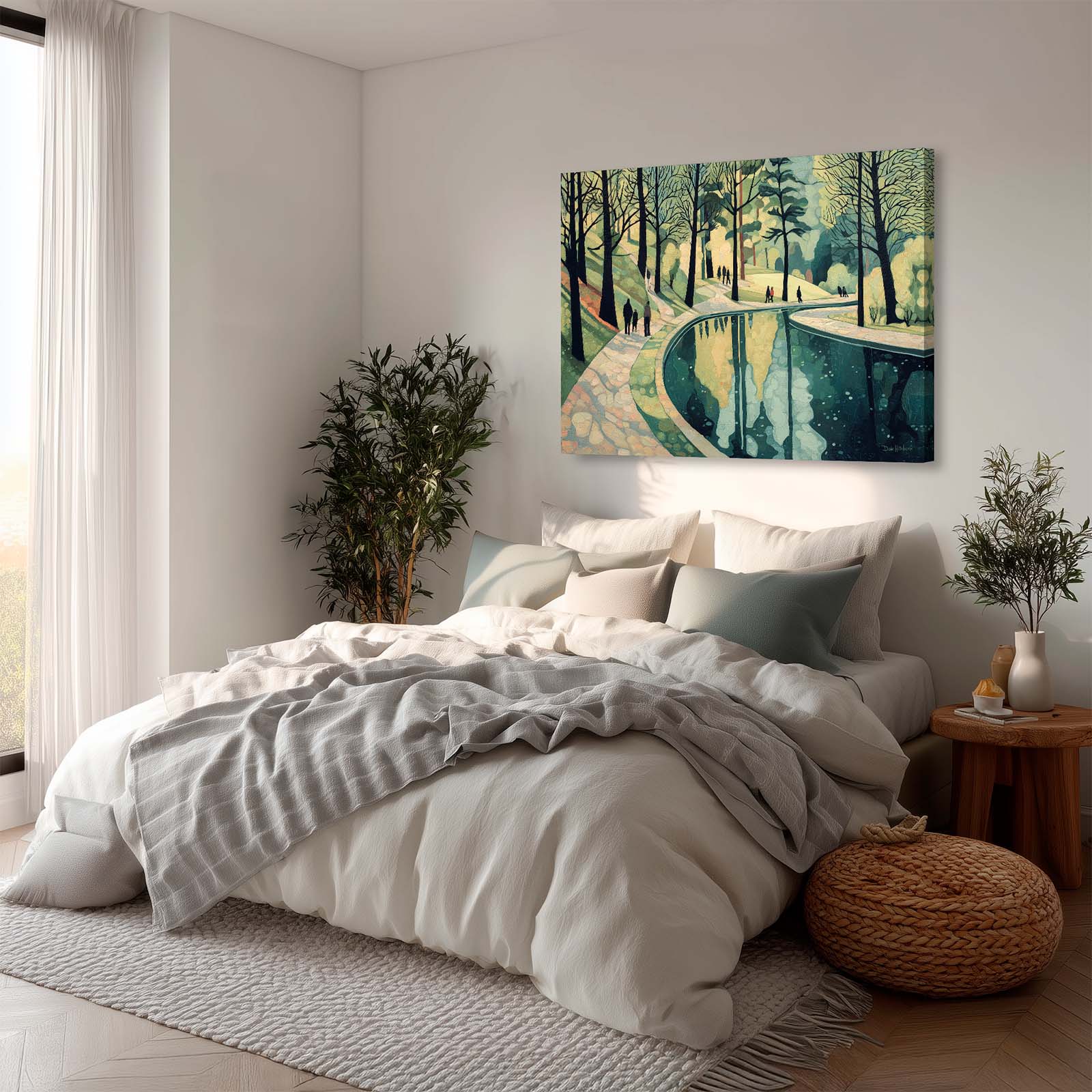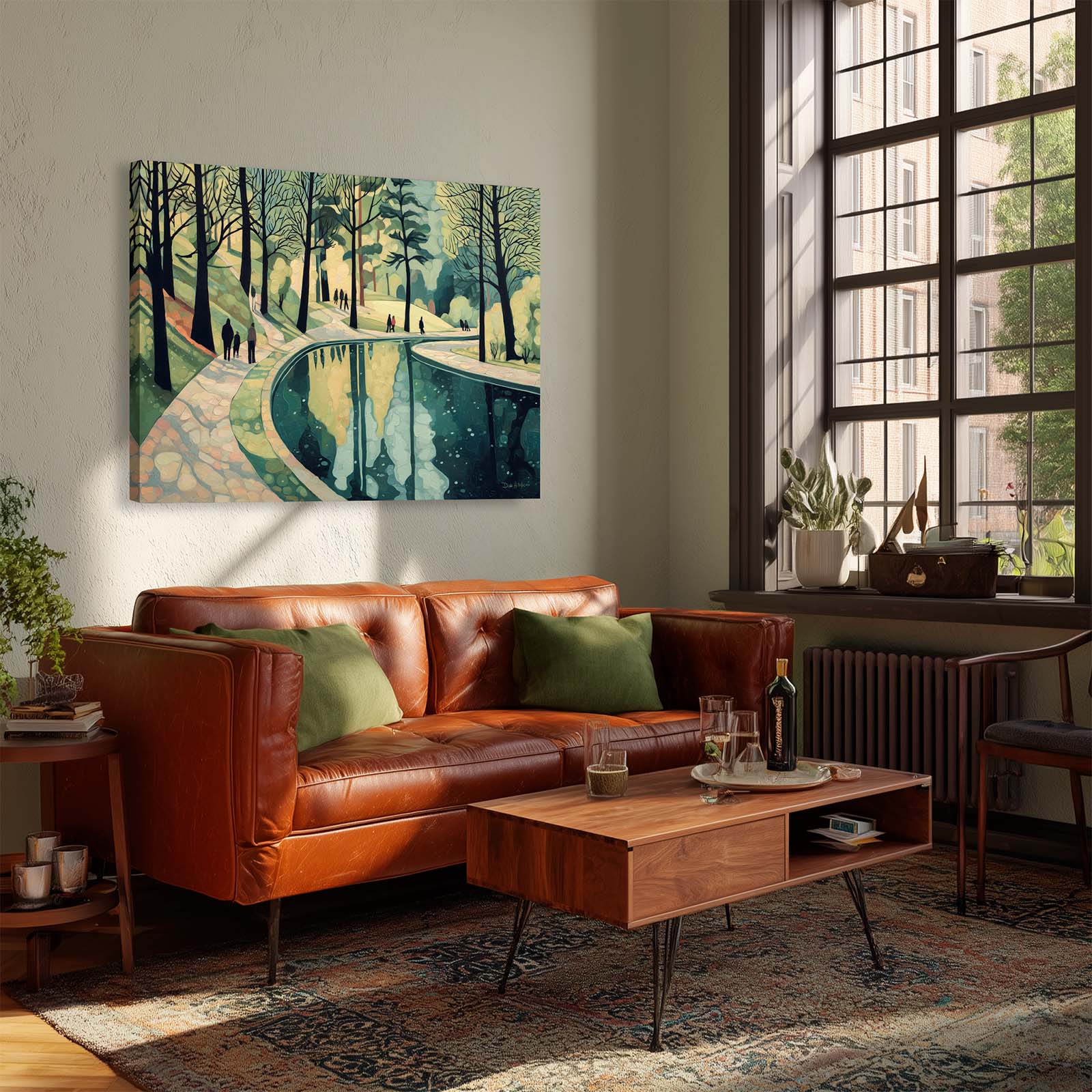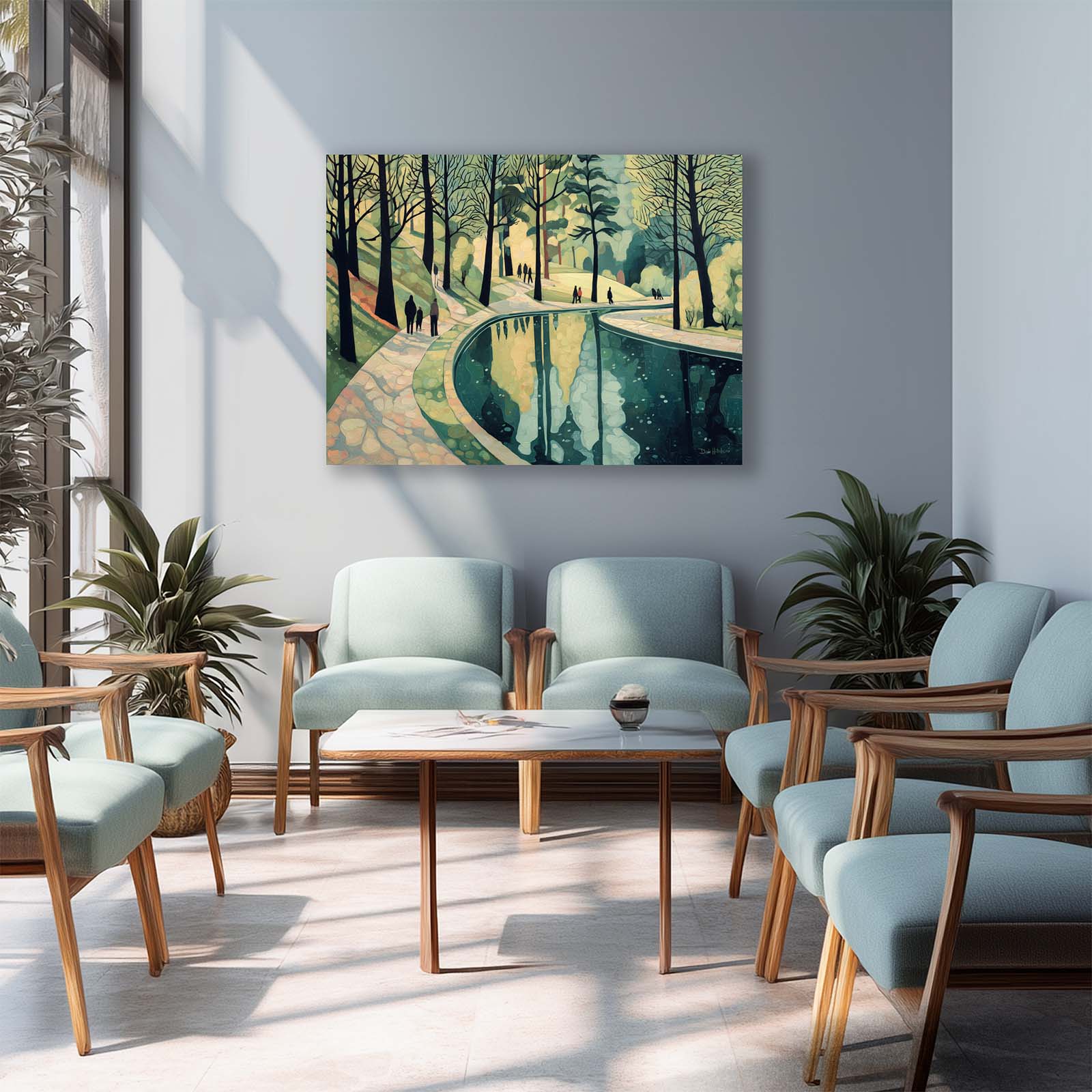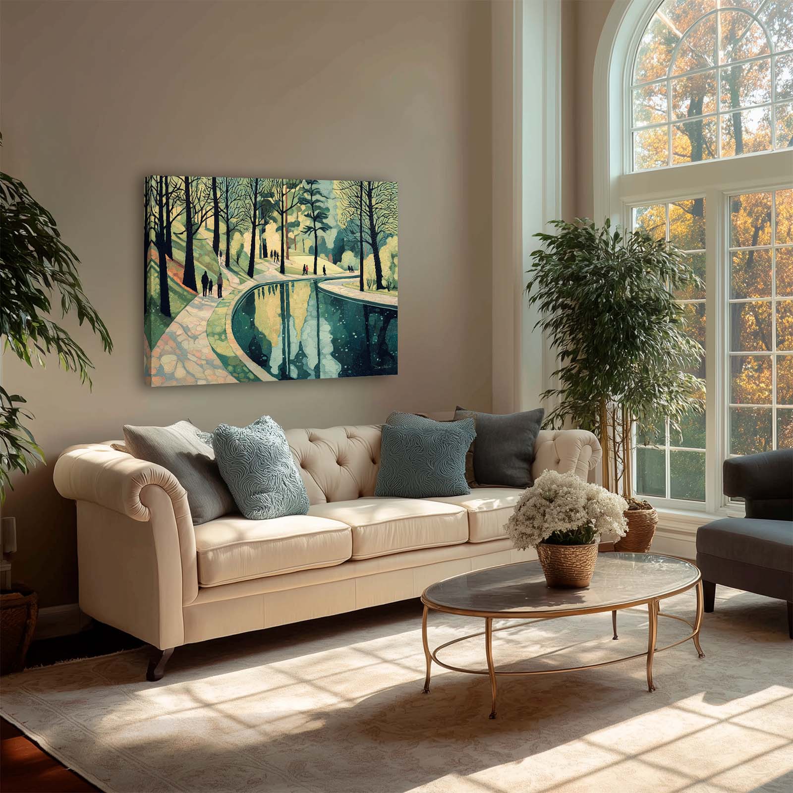 Capture the joy of a perfect summer day with this impressionistic canvas print. People strolling beside a shimmering stream in a lush city park bring warmth, life, and serene beauty to any room. Printed on premium giclée canvas, it enhances your home or office with timeless charm and a touch of peaceful elegance.