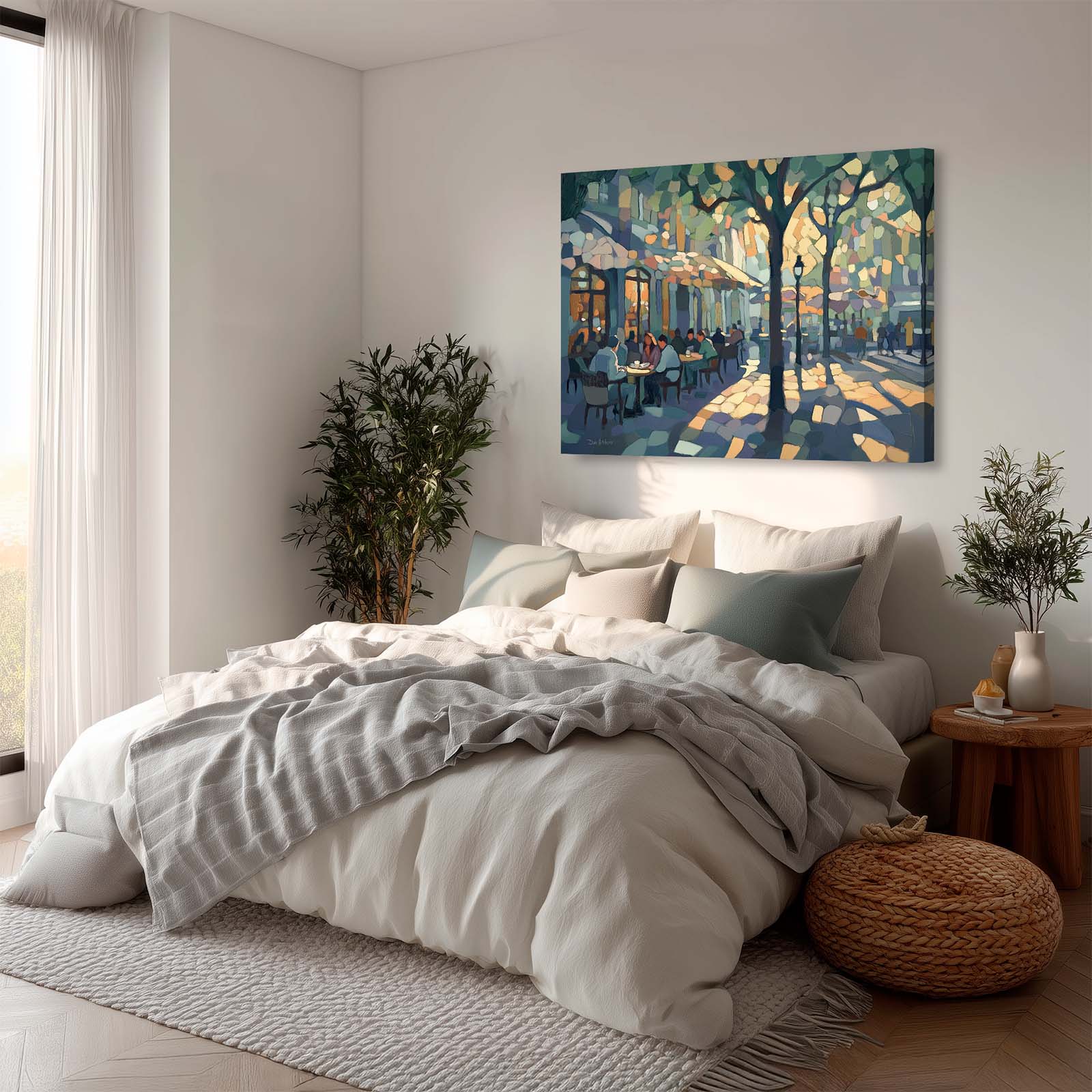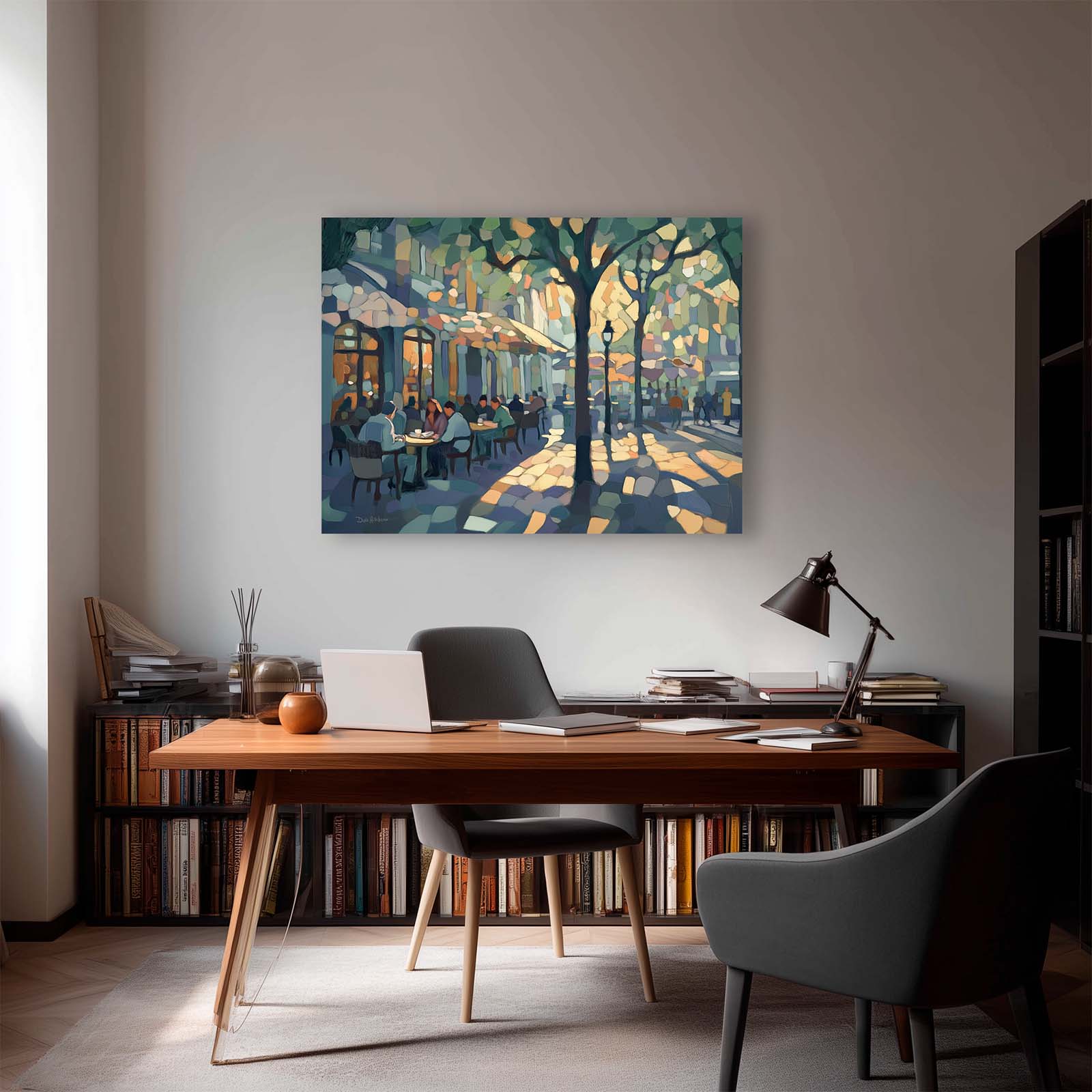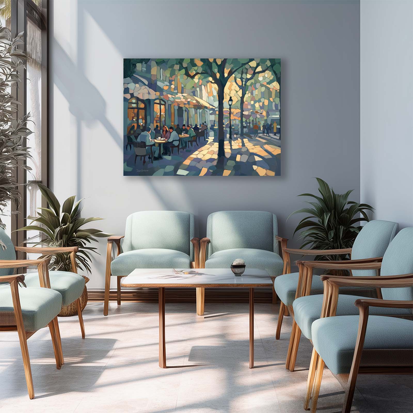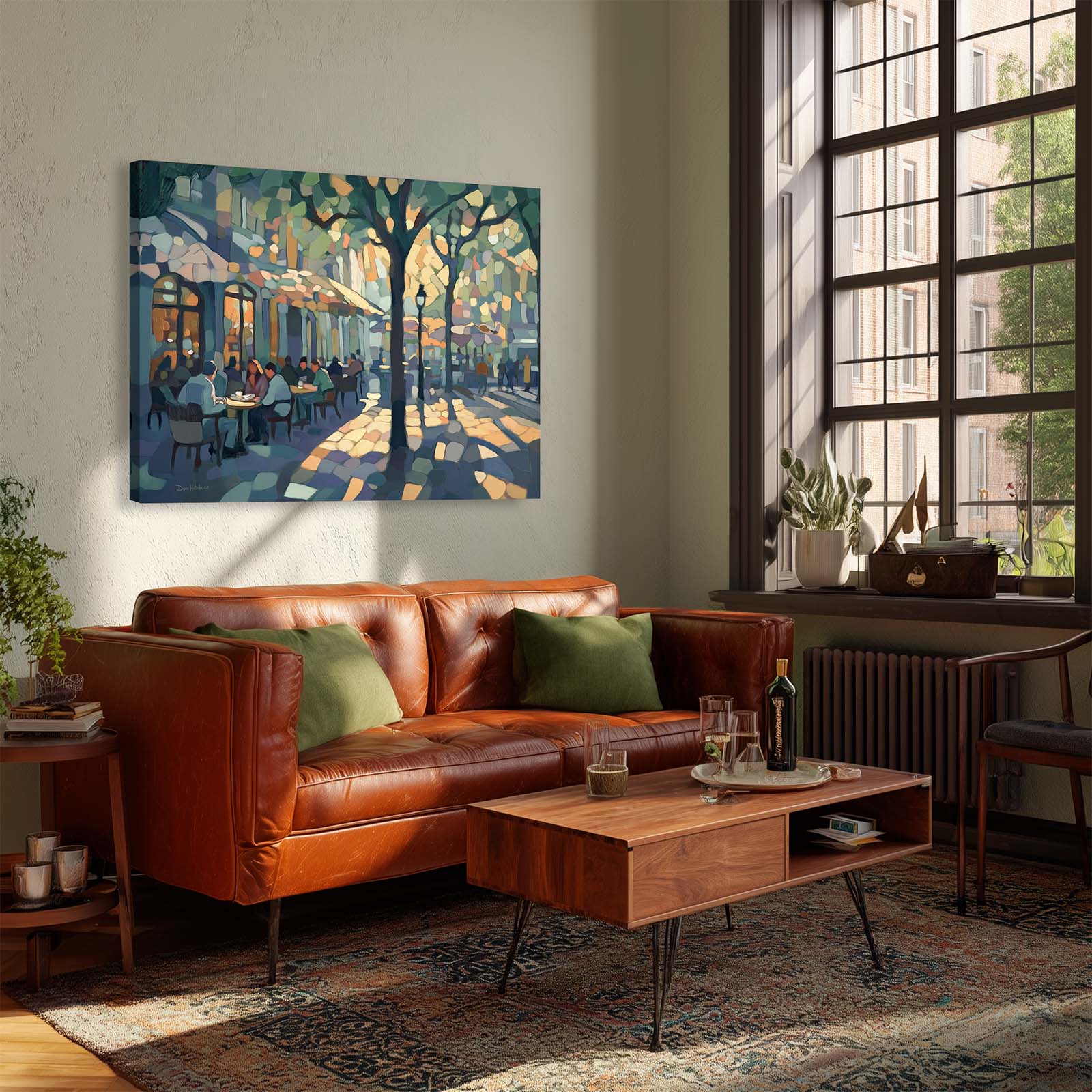 Experience the charm of a sunlit summer day in an old-town café with this impressionistic canvas print. Sunlight filters through trees onto cobblestones as people enjoy leisurely moments, bringing warmth, life, and timeless beauty to any room. Printed on premium giclée canvas, it enhances your home or office with elegance, character, and inviting ambiance.