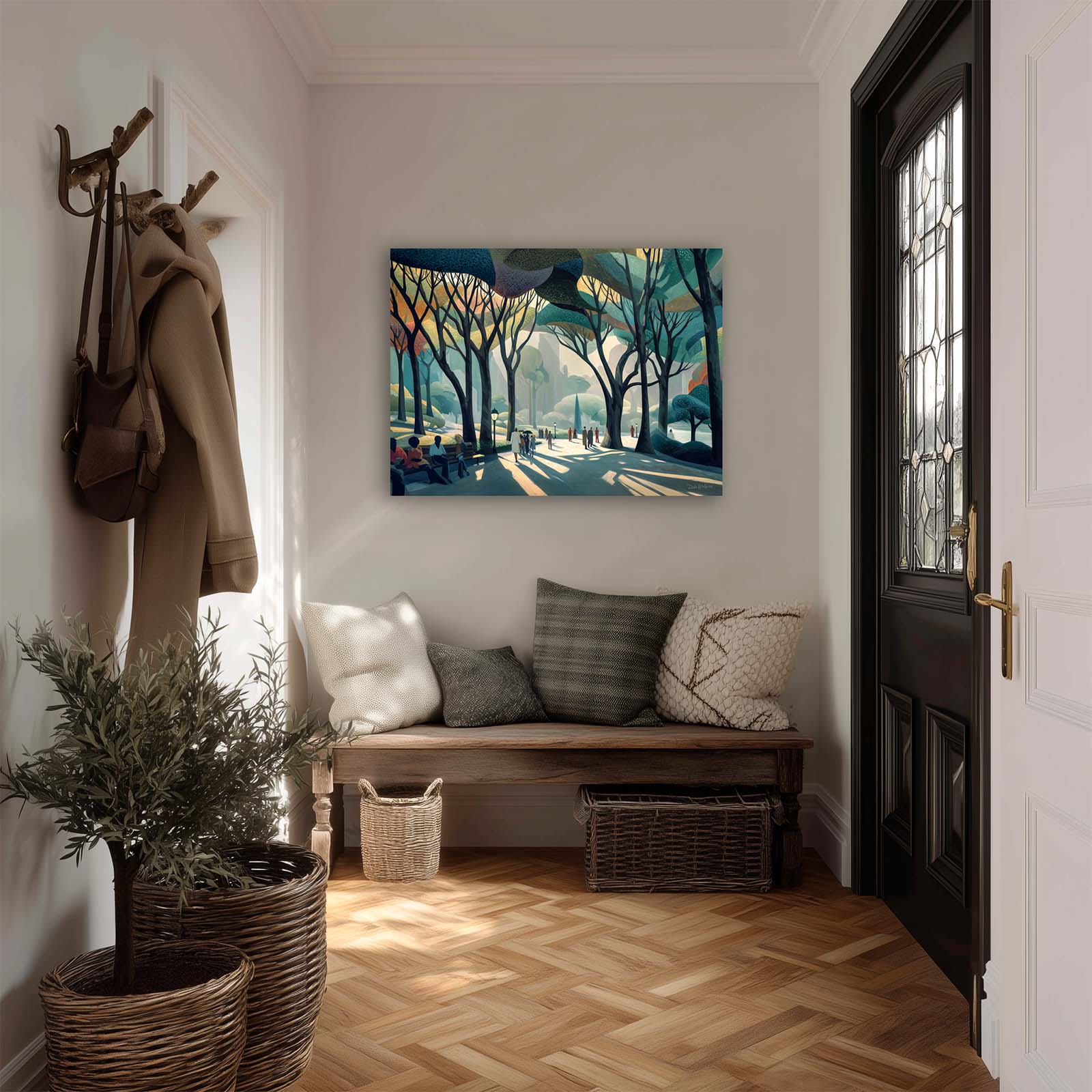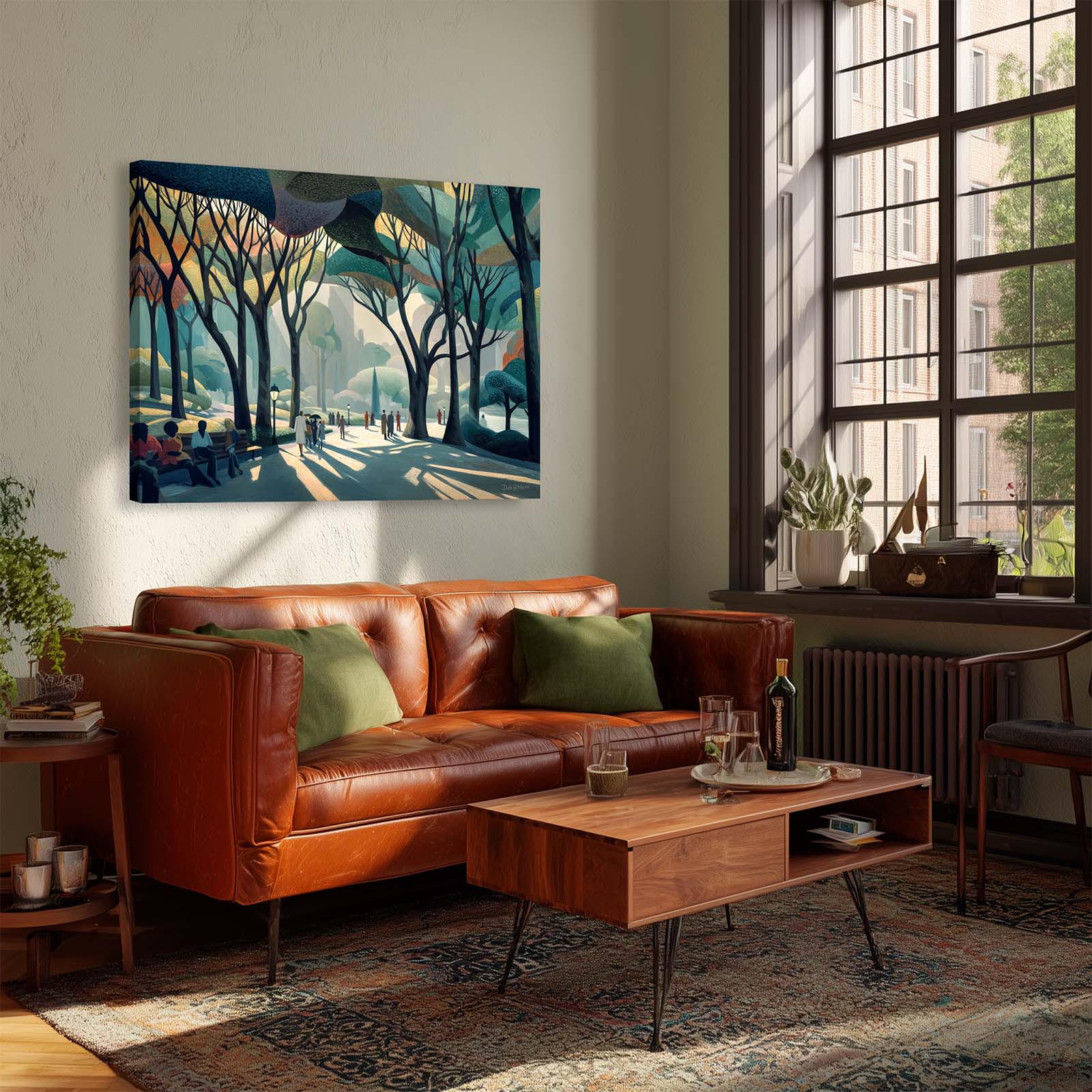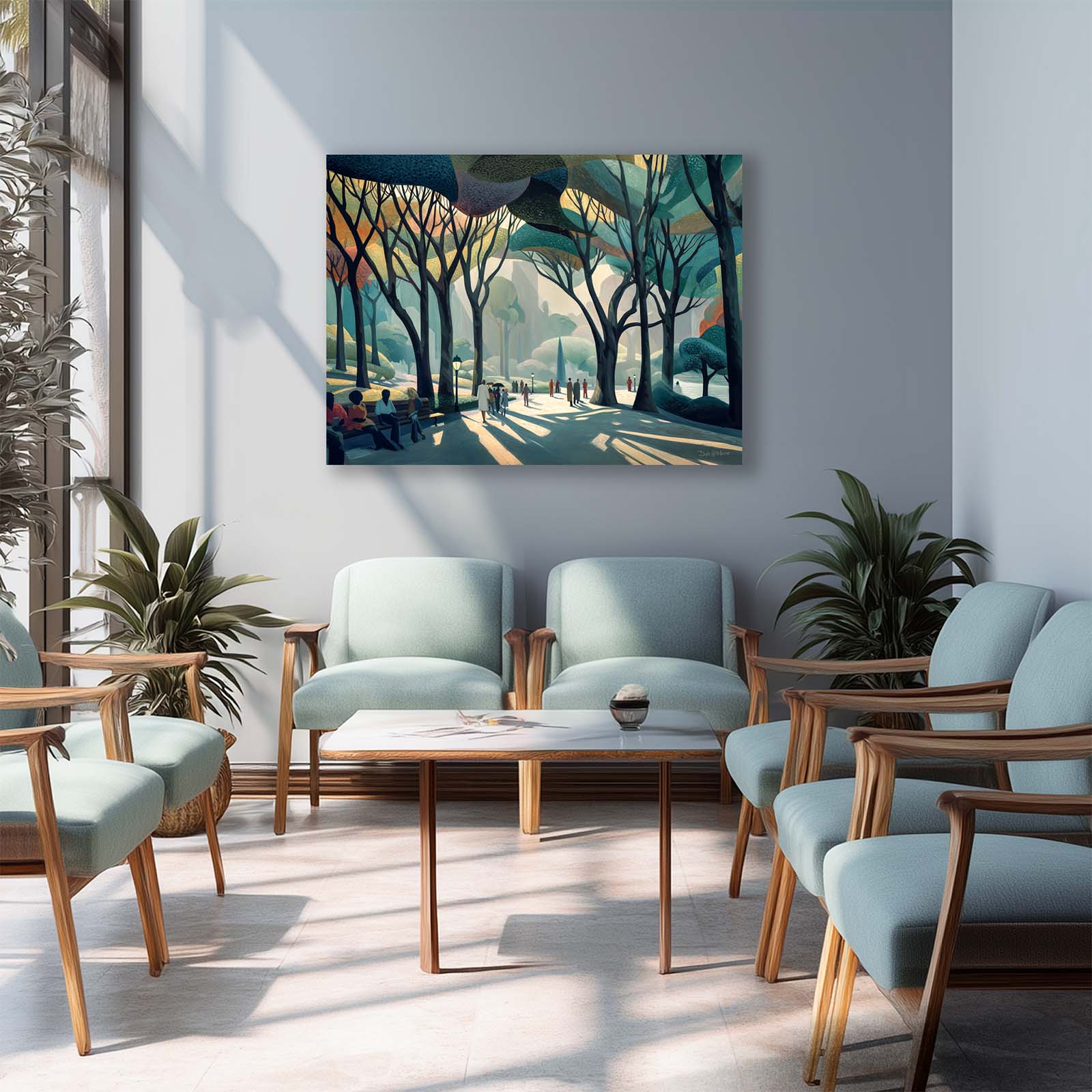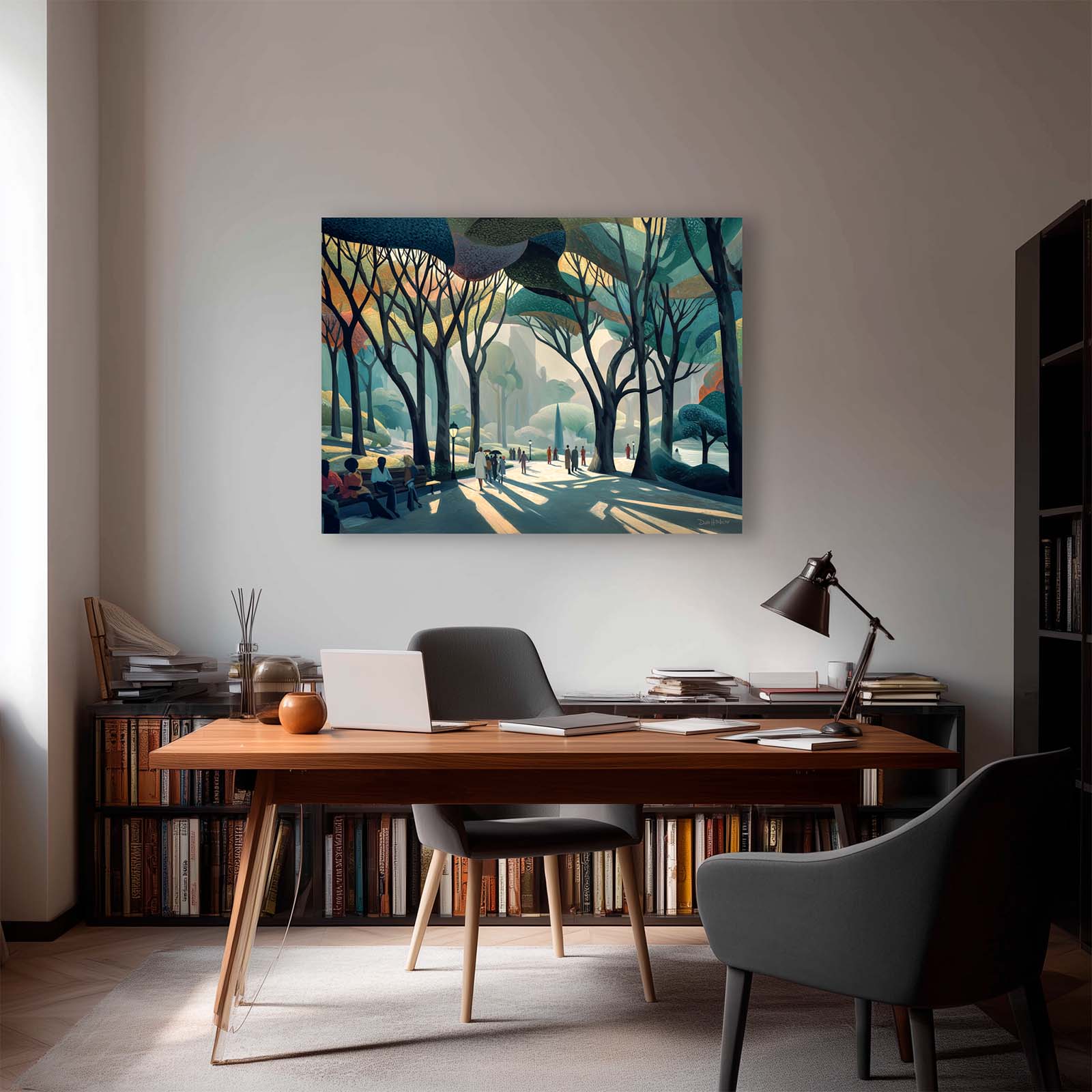 Capture the spirit of a summer day in the city with this gestural, playful artwork depicting a vibrant park scene. Delicate, easy-to-match colors and expressive brush-like forms invite you into a moment of movement, laughter and light beneath the sculptural shapes of branching trees.