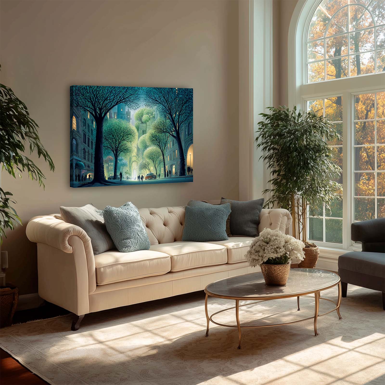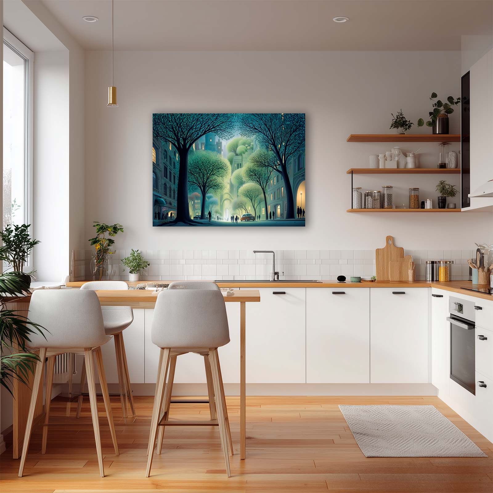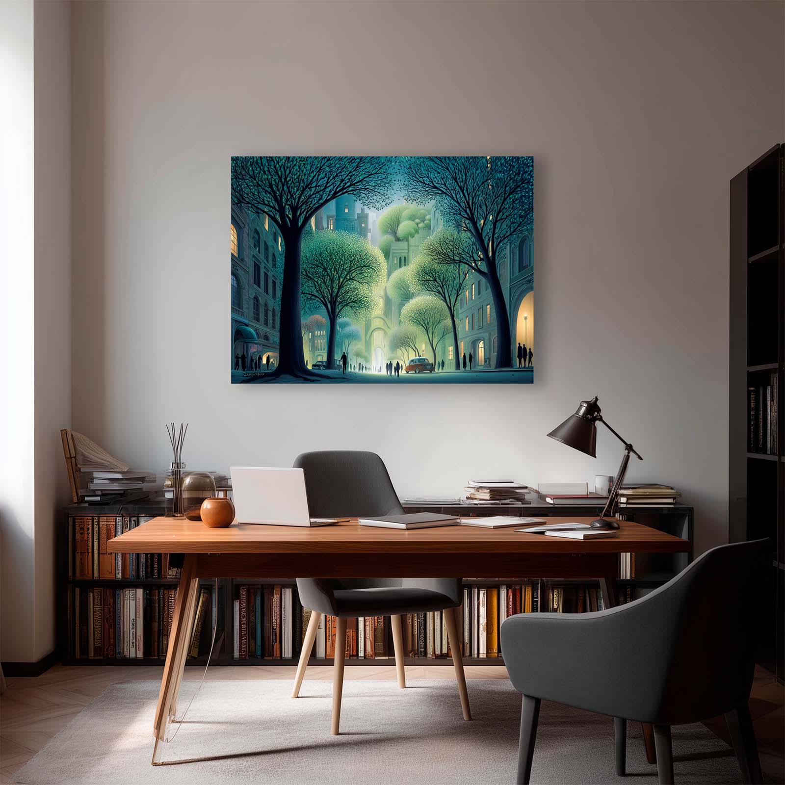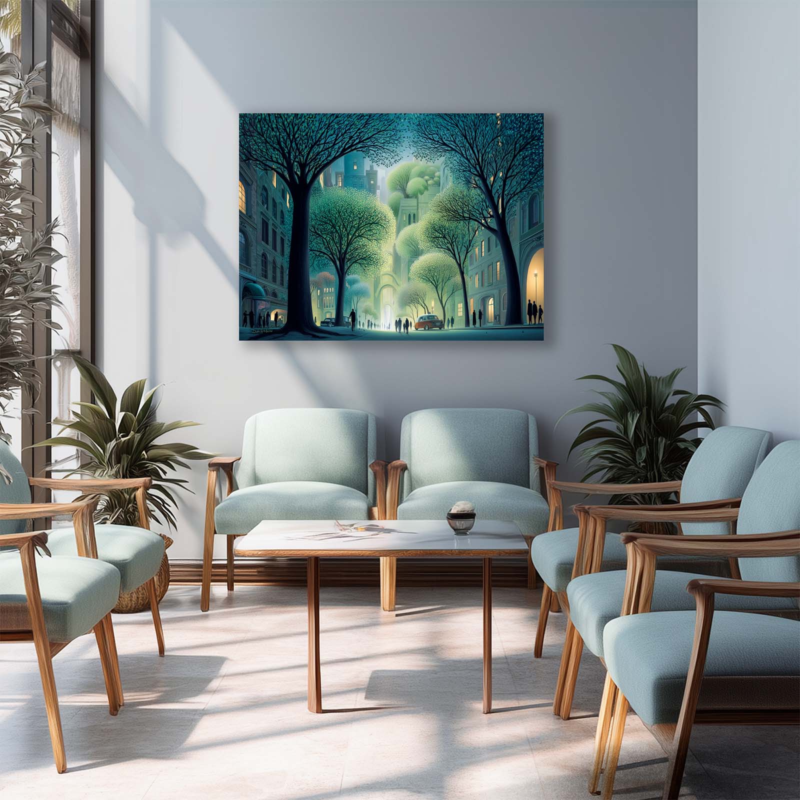 City Stroll captures a warm evening in the city, framed by tall, delicate trees. The street glows gently with the light from buildings as people stroll through the scene in quiet rhythm. Intriguing shapes and soft geometries emerge from the interplay of light, shadow and urban life—creating a composition that feels both modern and timeless.