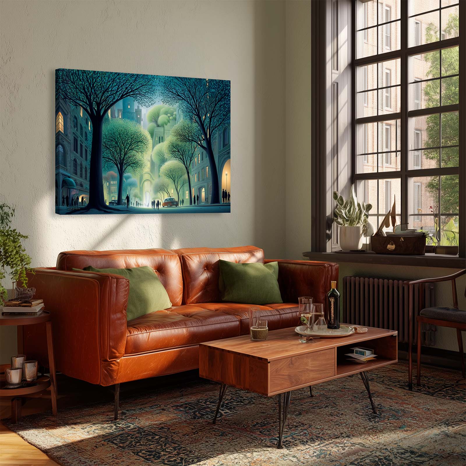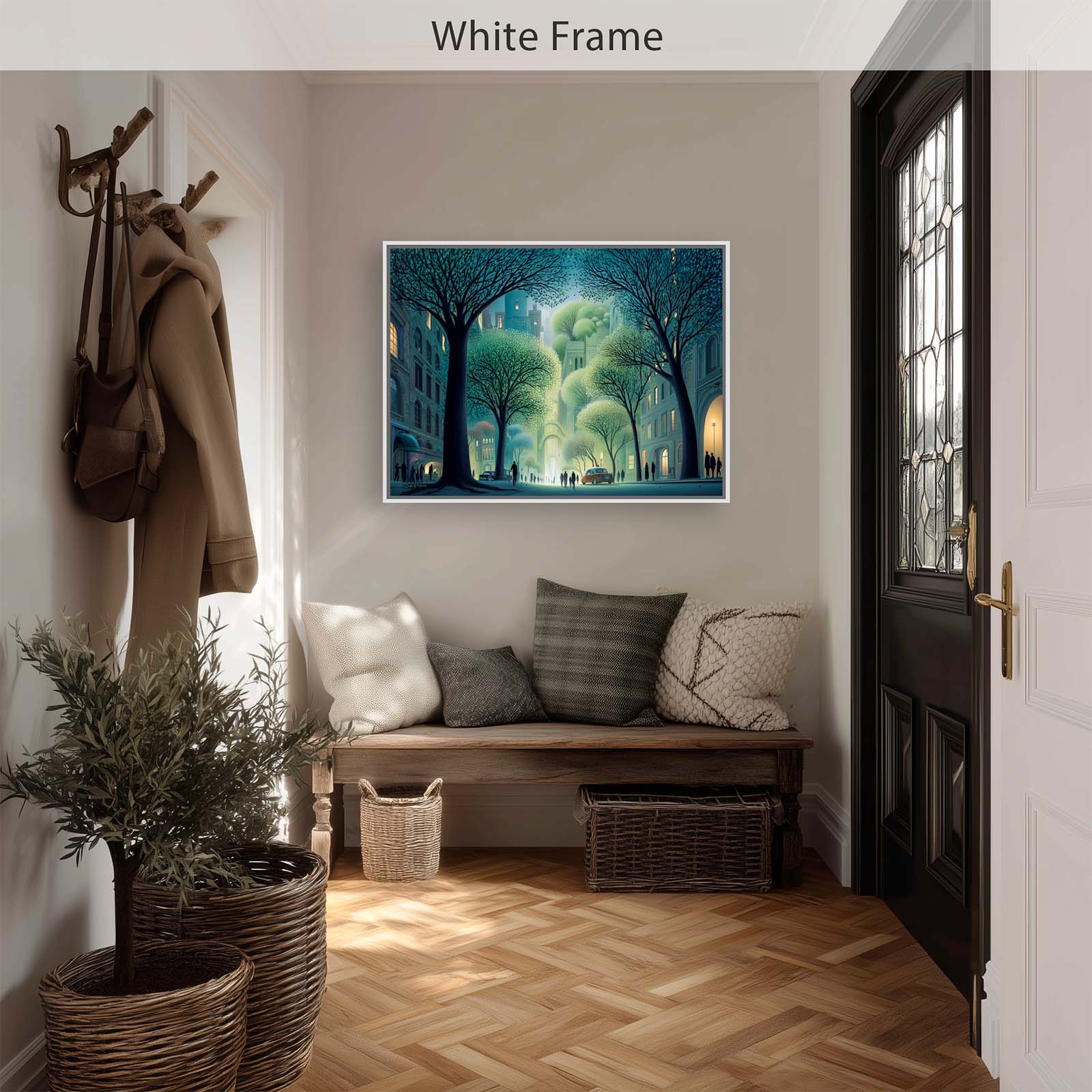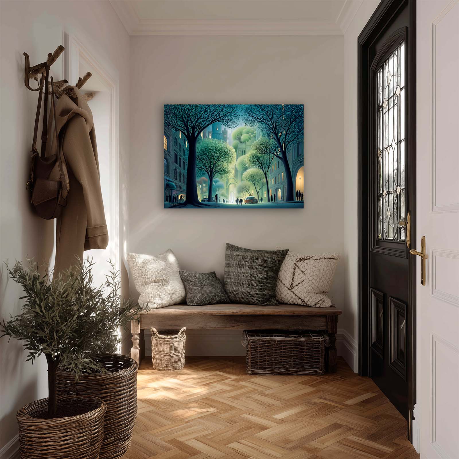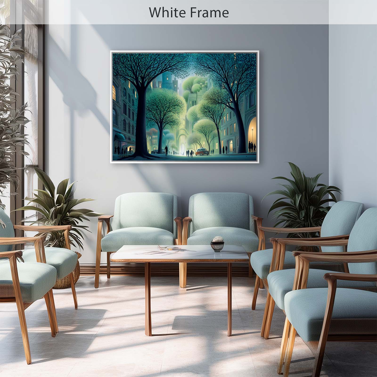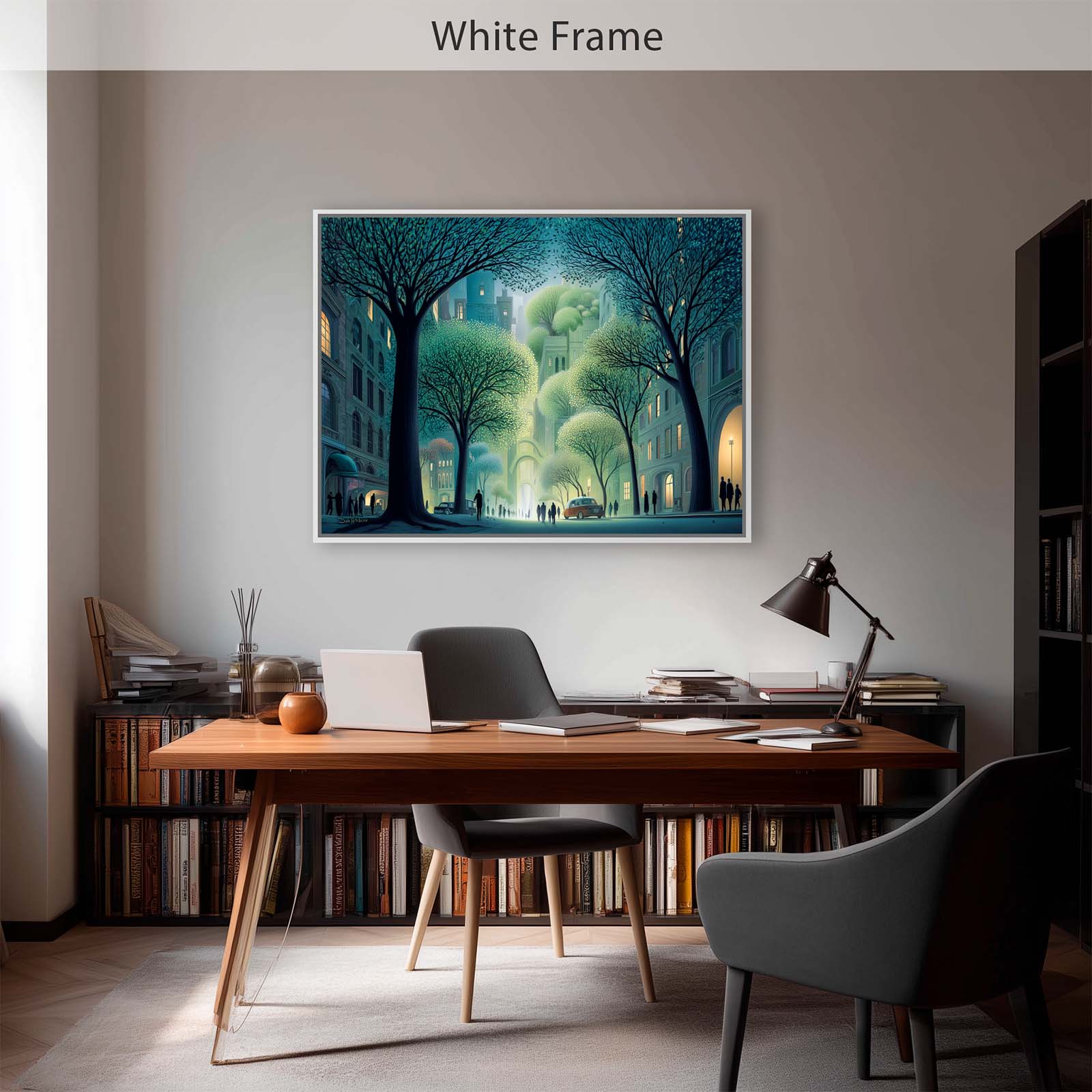 City Stroll captures a warm evening in the city, framed by tall, delicate trees. The street glows gently with the light from buildings as people stroll through the scene in quiet rhythm. Intriguing shapes and soft geometries emerge from the interplay of light, shadow and urban life—creating a composition that feels both modern and timeless.