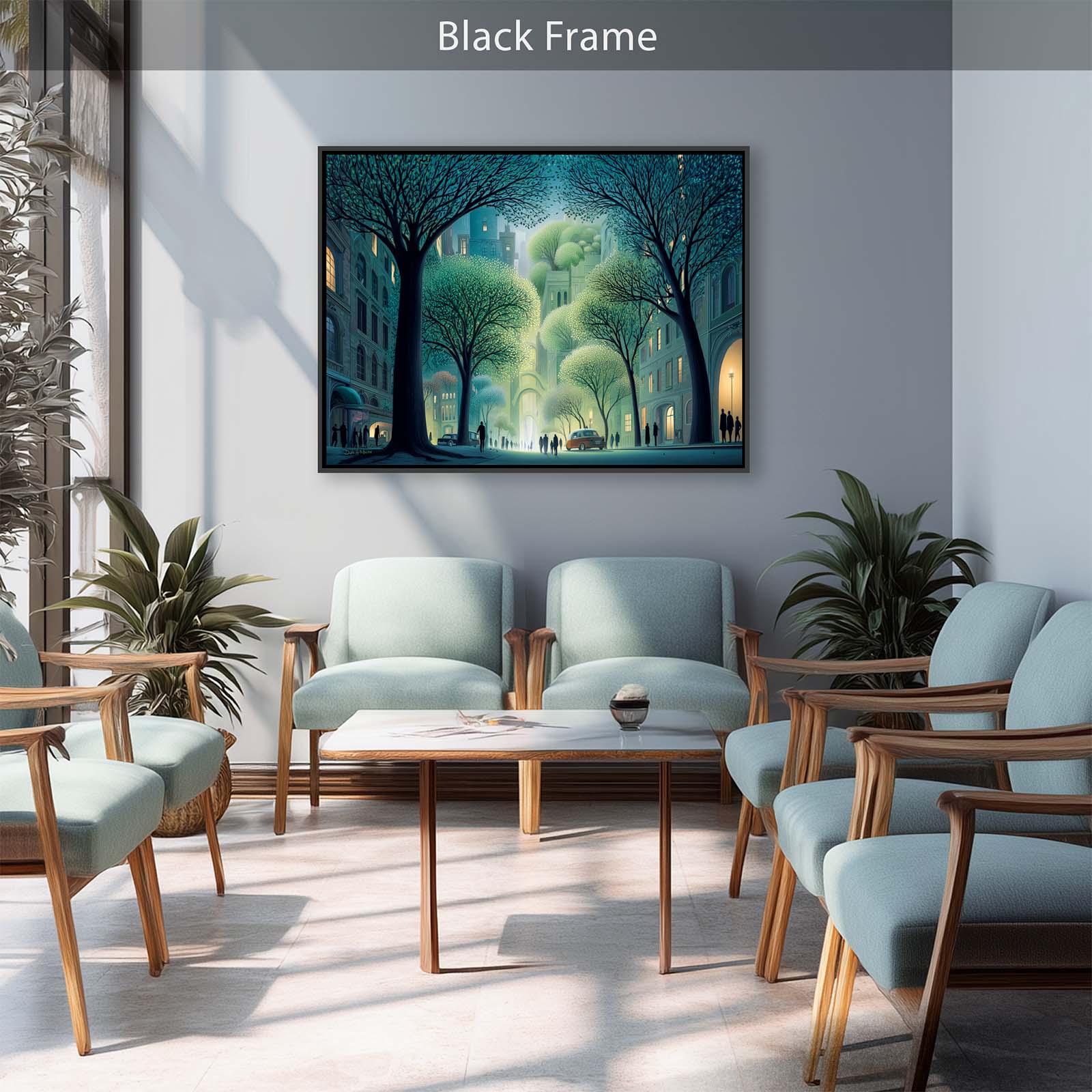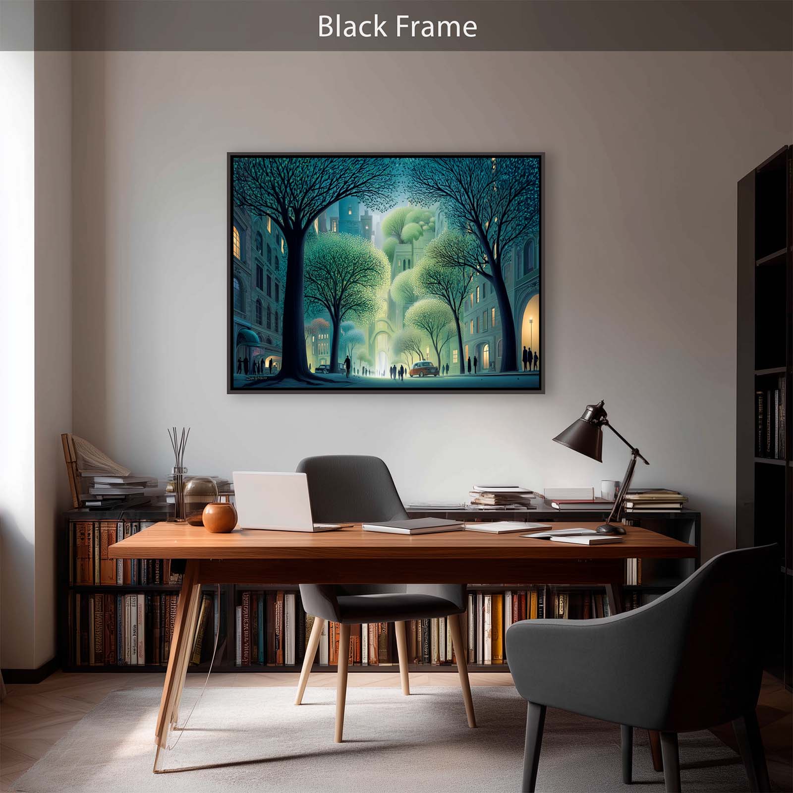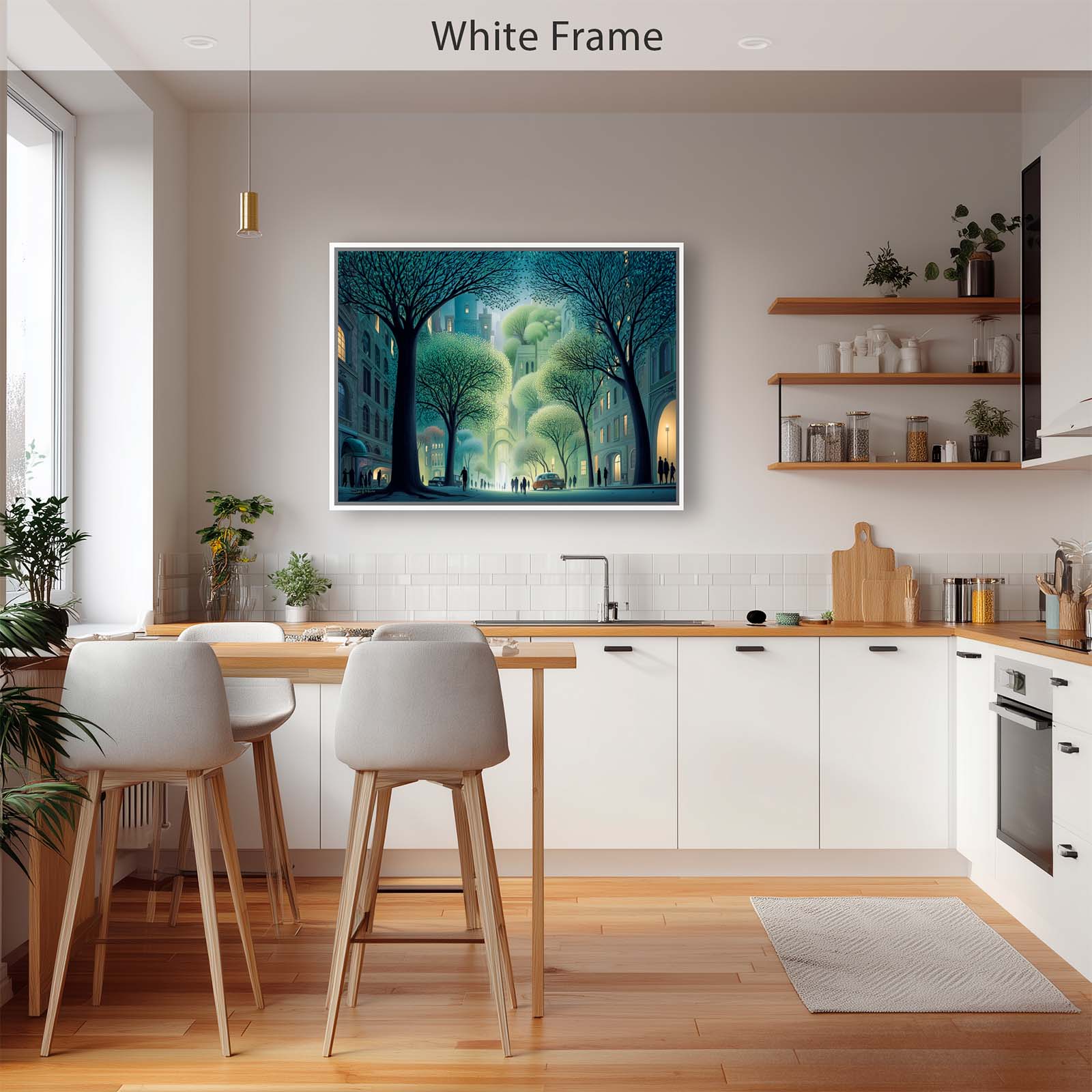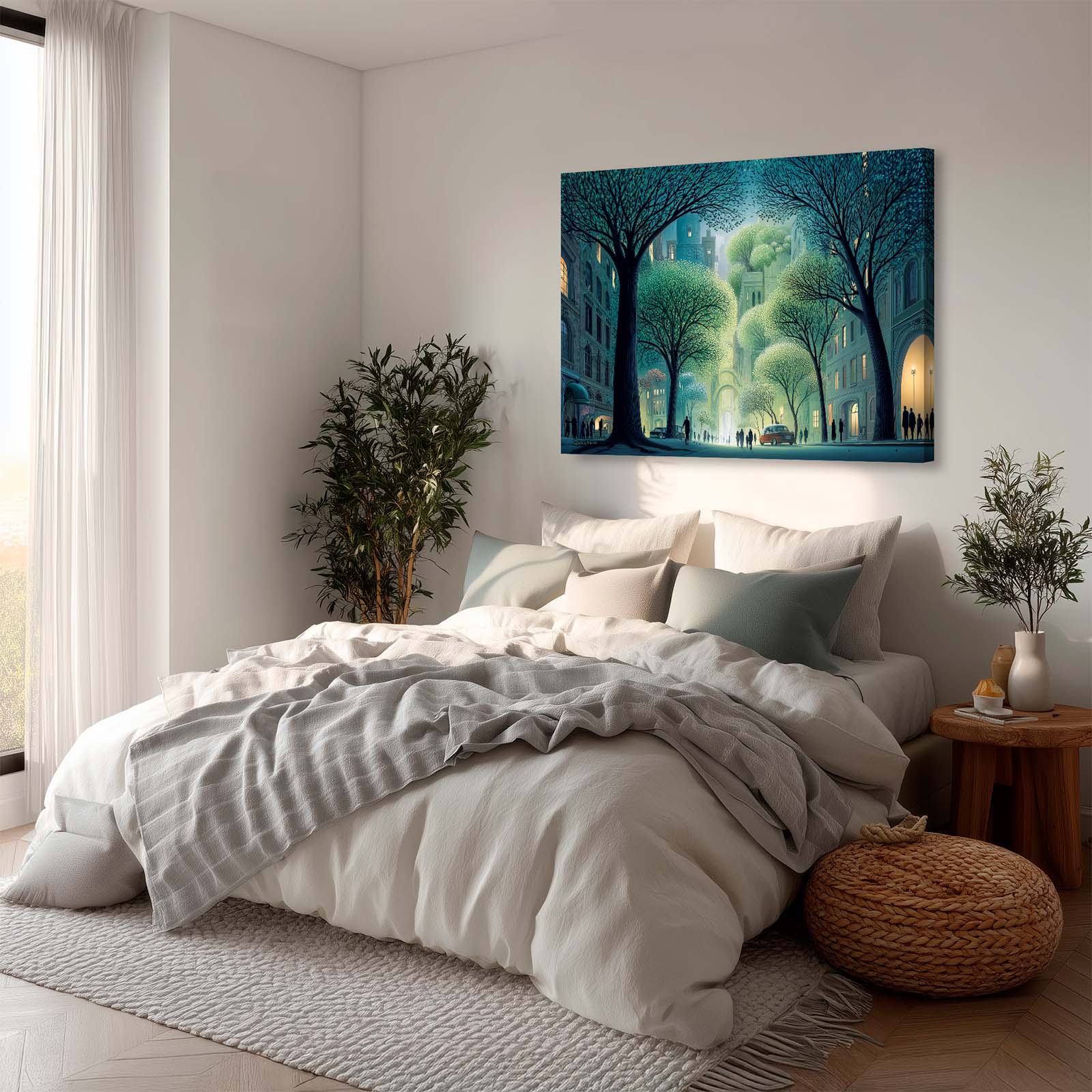 City Stroll captures a warm evening in the city, framed by tall, delicate trees. The street glows gently with the light from buildings as people stroll through the scene in quiet rhythm. Intriguing shapes and soft geometries emerge from the interplay of light, shadow and urban life—creating a composition that feels both modern and timeless.