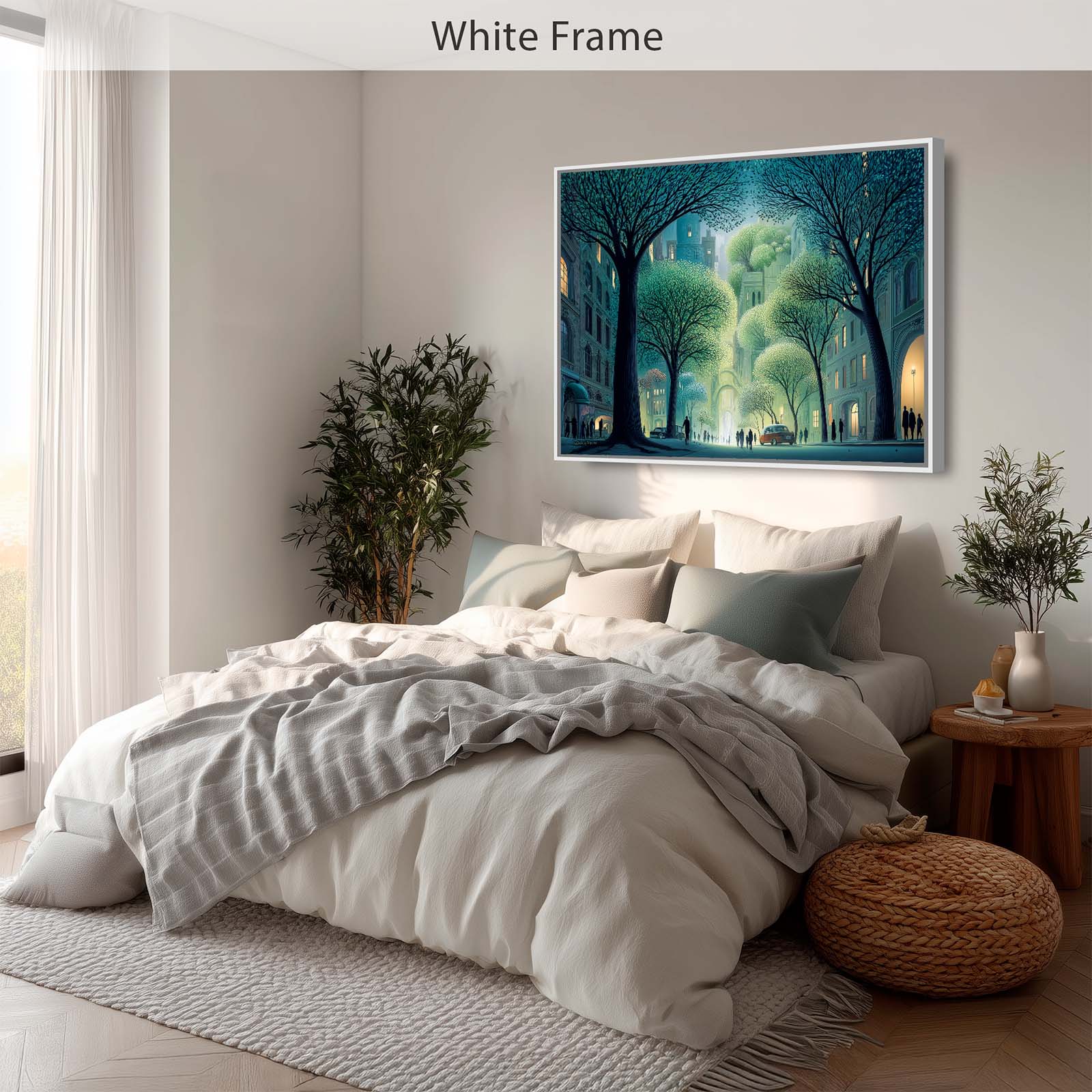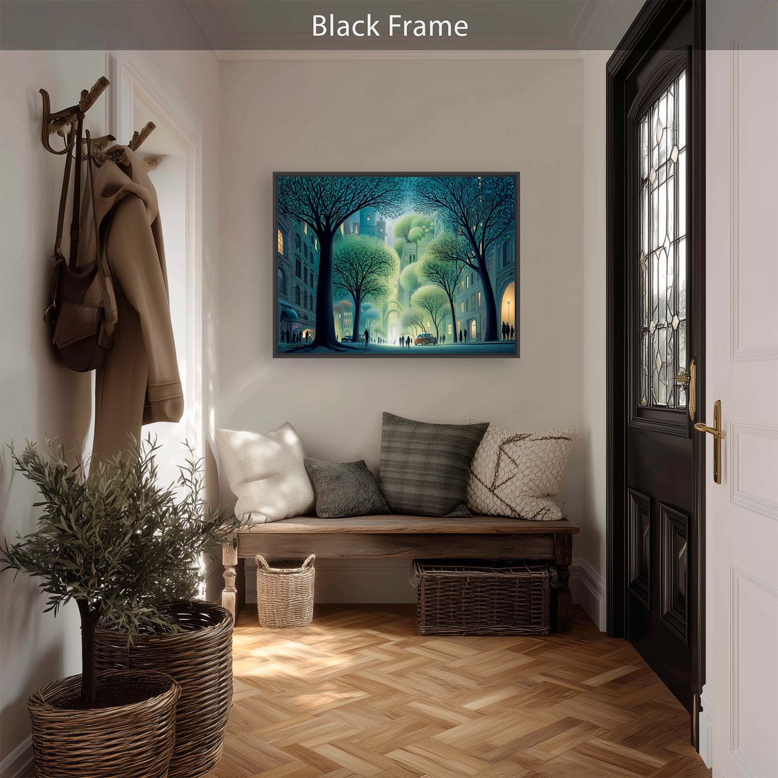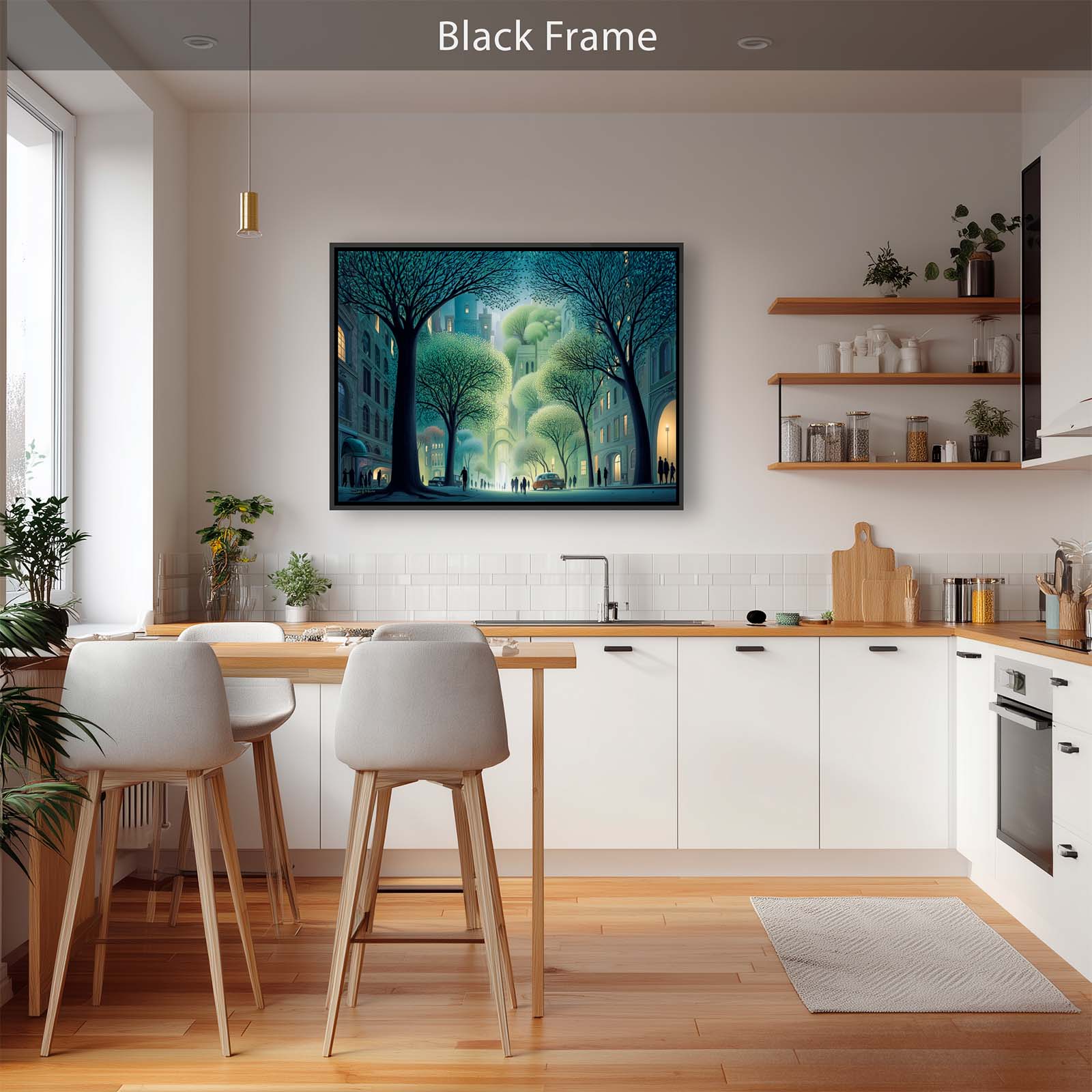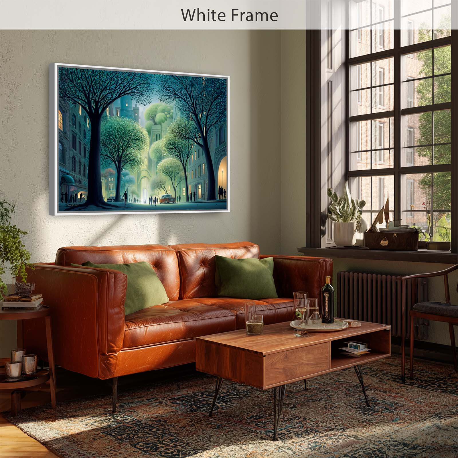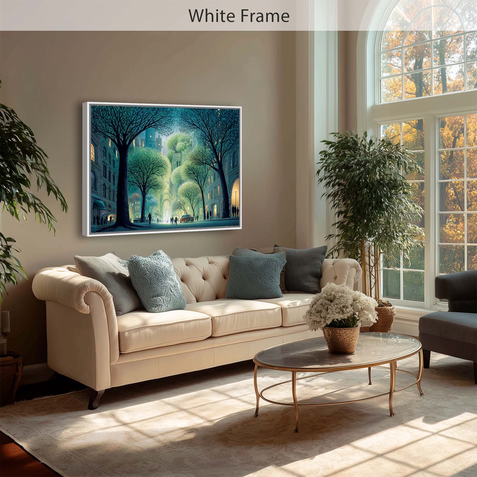 City Stroll captures a warm evening in the city, framed by tall, delicate trees. The street glows gently with the light from buildings as people stroll through the scene in quiet rhythm. Intriguing shapes and soft geometries emerge from the interplay of light, shadow and urban life—creating a composition that feels both modern and timeless.