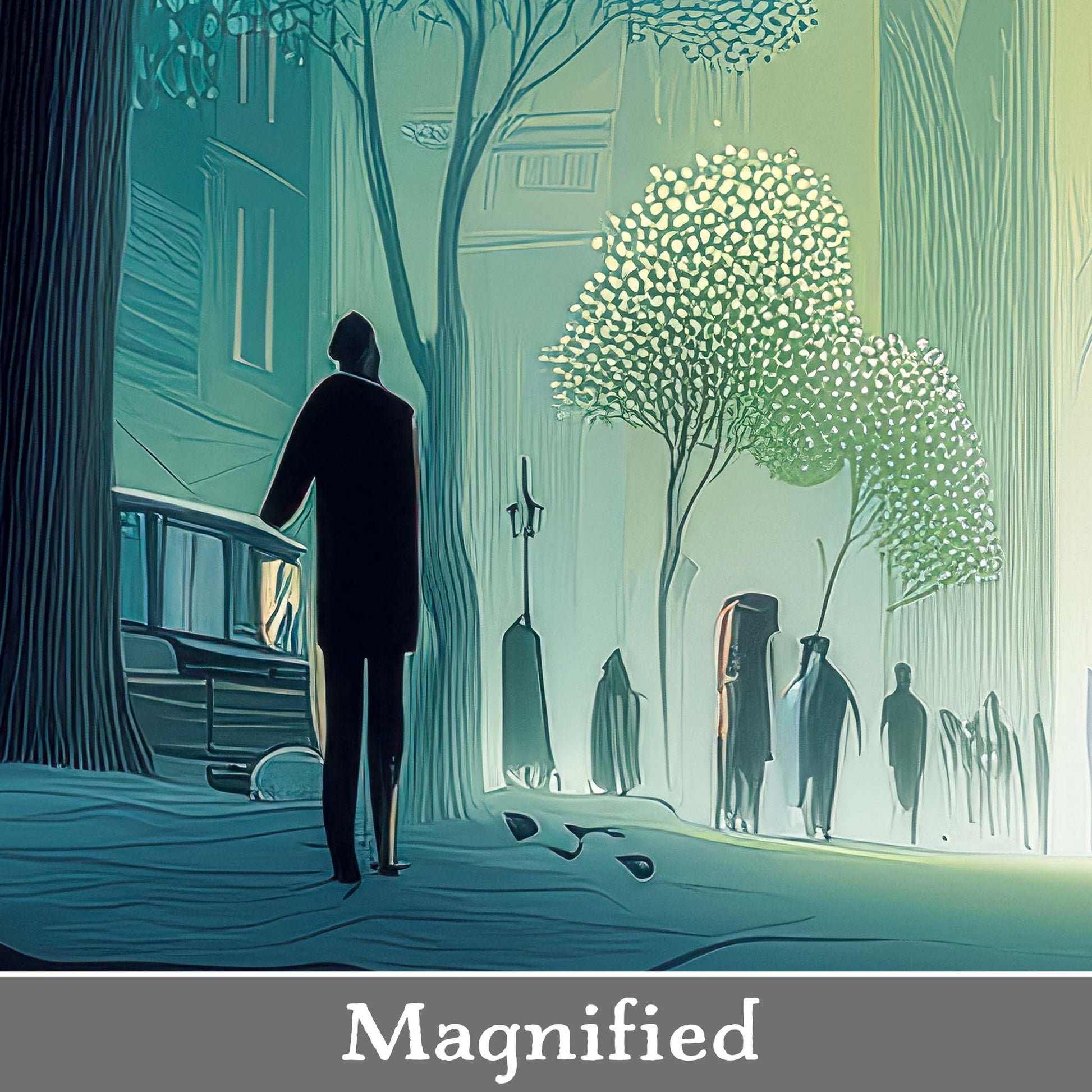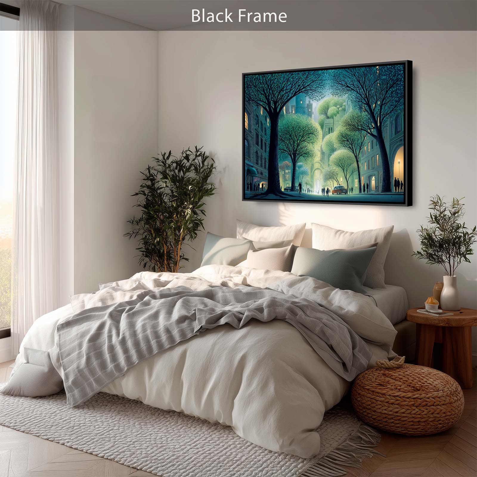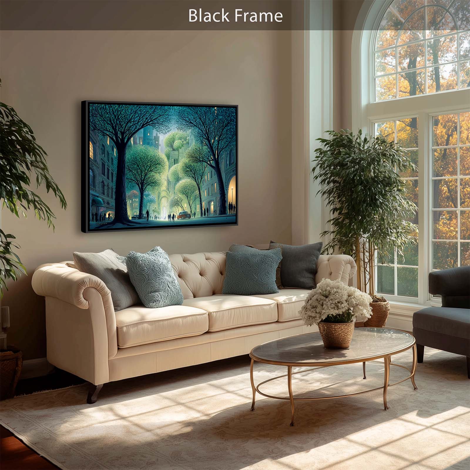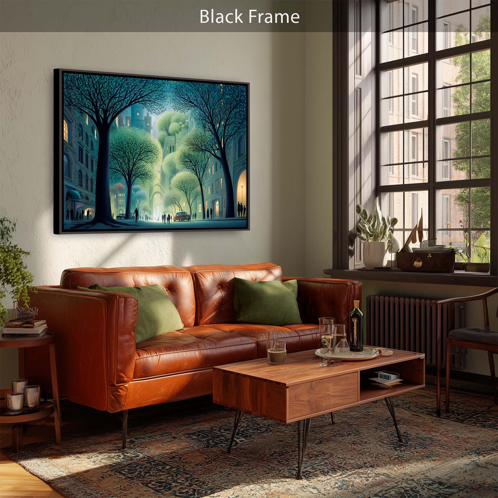 City Stroll captures a warm evening in the city, framed by tall, delicate trees. The street glows gently with the light from buildings as people stroll through the scene in quiet rhythm. Intriguing shapes and soft geometries emerge from the interplay of light, shadow and urban life—creating a composition that feels both modern and timeless.
