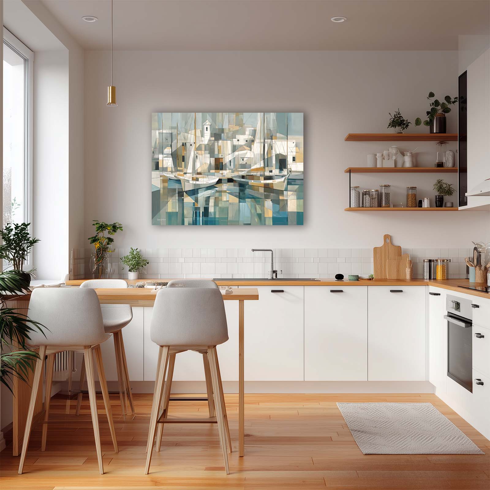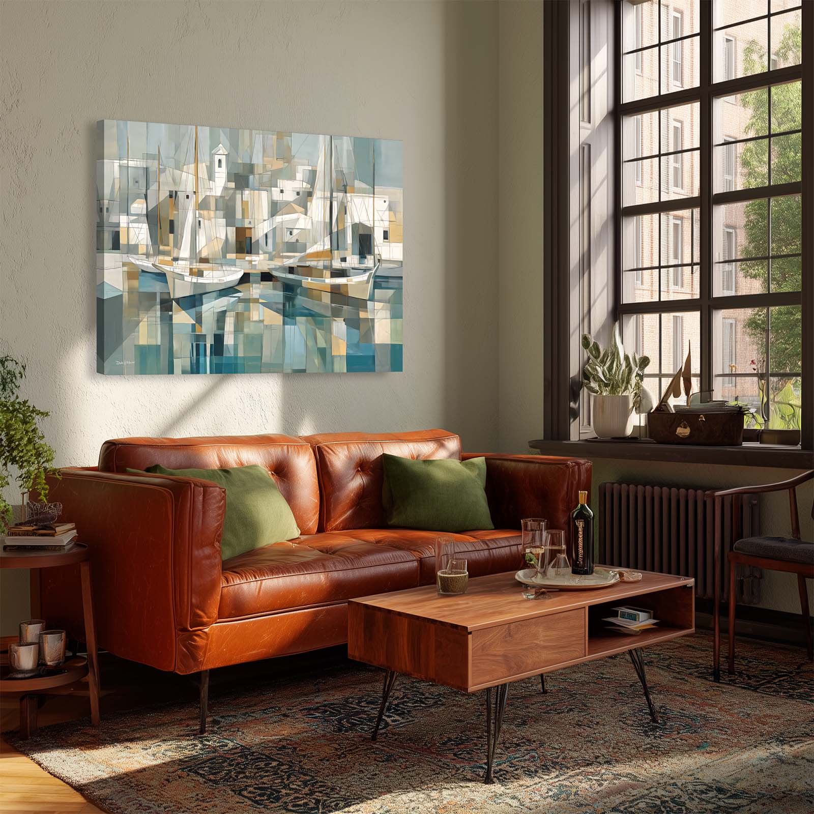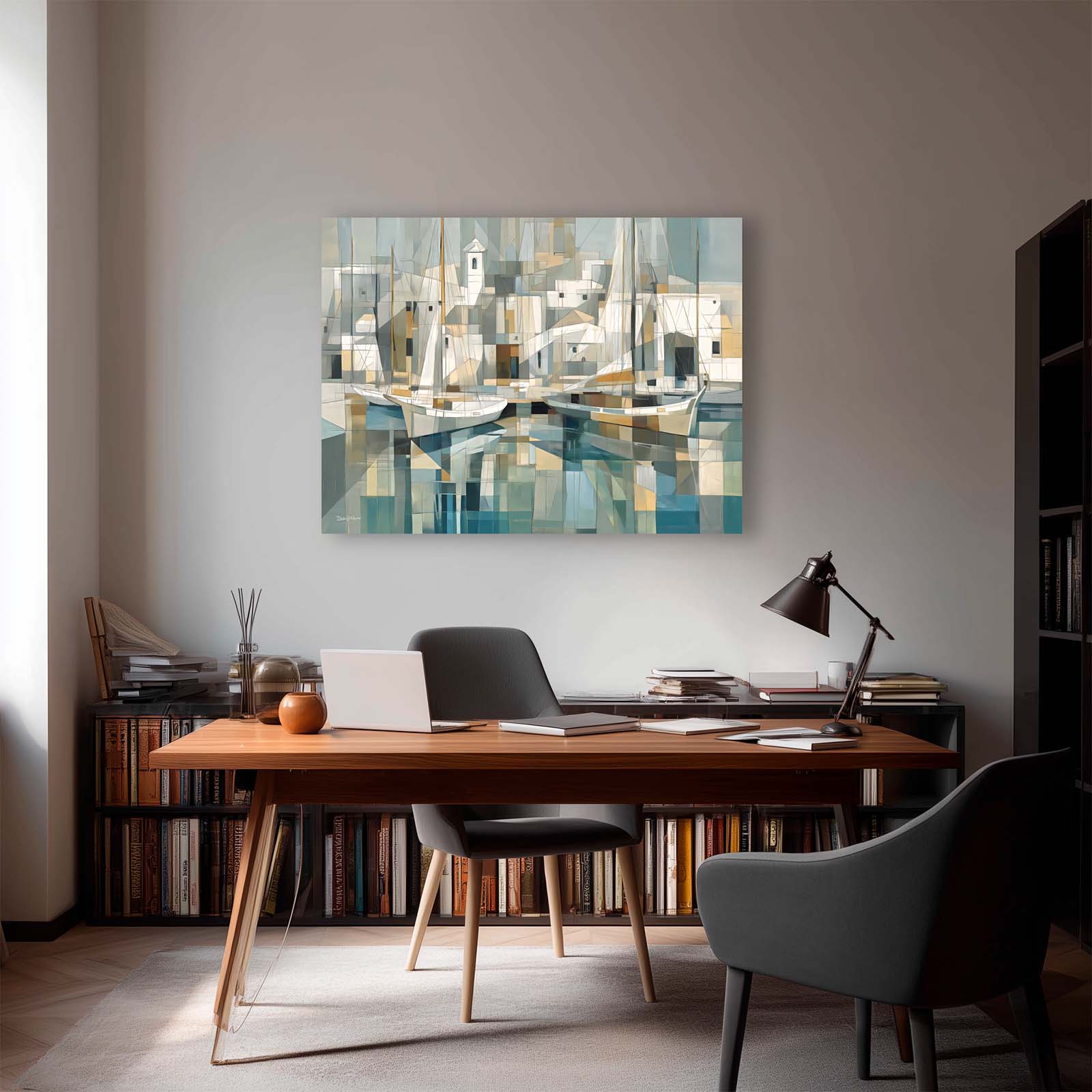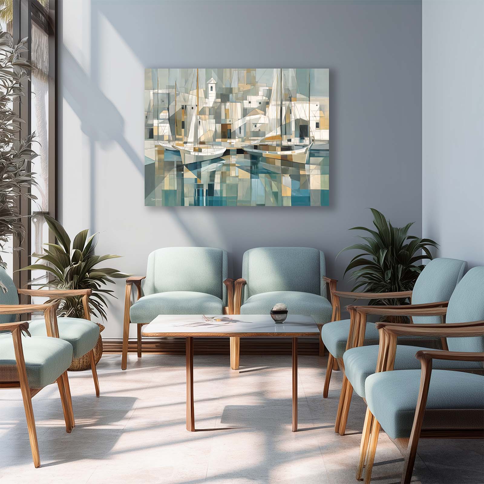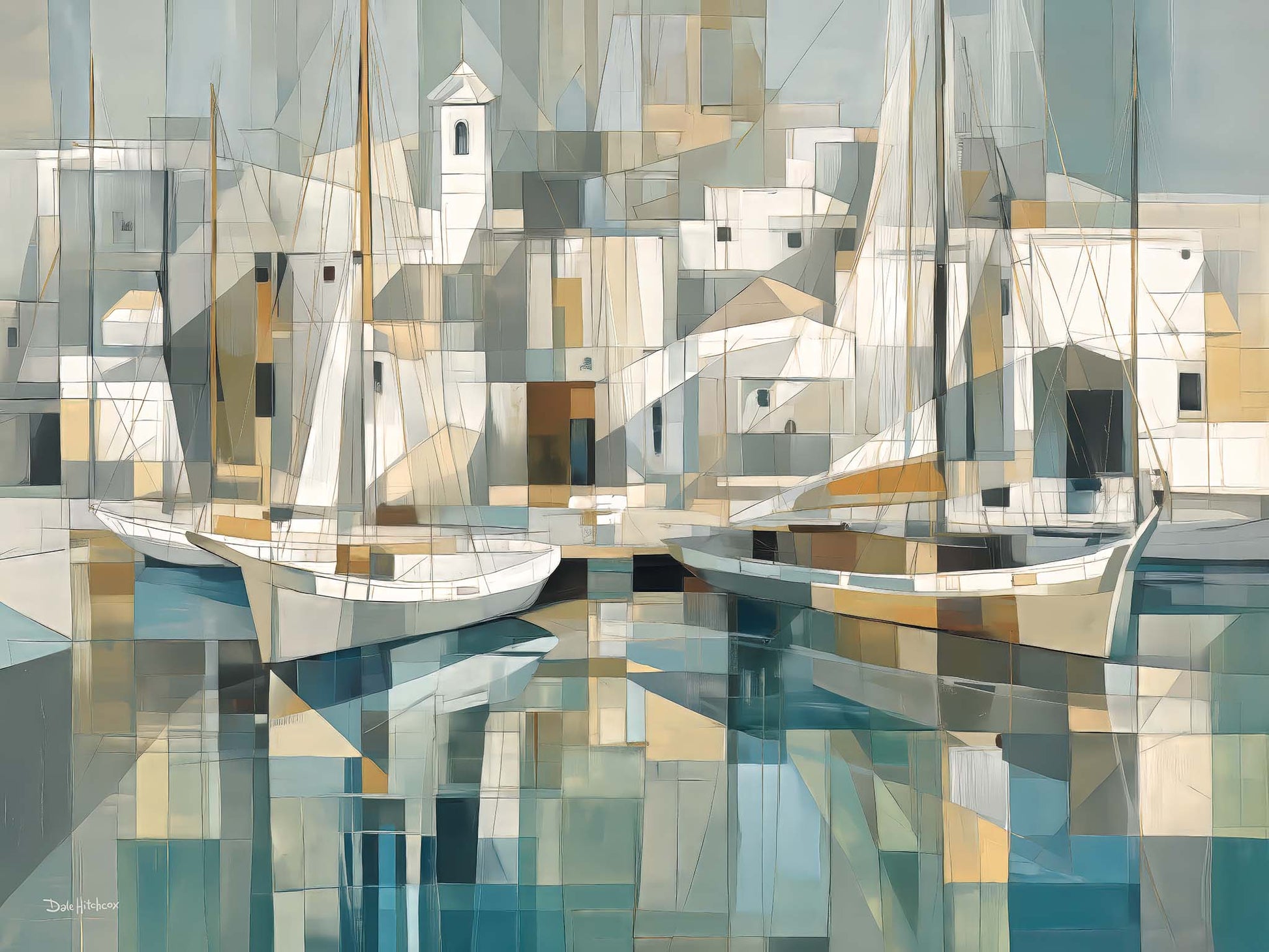 This gentle cubist composition captures the timeless charm of a fishing village, where sailboats rest in still water and shimmer in reflection. The scene unfolds in delicate, harmonious tones—easy to pair with nearly any decor—and is rich with subtly abstracted shapes that invite closer appreciation.