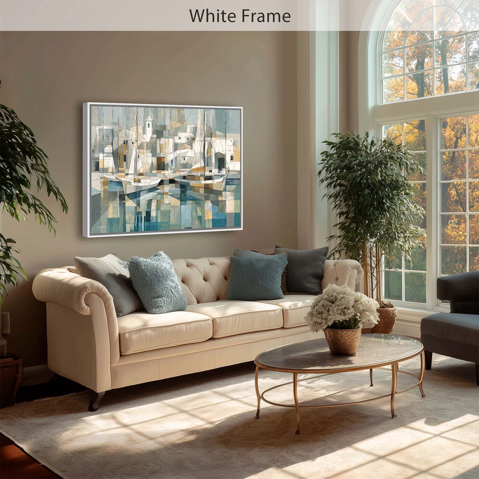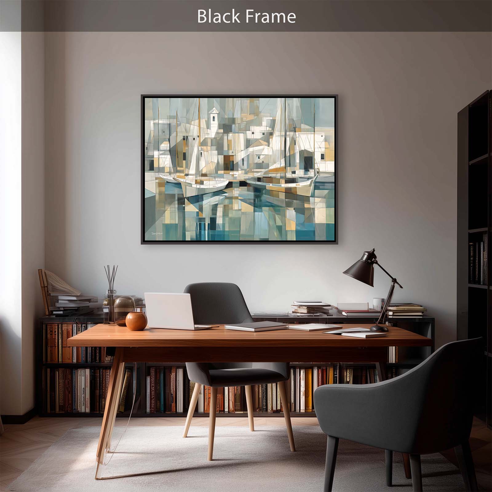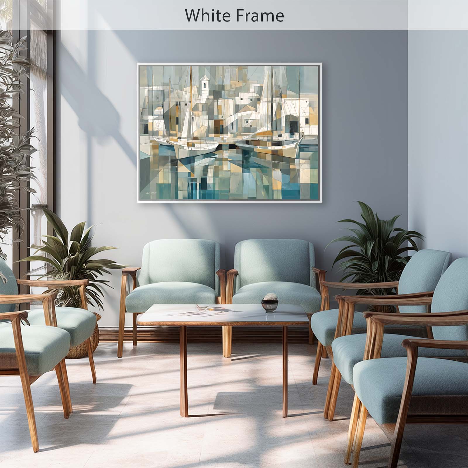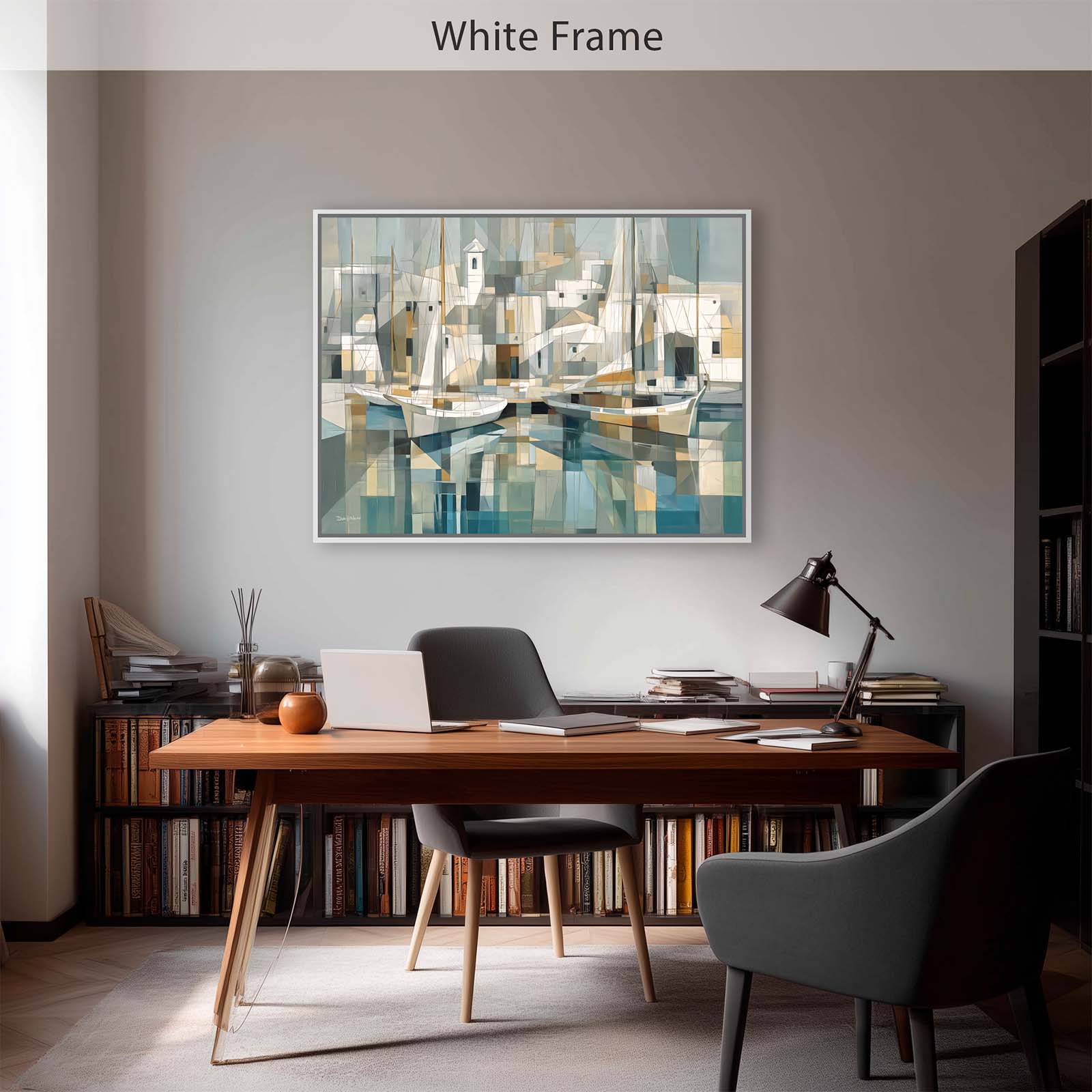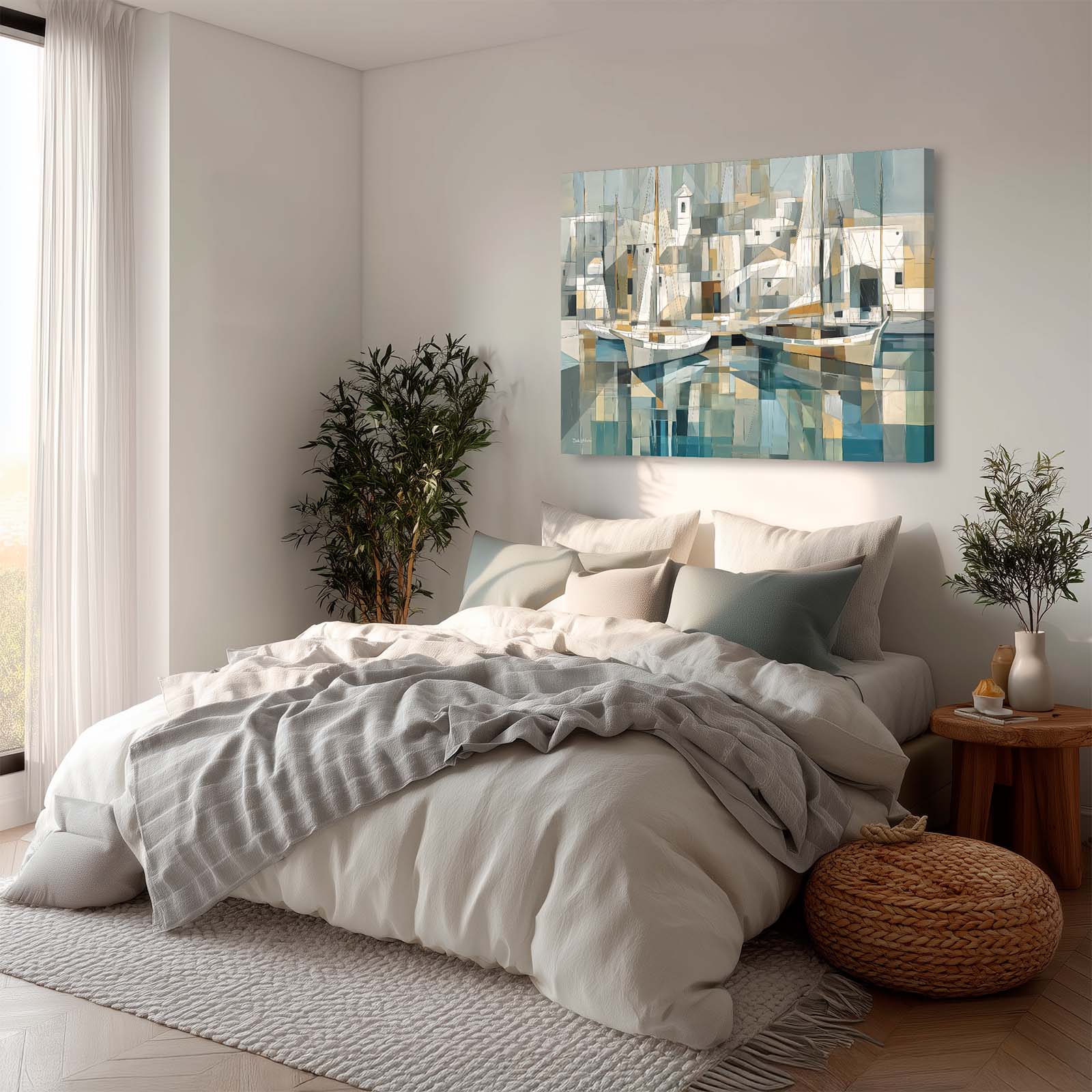 This gentle cubist composition captures the timeless charm of a fishing village, where sailboats rest in still water and shimmer in reflection. The scene unfolds in delicate, harmonious tones—easy to pair with nearly any decor—and is rich with subtly abstracted shapes that invite closer appreciation.
