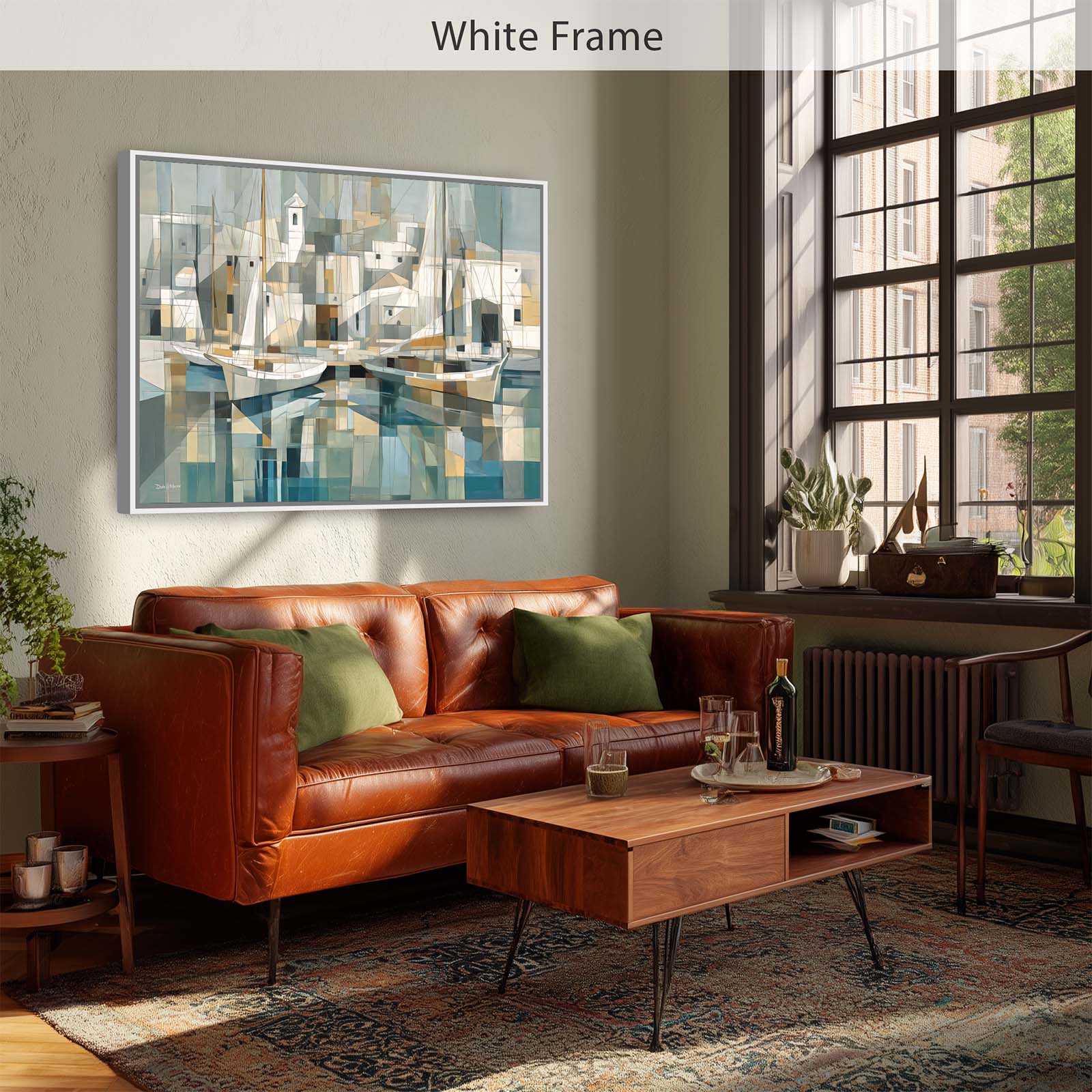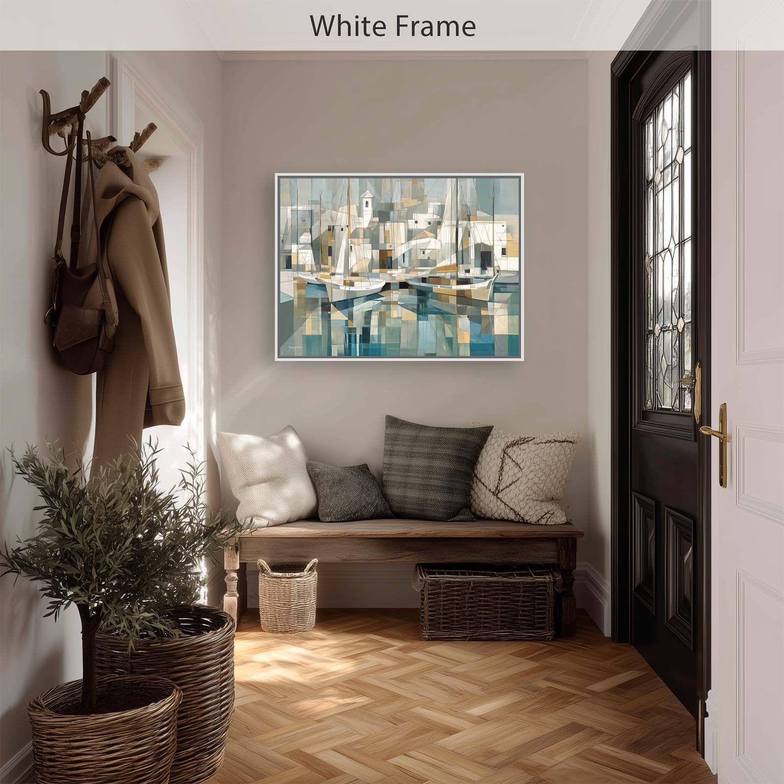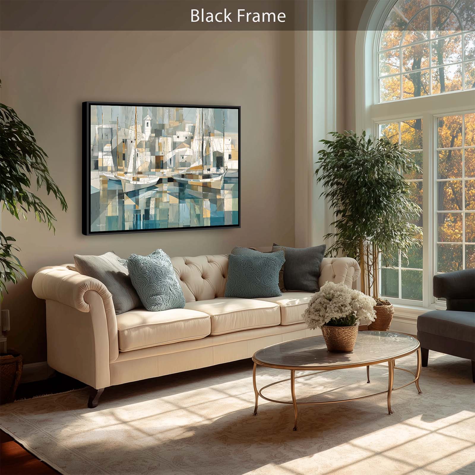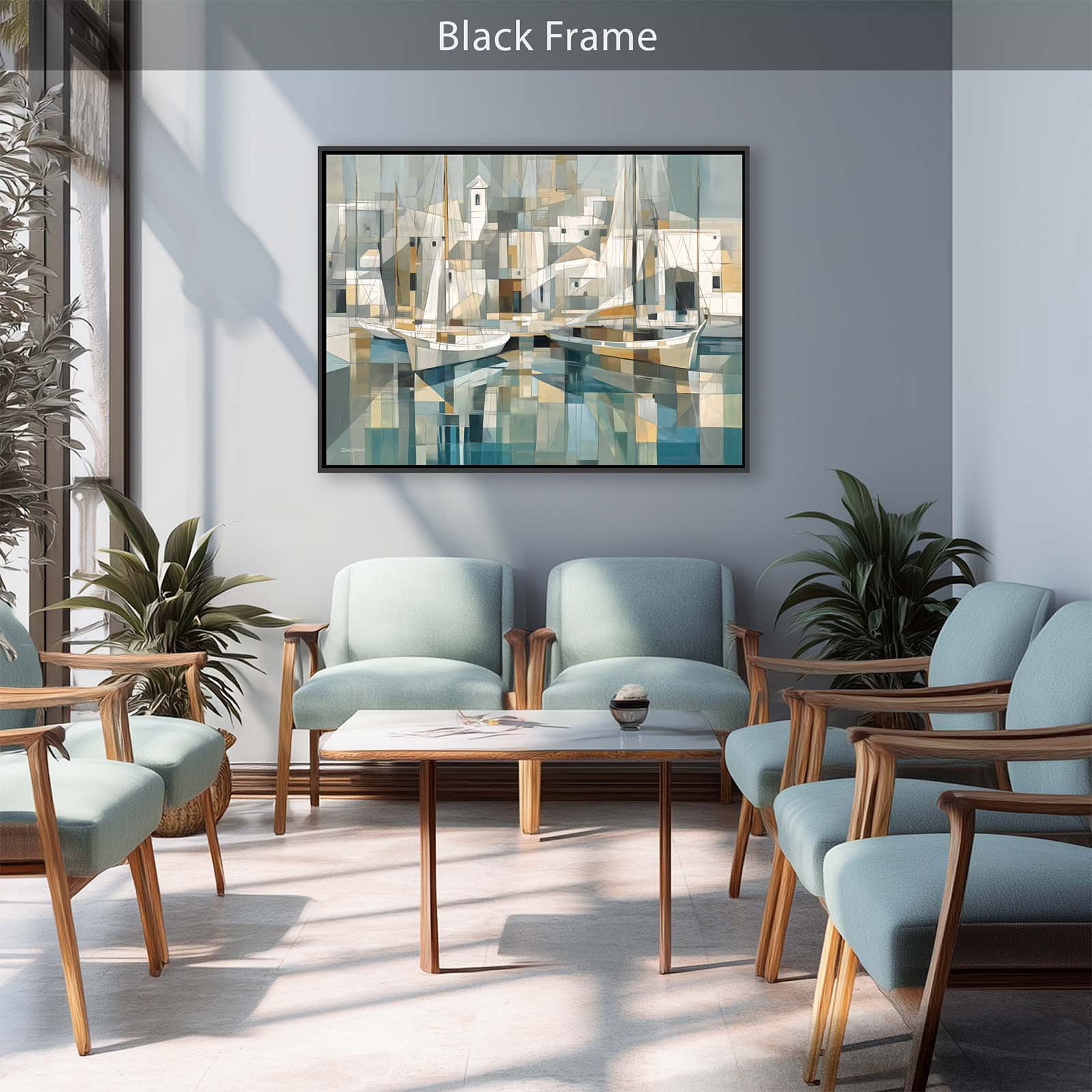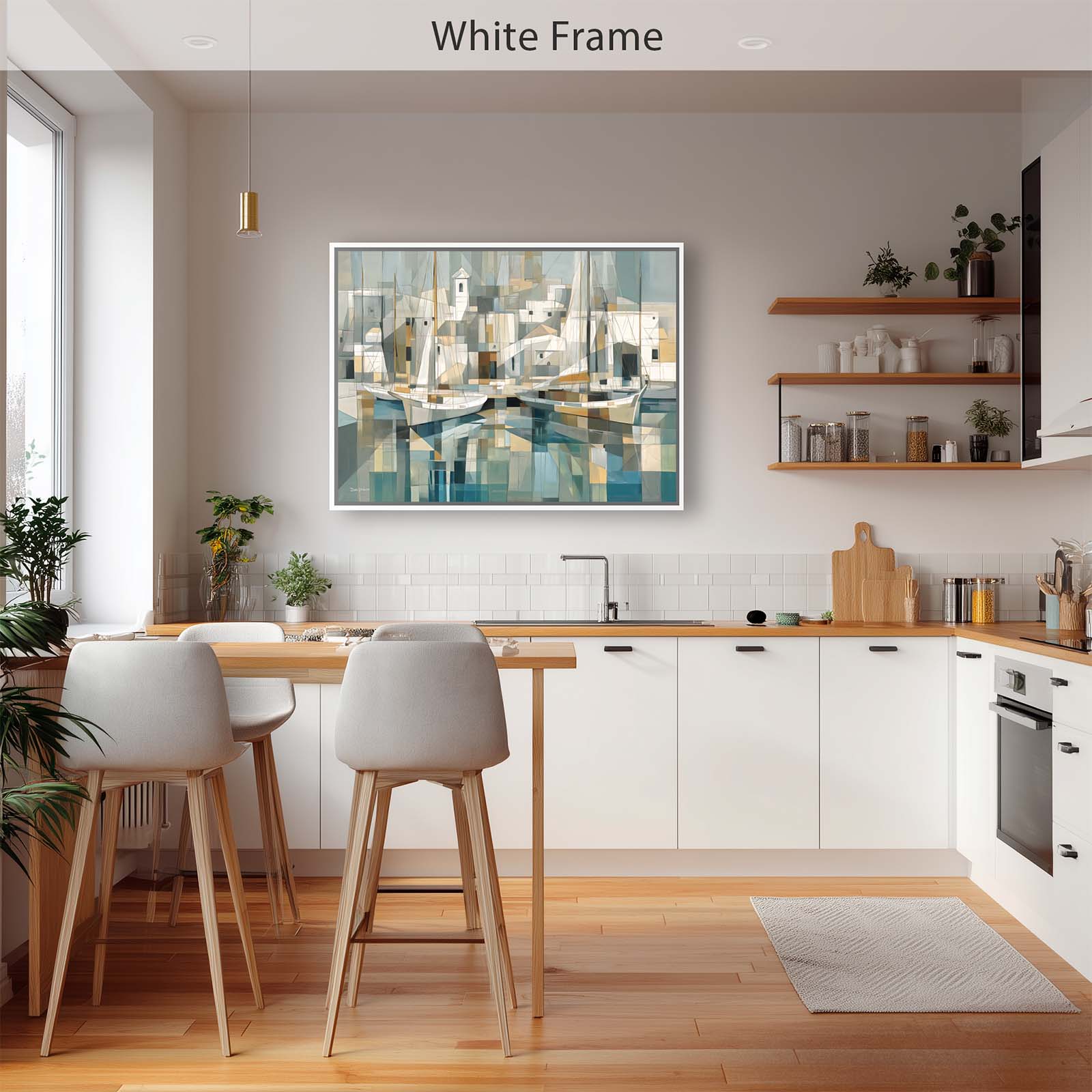 This gentle cubist composition captures the timeless charm of a fishing village, where sailboats rest in still water and shimmer in reflection. The scene unfolds in delicate, harmonious tones—easy to pair with nearly any decor—and is rich with subtly abstracted shapes that invite closer appreciation.