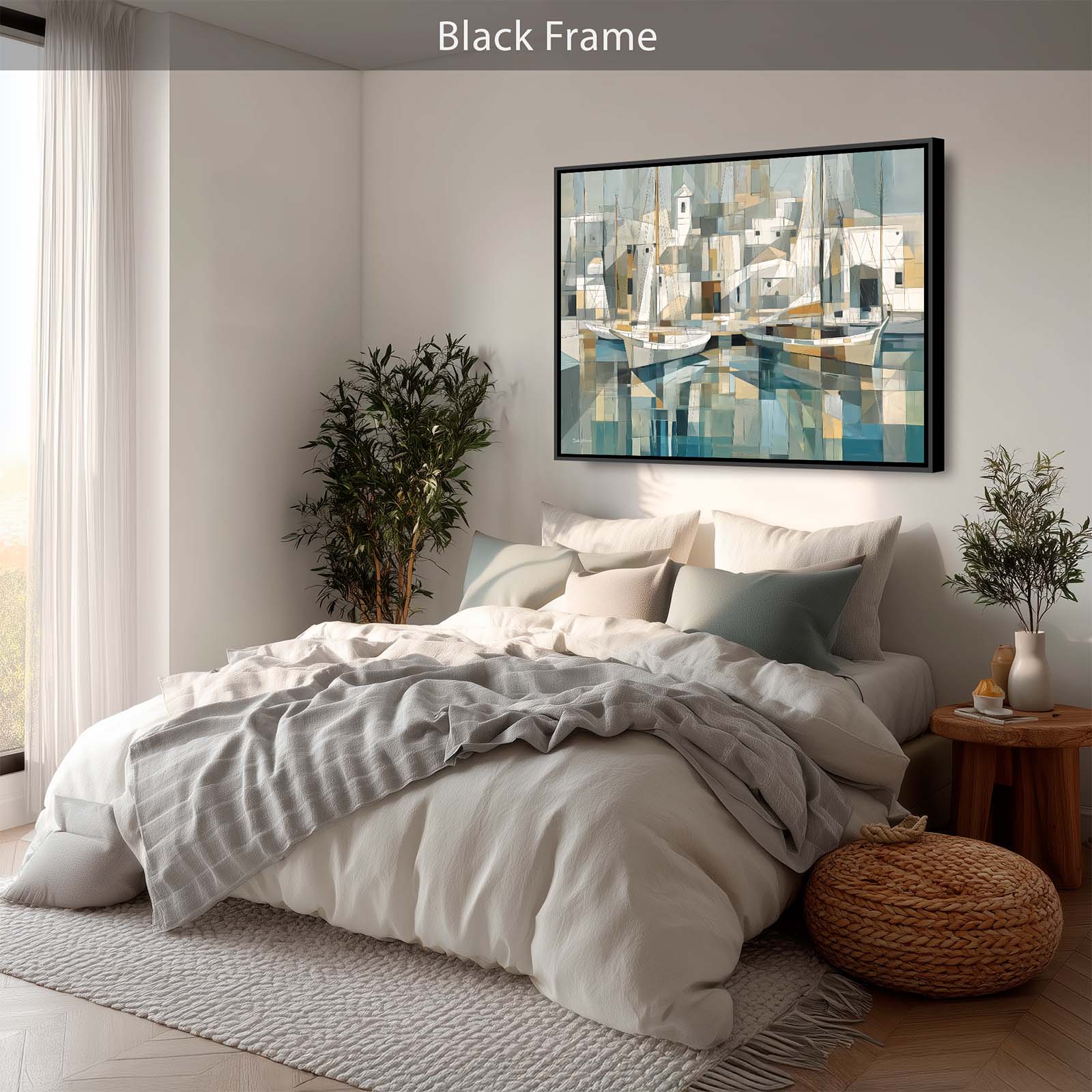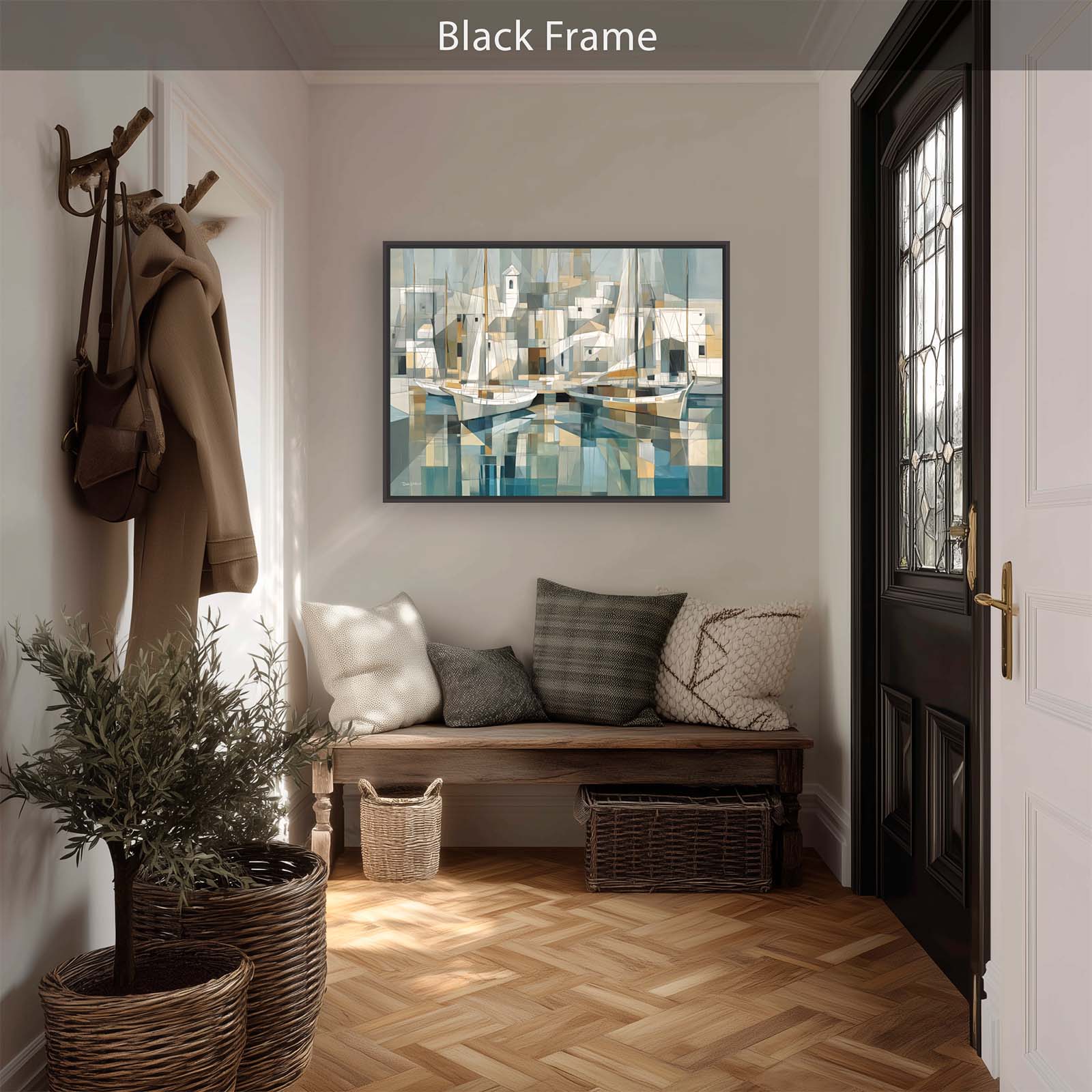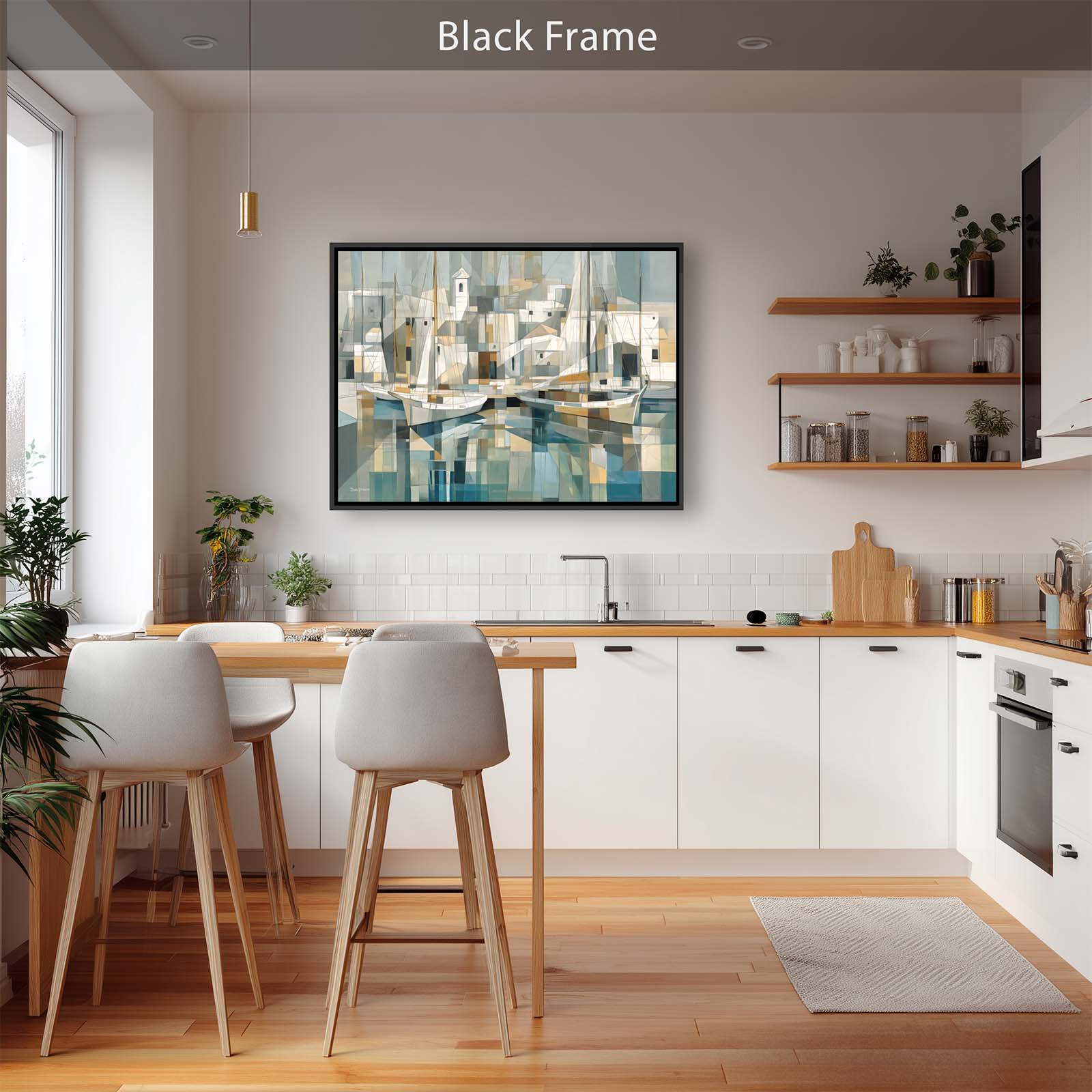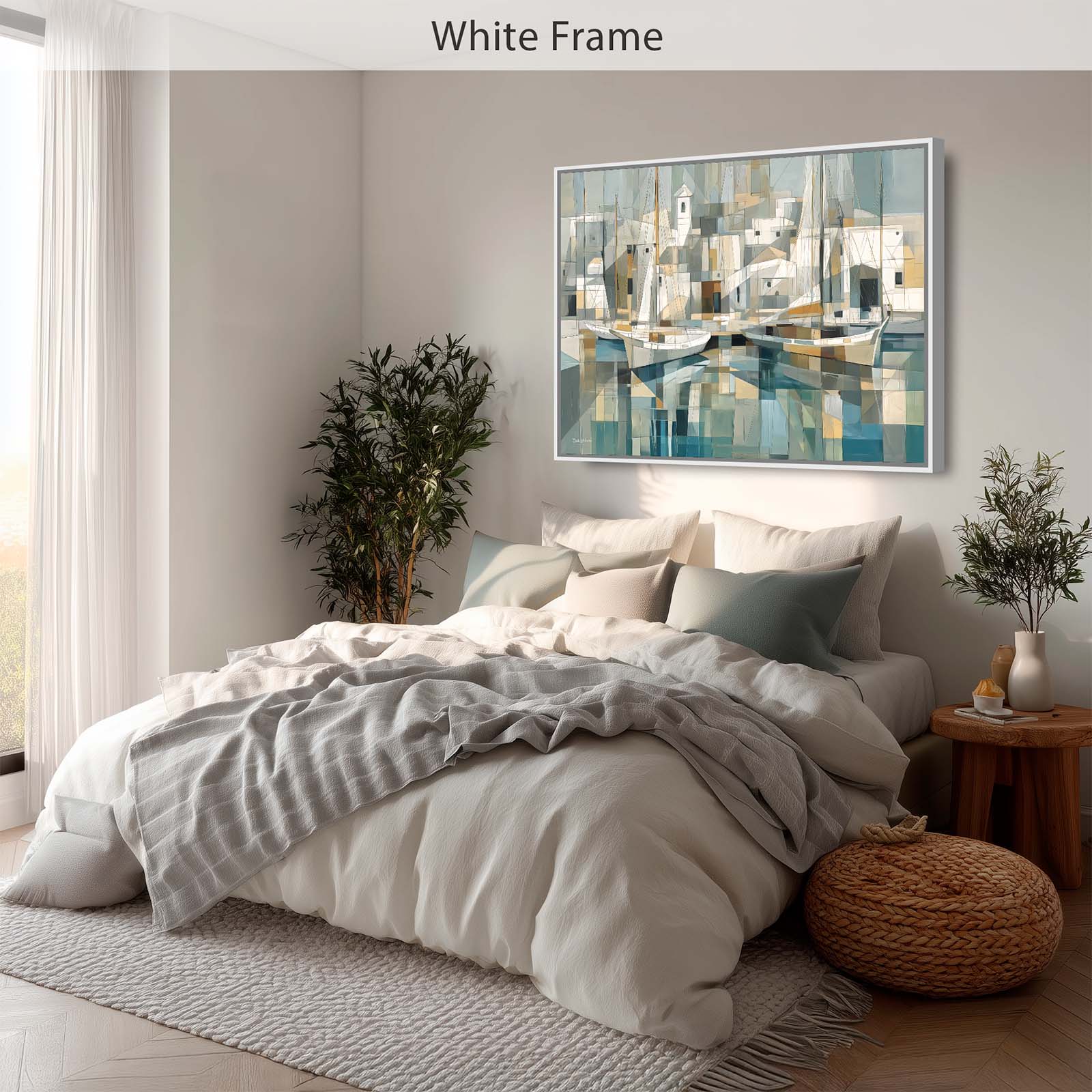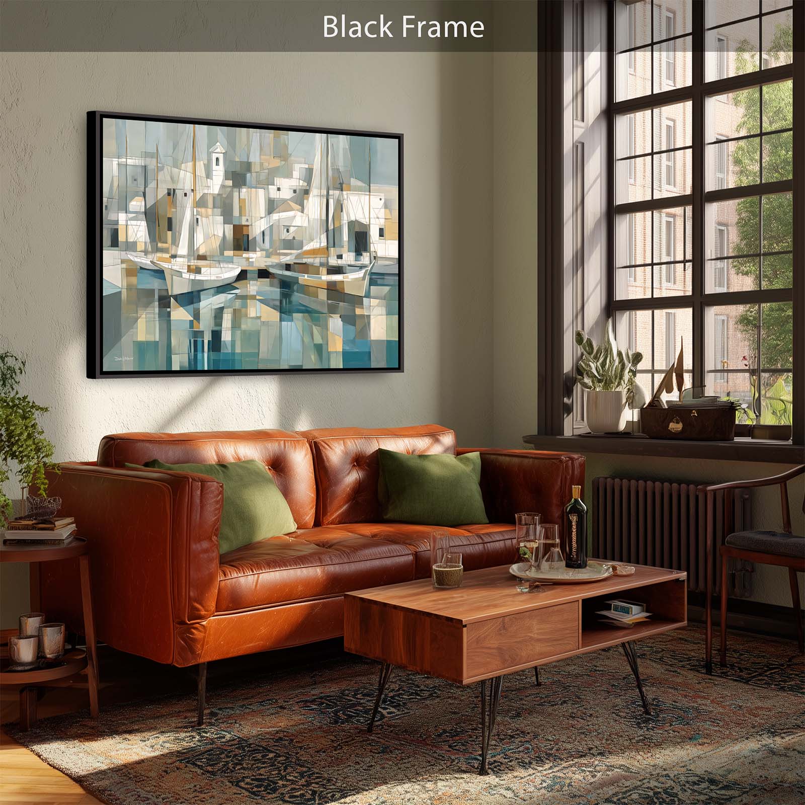 This gentle cubist composition captures the timeless charm of a fishing village, where sailboats rest in still water and shimmer in reflection. The scene unfolds in delicate, harmonious tones—easy to pair with nearly any decor—and is rich with subtly abstracted shapes that invite closer appreciation.