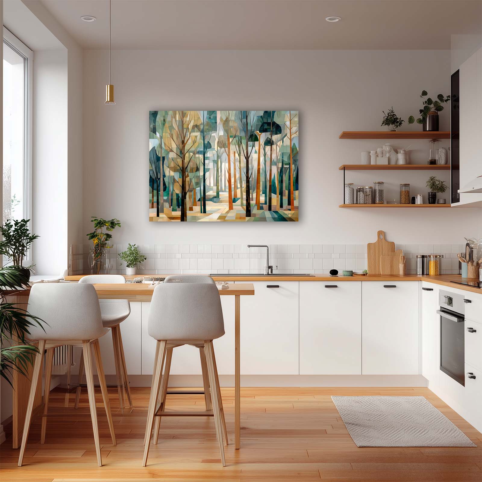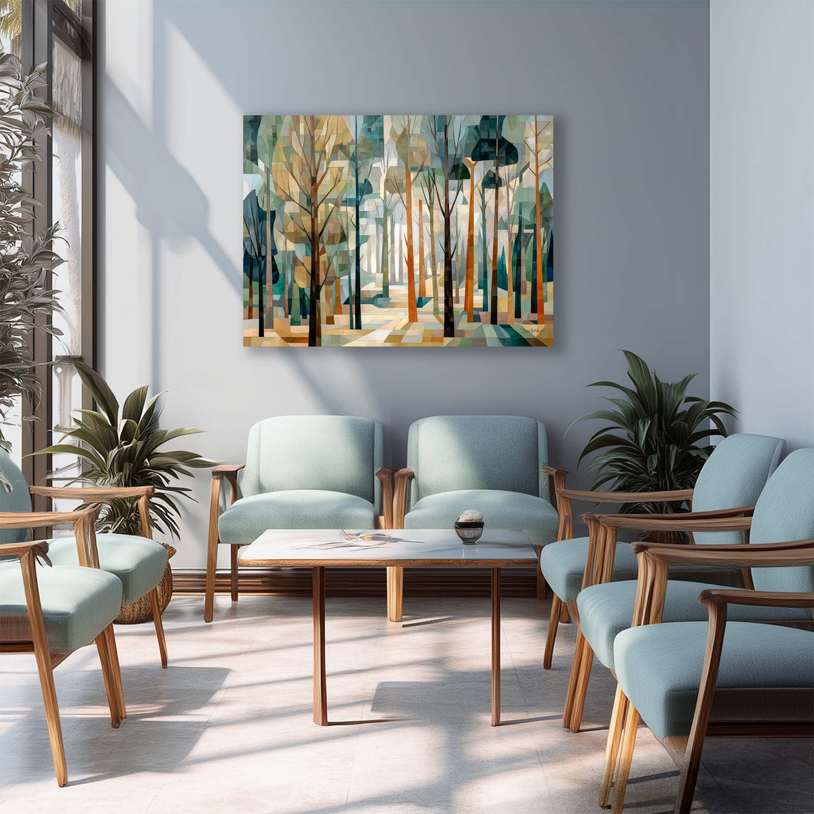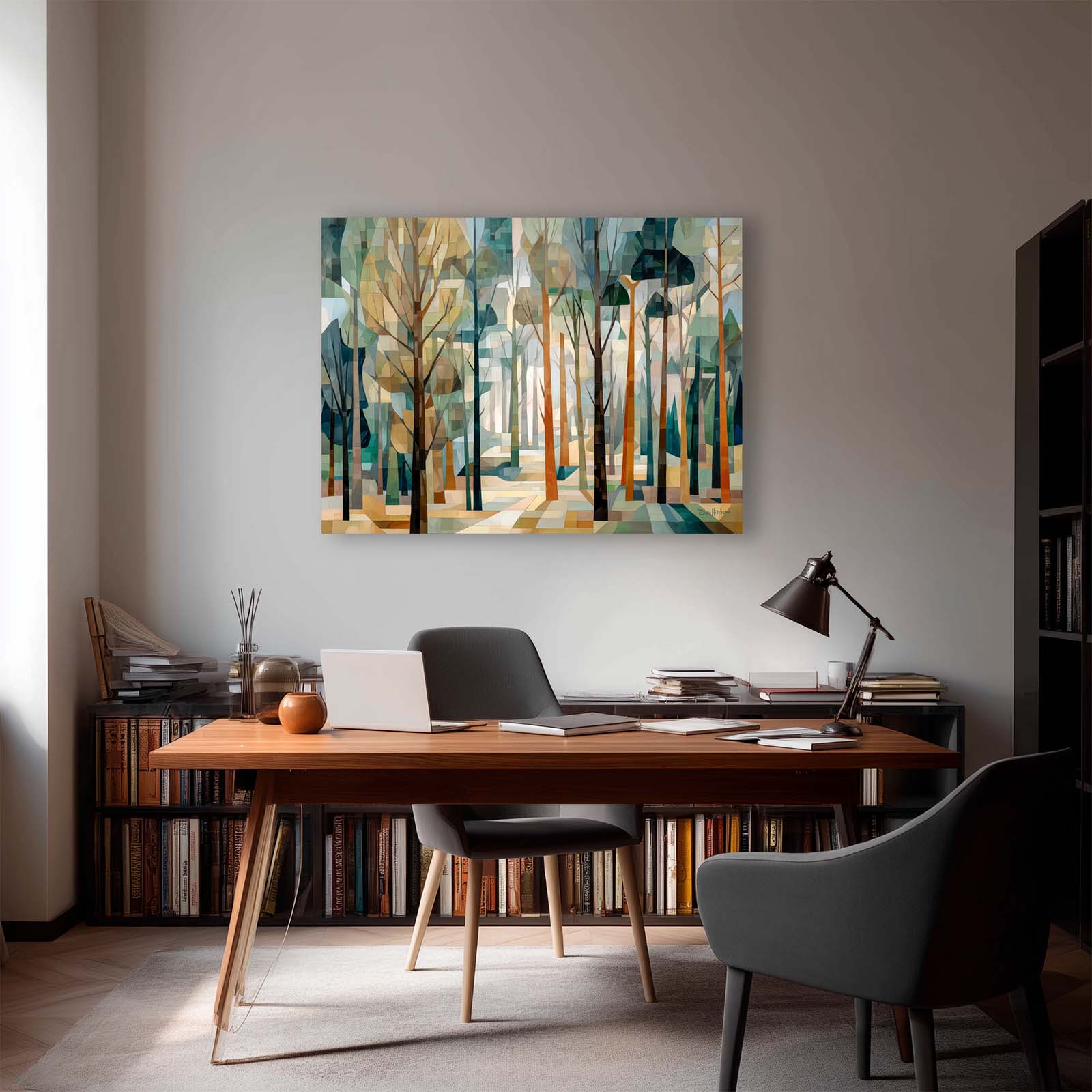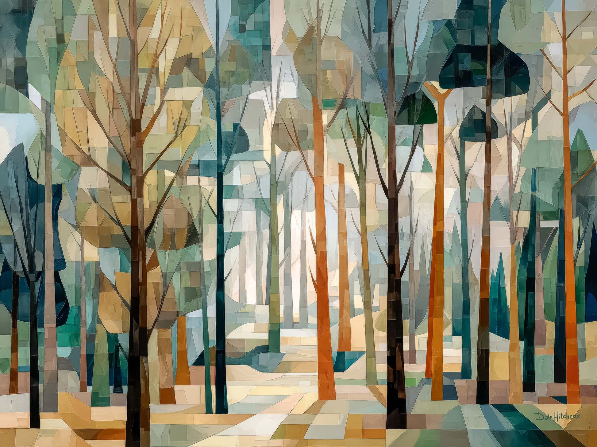 This cubist canvas print captures the ethereal beauty of a sunlit forest, where delicate tree shapes intertwine in an abstract dance of light and shadow. Backlit by soft sunlight, the trees take on a sculptural quality—creating a scene rich in geometry, depth, and quiet wonder.