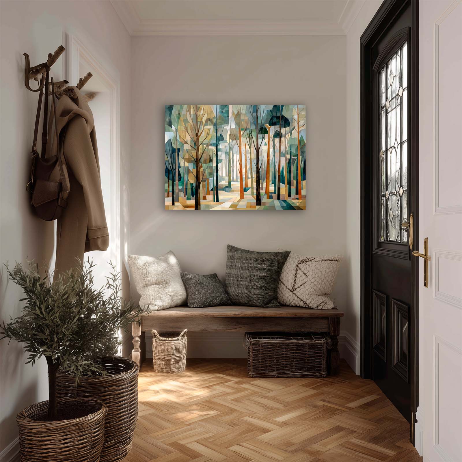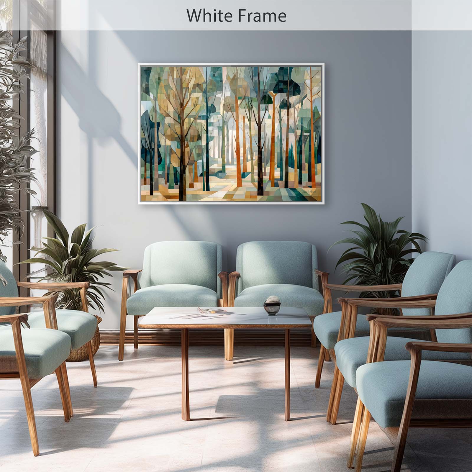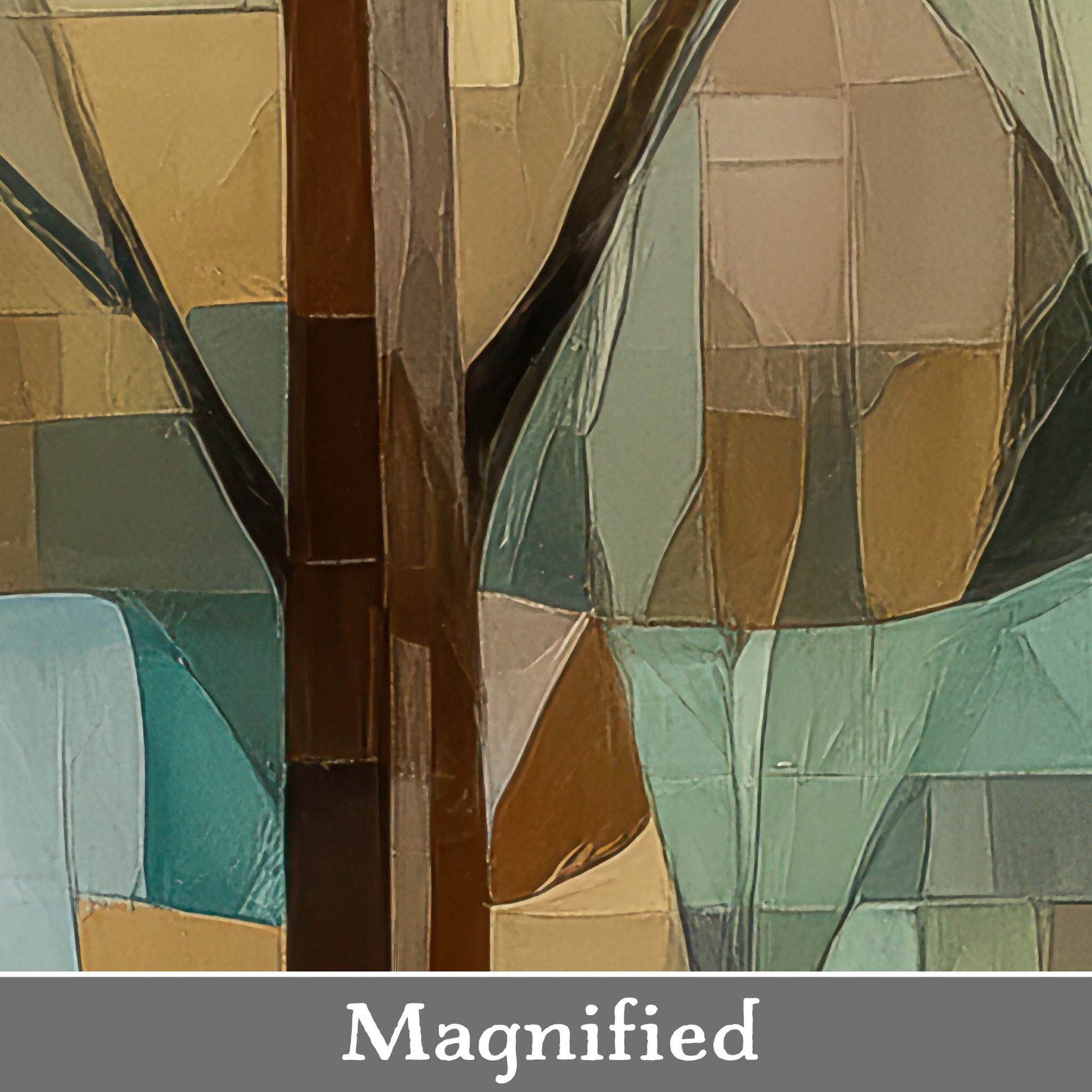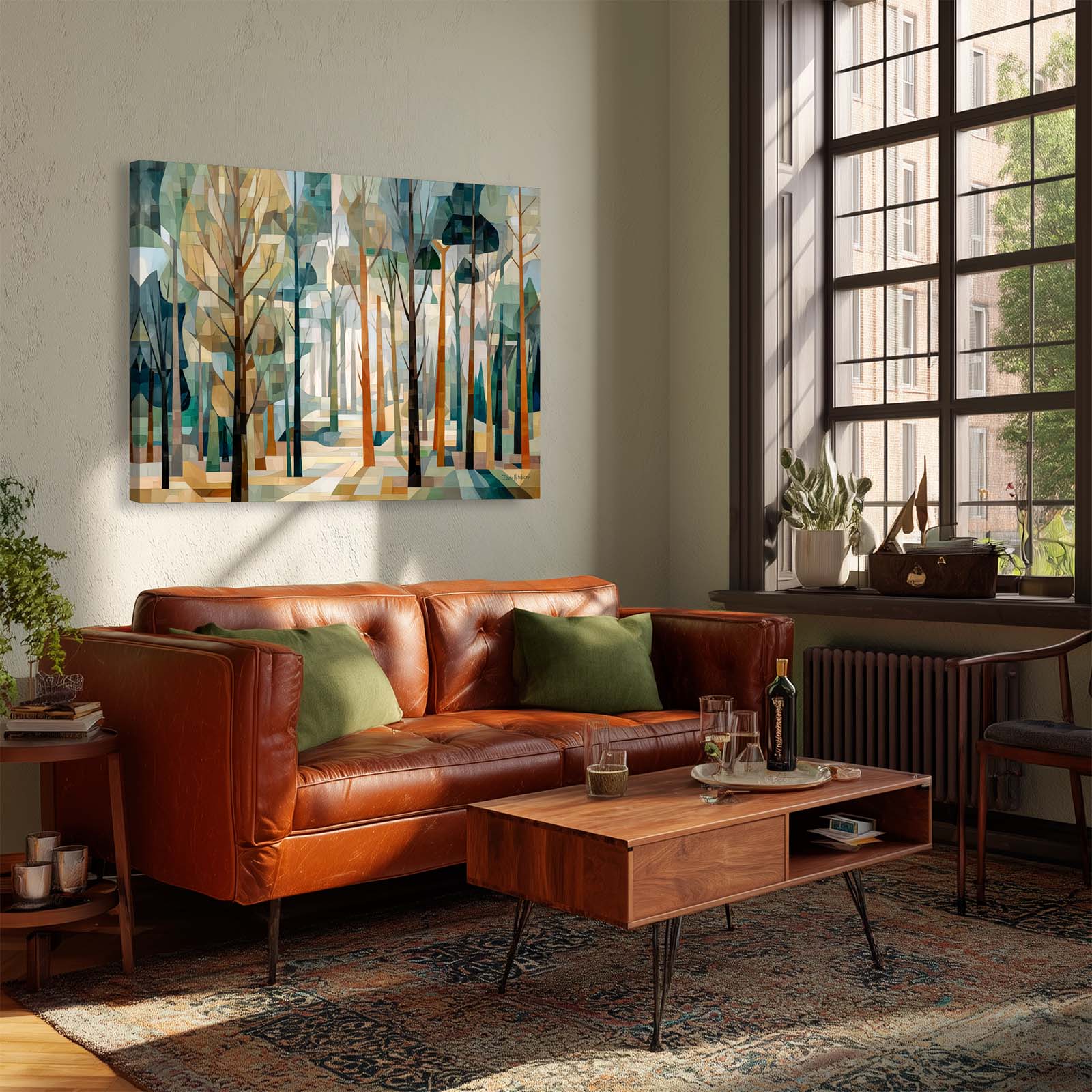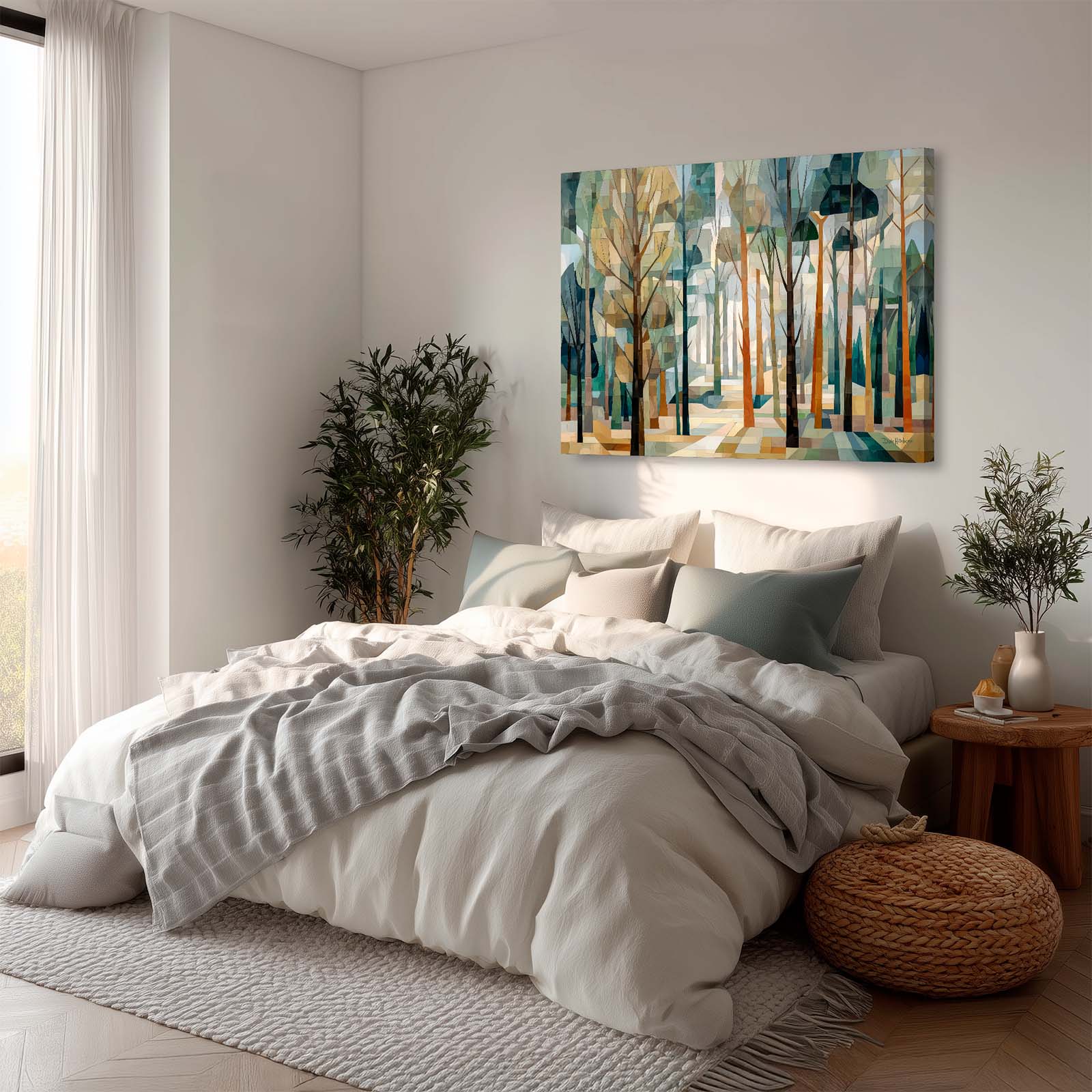 This cubist canvas print captures the ethereal beauty of a sunlit forest, where delicate tree shapes intertwine in an abstract dance of light and shadow. Backlit by soft sunlight, the trees take on a sculptural quality—creating a scene rich in geometry, depth, and quiet wonder.