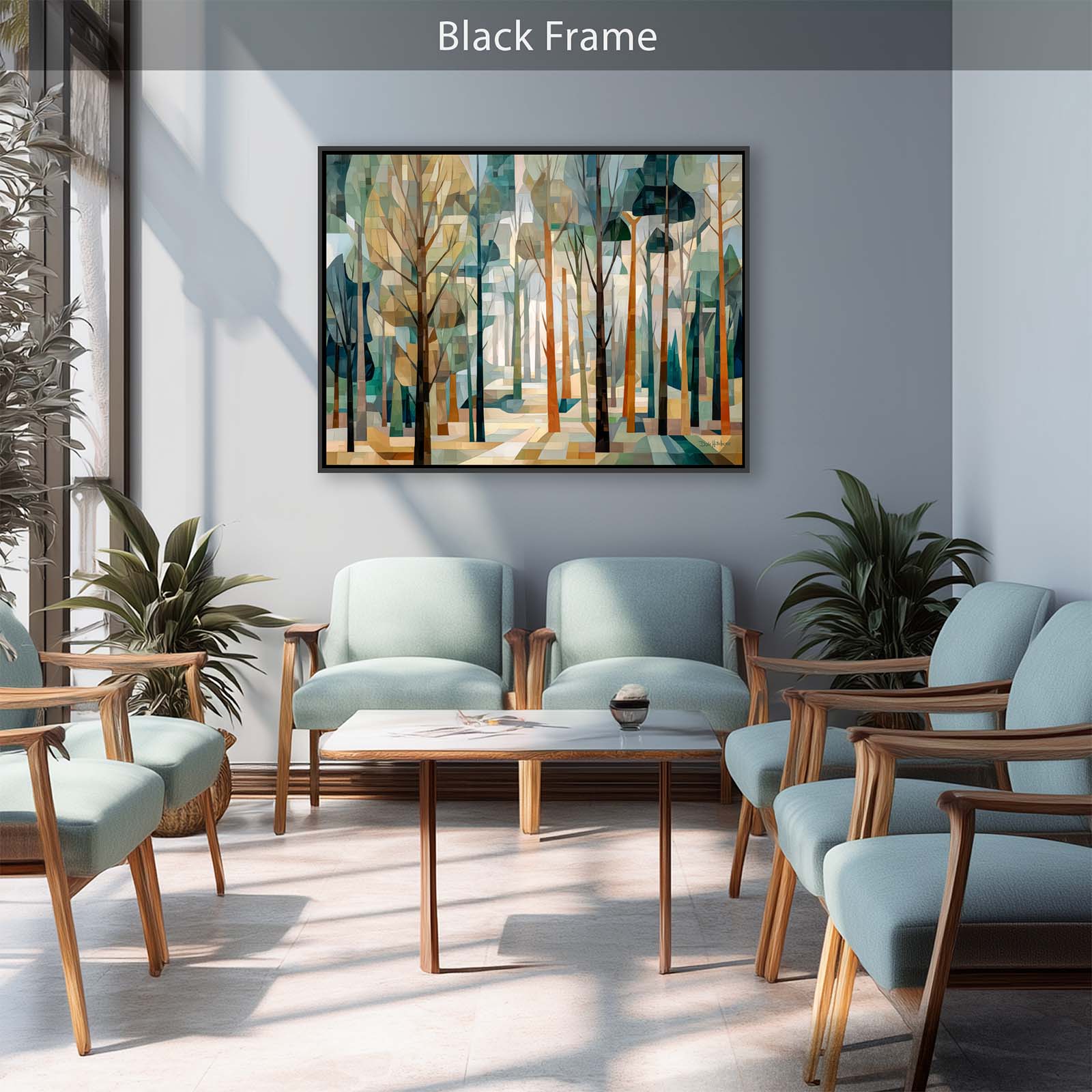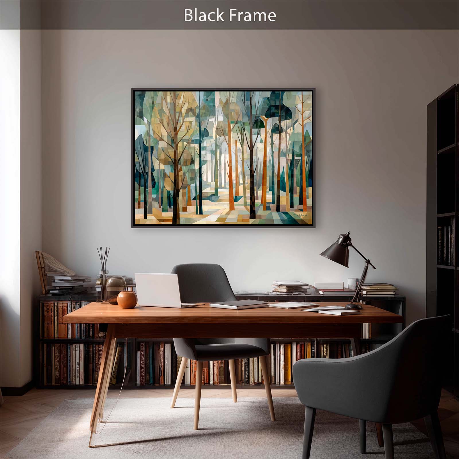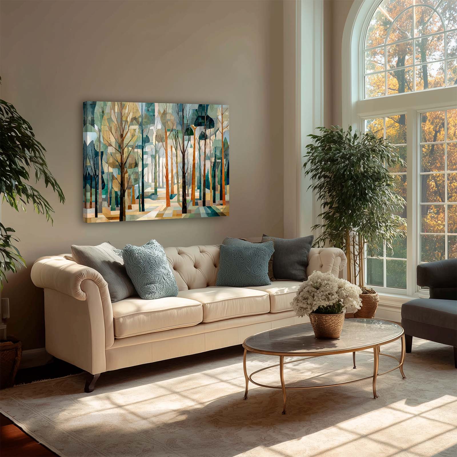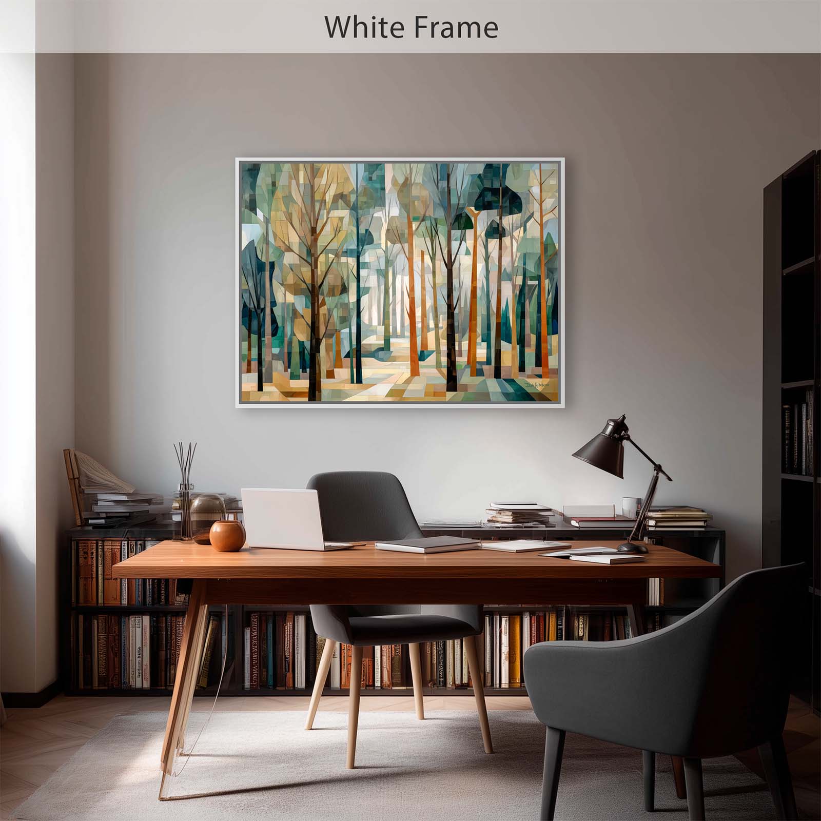 This cubist canvas print captures the ethereal beauty of a sunlit forest, where delicate tree shapes intertwine in an abstract dance of light and shadow. Backlit by soft sunlight, the trees take on a sculptural quality—creating a scene rich in geometry, depth, and quiet wonder.