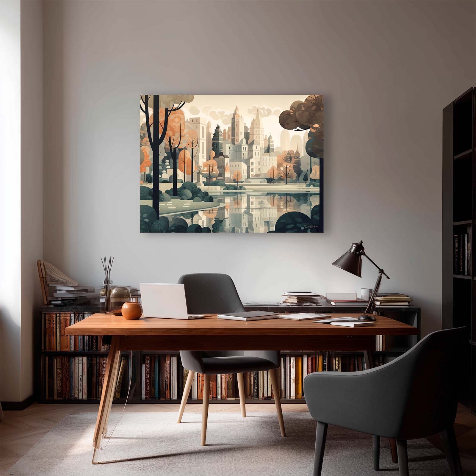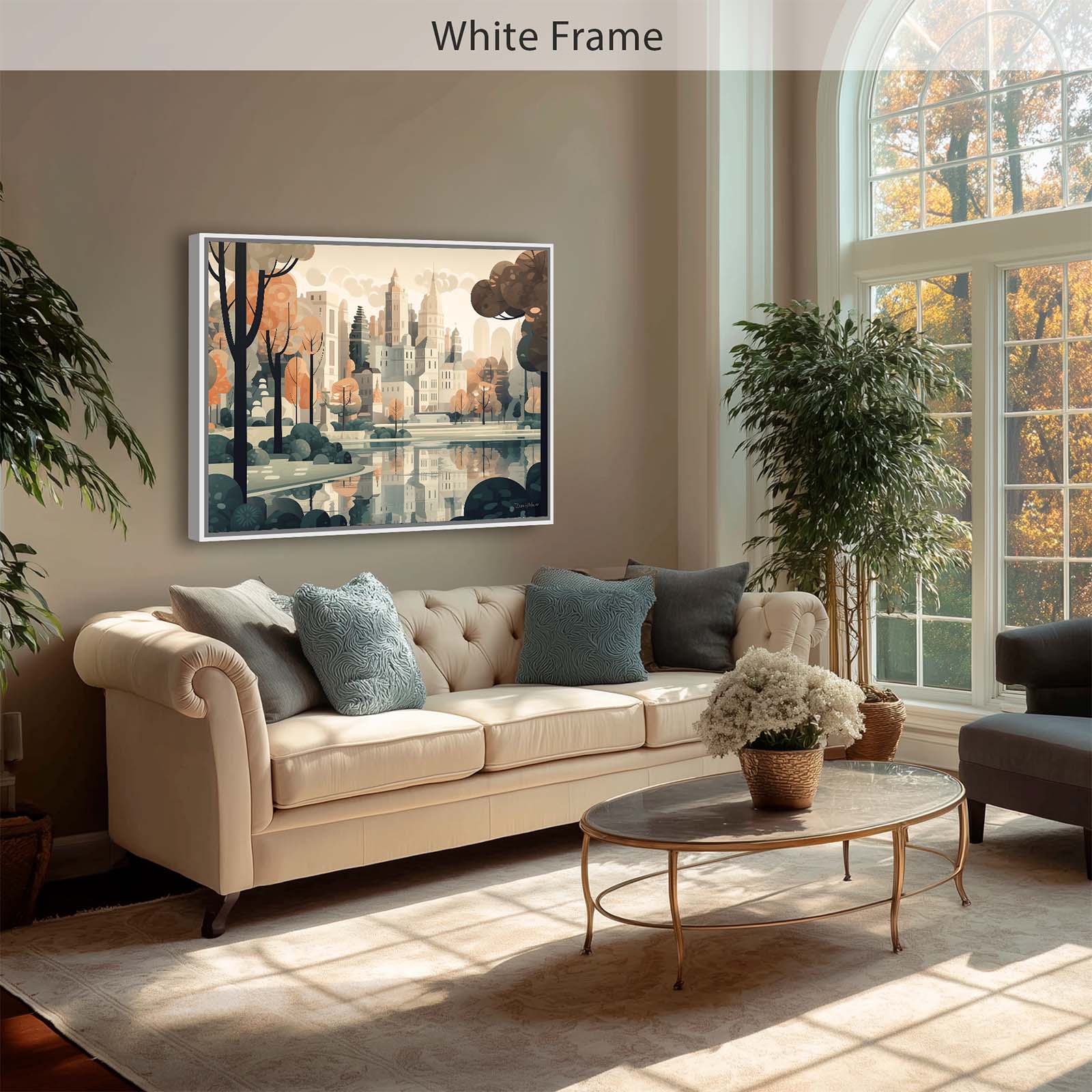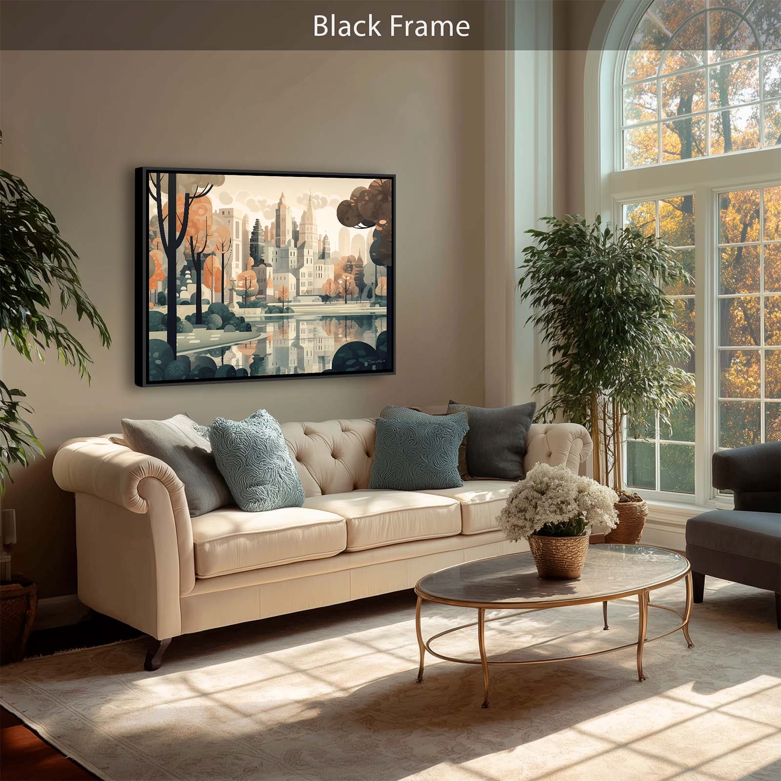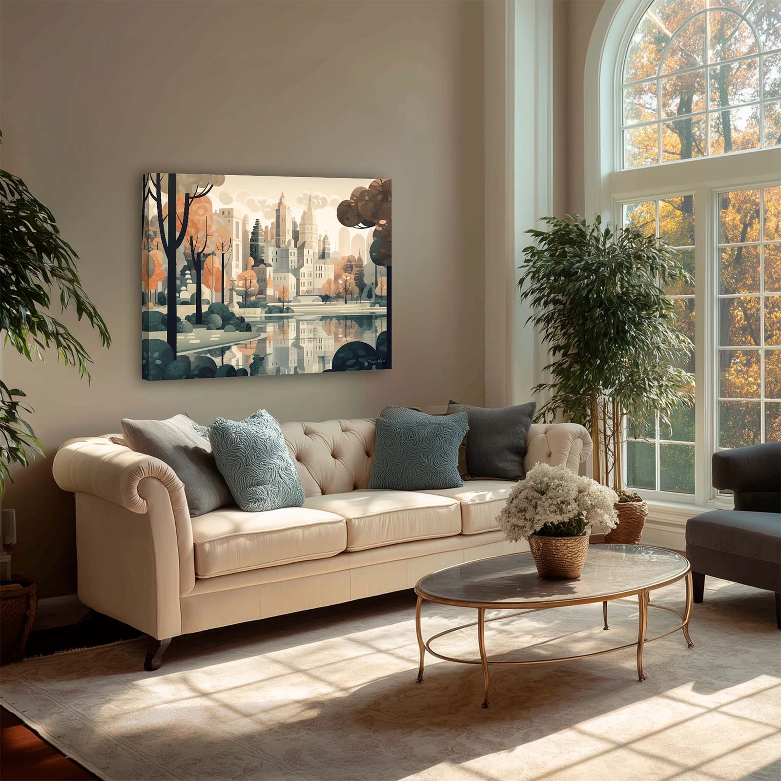 Celebrate the harmony of city and nature with Central Park, a stretched-canvas art print in an animated abstract impressionist style. From the vantage point of the lake, the city’s iconic skyline rises gracefully above the trees, capturing the essence of the City’s most beloved park. The scene balances the energy of urban architecture with the calm of water and greenery.