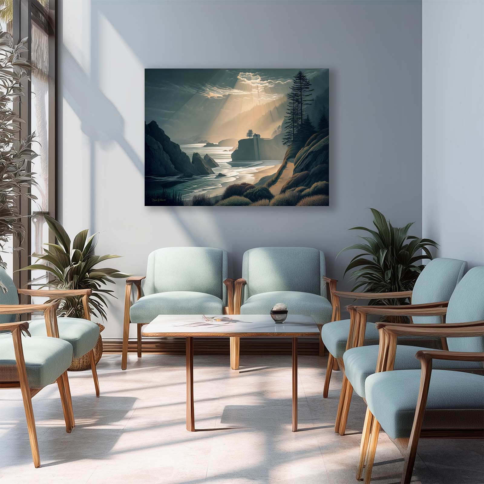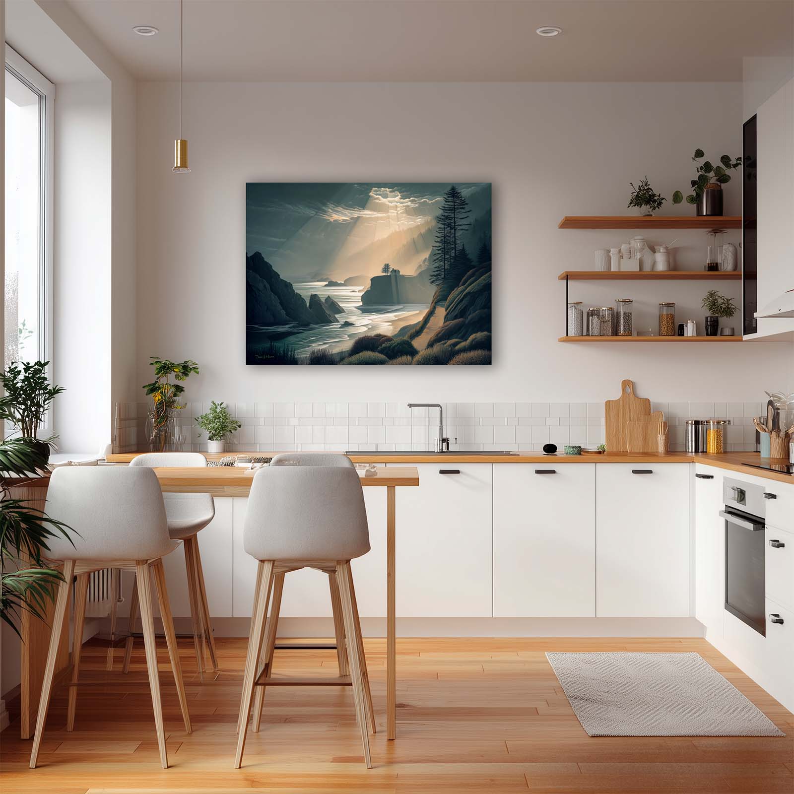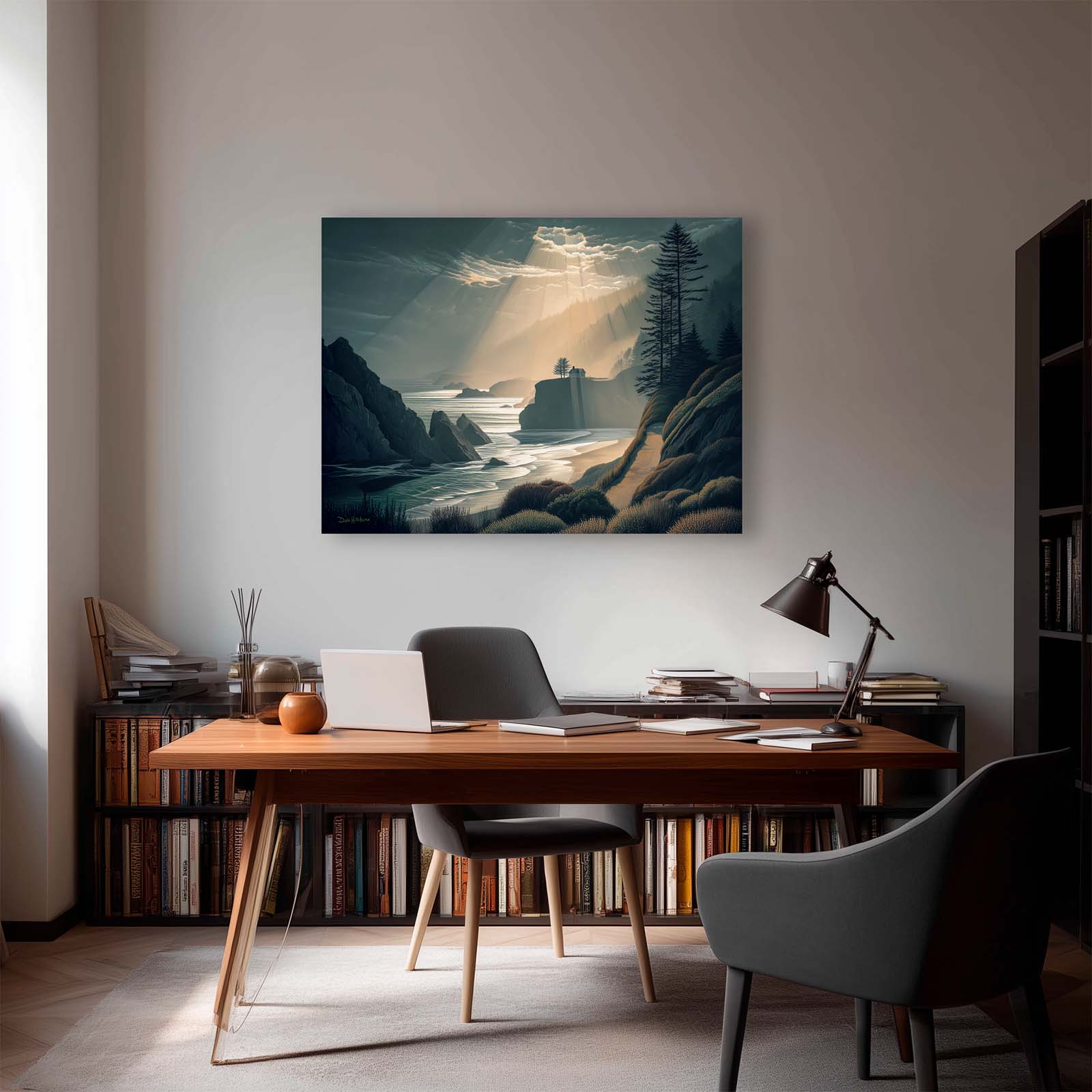 Capture the breathtaking beauty of a coastal sunset with this dramatic canvas print. A house bathed in golden light sits amidst a dynamic ocean and rugged shoreline, creating a striking scene that evokes warmth and awe. Printed on premium giclée canvas, it adds depth, drama, and timeless elegance to any home or office decor