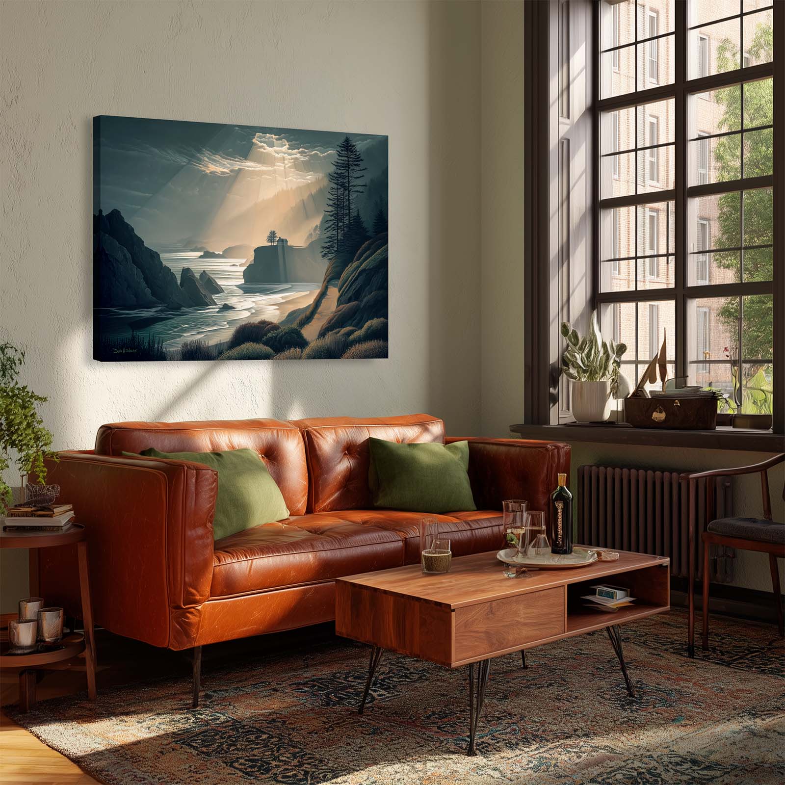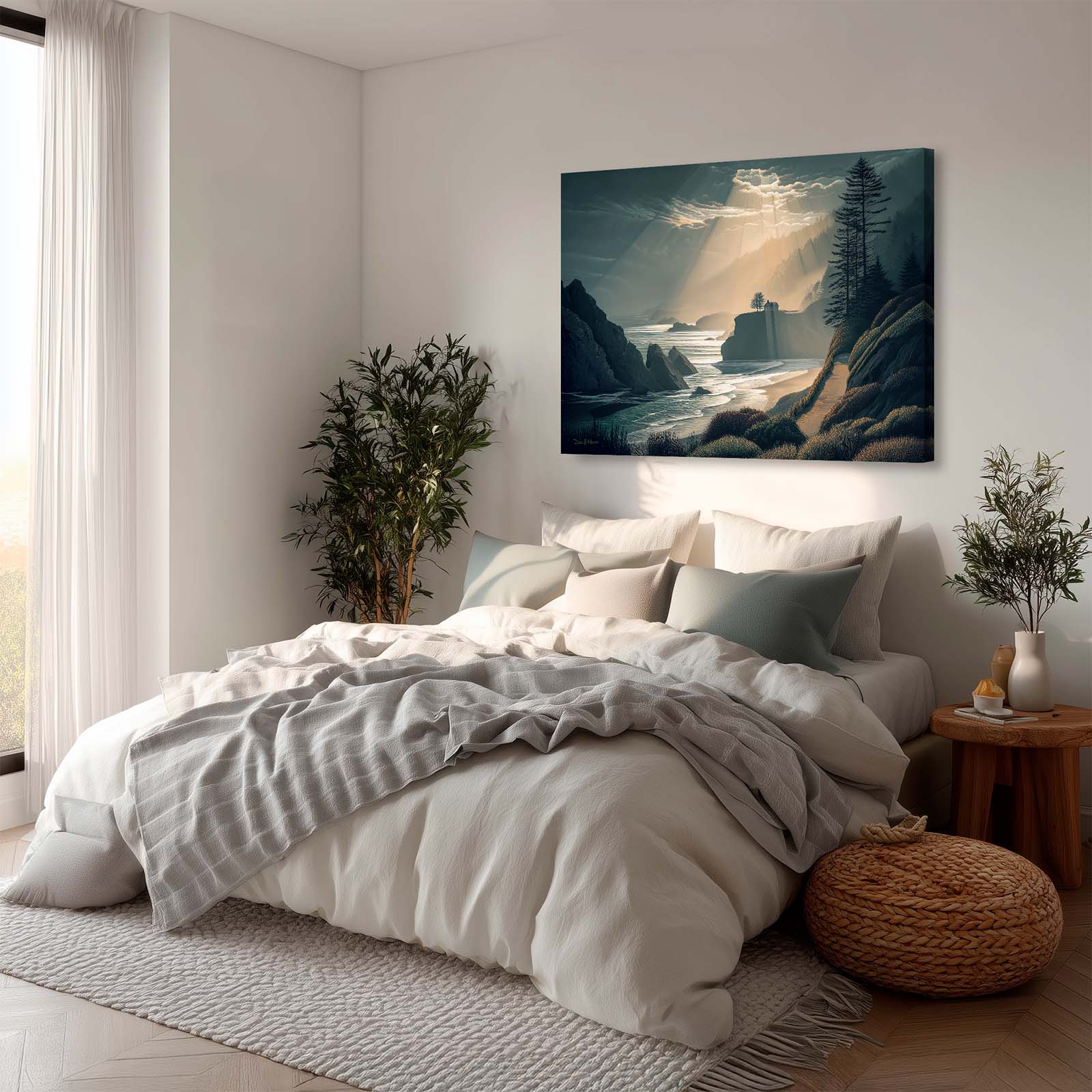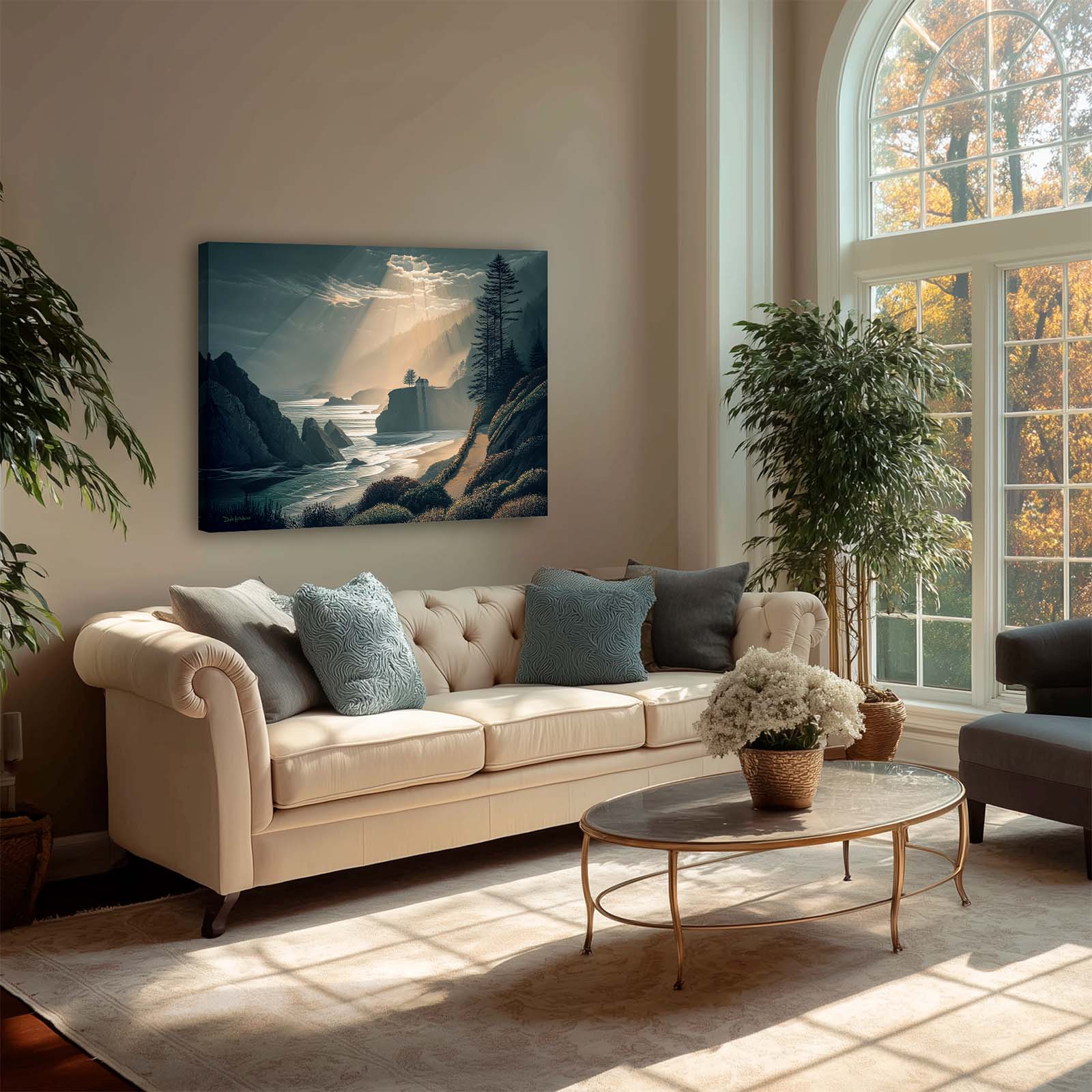 Capture the breathtaking beauty of a coastal sunset with this dramatic canvas print. A house bathed in golden light sits amidst a dynamic ocean and rugged shoreline, creating a striking scene that evokes warmth and awe. Printed on premium giclée canvas, it adds depth, drama, and timeless elegance to any home or office decor