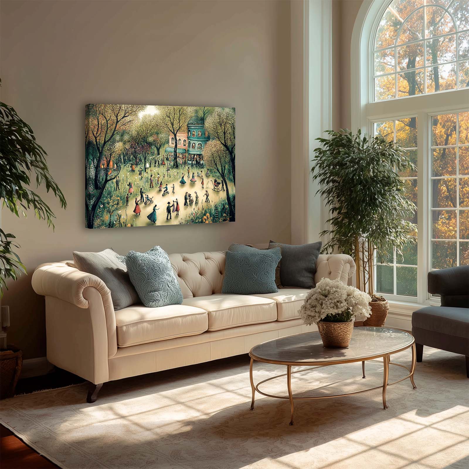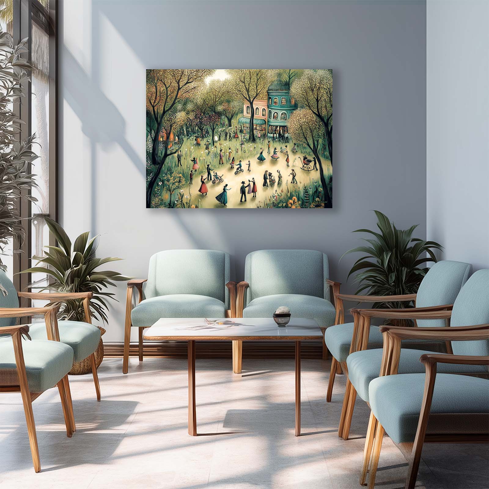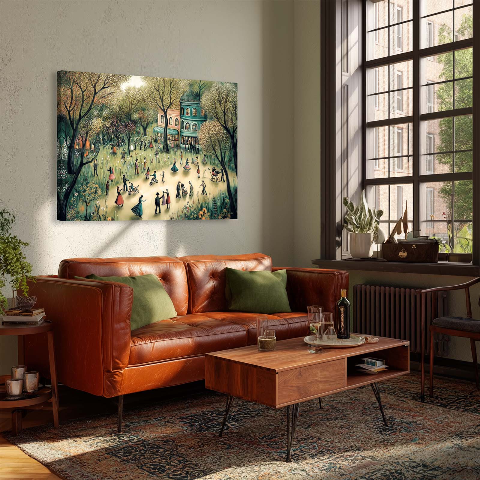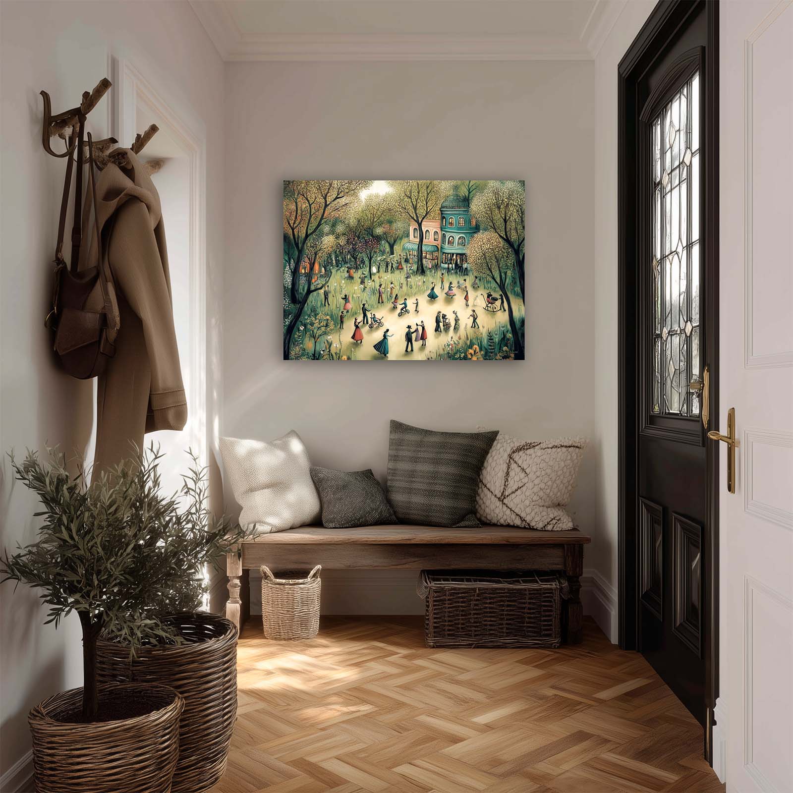 Put your hoe down! It's time to party! Bring energy and joy into your space with this lively canvas print. A community dances together in a vibrant folk art style, capturing the spirit of celebration and togetherness. Printed on premium giclée canvas, it adds warmth, charm, and playful personality to any home or office decor.