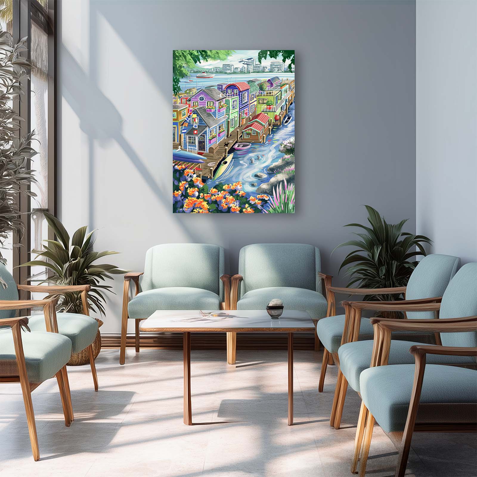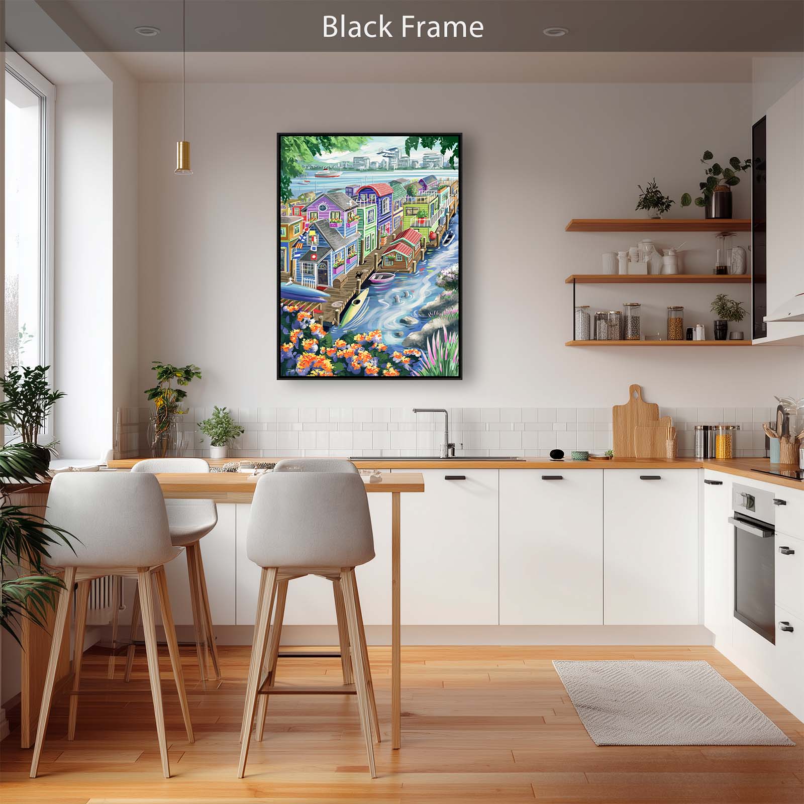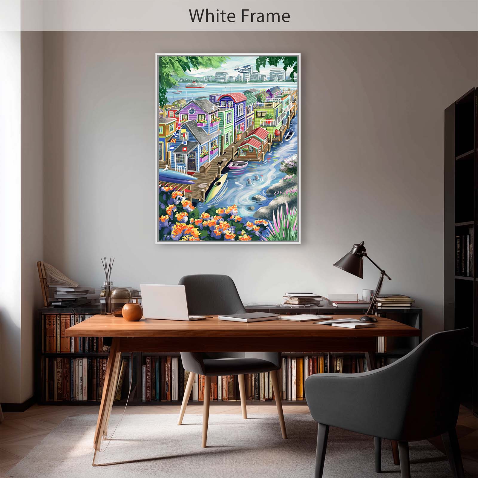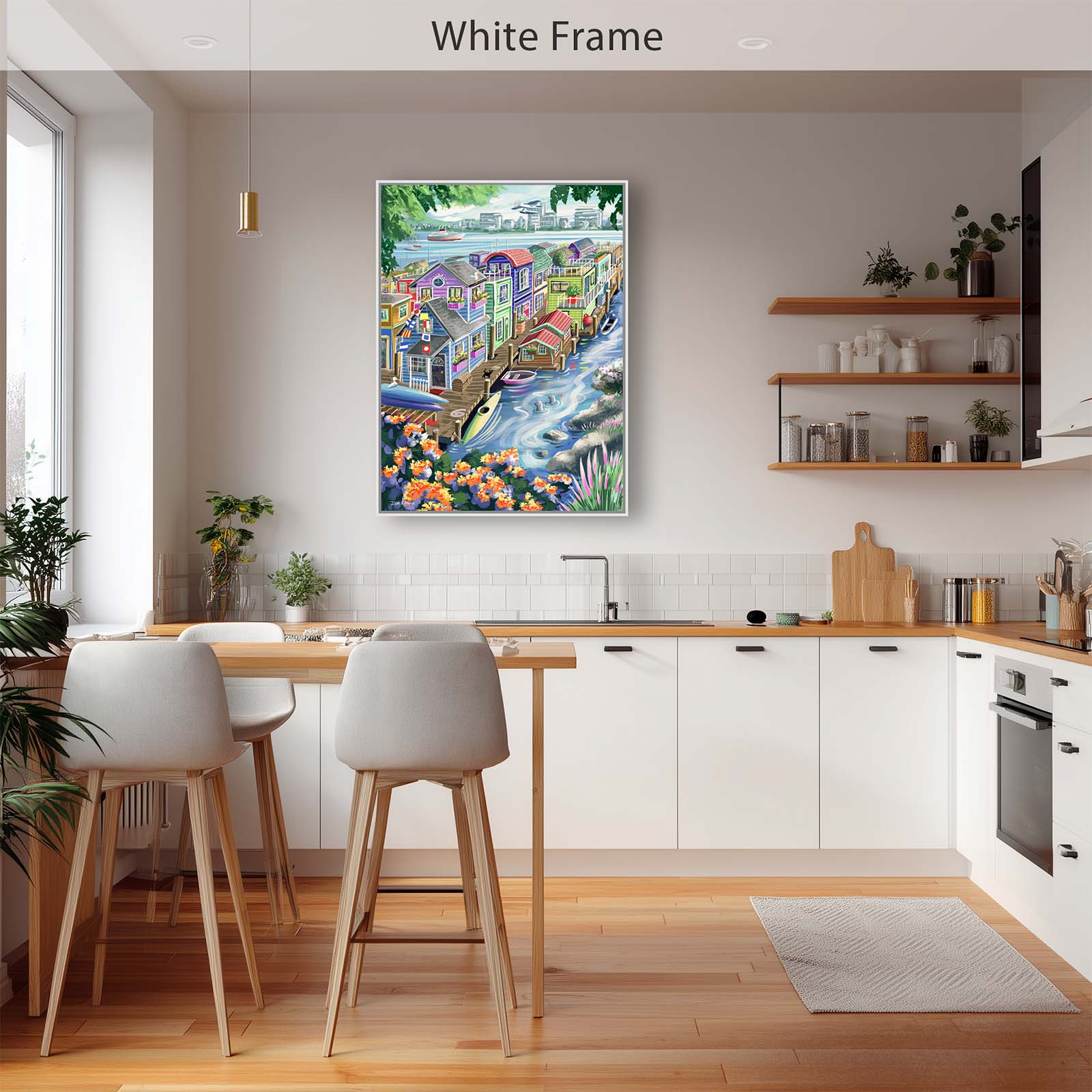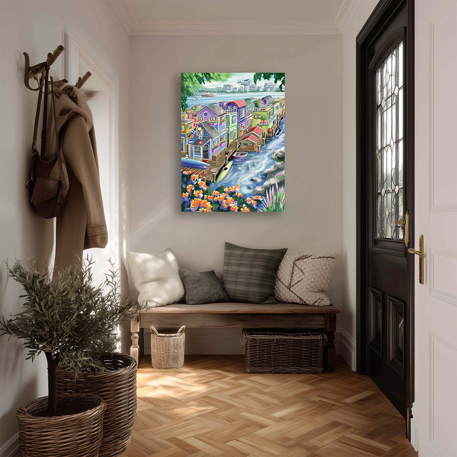Bring vibrant charm and playful detail to your walls with Houseboats. This colorful painting captures the delightful character of funky floating homes, alive with personality and whimsy. A curious cat watches two seals from the wharf, while kayaks and rowboats rest nearby. Flags, flowers, and countless small details add layers of discovery, making this artwork a joy to explore again and again.