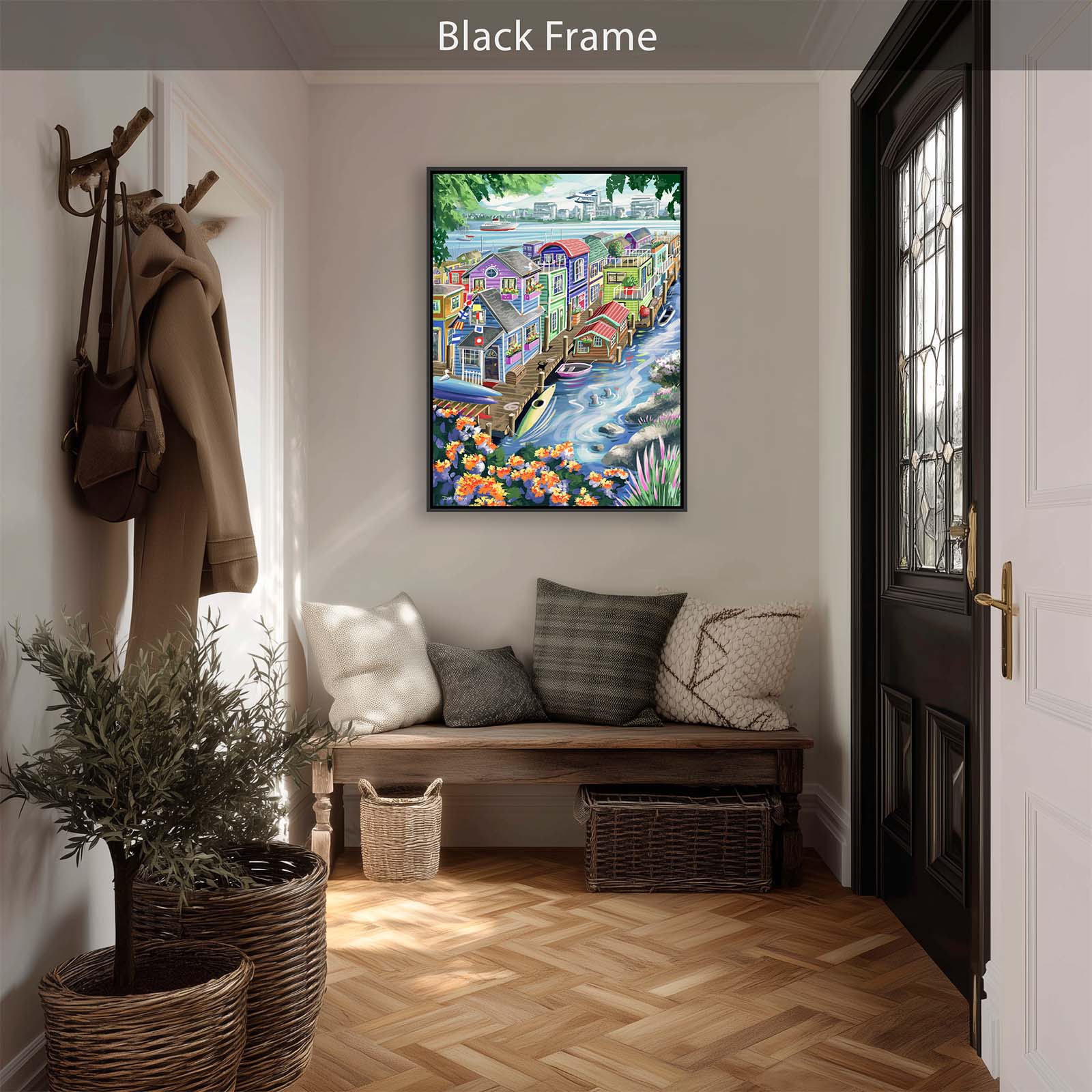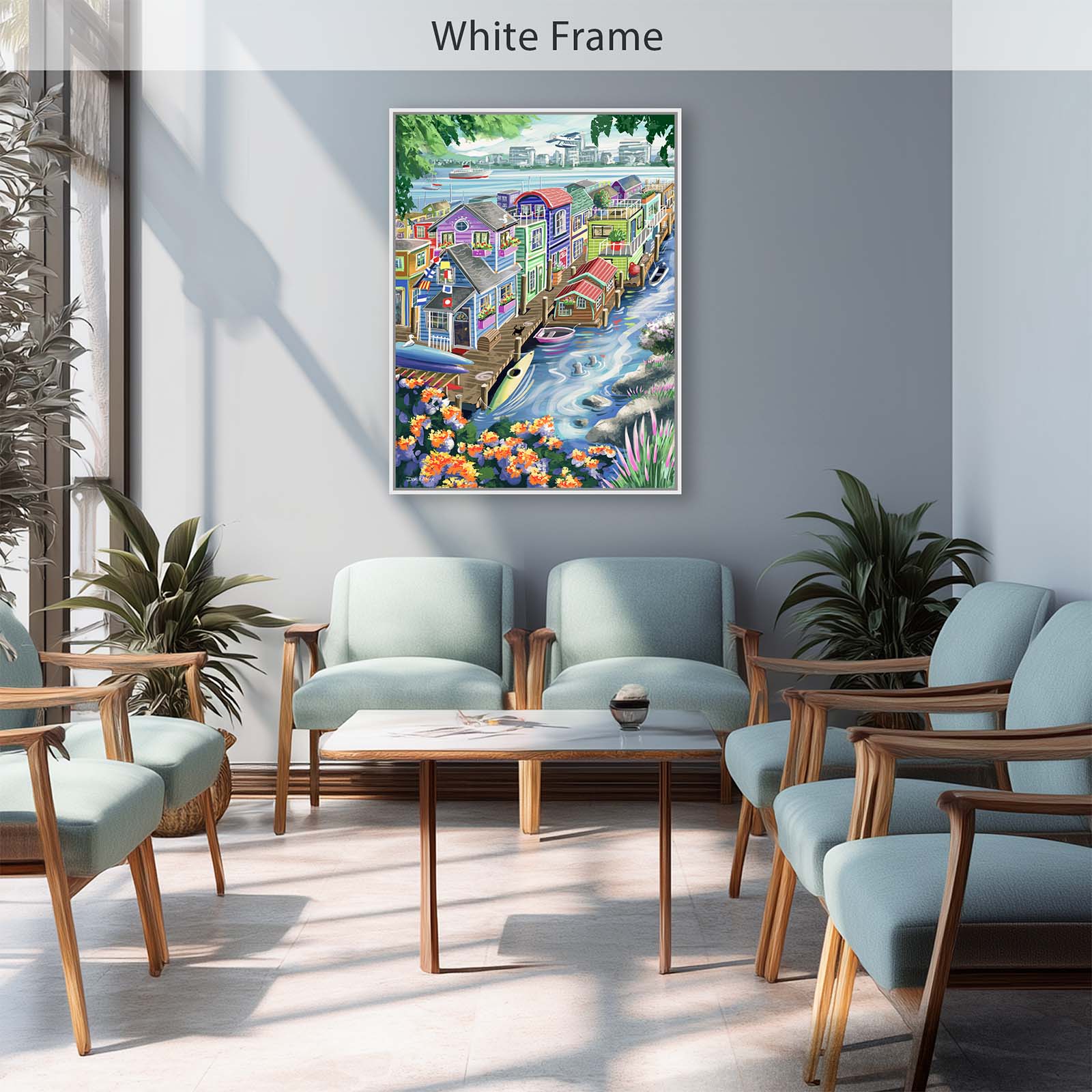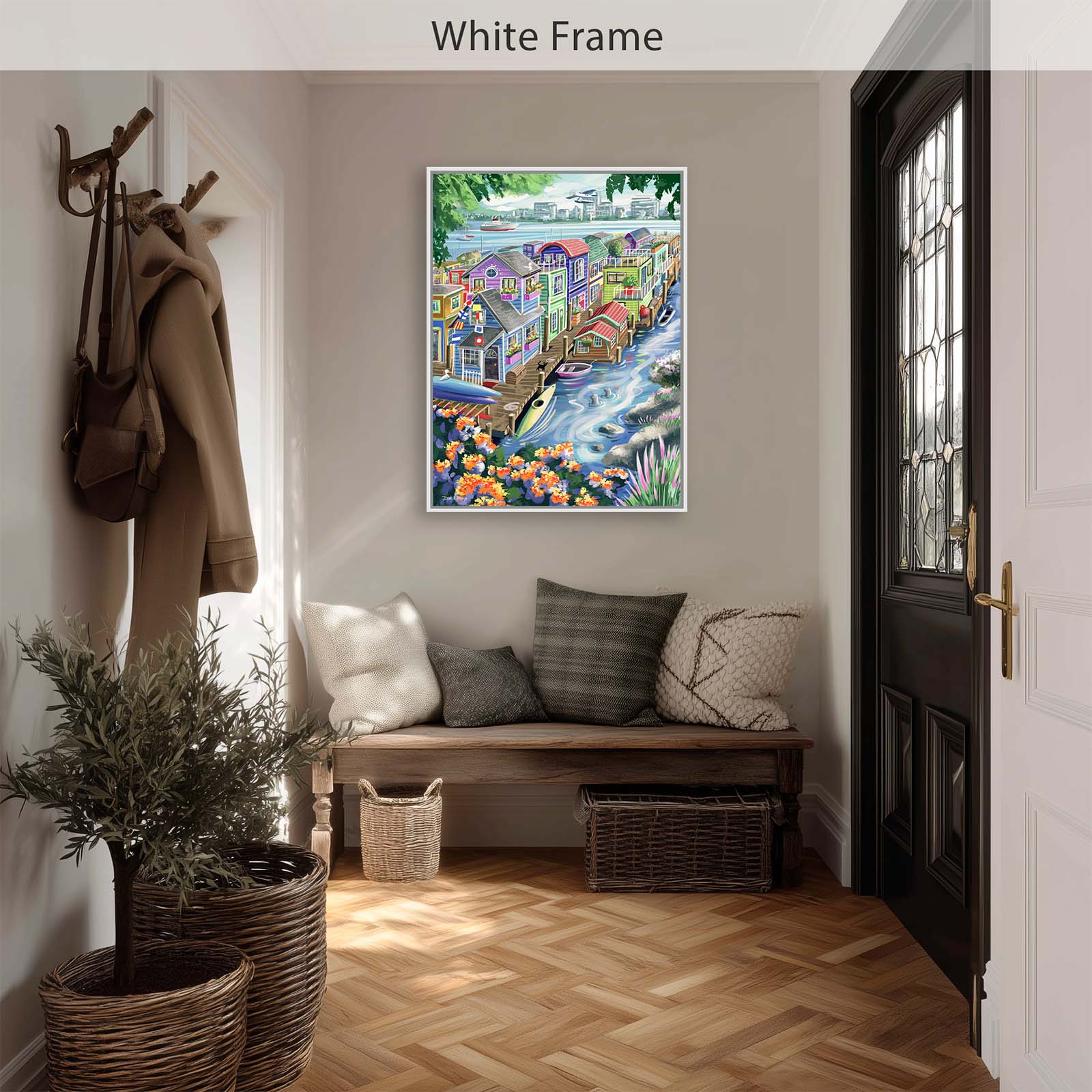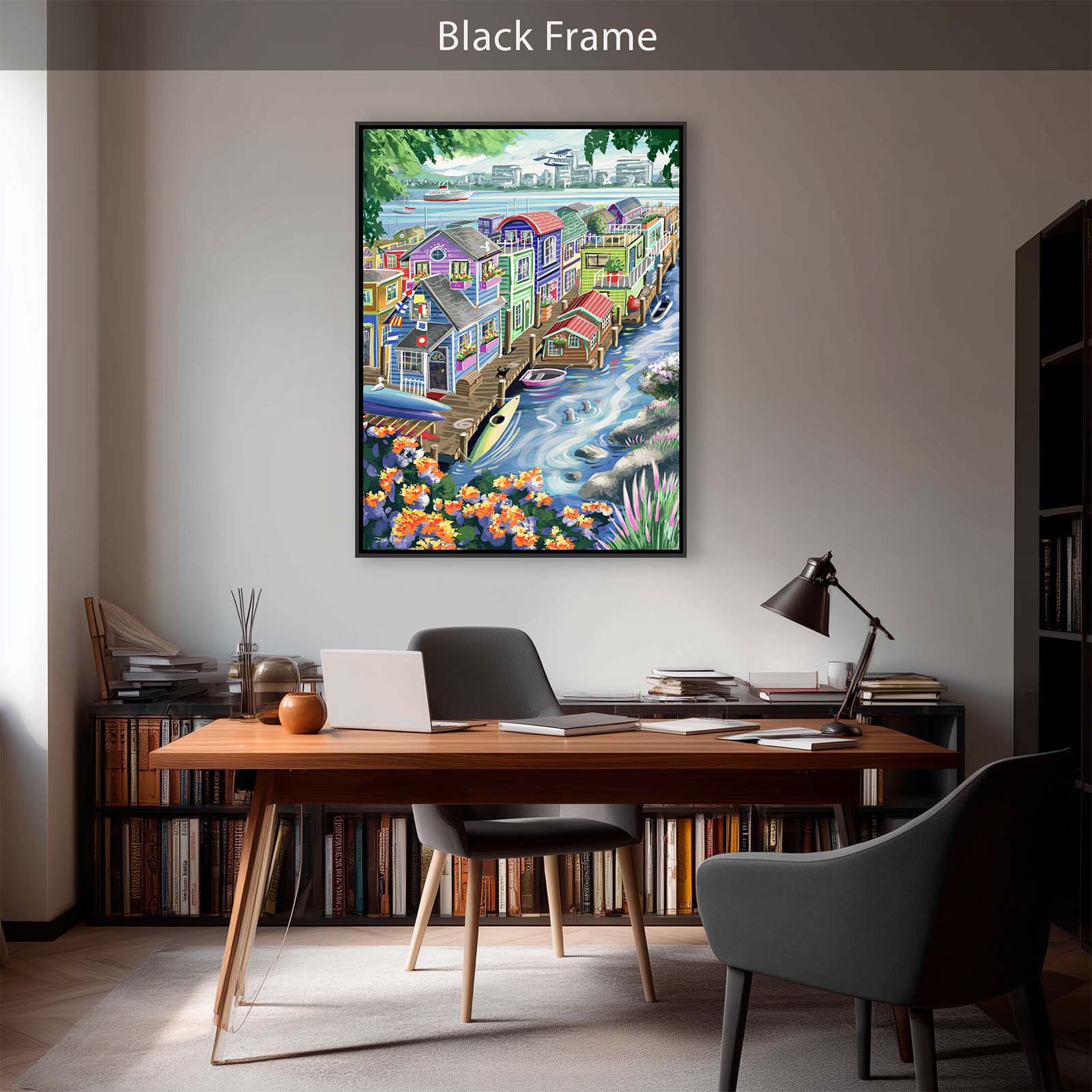 Bring vibrant charm and playful detail to your walls with Houseboats. This colorful painting captures the delightful character of funky floating homes, alive with personality and whimsy. A curious cat watches two seals from the wharf, while kayaks and rowboats rest nearby. Flags, flowers, and countless small details add layers of discovery, making this artwork a joy to explore again and again.