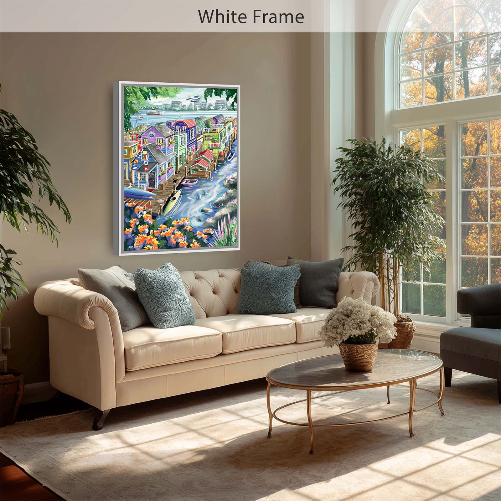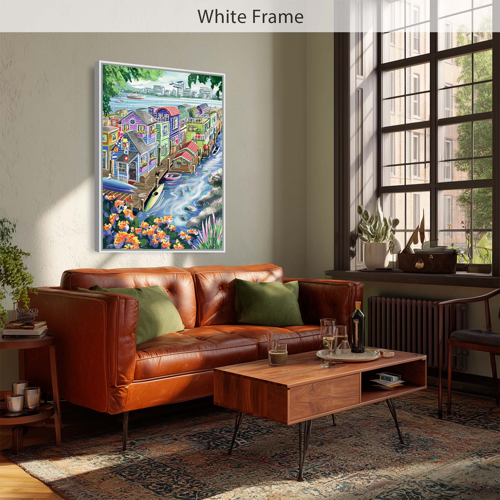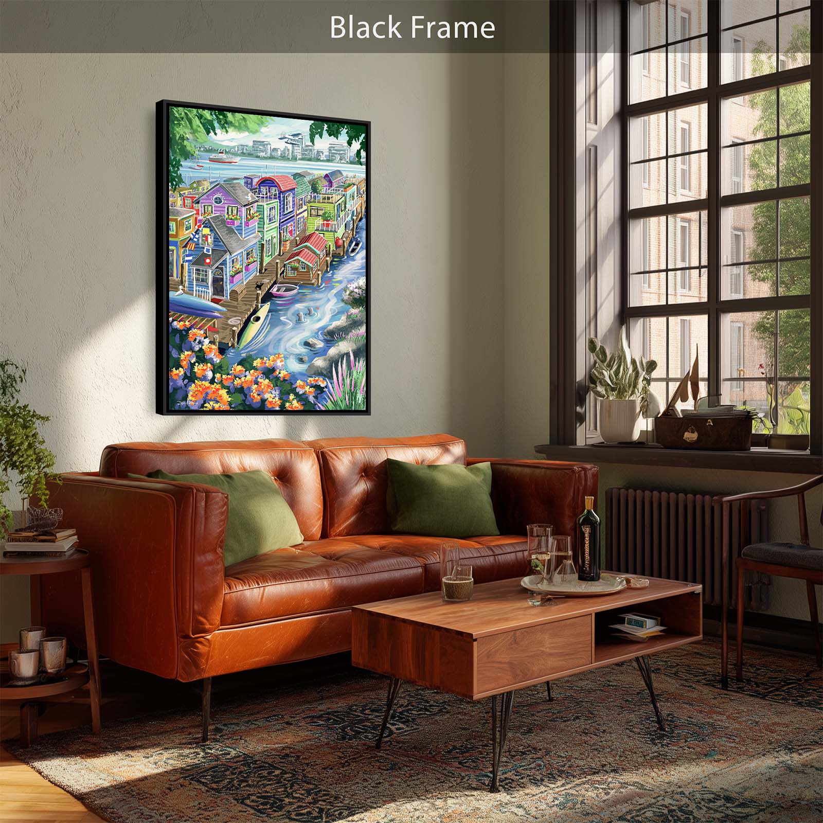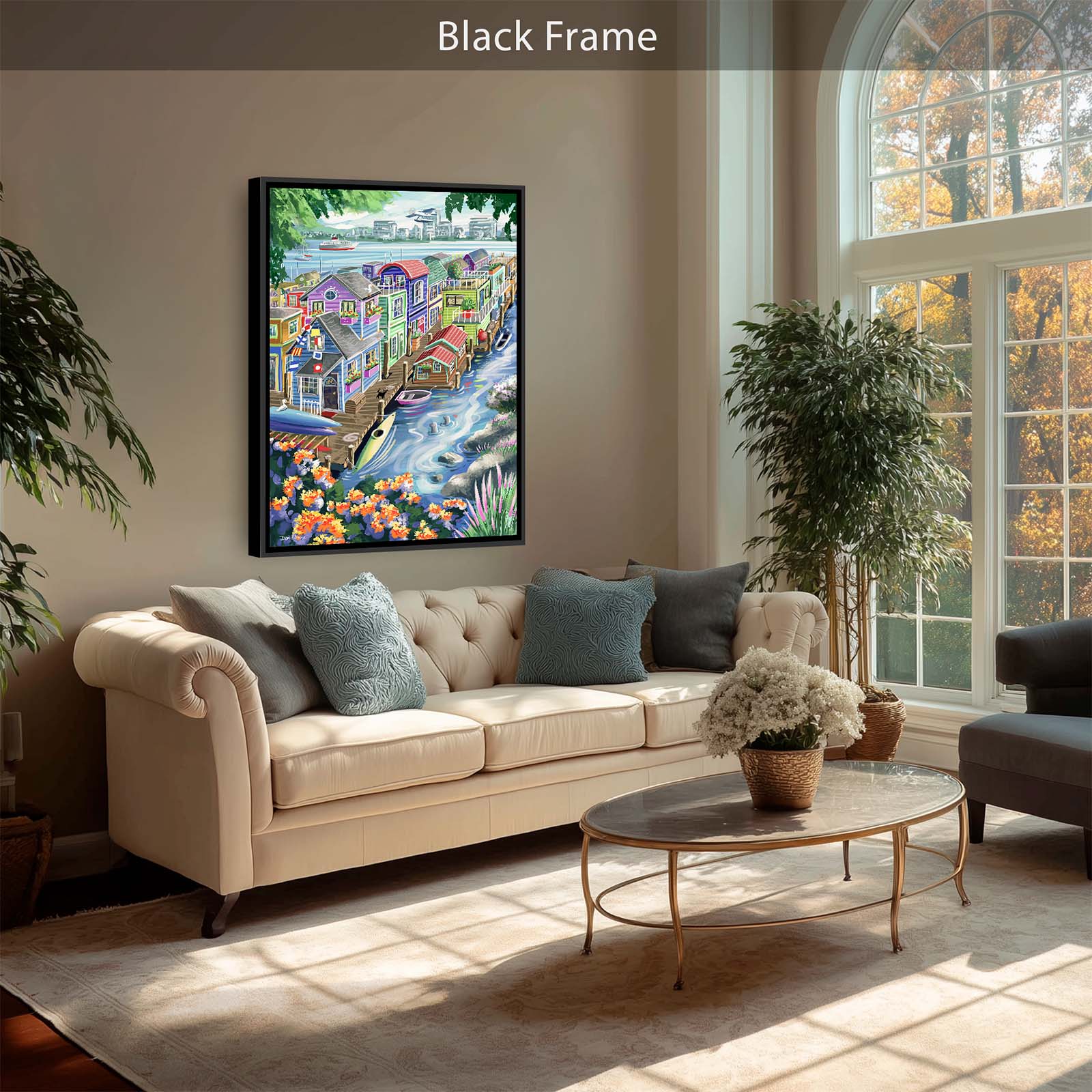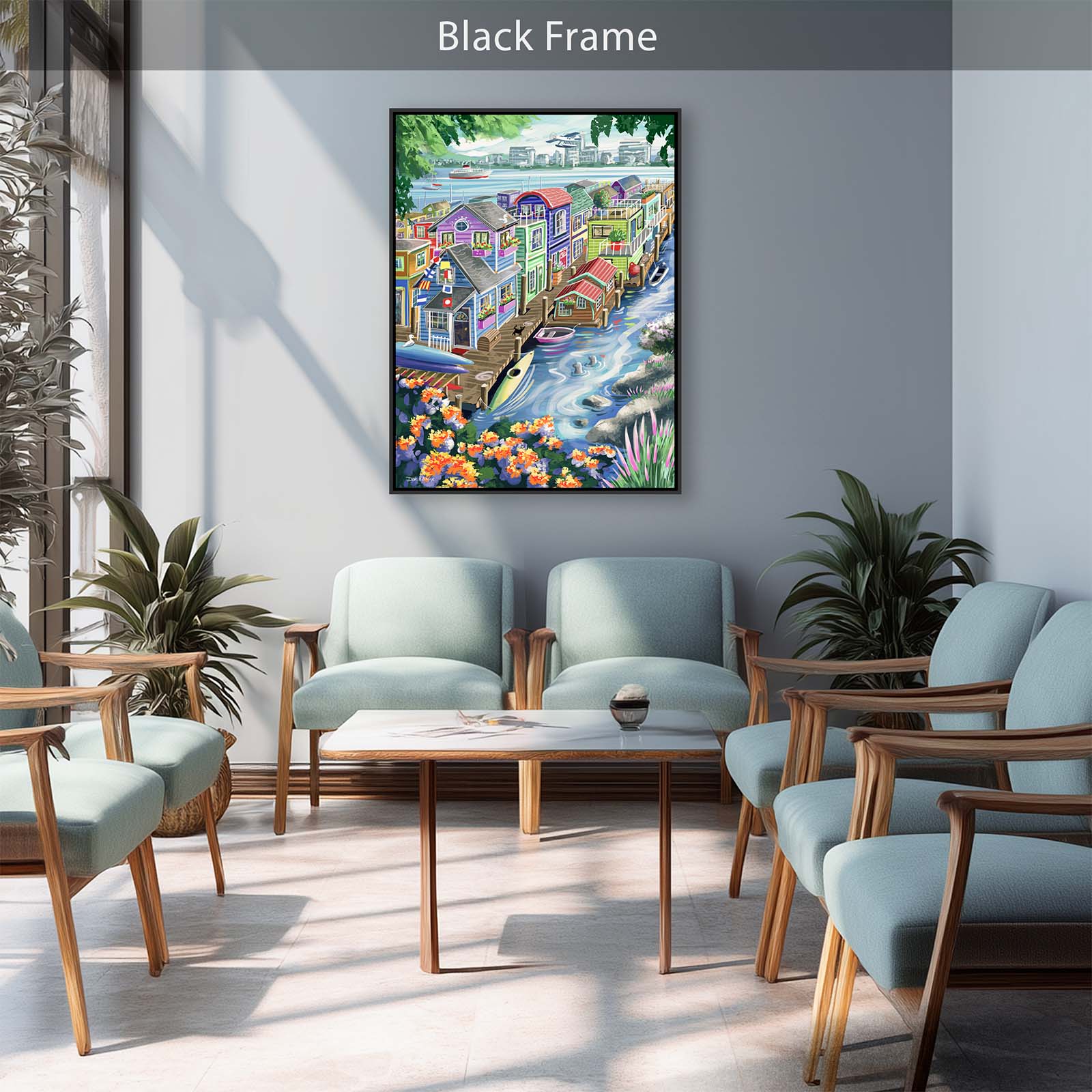 Bring vibrant charm and playful detail to your walls with Houseboats. This colorful painting captures the delightful character of funky floating homes, alive with personality and whimsy. A curious cat watches two seals from the wharf, while kayaks and rowboats rest nearby. Flags, flowers, and countless small details add layers of discovery, making this artwork a joy to explore again and again.