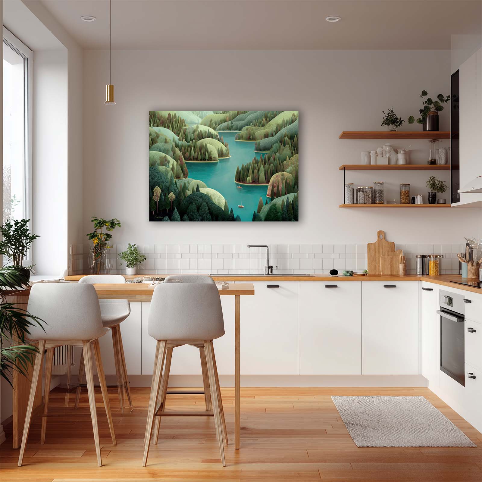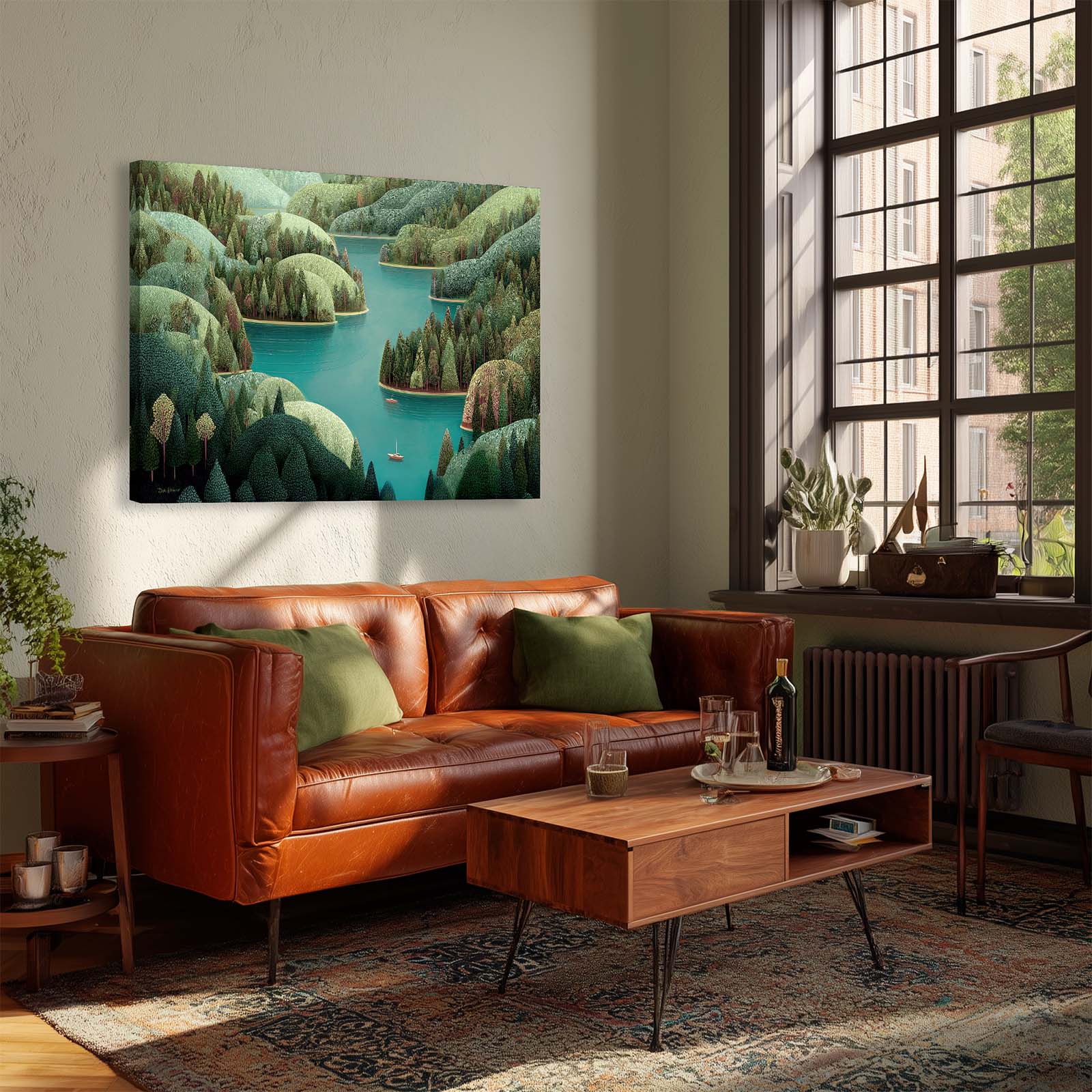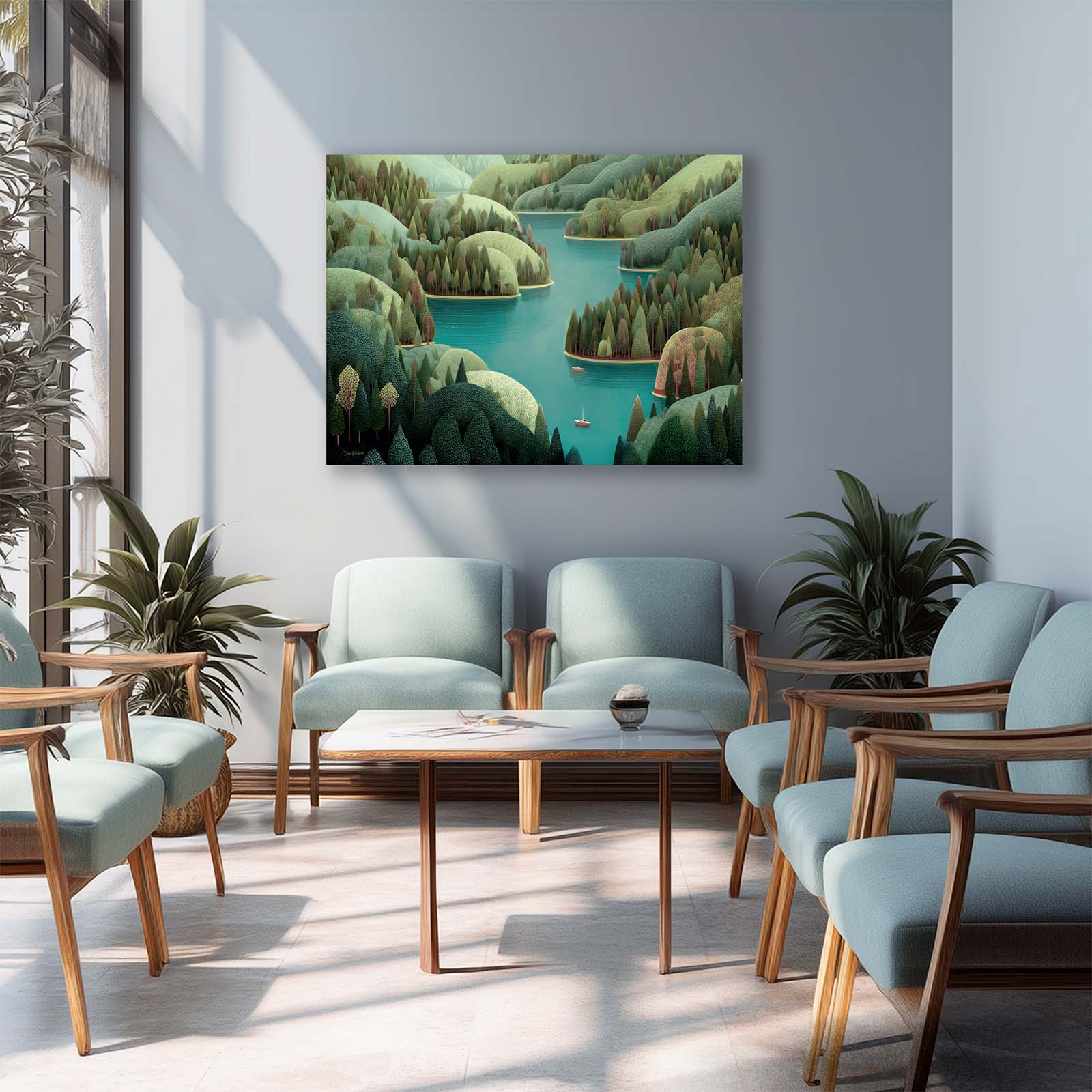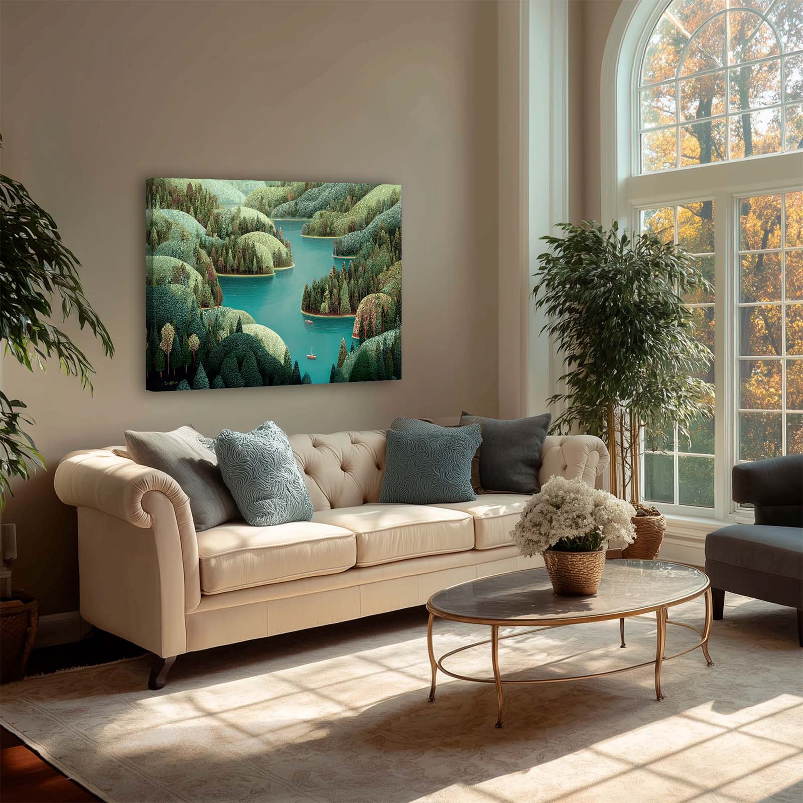 Peaceful and inviting, this playful rendition of two tiny boats anchored in a forested inlet captures the quiet charm of nature at rest. Soft tones and gentle detail make it a perfect fit for nearly any décor—modern, rustic, or coastal. Printed on premium stretched canvas (giclée), it brings warmth, beauty, and a sense of calm to your home or office.