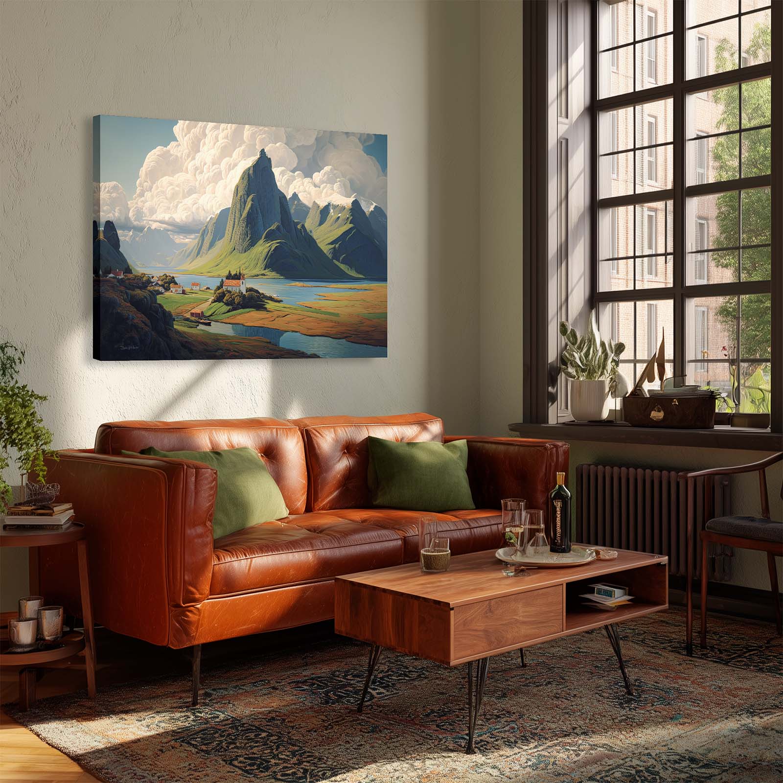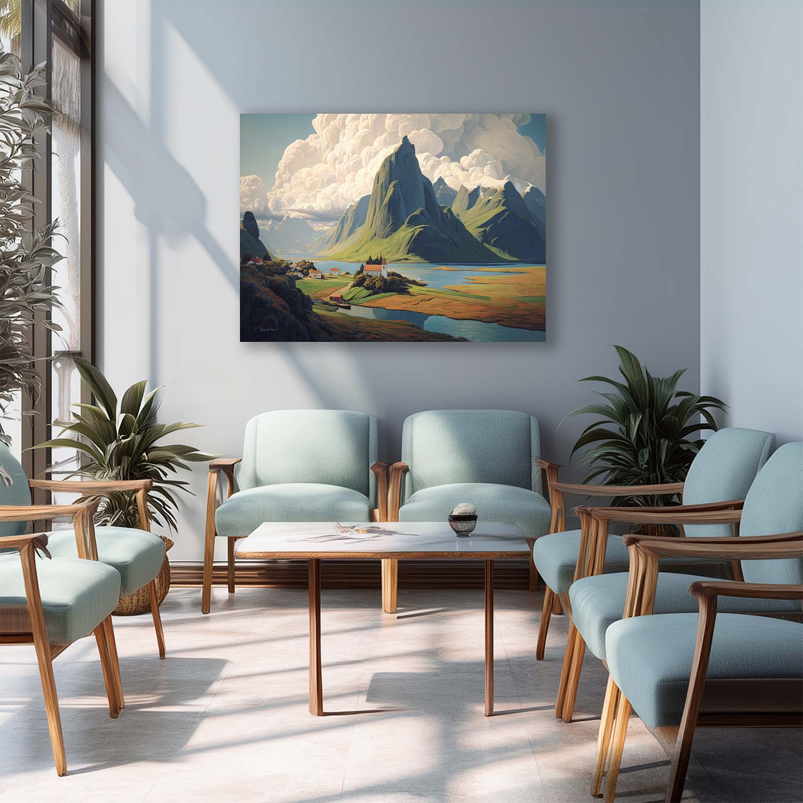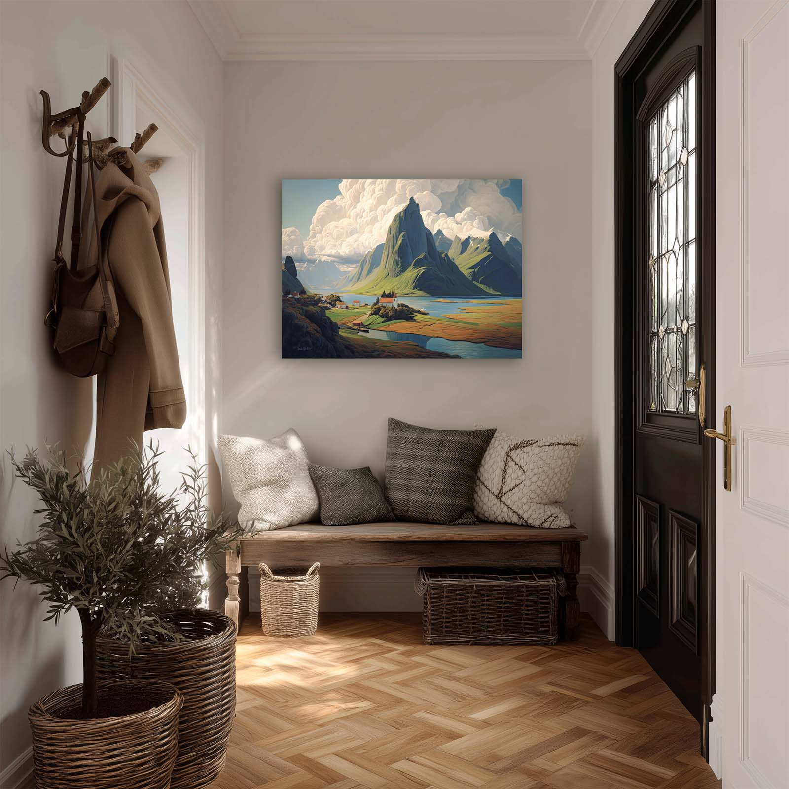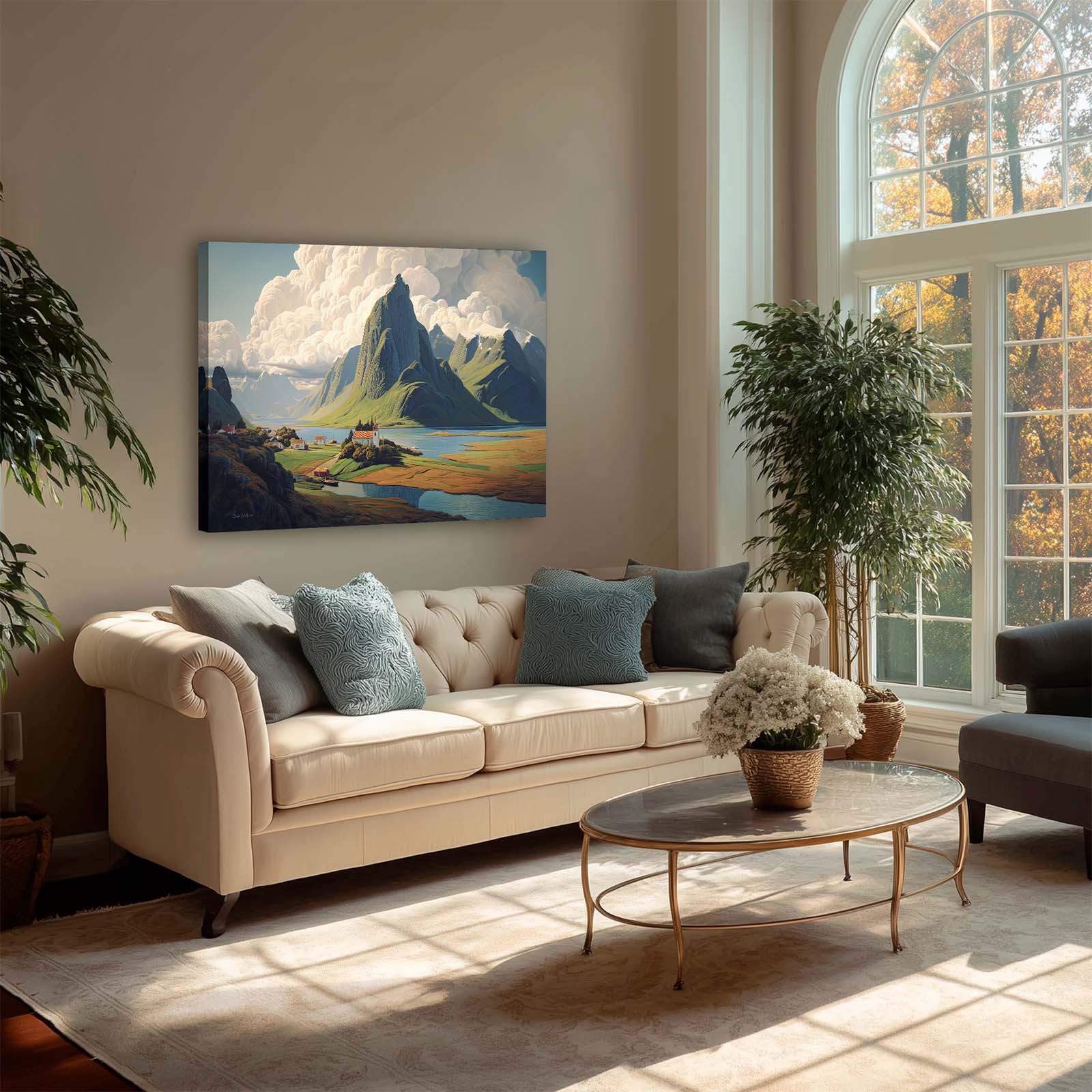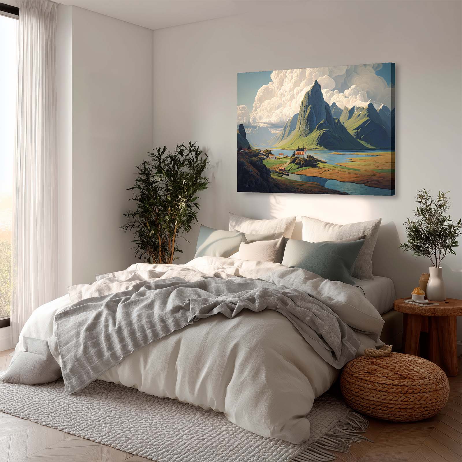 Bring serene beauty and charm to your space with this canvas print. A church nestled in a Scandinavian fjord is captured on a beautiful day, evoking tranquility, cultural elegance, and the majesty of nature. Printed on premium giclée canvas, it adds sophistication, visual interest, and timeless artistry to any home or office decor.