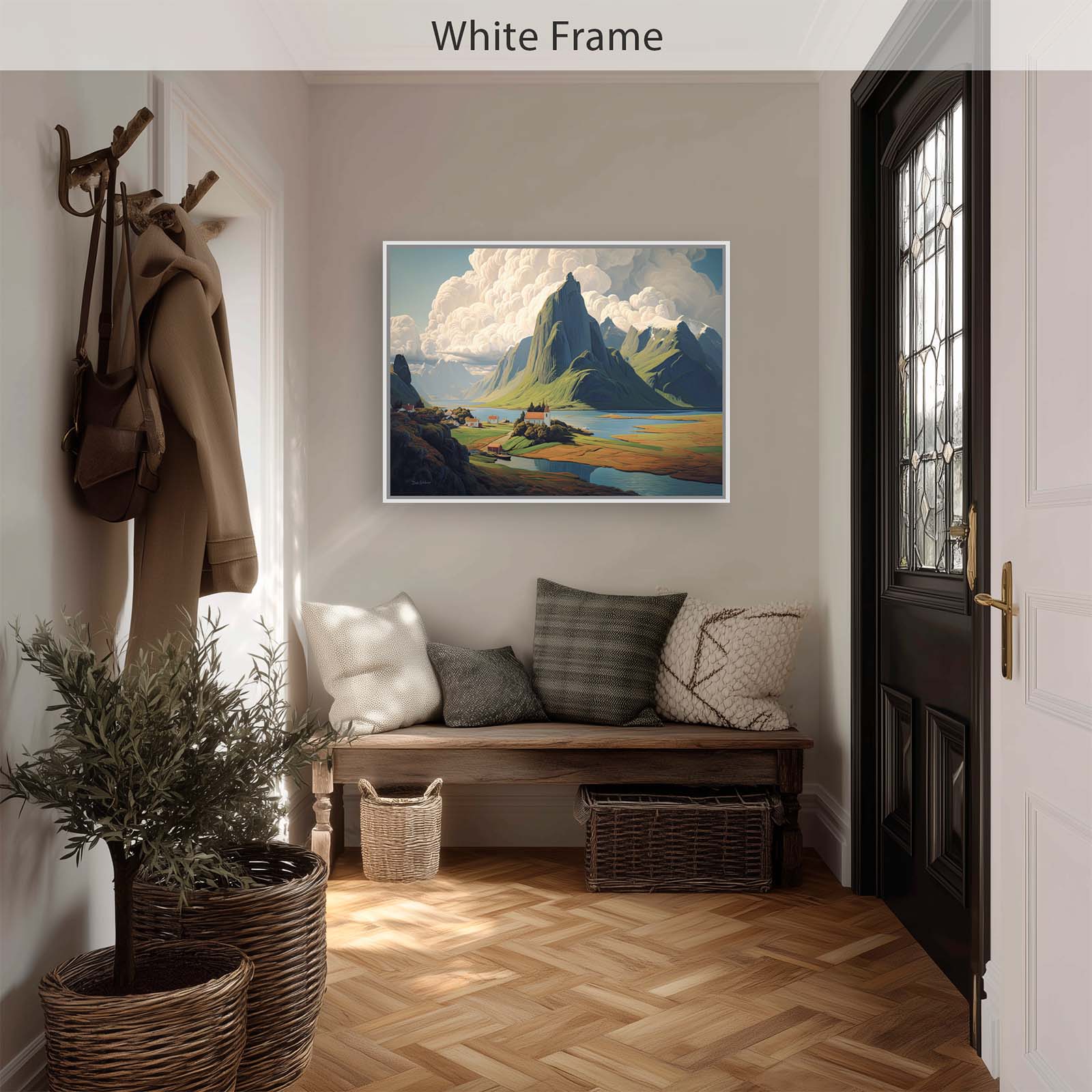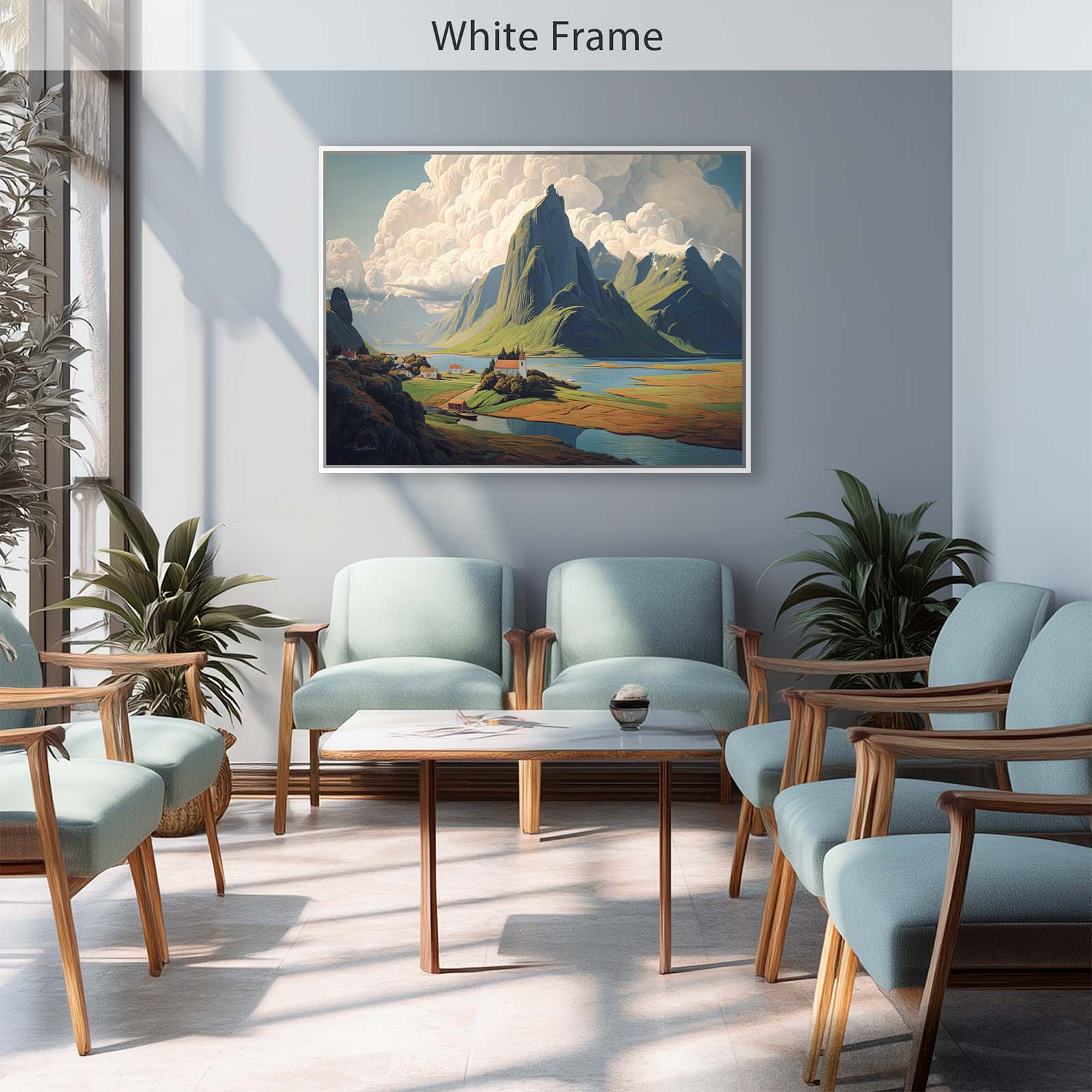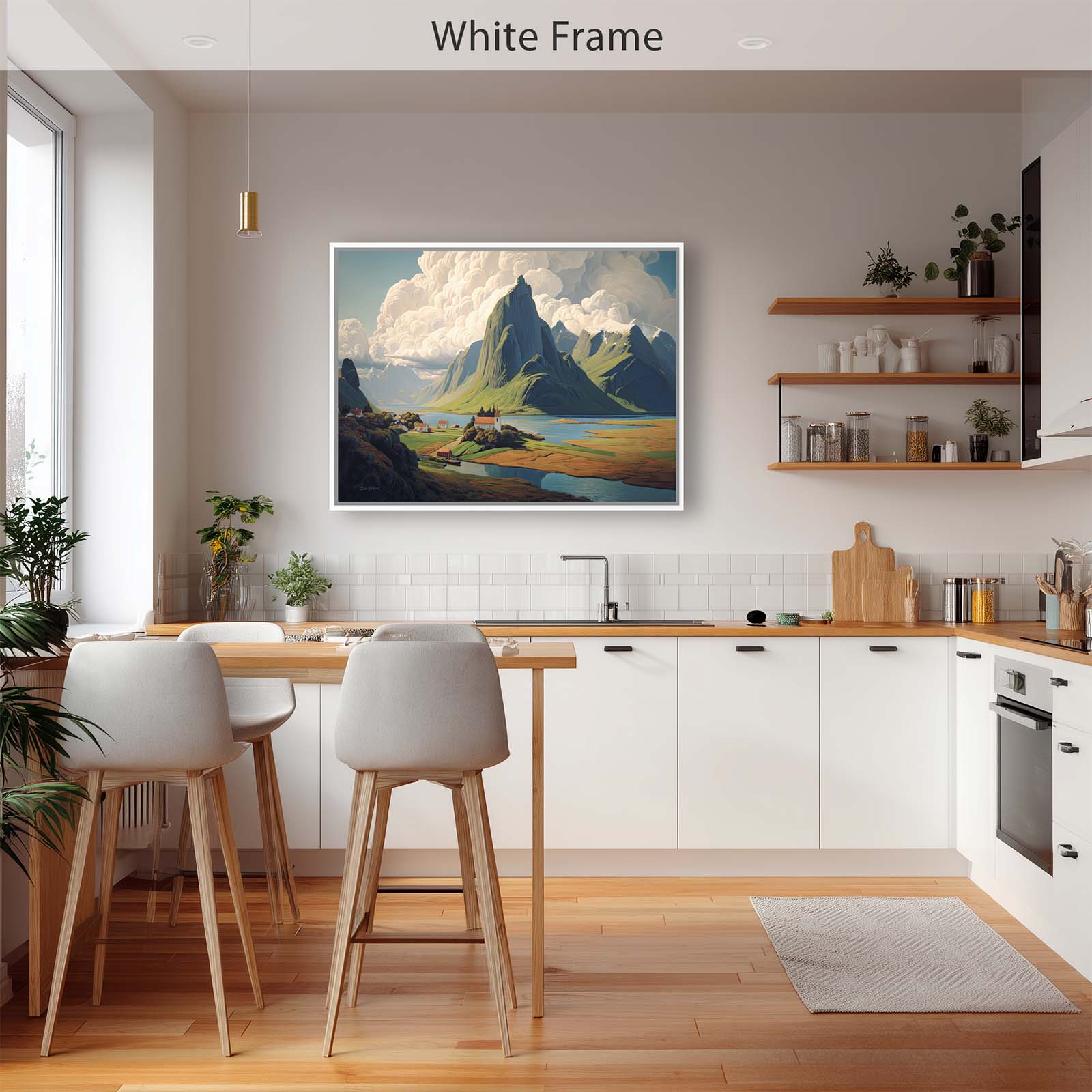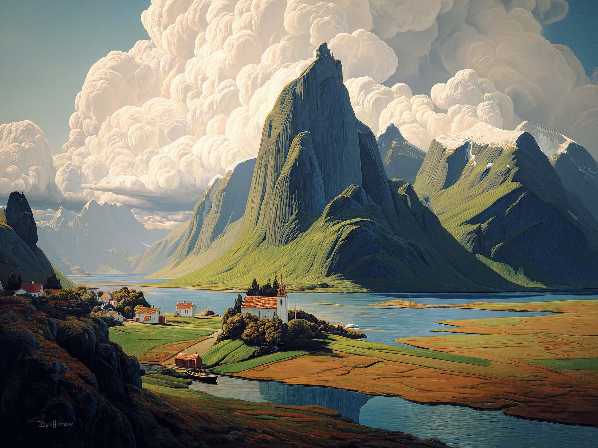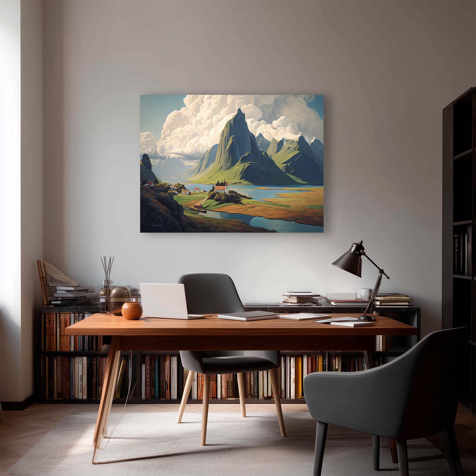 Bring serene beauty and charm to your space with this canvas print. A church nestled in a Scandinavian fjord is captured on a beautiful day, evoking tranquility, cultural elegance, and the majesty of nature. Printed on premium giclée canvas, it adds sophistication, visual interest, and timeless artistry to any home or office decor.