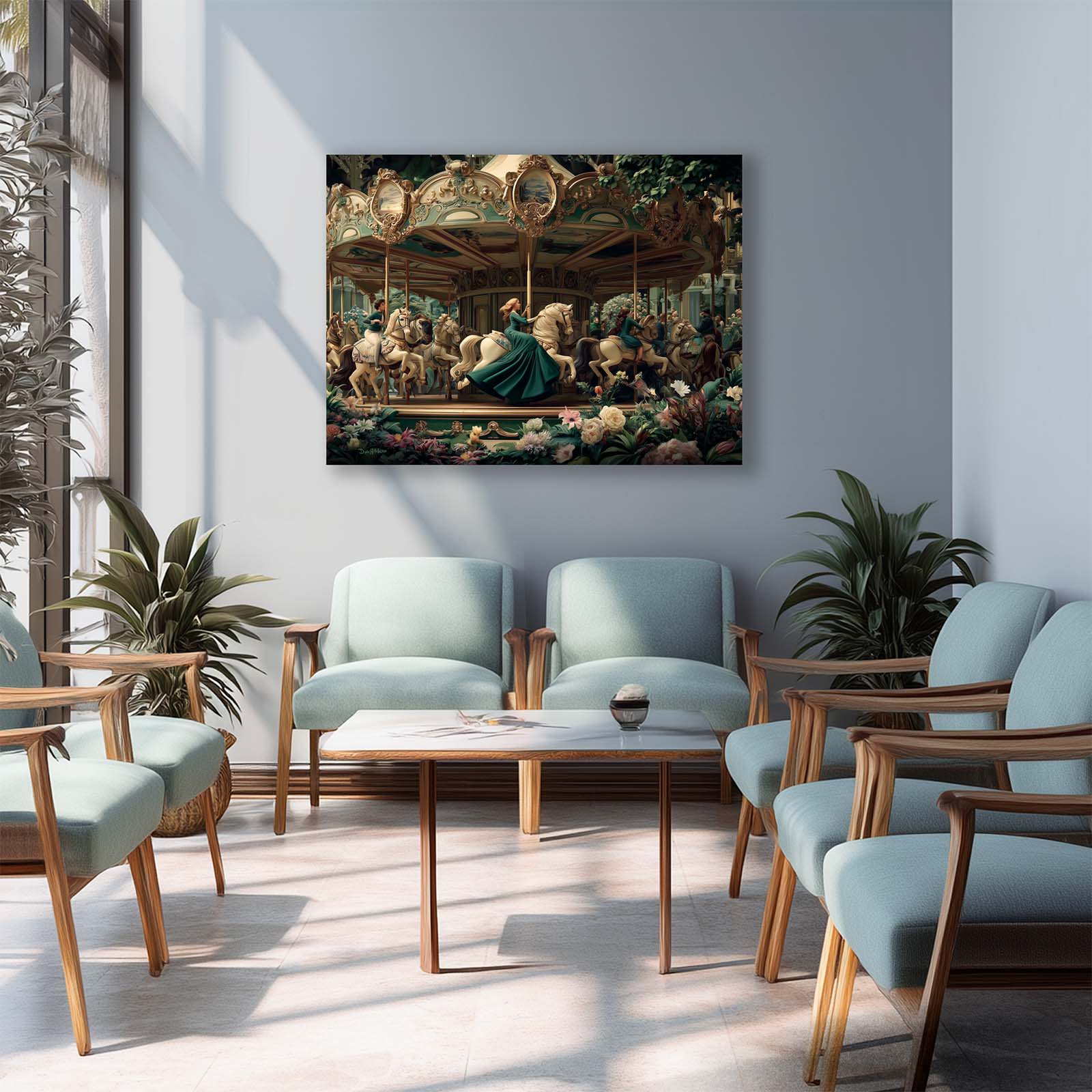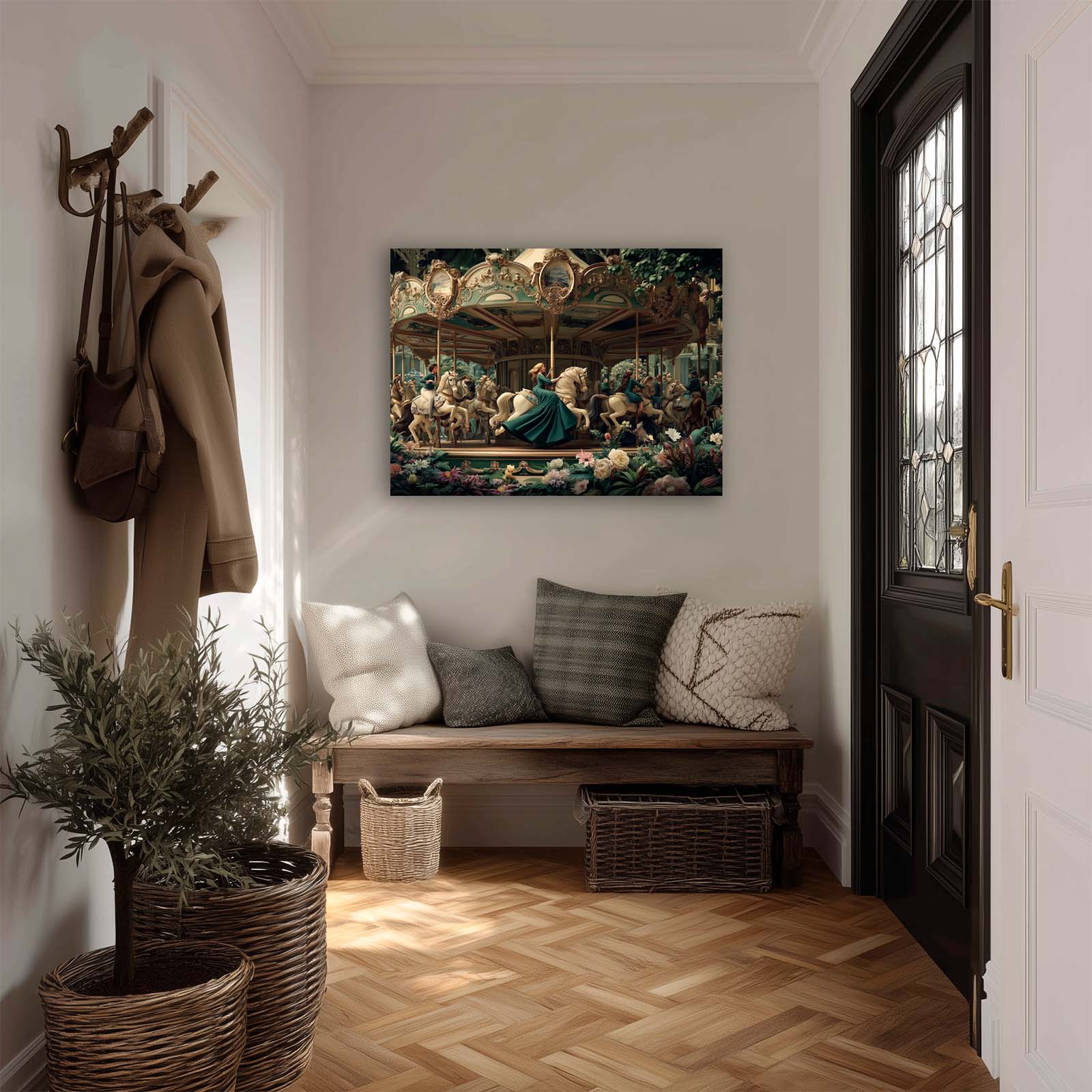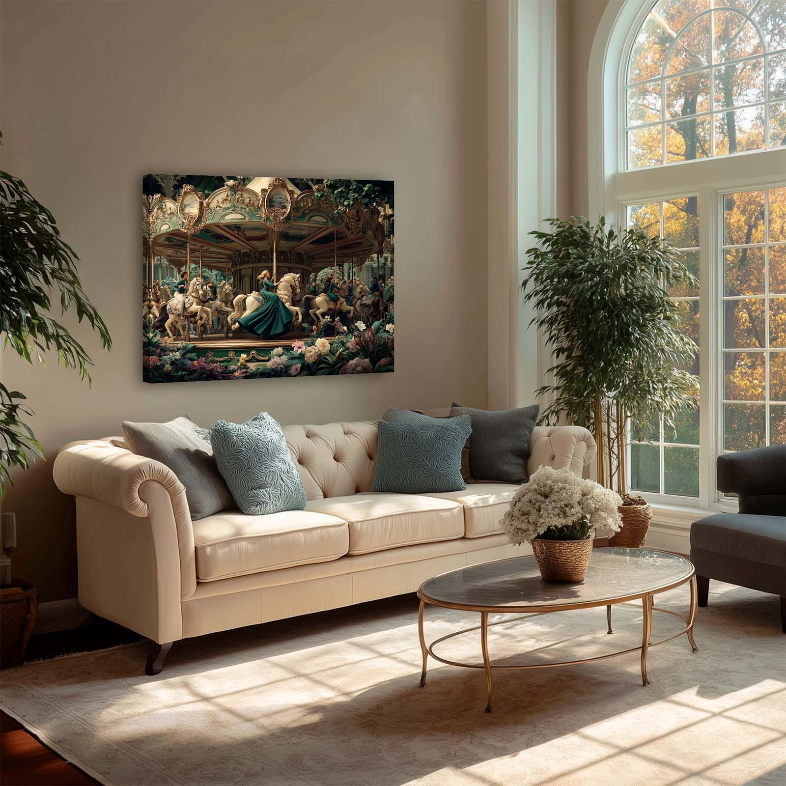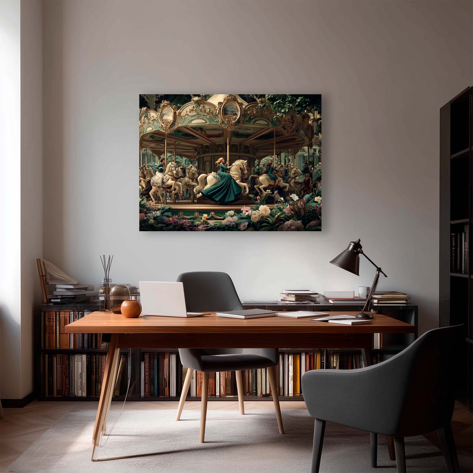Step back in time with this beautifully romantic stretched-canvas art print. Featuring a young woman riding an elegant, ornate merry-go-round, this image captures grace, nostalgia, and timeless charm. Rendered in a realistic, romantic style, it adds warmth and refinement to any room. Perfect for classic, vintage, or eclectic interiors, this premium giclée print brings a touch of old-world beauty to your home or office décor.