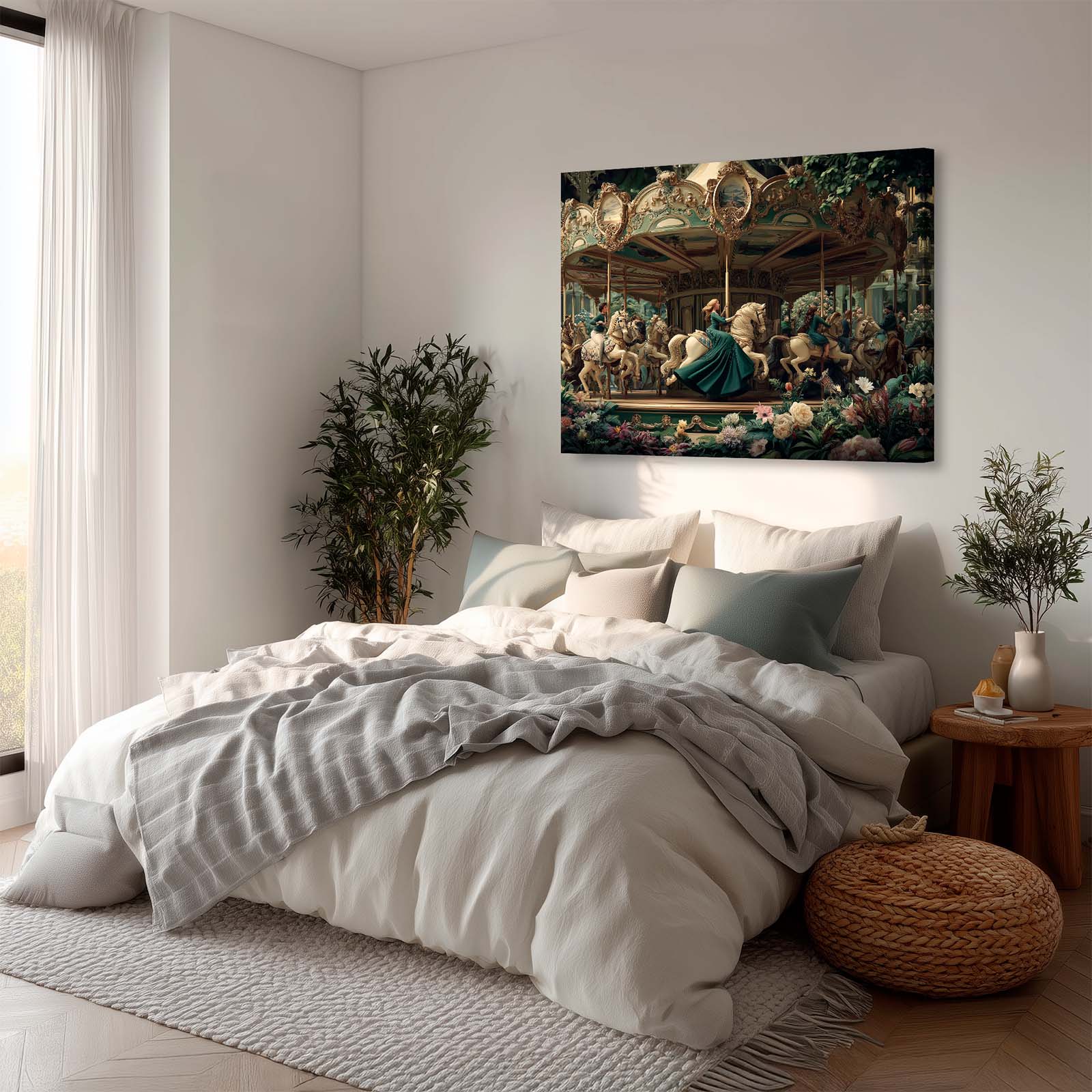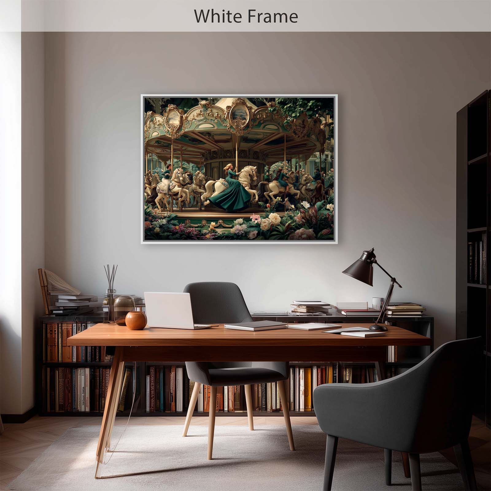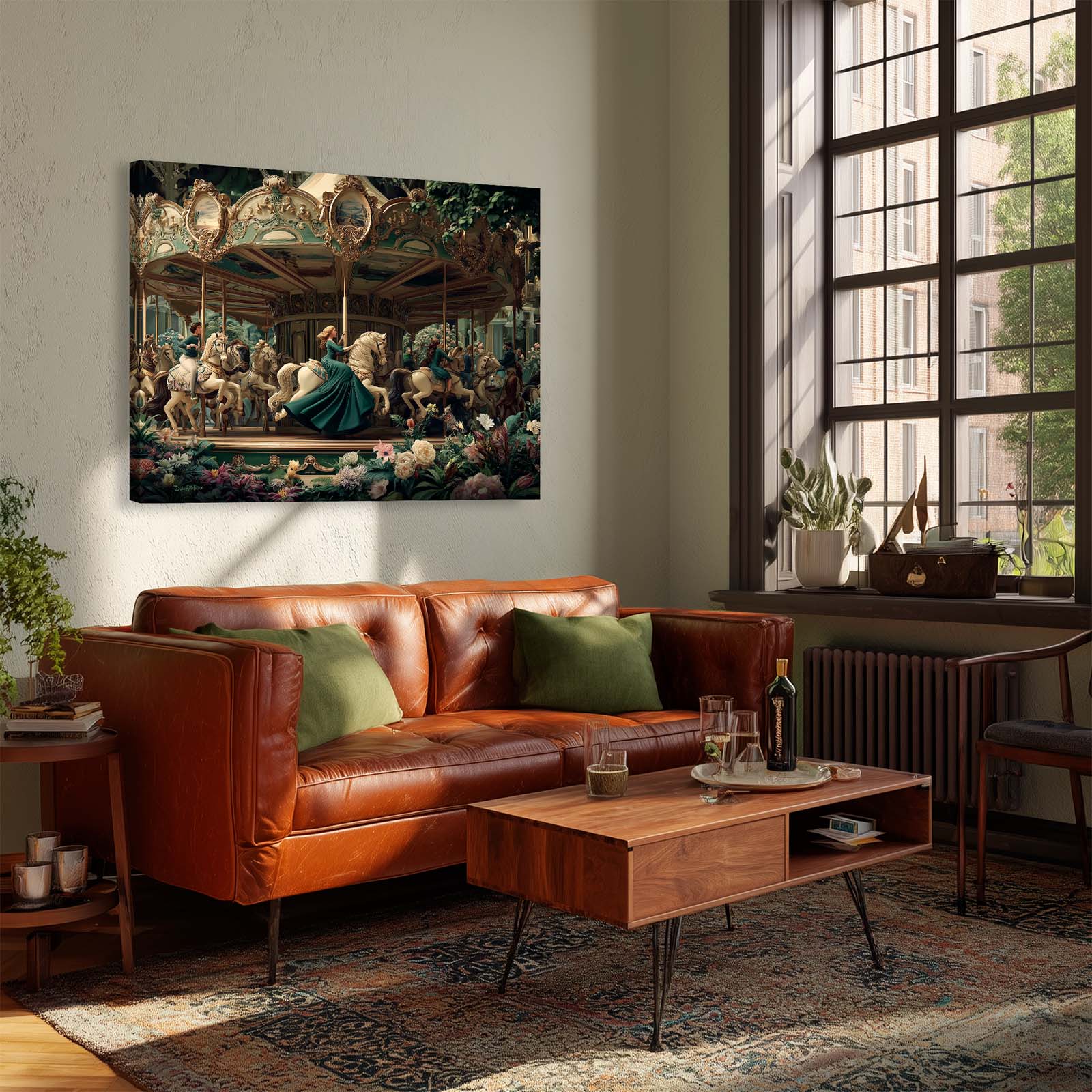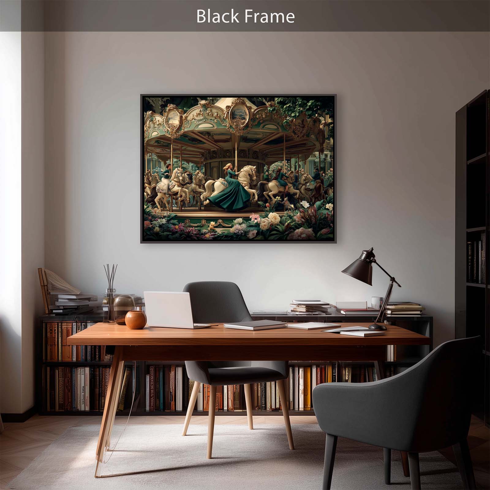 Step back in time with this beautifully romantic stretched-canvas art print. Featuring a young woman riding an elegant, ornate merry-go-round, this image captures grace, nostalgia, and timeless charm. Rendered in a realistic, romantic style, it adds warmth and refinement to any room. Perfect for classic, vintage, or eclectic interiors, this premium giclée print brings a touch of old-world beauty to your home or office décor.