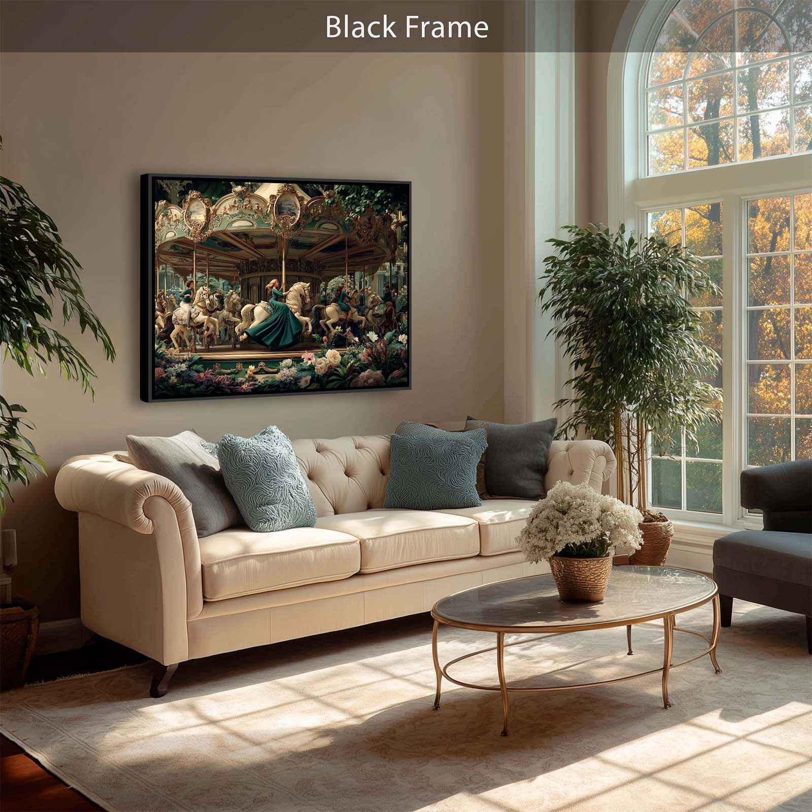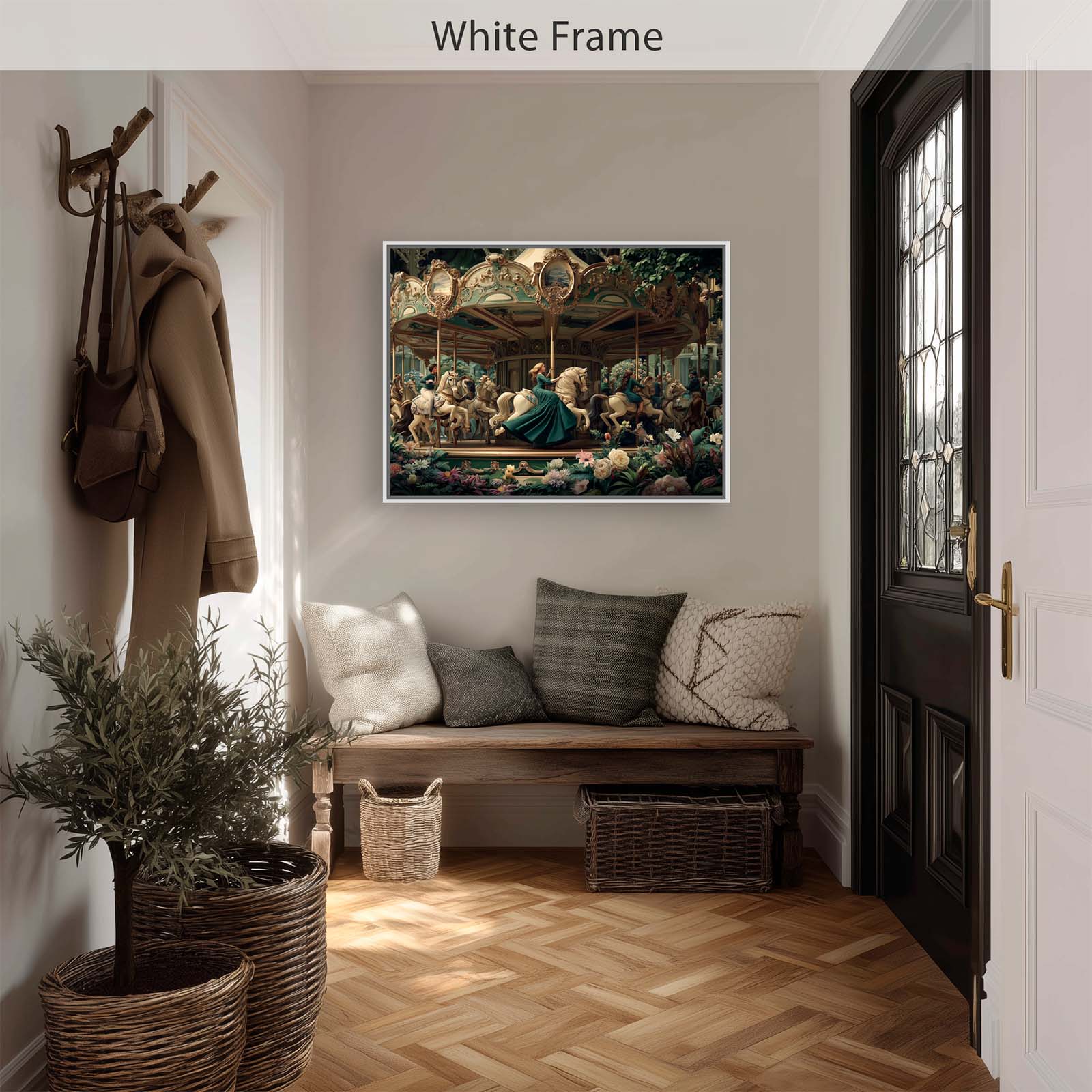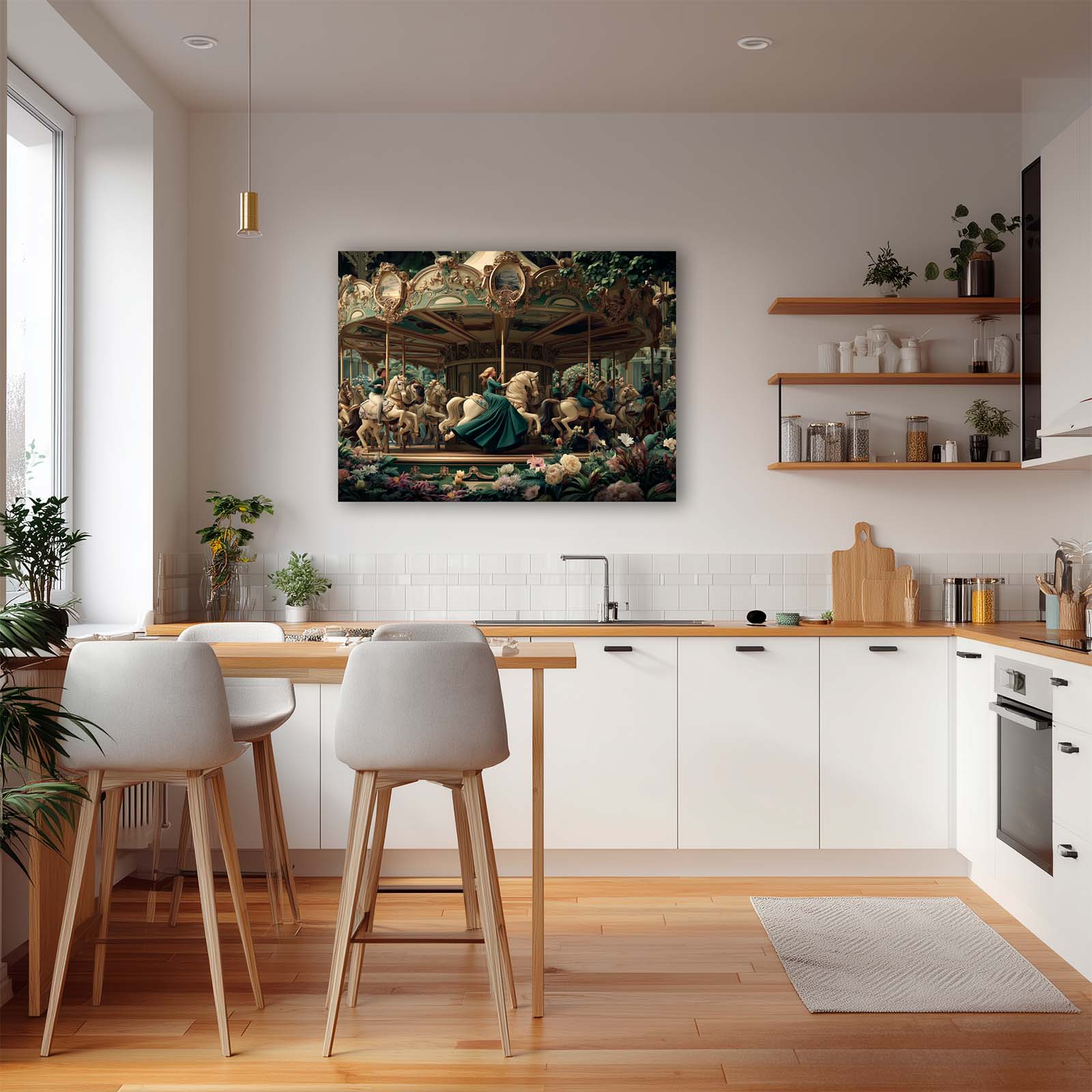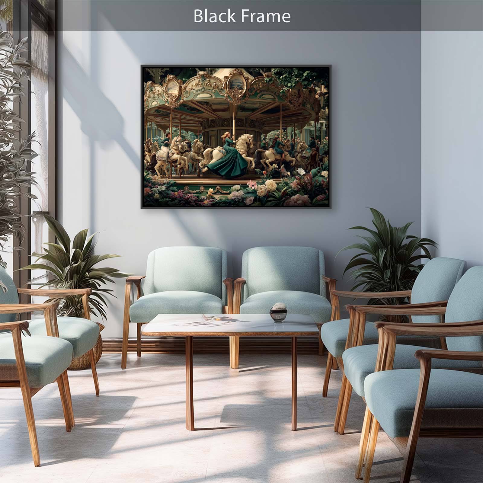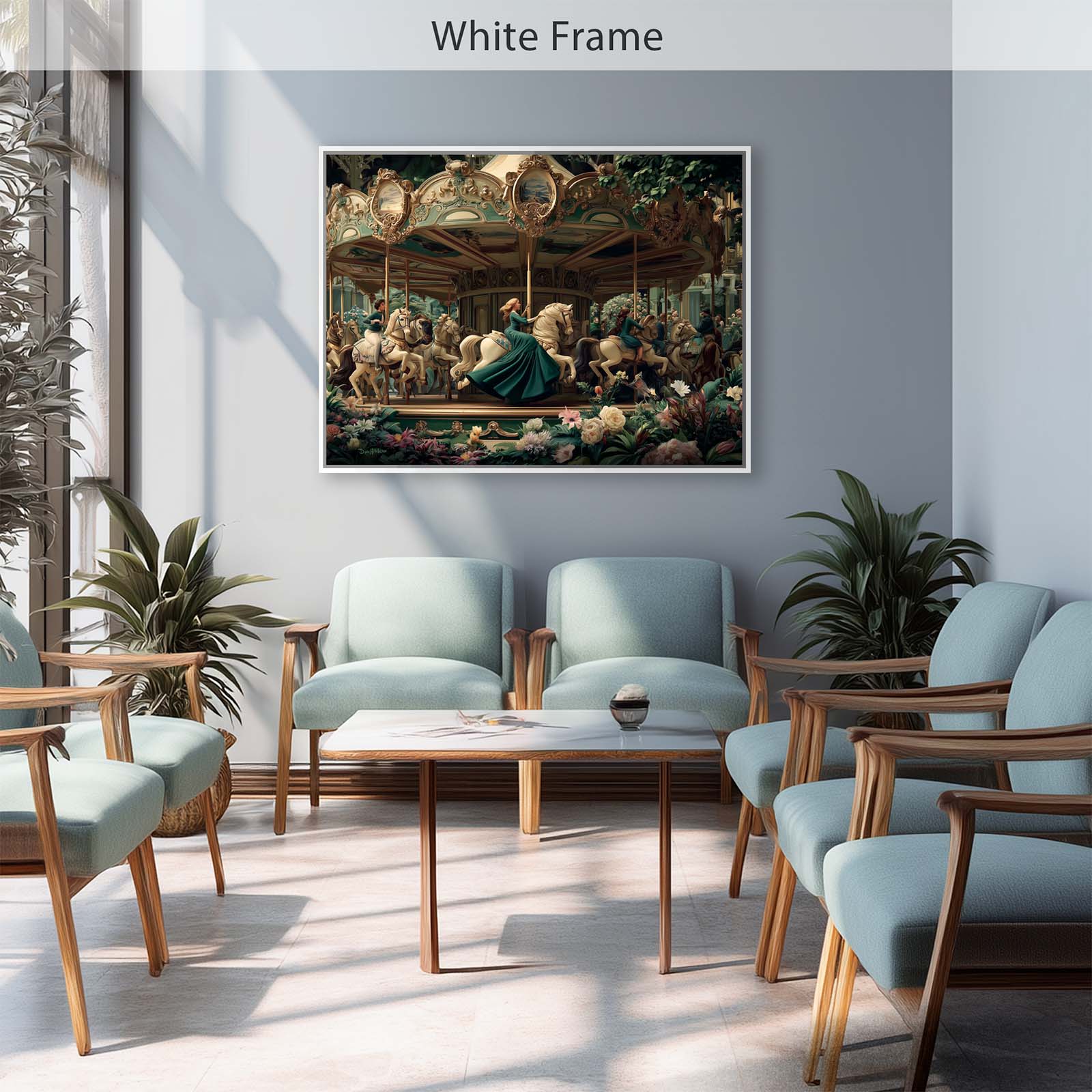 Step back in time with this beautifully romantic stretched-canvas art print. Featuring a young woman riding an elegant, ornate merry-go-round, this image captures grace, nostalgia, and timeless charm. Rendered in a realistic, romantic style, it adds warmth and refinement to any room. Perfect for classic, vintage, or eclectic interiors, this premium giclée print brings a touch of old-world beauty to your home or office décor.