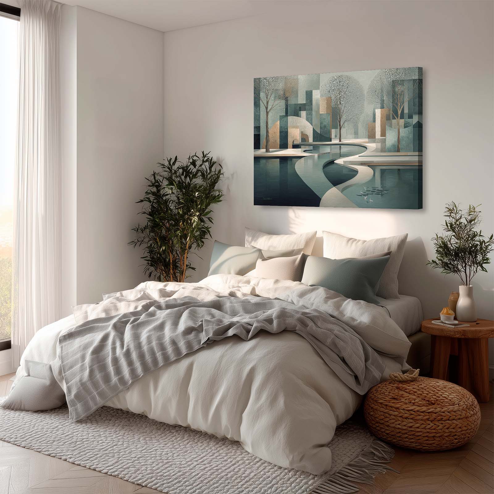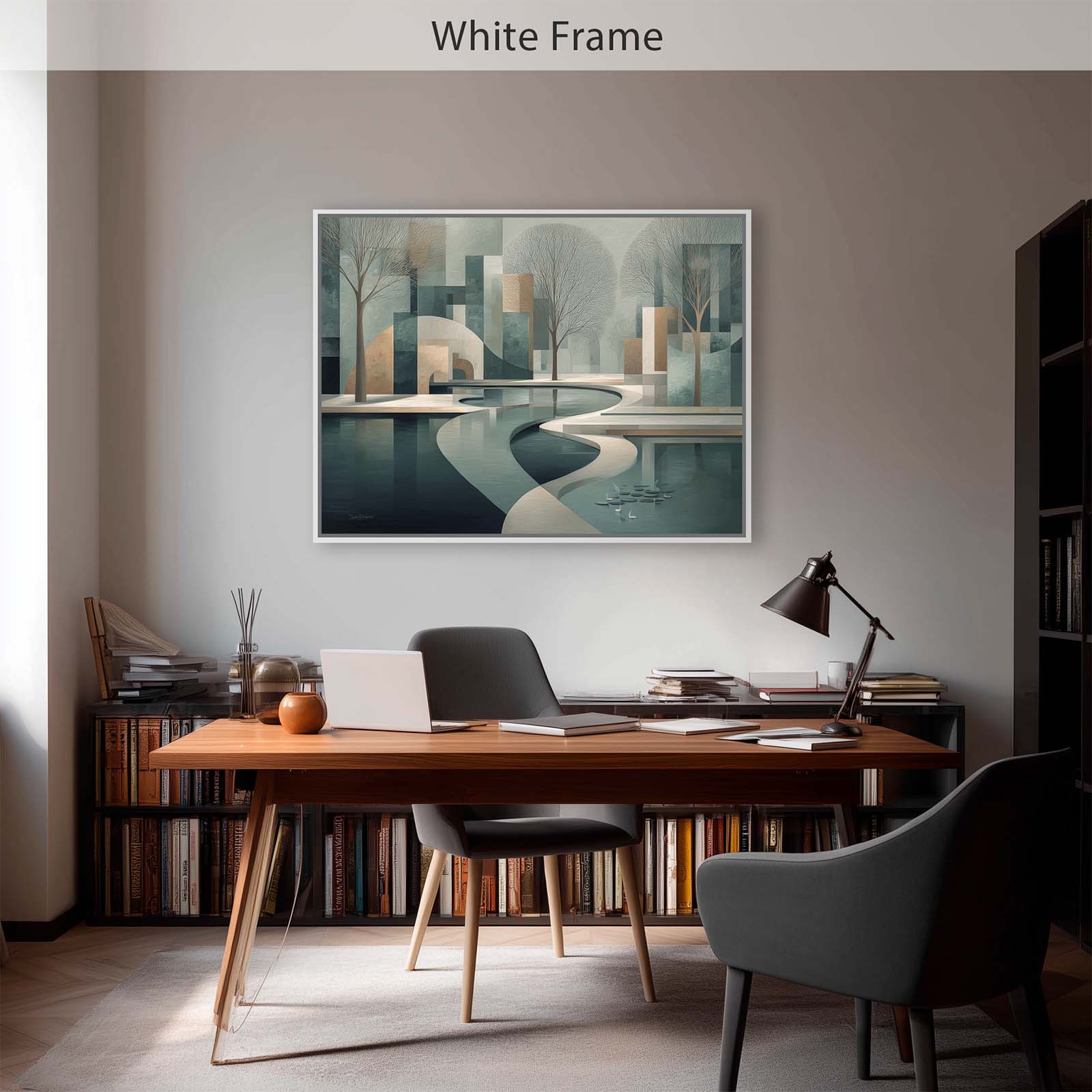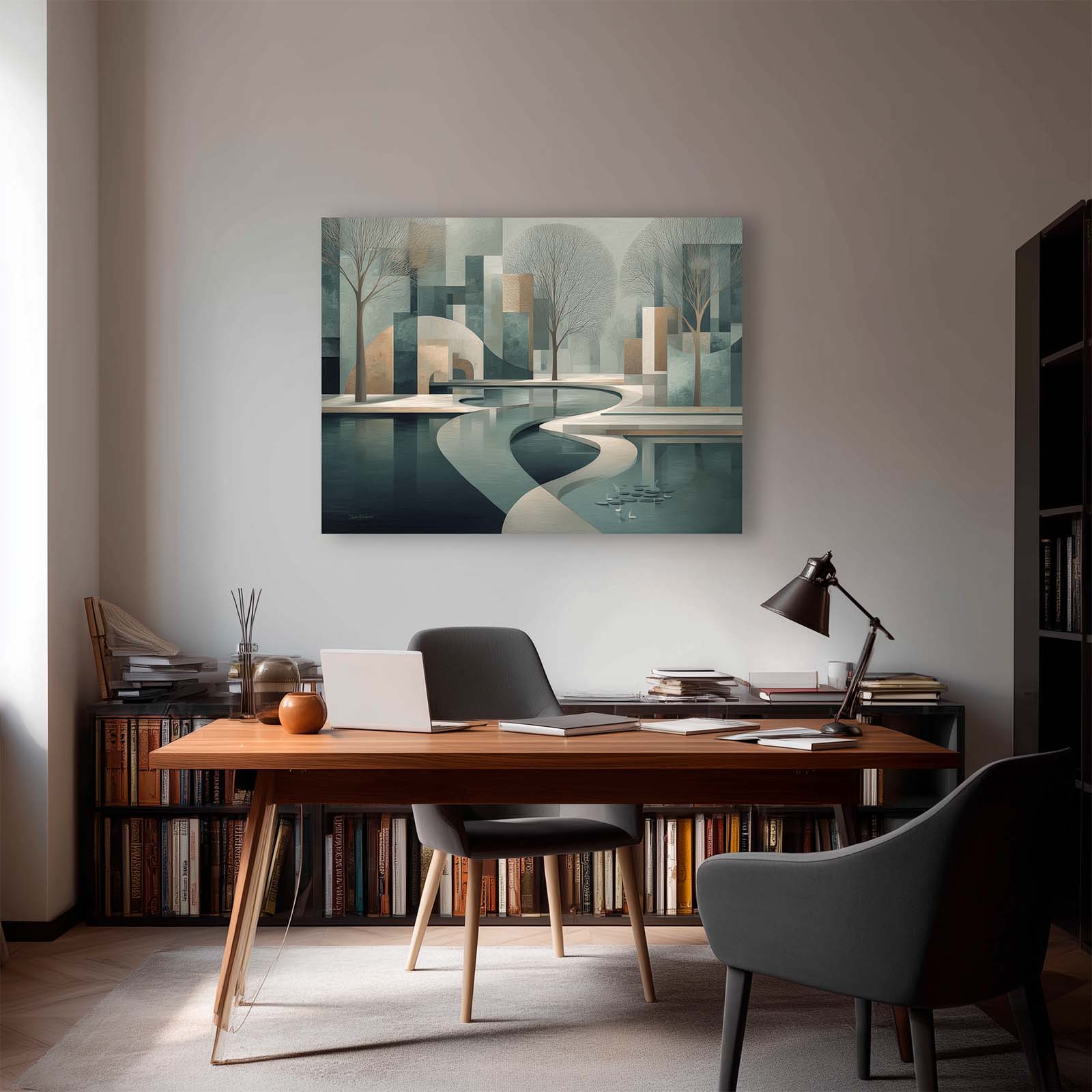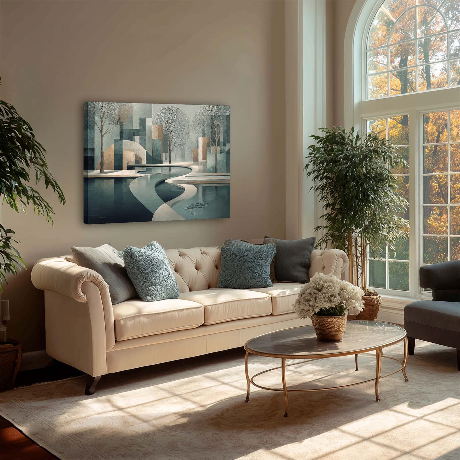 Bring modern sophistication to your space with this stunning stretched-canvas art print. The image captures a serene pond in a city park, reimagined through a refined cubist style that blends structure and tranquility. Its balanced geometry and elegant tones make it a versatile piece that complements both contemporary and classic interiors—adding depth, beauty, and conversation to any room.