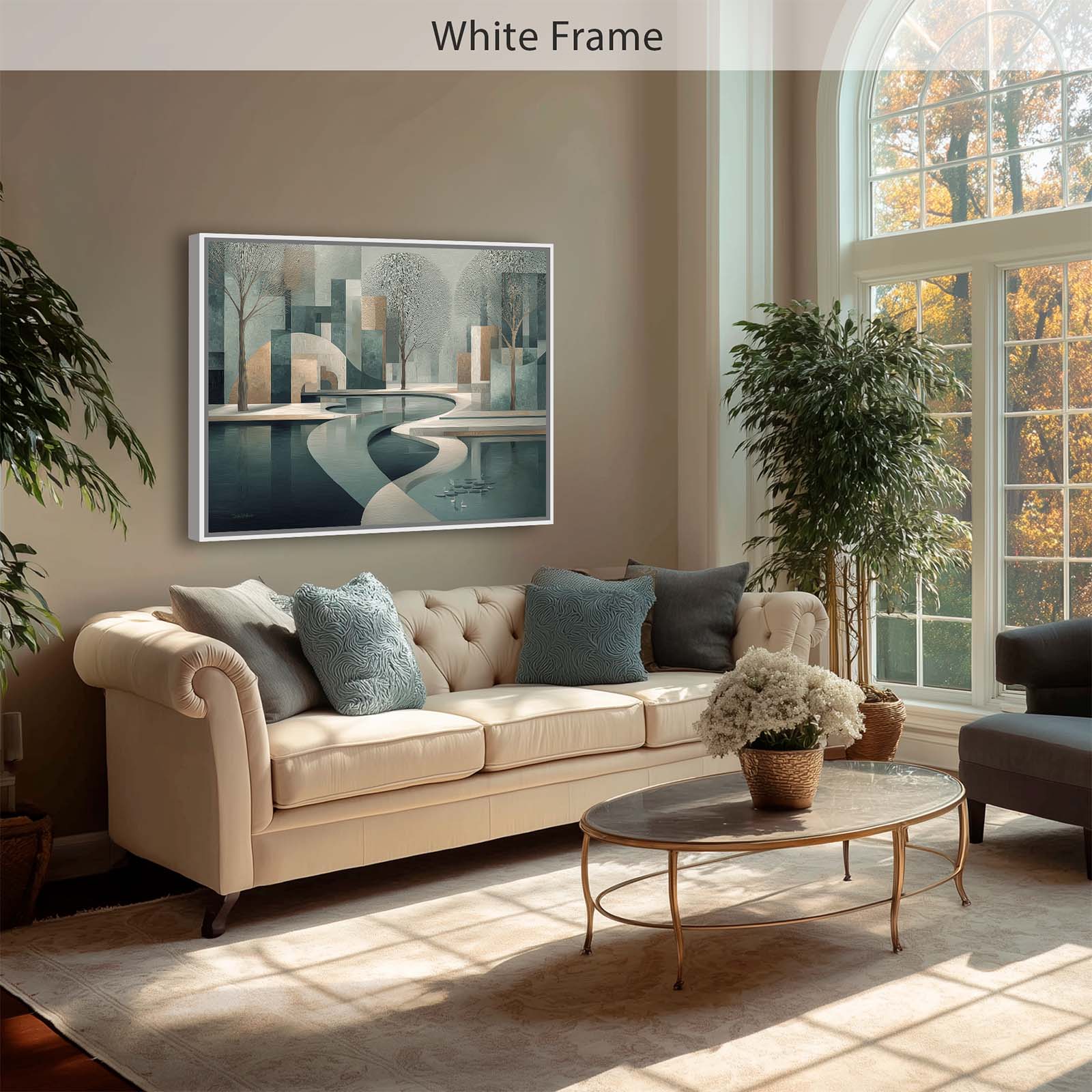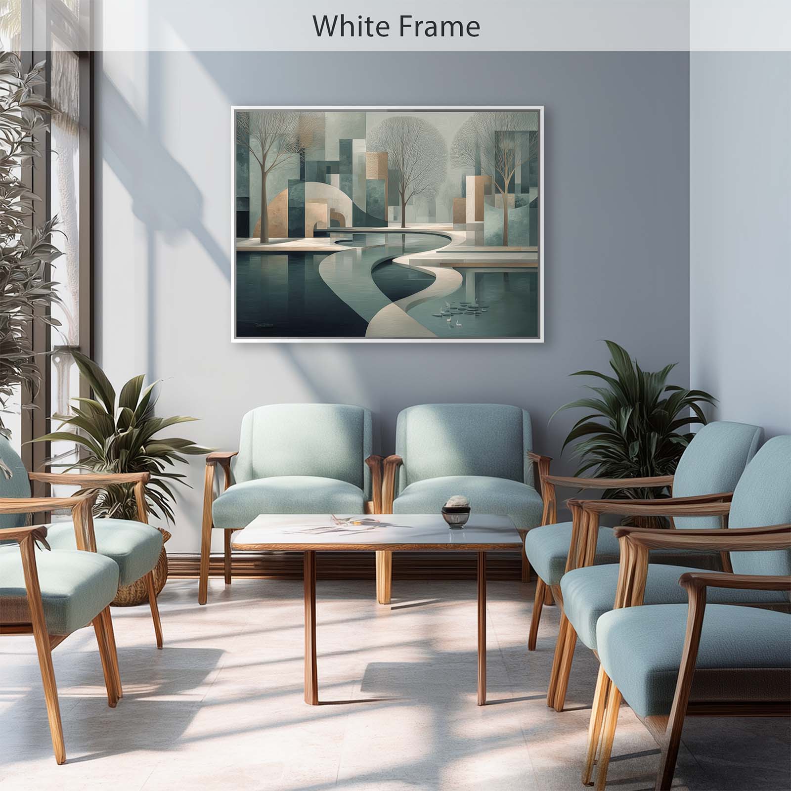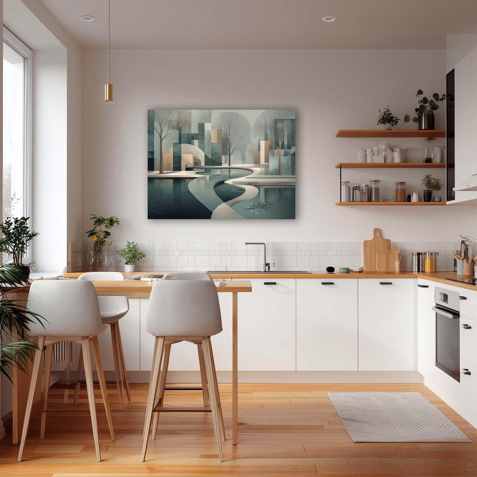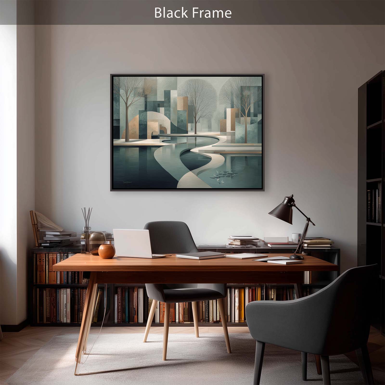 Bring modern sophistication to your space with this stunning stretched-canvas art print. The image captures a serene pond in a city park, reimagined through a refined cubist style that blends structure and tranquility. Its balanced geometry and elegant tones make it a versatile piece that complements both contemporary and classic interiors—adding depth, beauty, and conversation to any room.