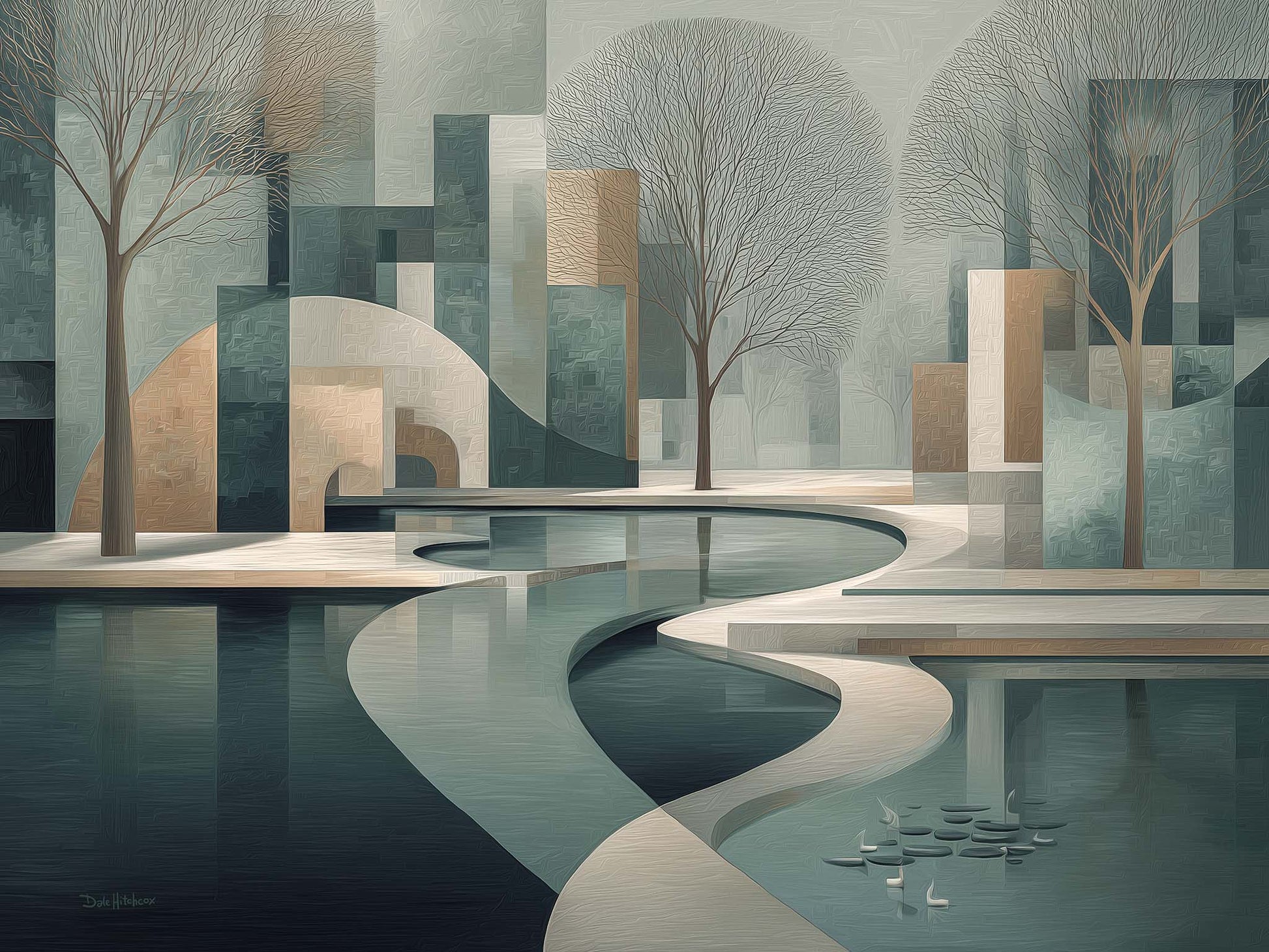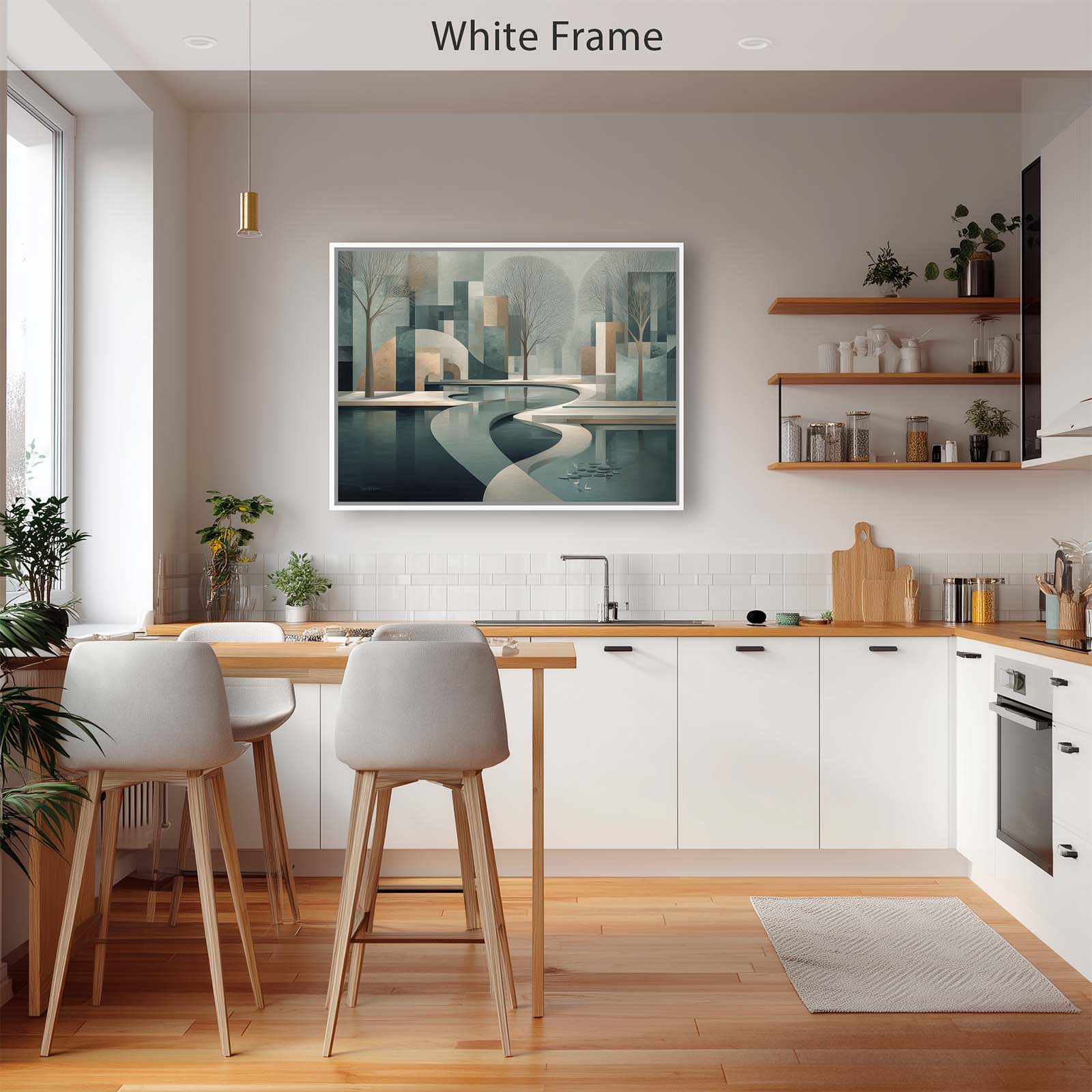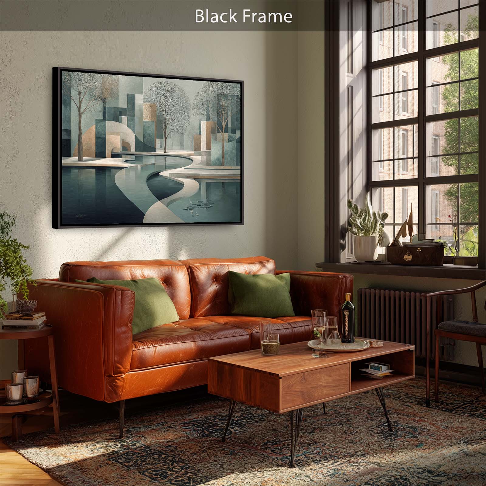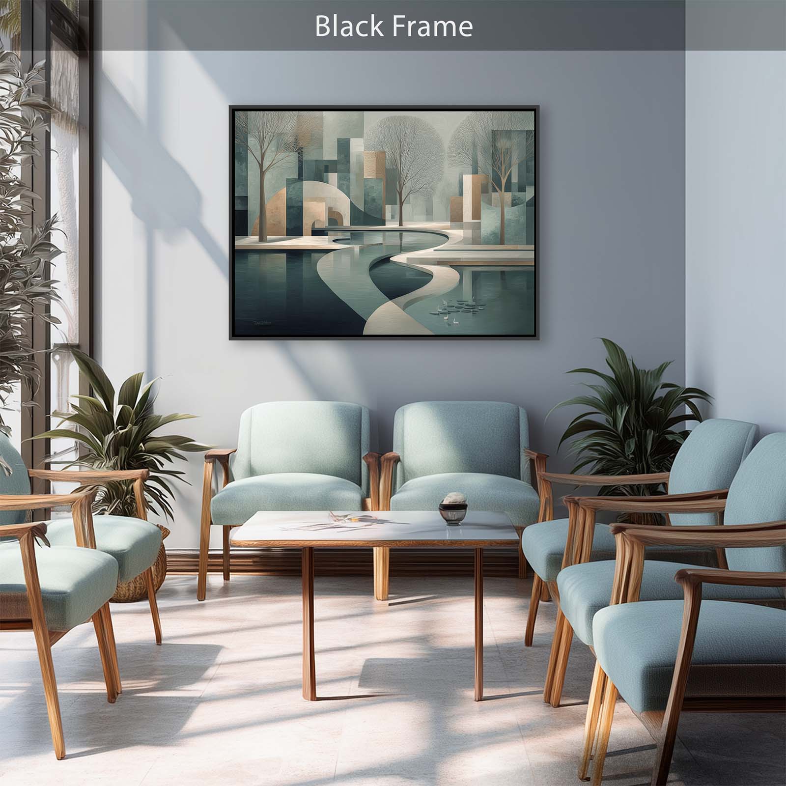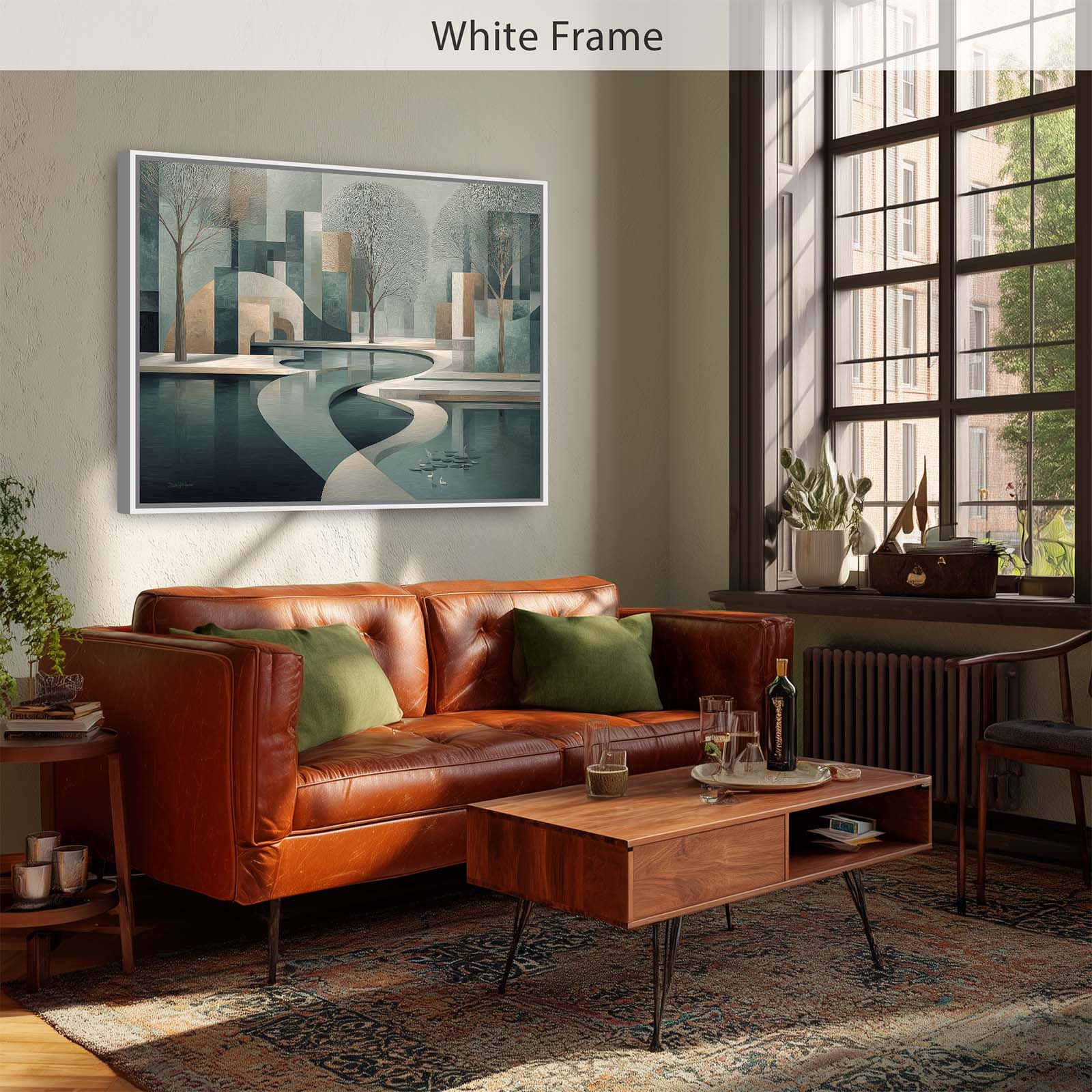 Bring modern sophistication to your space with this stunning stretched-canvas art print. The image captures a serene pond in a city park, reimagined through a refined cubist style that blends structure and tranquility. Its balanced geometry and elegant tones make it a versatile piece that complements both contemporary and classic interiors—adding depth, beauty, and conversation to any room.