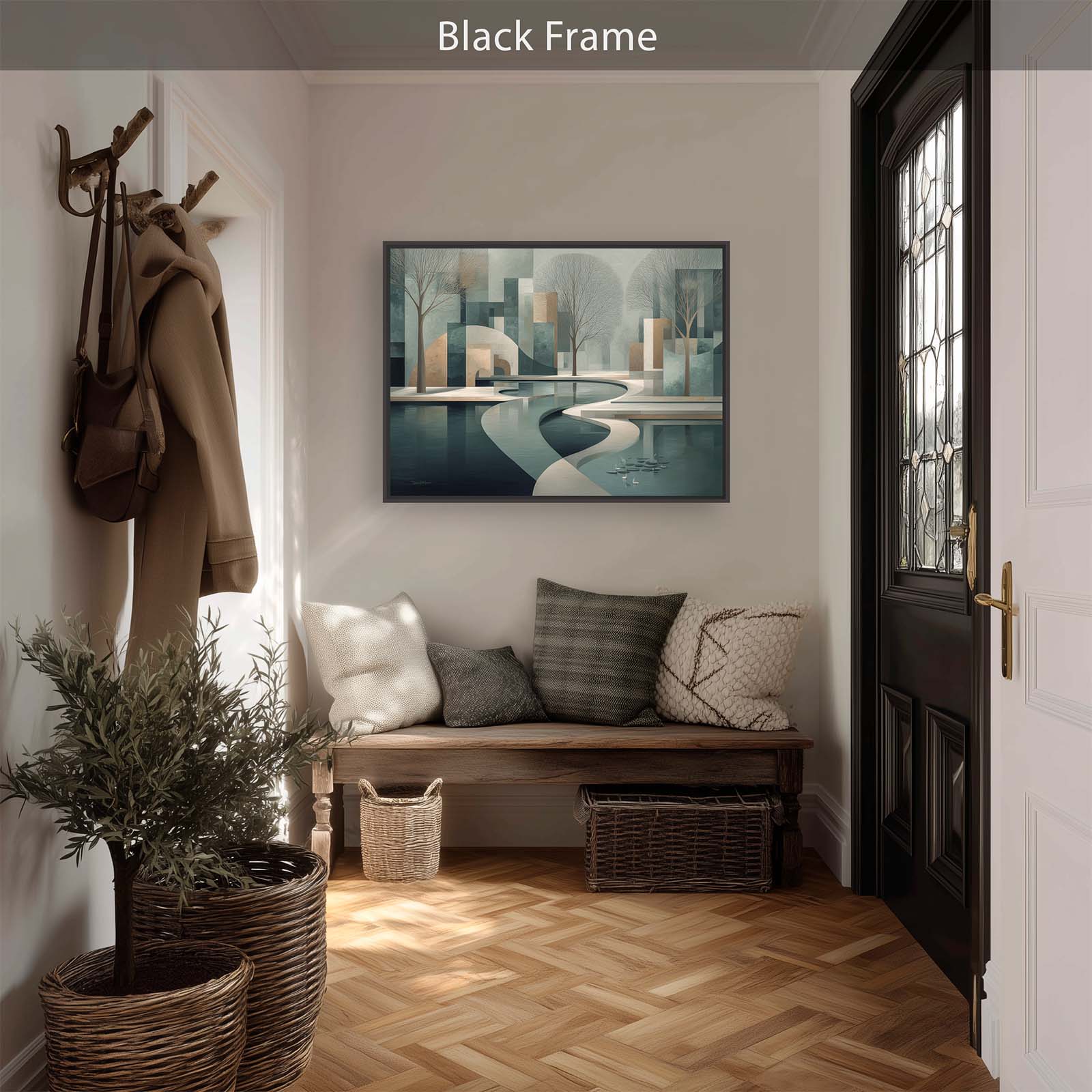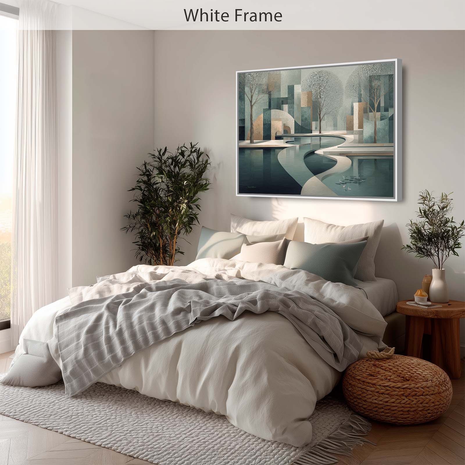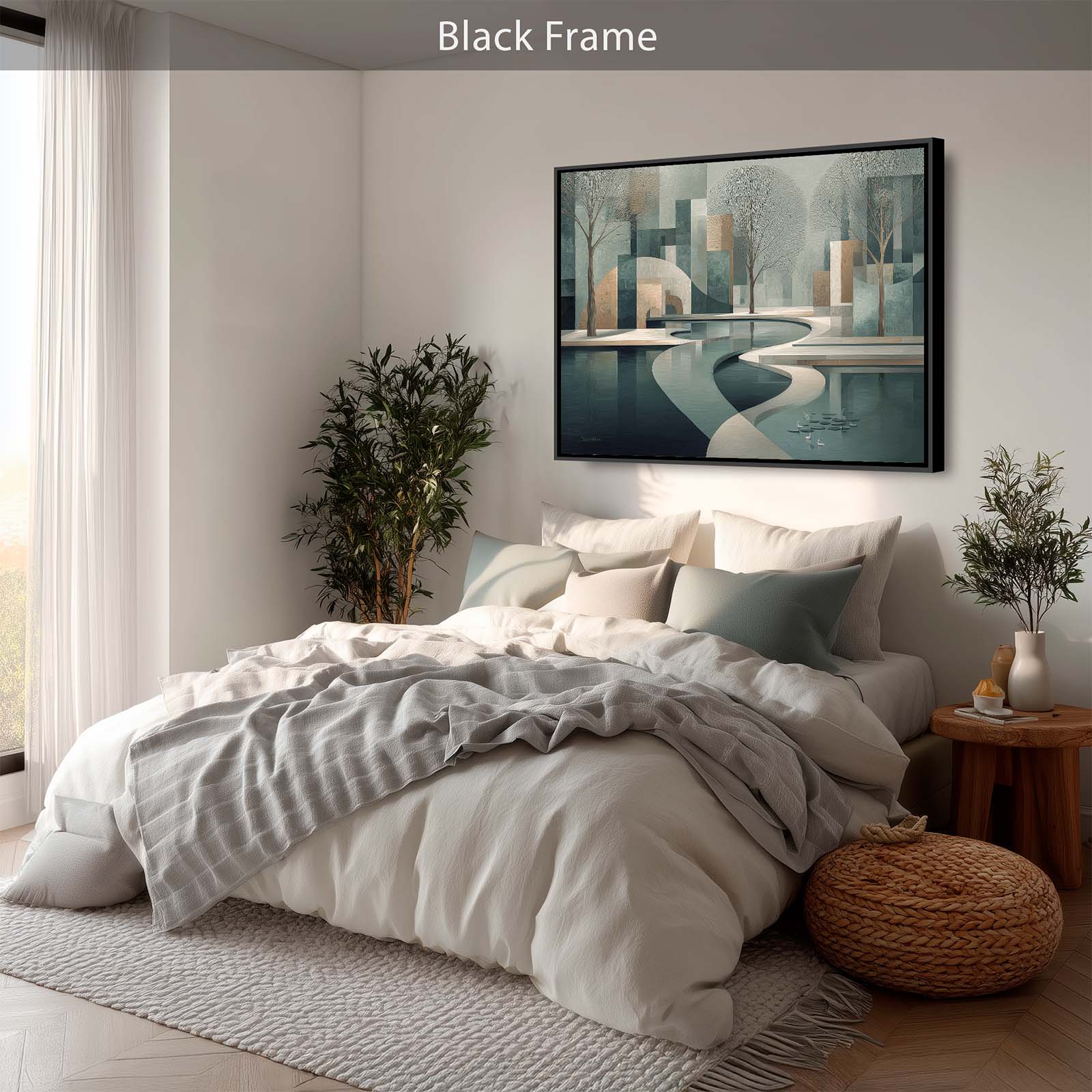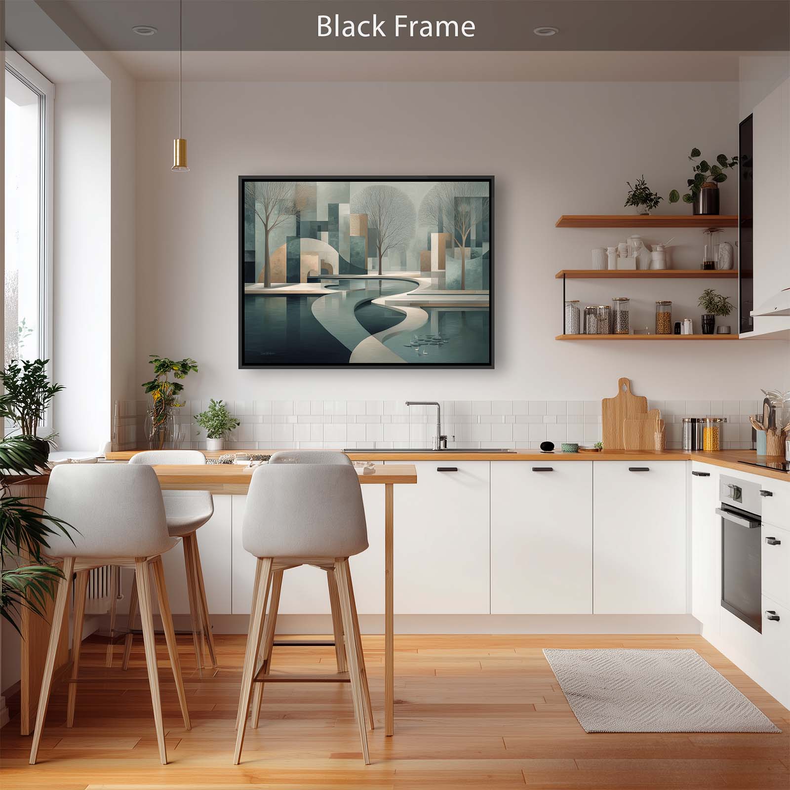 Bring modern sophistication to your space with this stunning stretched-canvas art print. The image captures a serene pond in a city park, reimagined through a refined cubist style that blends structure and tranquility. Its balanced geometry and elegant tones make it a versatile piece that complements both contemporary and classic interiors—adding depth, beauty, and conversation to any room.