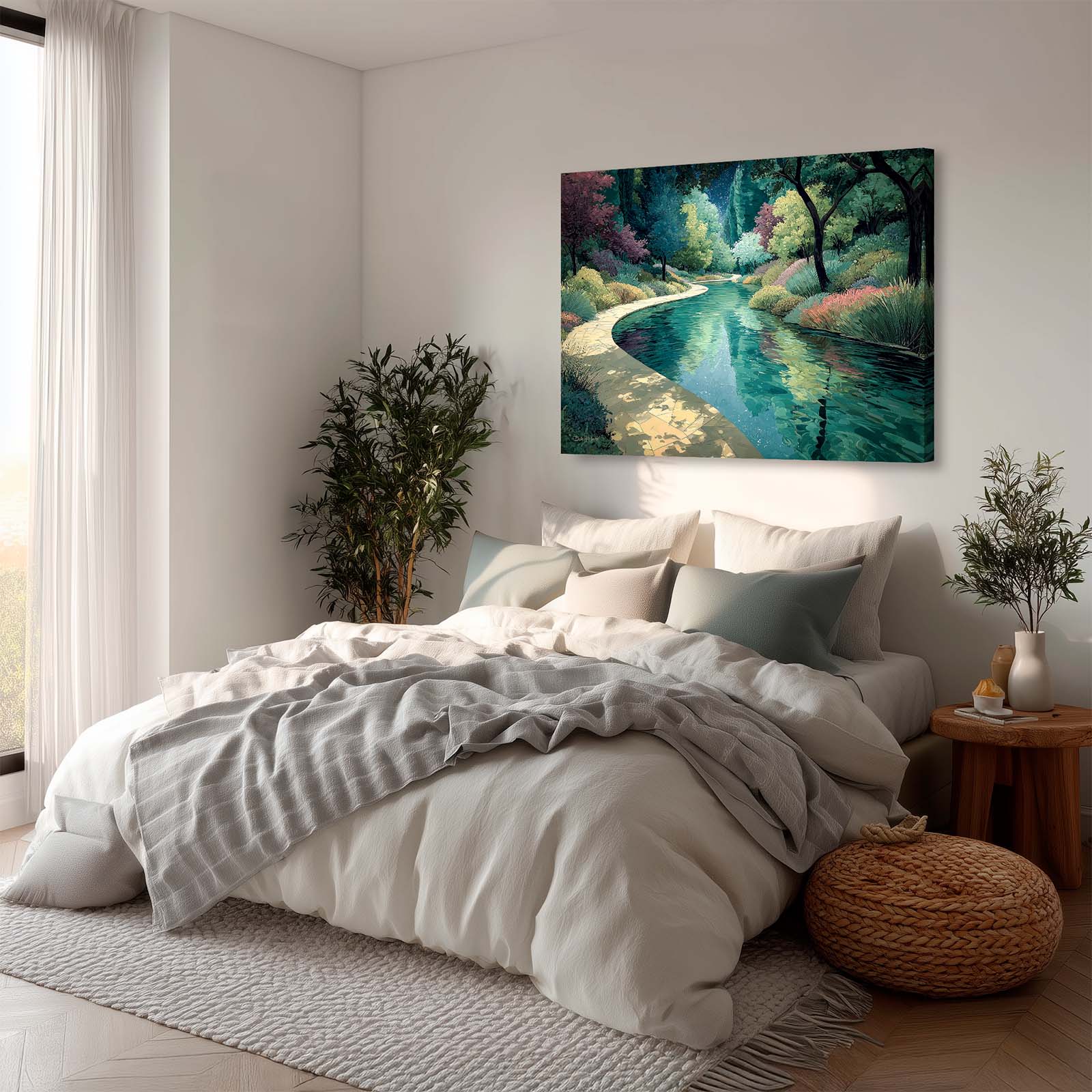 Step into a world of quiet enchantment with Moonlit Path, a serene nightscape that captures a gentle garden path winding alongside a stream, softly illuminated by moonlight and scattered starlight.