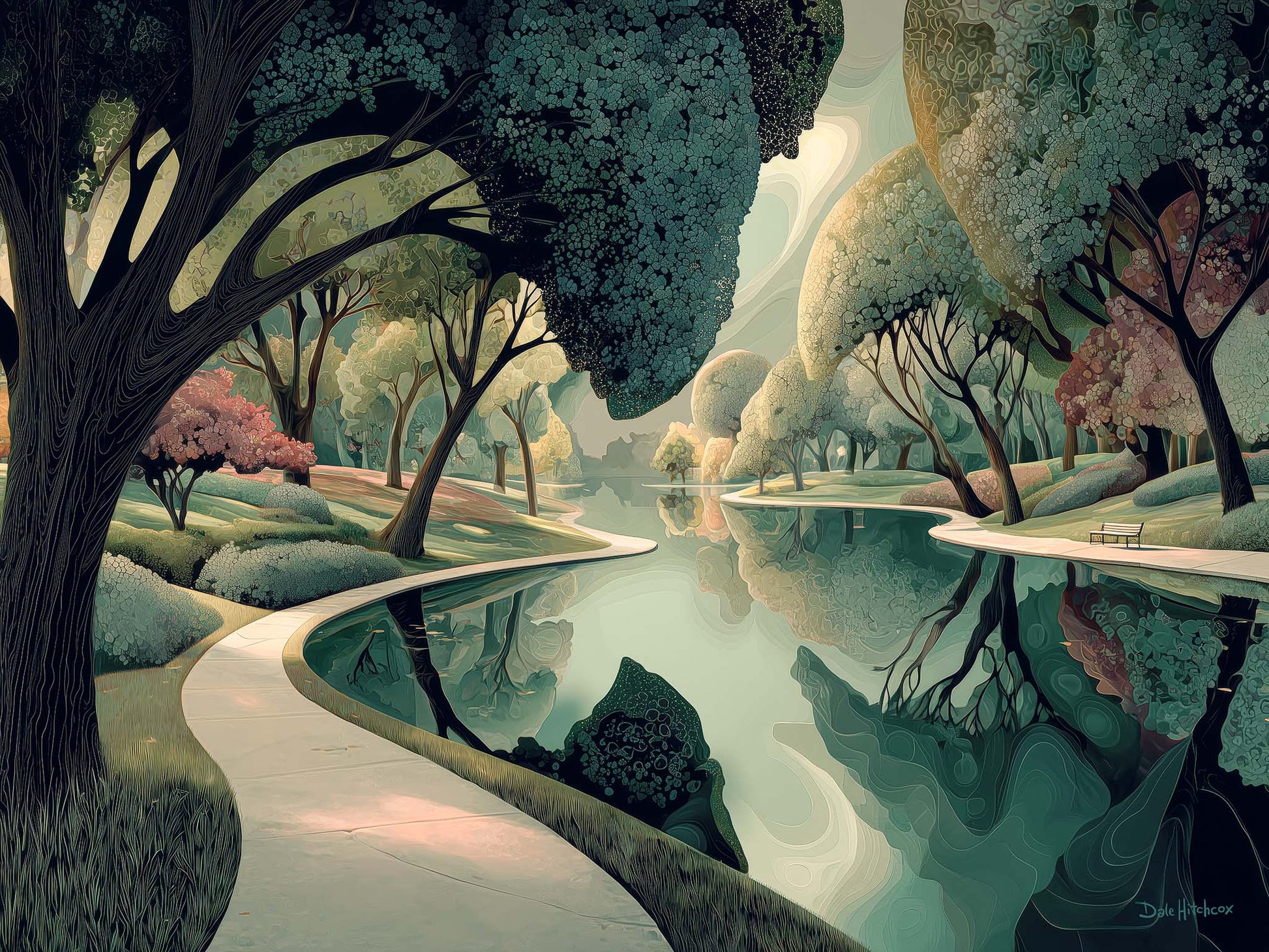 This detailed, delicately rendered canvas print invites you into a serene park scene, where a winding path follows the curve of a stream. Sunlight filters softly through the trees, casting dappled light across the water and grass. The composition reveals a harmony of graceful forms and subtle contrasts—creating an atmosphere of calm and quiet beauty.