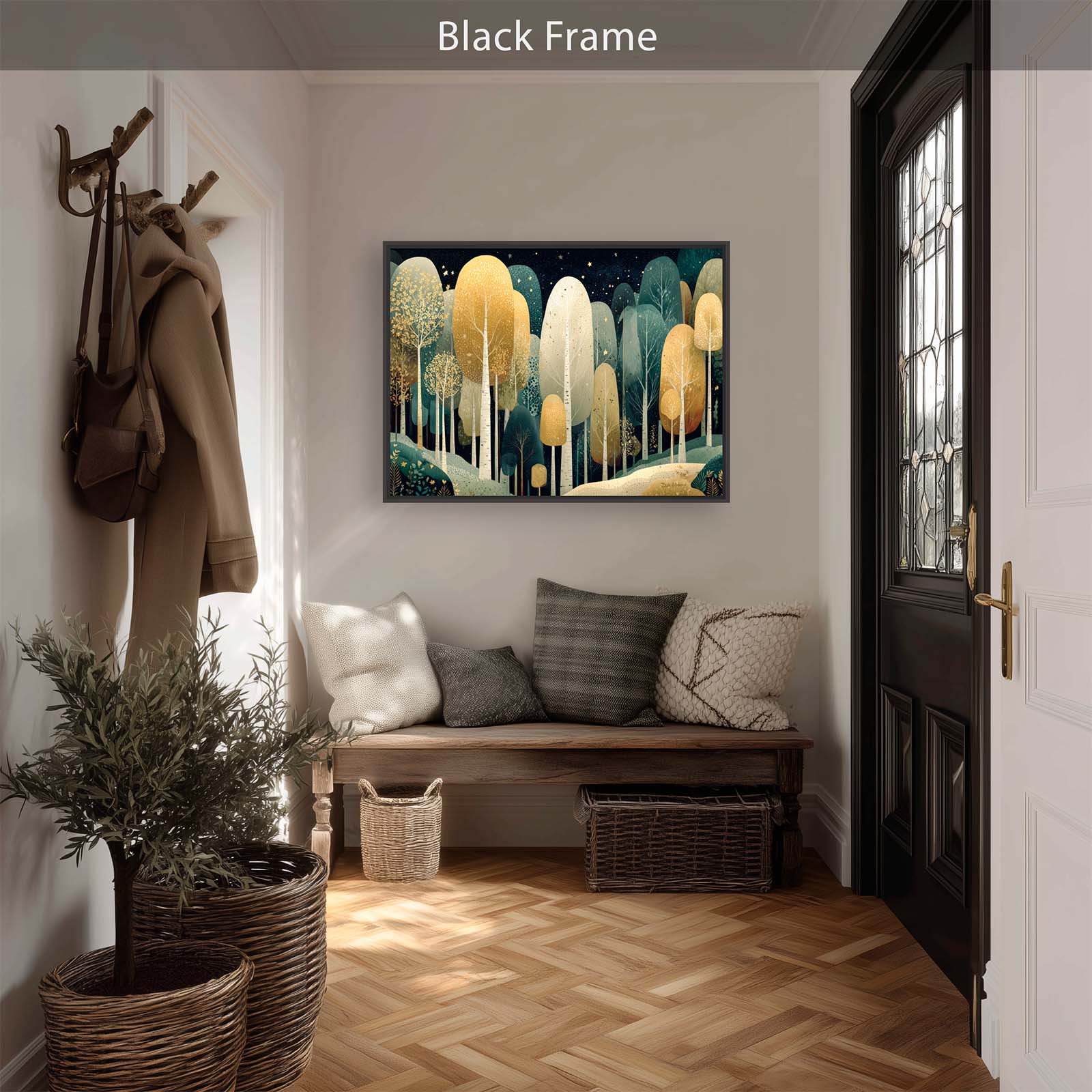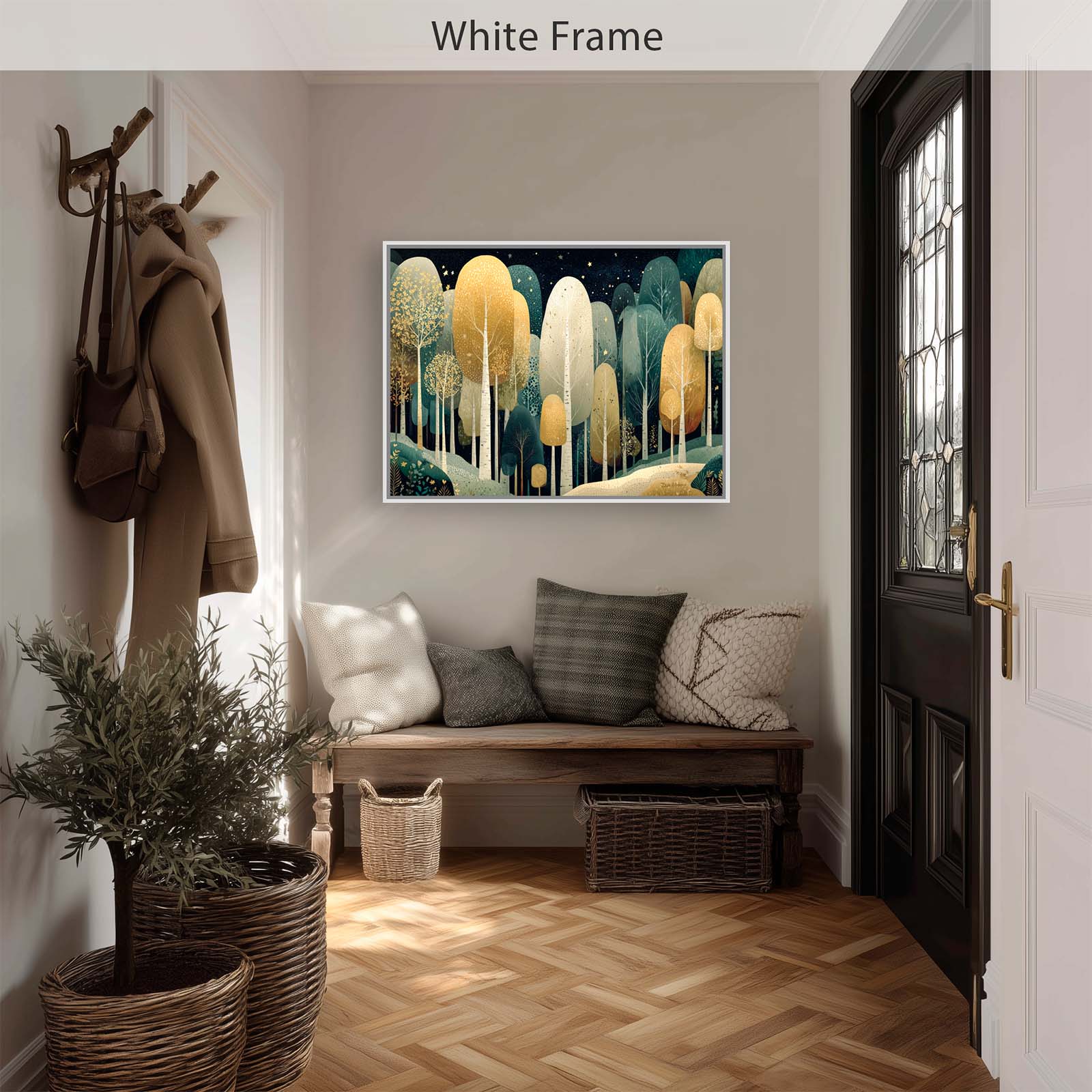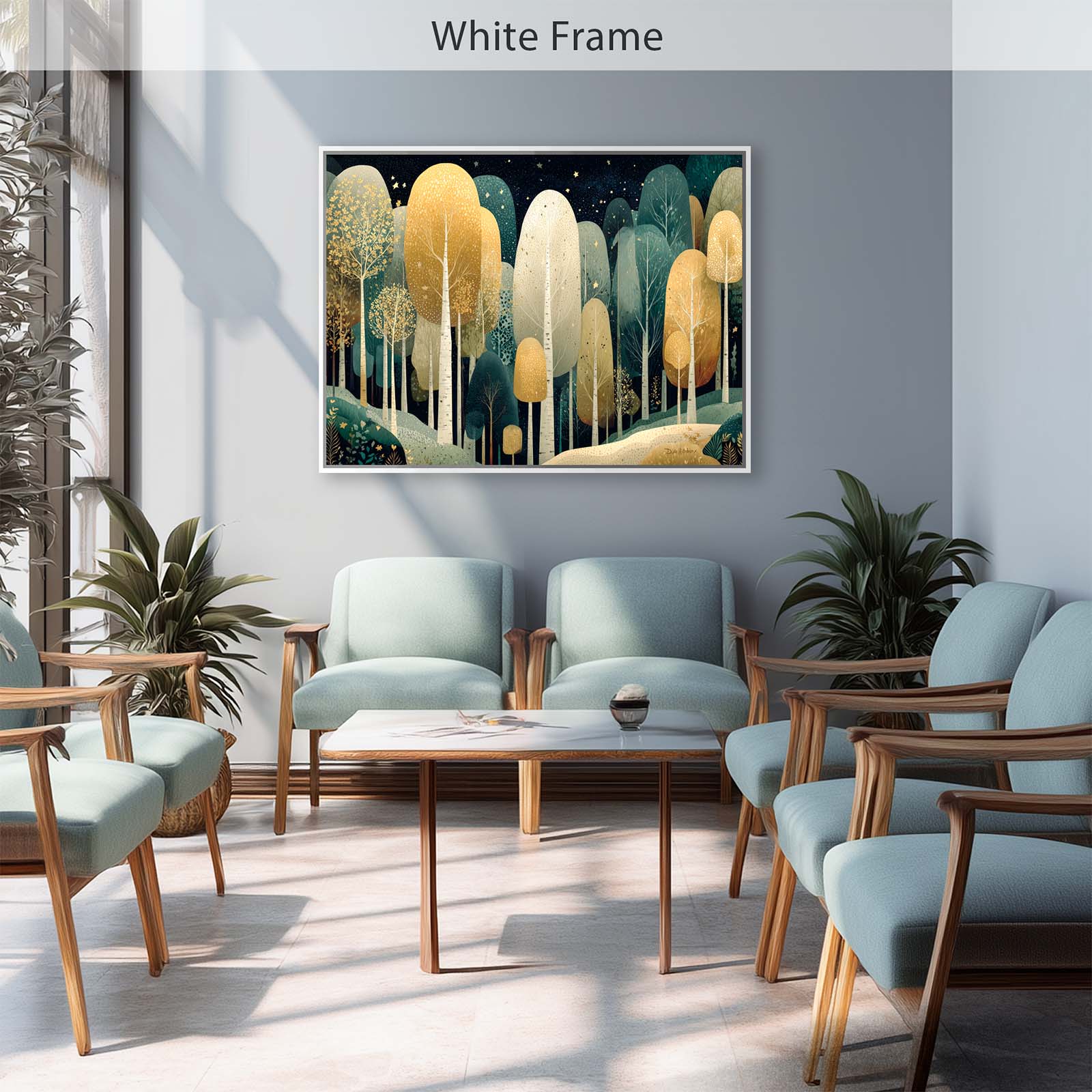 A forest bathed in starlight, where organic geometric forms weave together in a poetic interplay of light and shadow. The delicate, harmonious colors lend the scene a gentle glow, while the composition invites you to imagine yourself walking beneath the trees, surrounded by stillness and wonder.