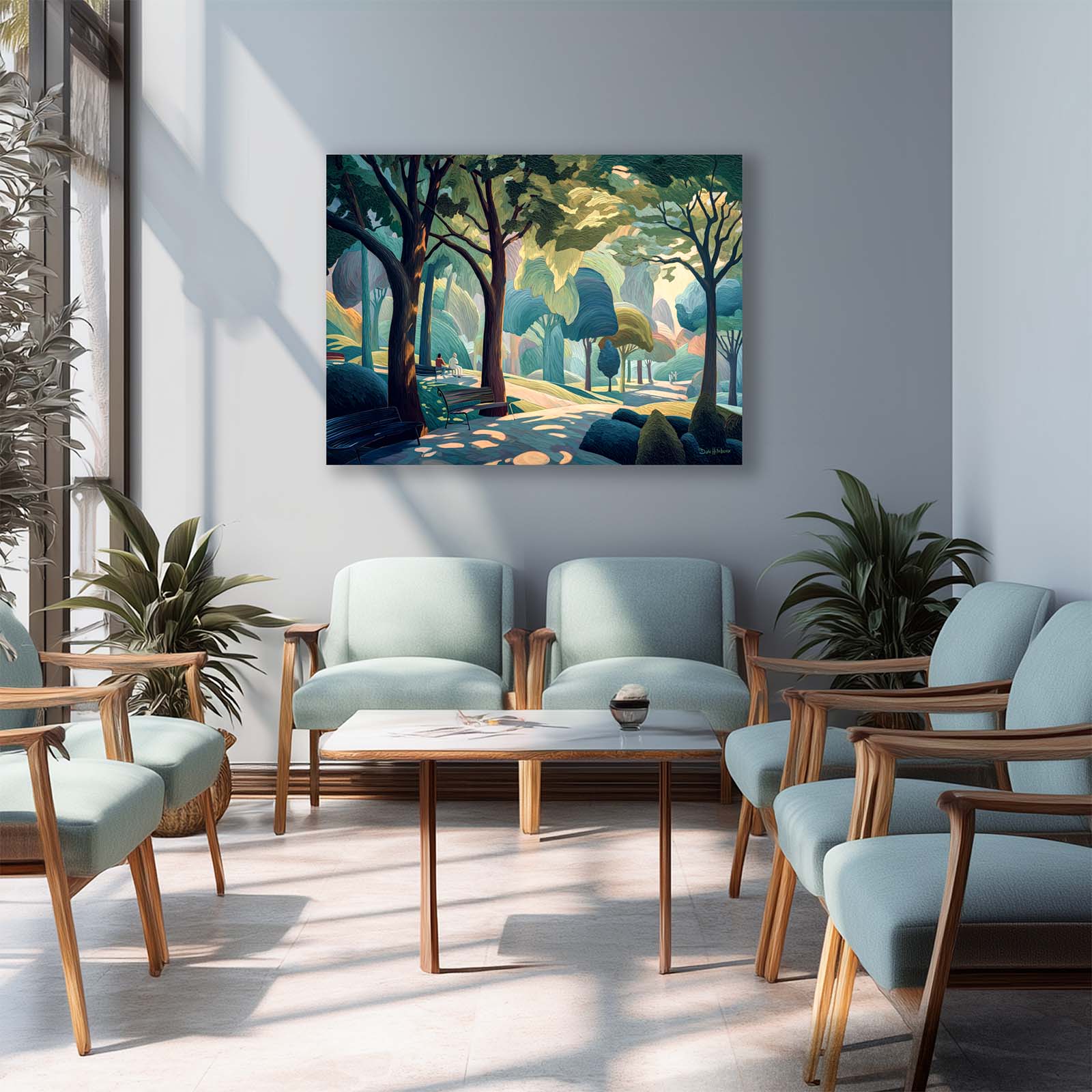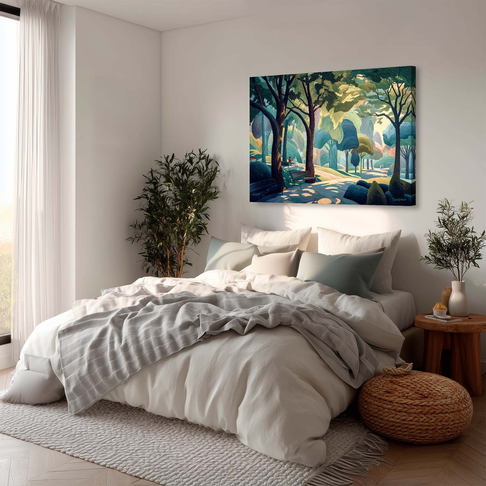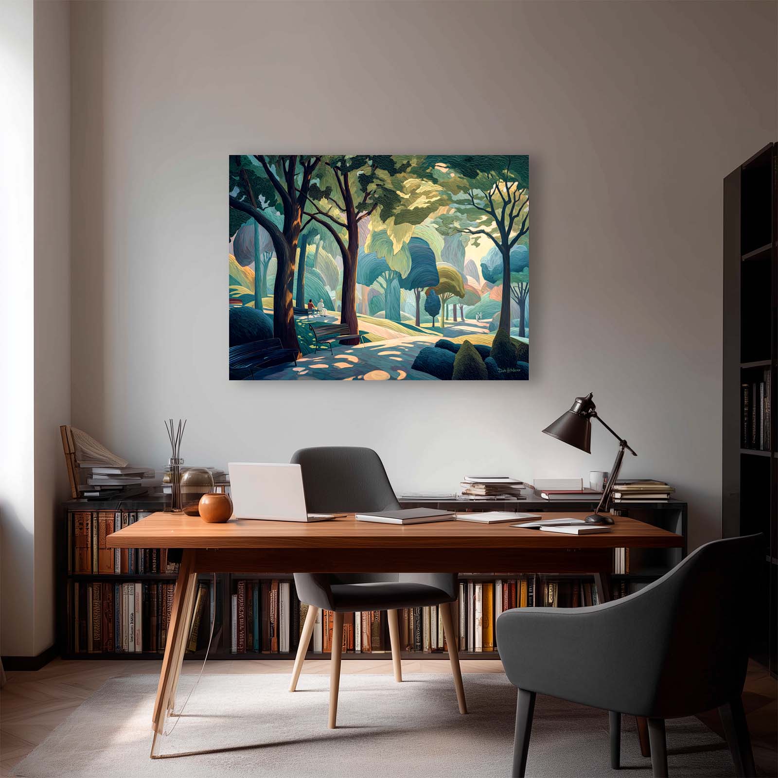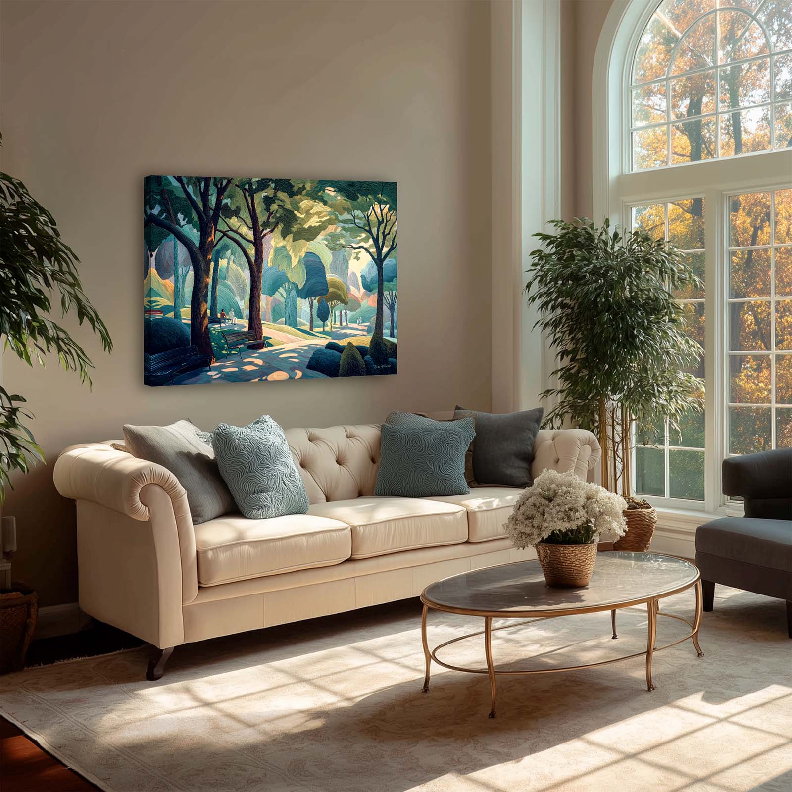 The serene scene captures a sunny day in the park, with winding paths, soft tree forms, and dappled sunlight filtering through the canopy above. Delicate tones and thoughtful composition create an atmosphere that’s both calming and visually engaging—full of delightful shapes and subtle contrasts. It’s a piece that complements almost any interior, from modern minimalism to warm traditional decor.