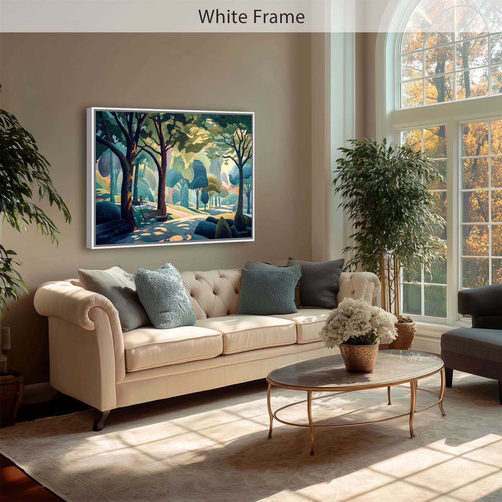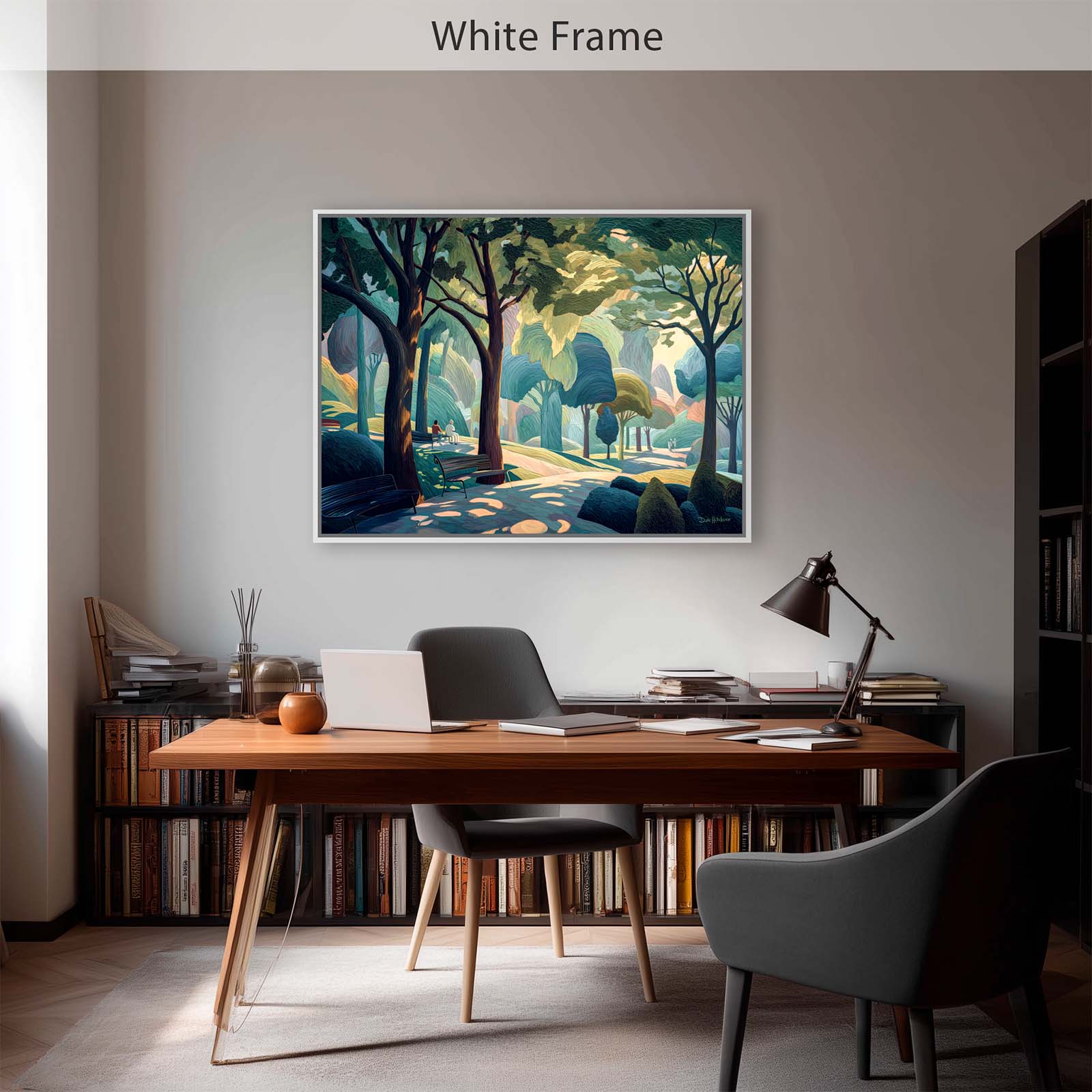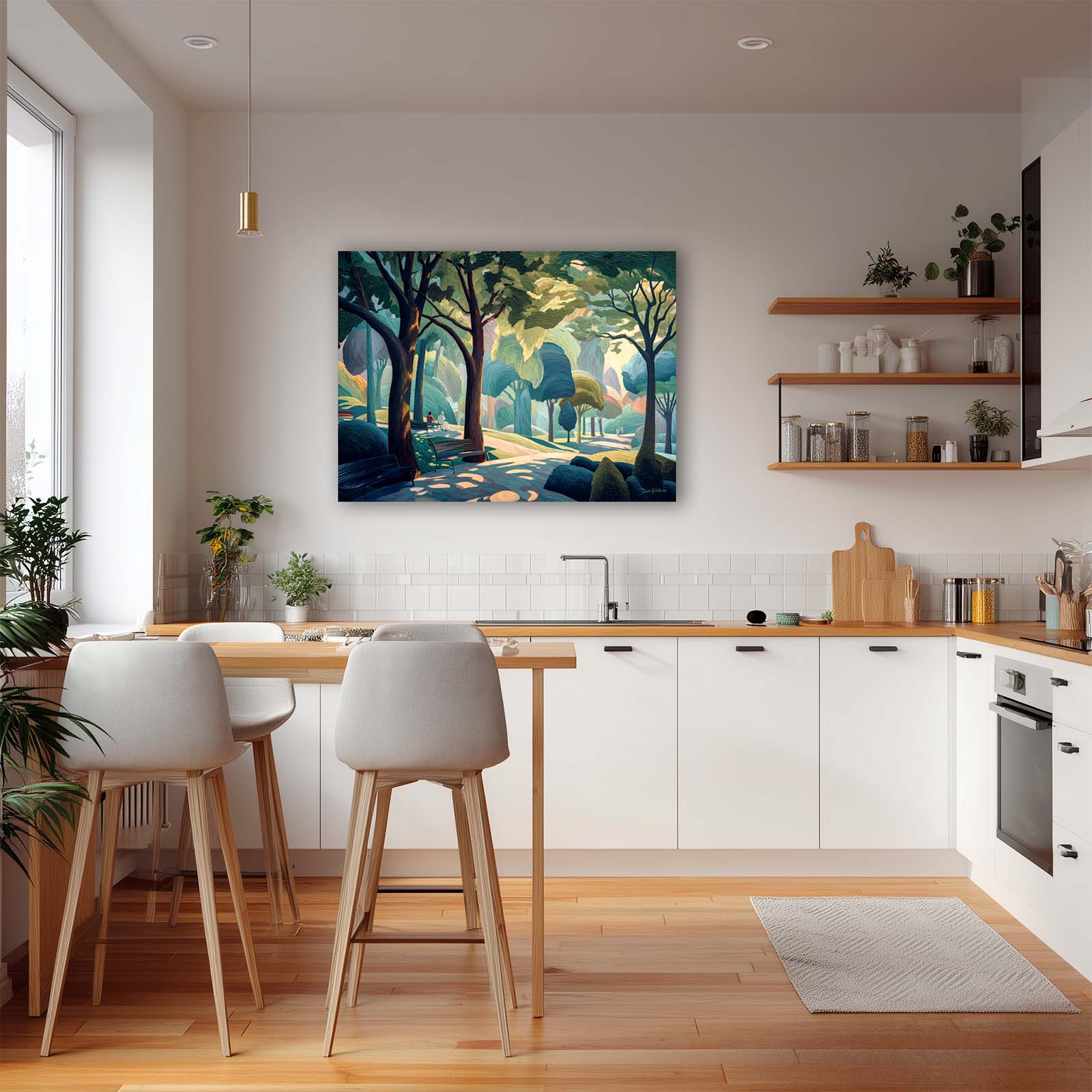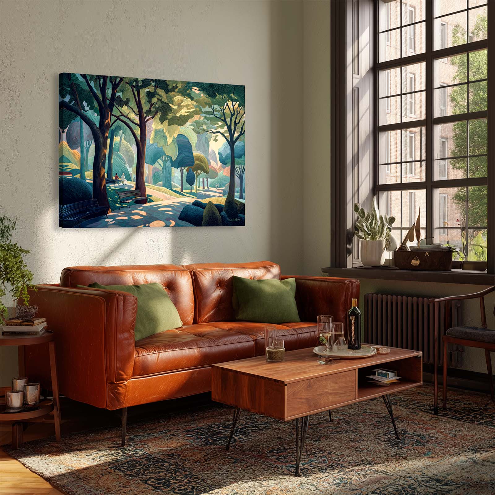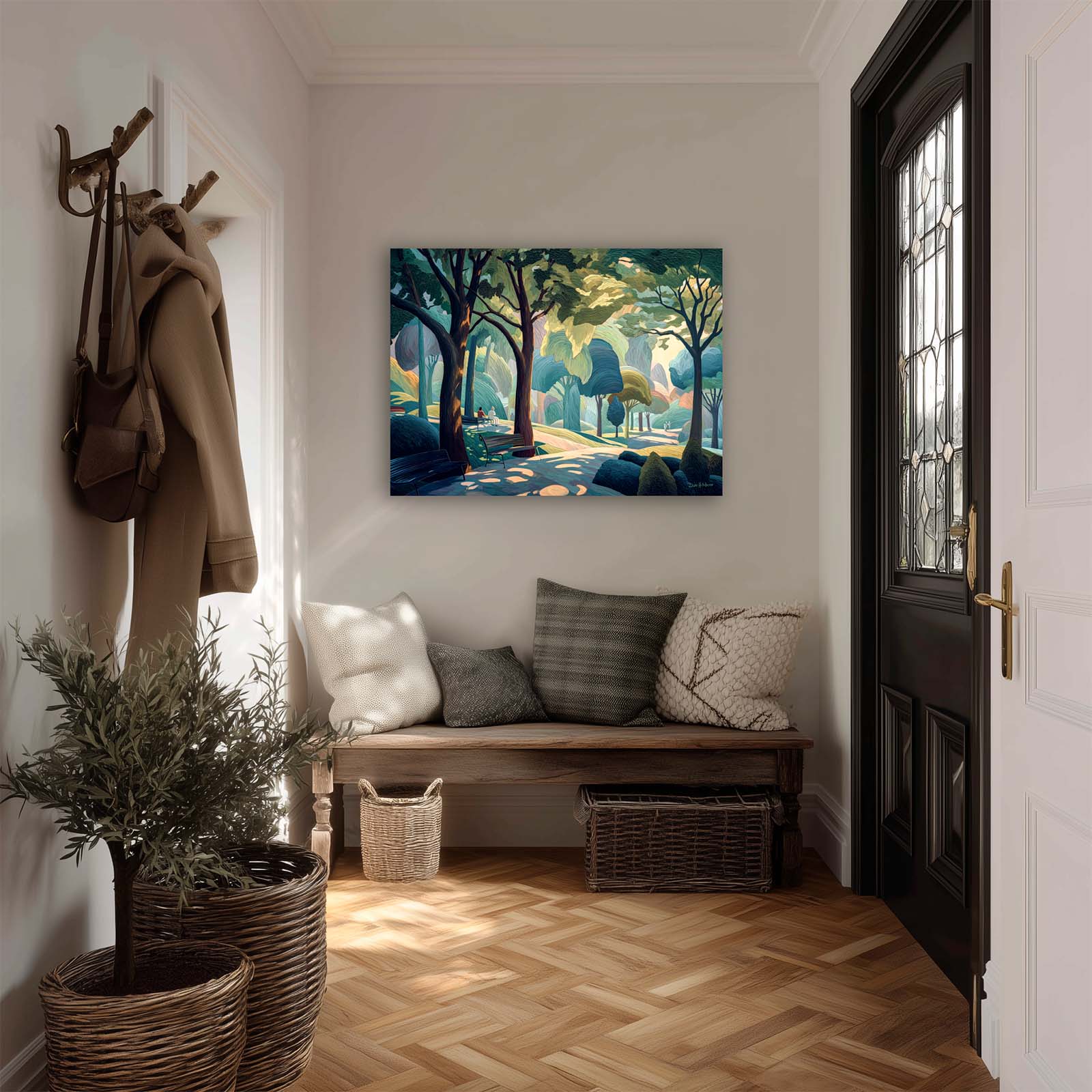 The serene scene captures a sunny day in the park, with winding paths, soft tree forms, and dappled sunlight filtering through the canopy above. Delicate tones and thoughtful composition create an atmosphere that’s both calming and visually engaging—full of delightful shapes and subtle contrasts. It’s a piece that complements almost any interior, from modern minimalism to warm traditional decor.