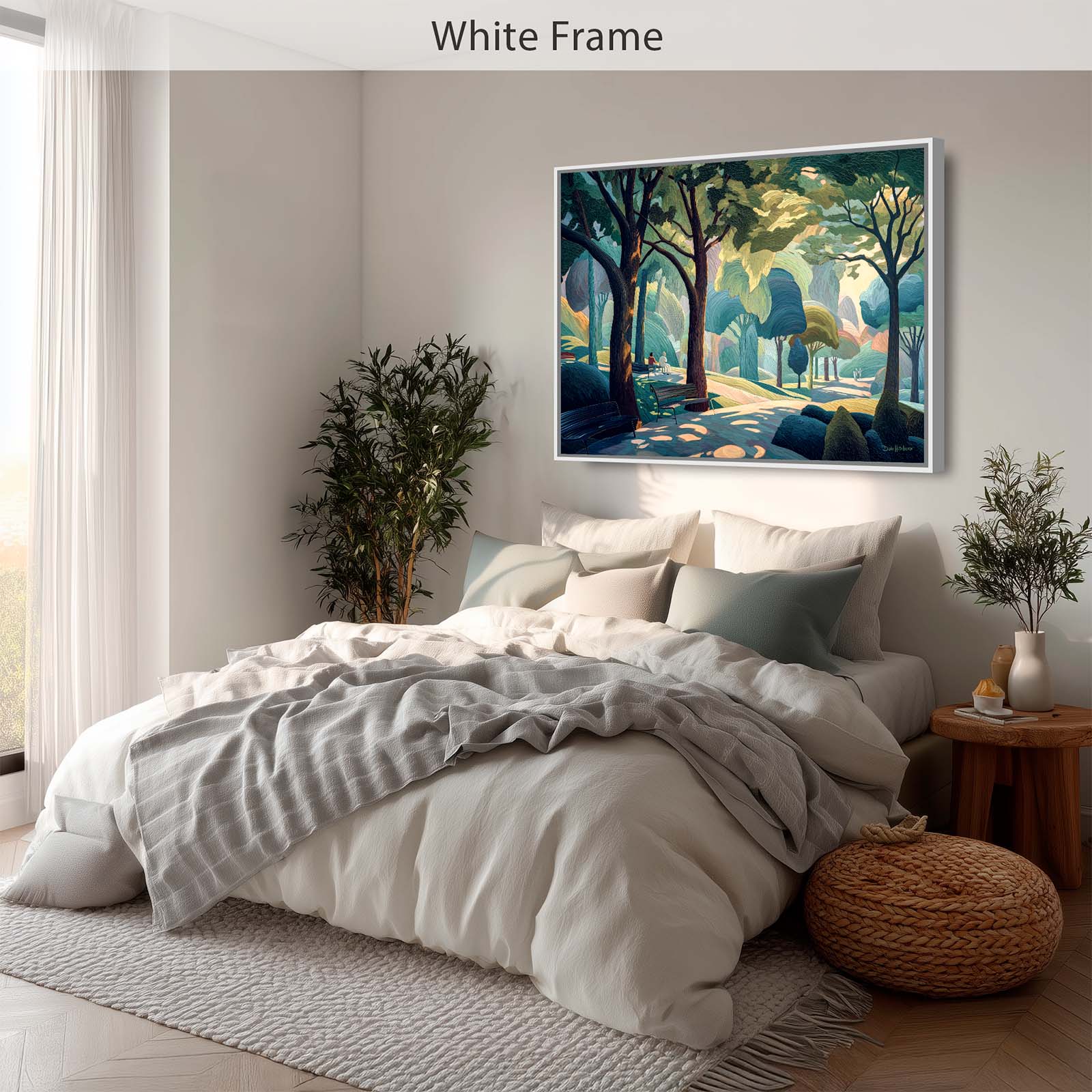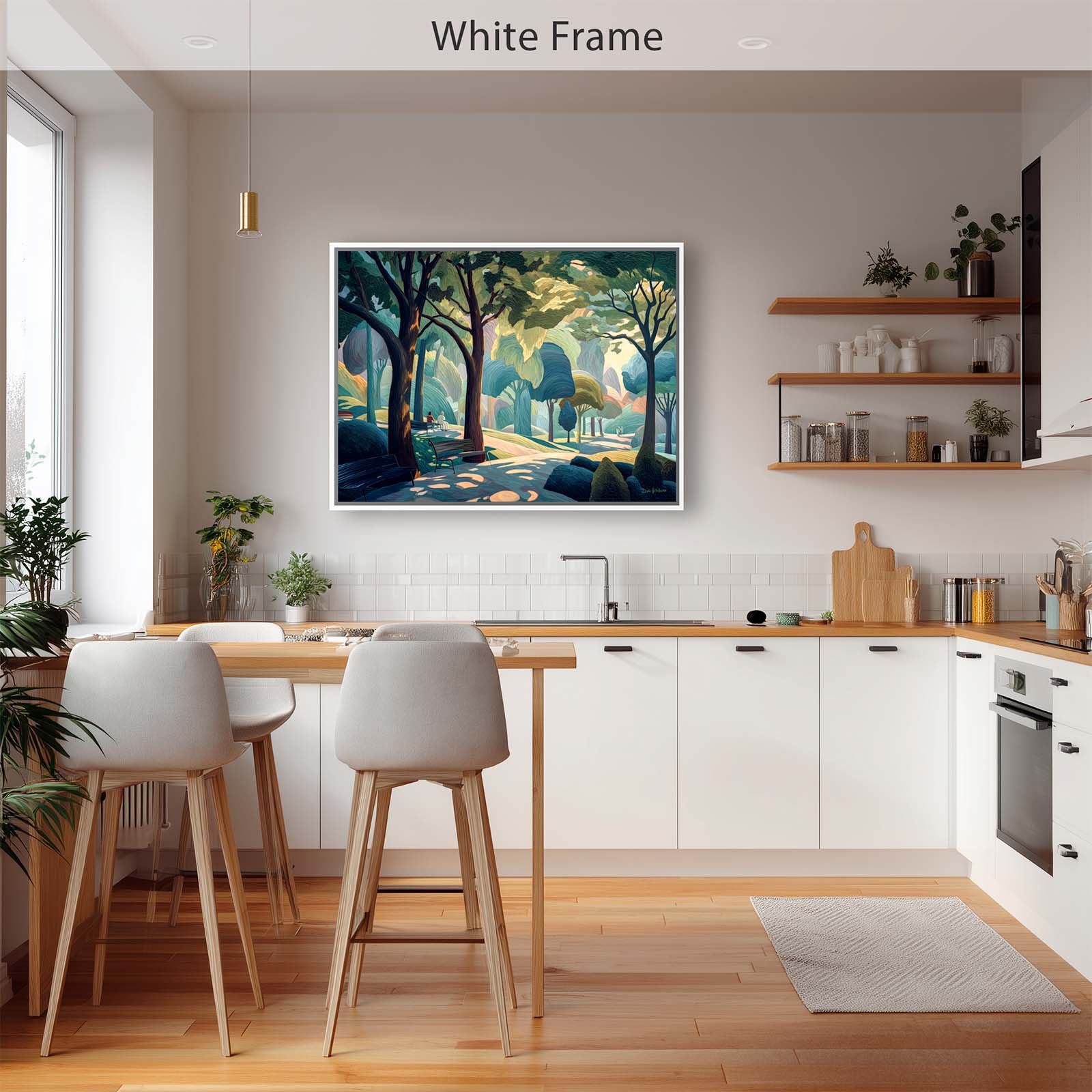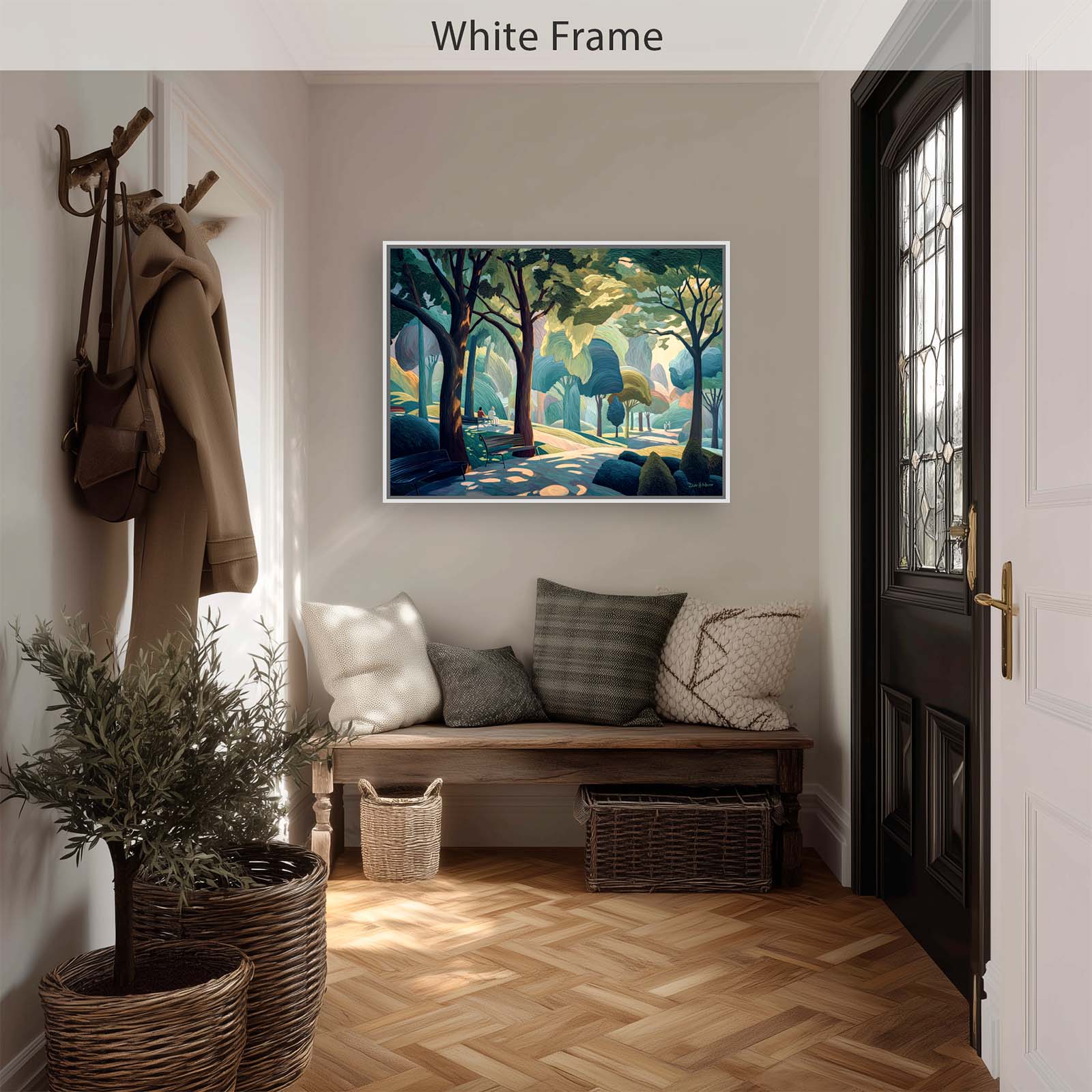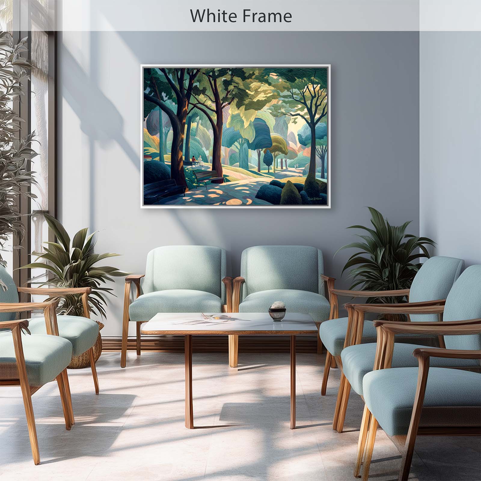 The serene scene captures a sunny day in the park, with winding paths, soft tree forms, and dappled sunlight filtering through the canopy above. Delicate tones and thoughtful composition create an atmosphere that’s both calming and visually engaging—full of delightful shapes and subtle contrasts. It’s a piece that complements almost any interior, from modern minimalism to warm traditional decor.