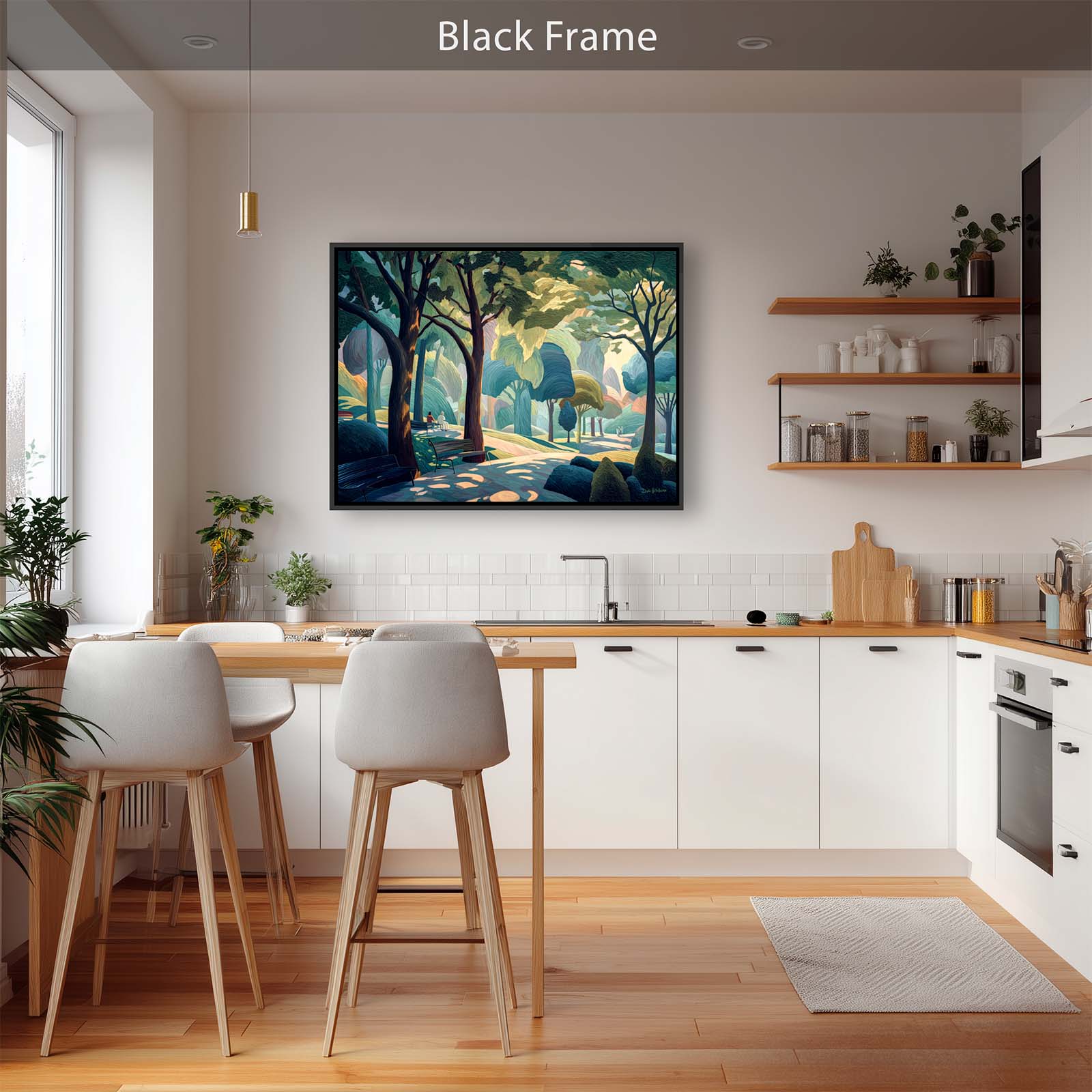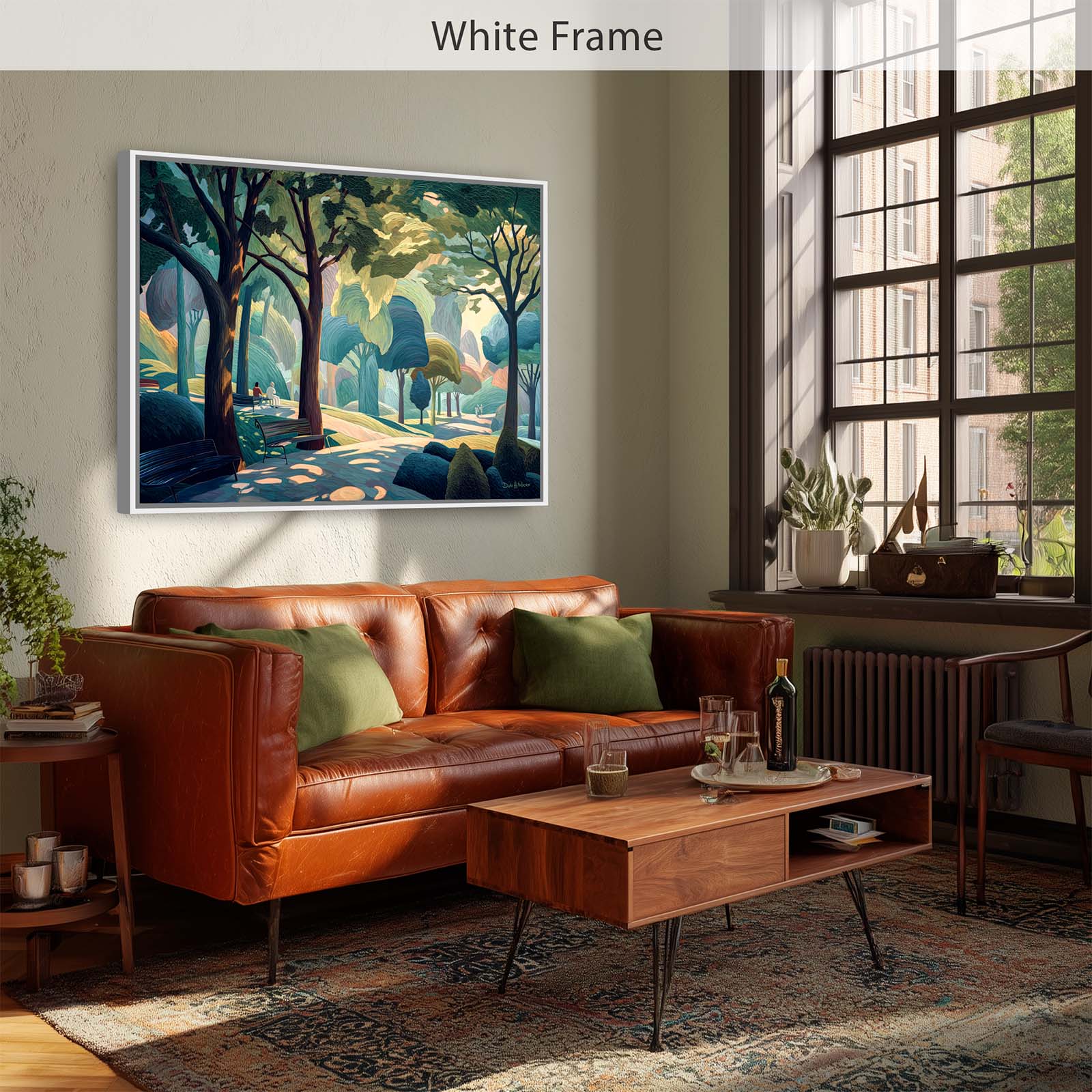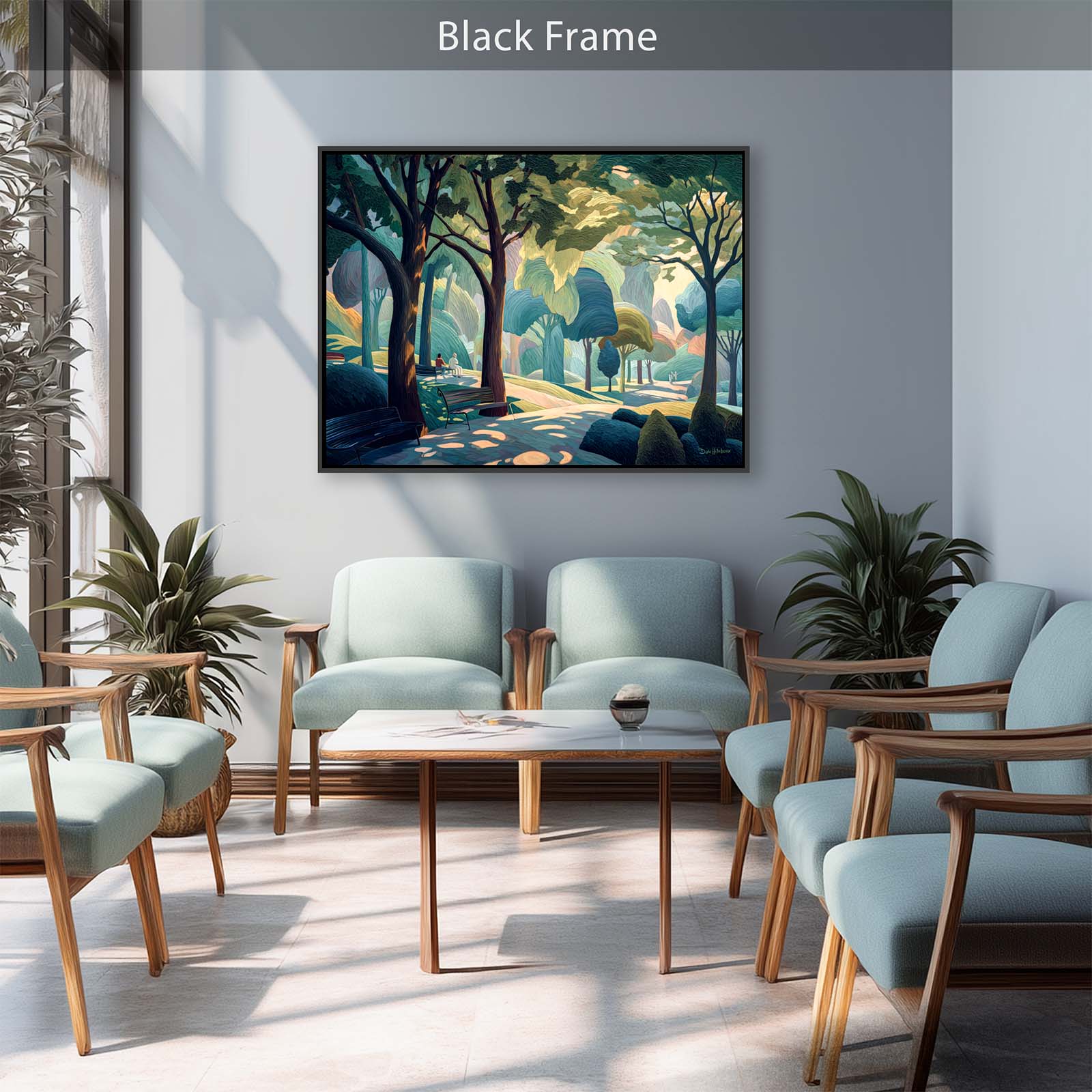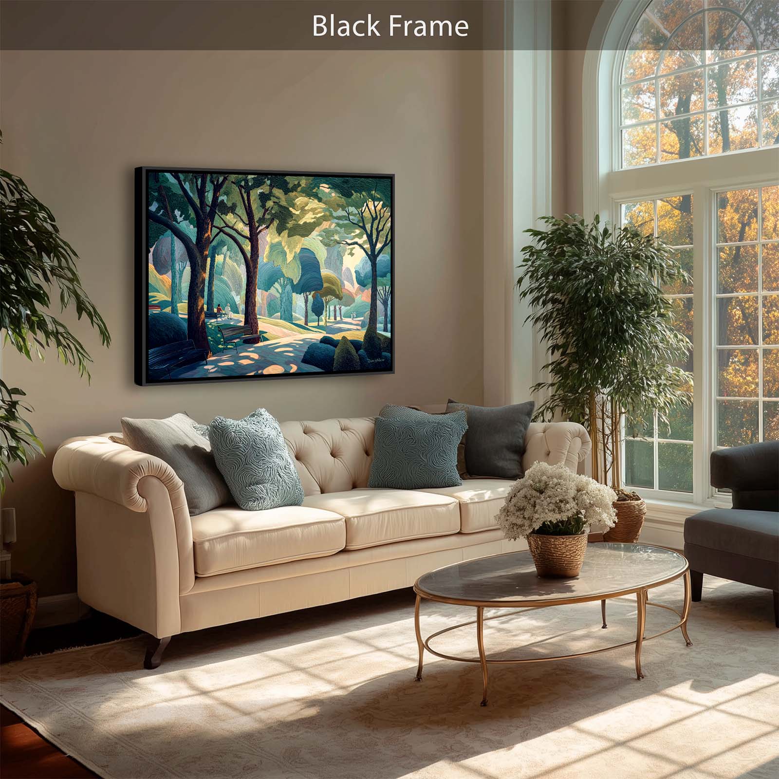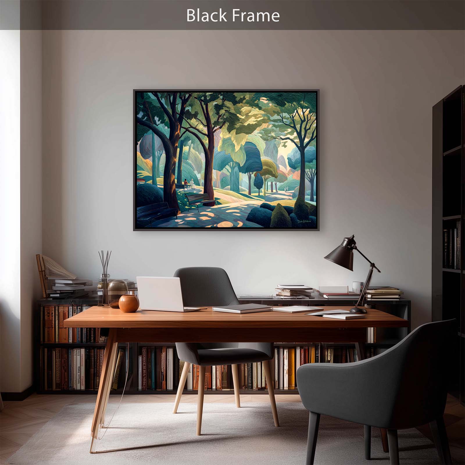 The serene scene captures a sunny day in the park, with winding paths, soft tree forms, and dappled sunlight filtering through the canopy above. Delicate tones and thoughtful composition create an atmosphere that’s both calming and visually engaging—full of delightful shapes and subtle contrasts. It’s a piece that complements almost any interior, from modern minimalism to warm traditional decor.