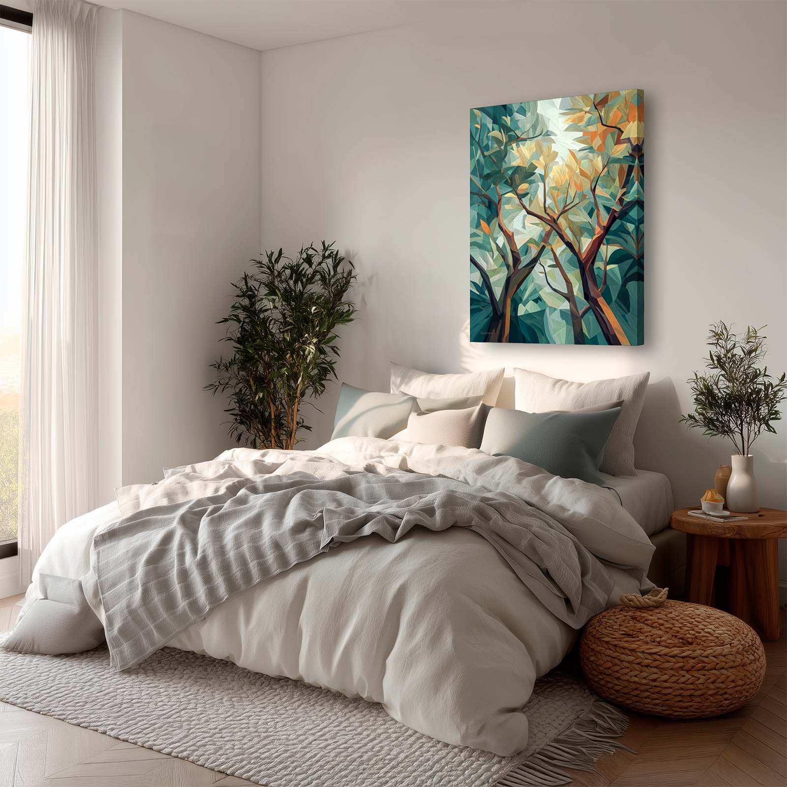 Bring the quiet magic of the forest into your home with this elegant, stretched-canvas art print. Playful, intertwining tree limbs reach upward in graceful arcs, their delicate forms painted in soft, refined colors that harmonize effortlessly with almost any interior design.