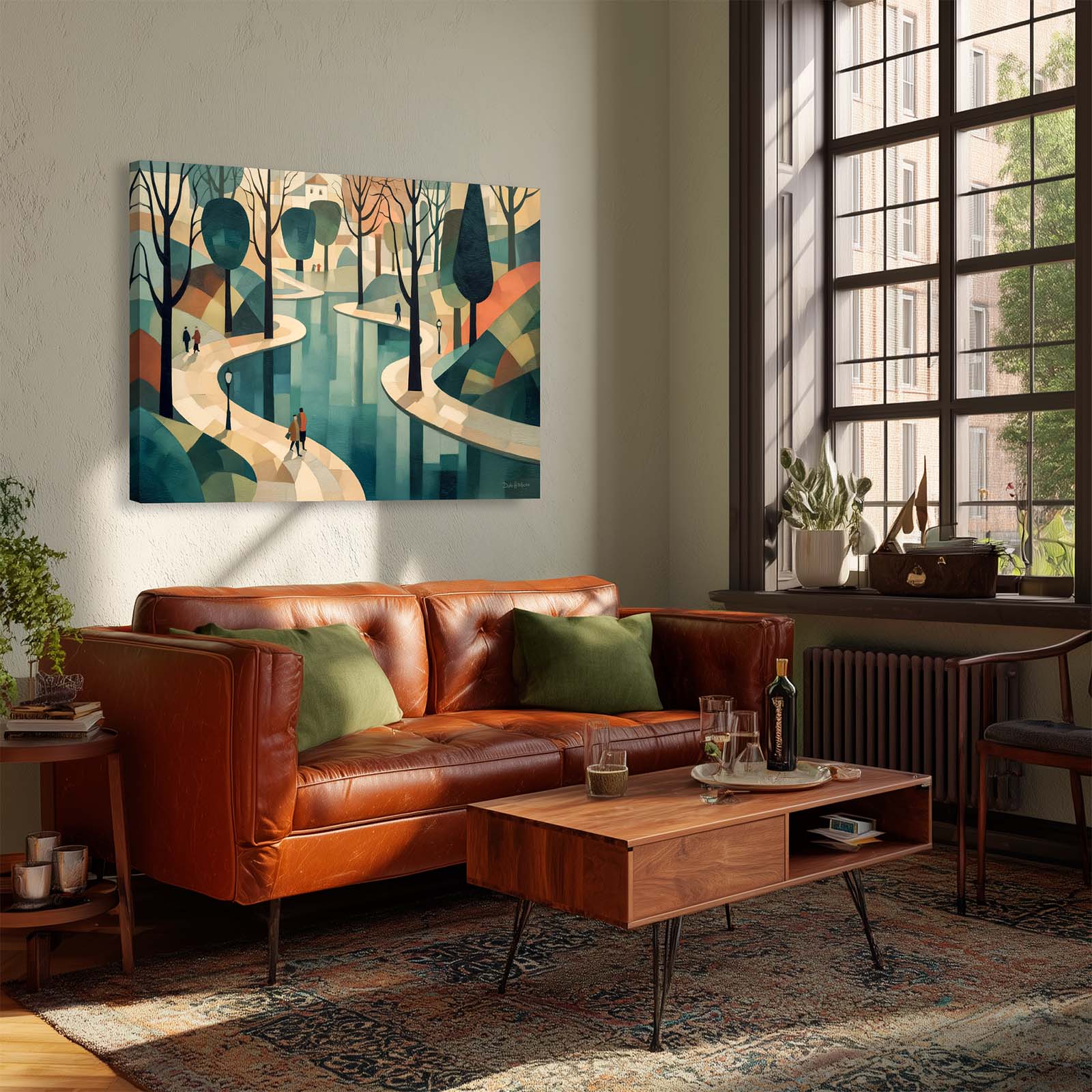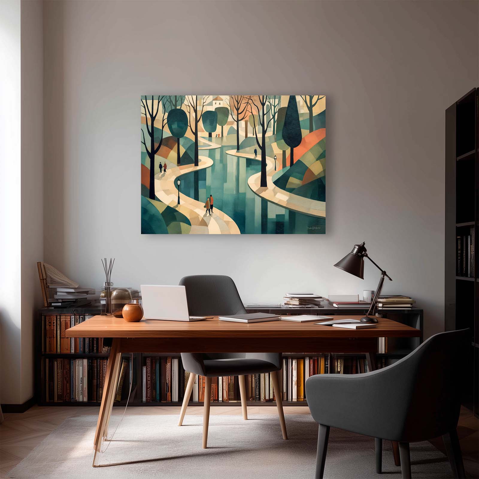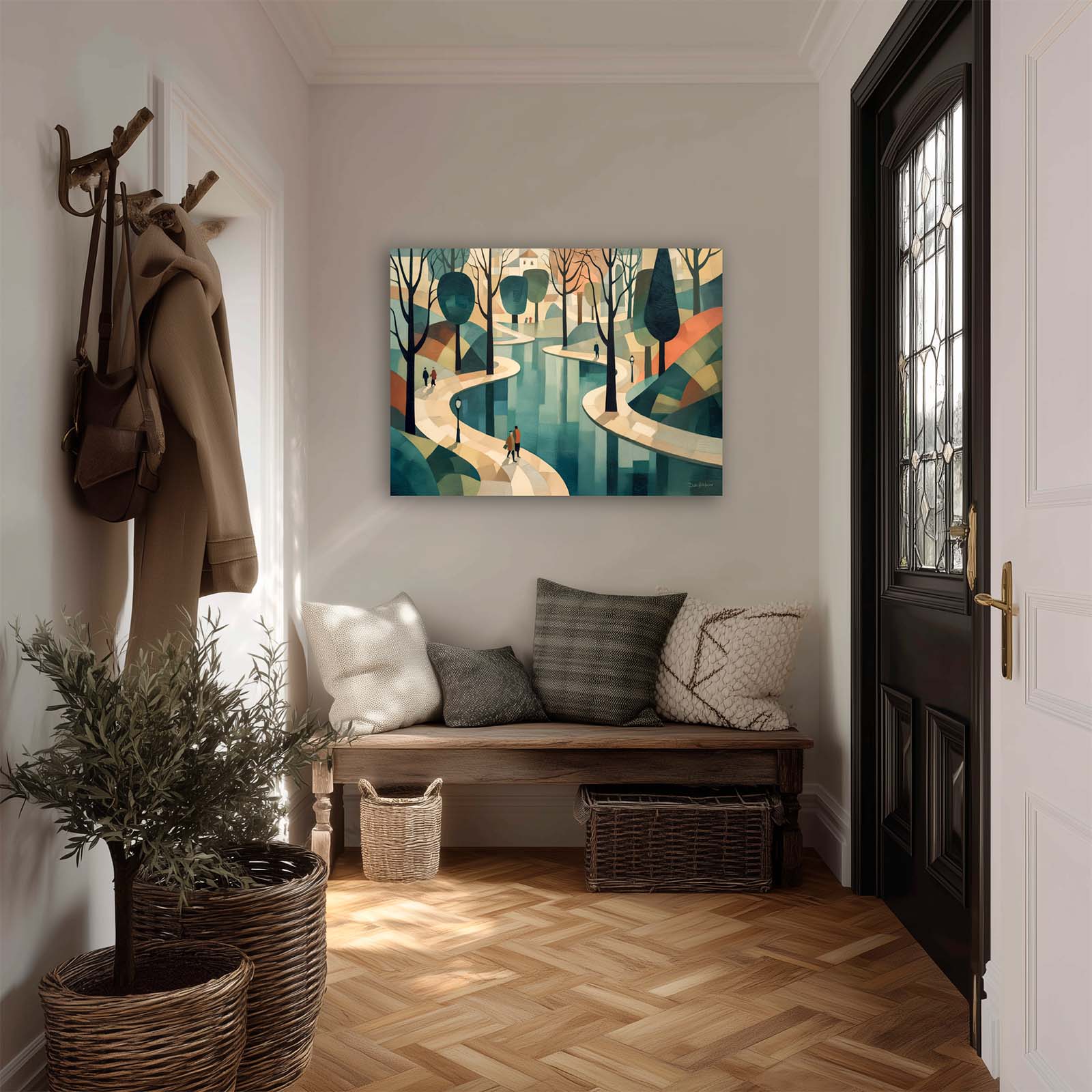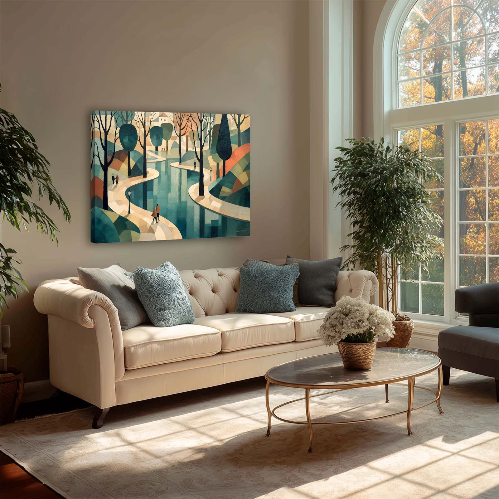 Add life and charm to any room with this semi-cubist canvas print, capturing people strolling beside a serene river in a beautiful city park. Perfect for home or office décor.