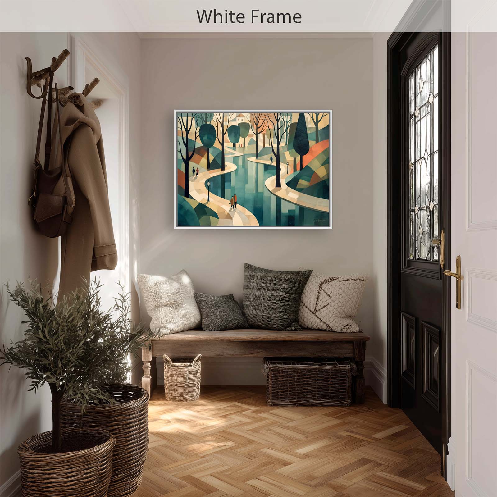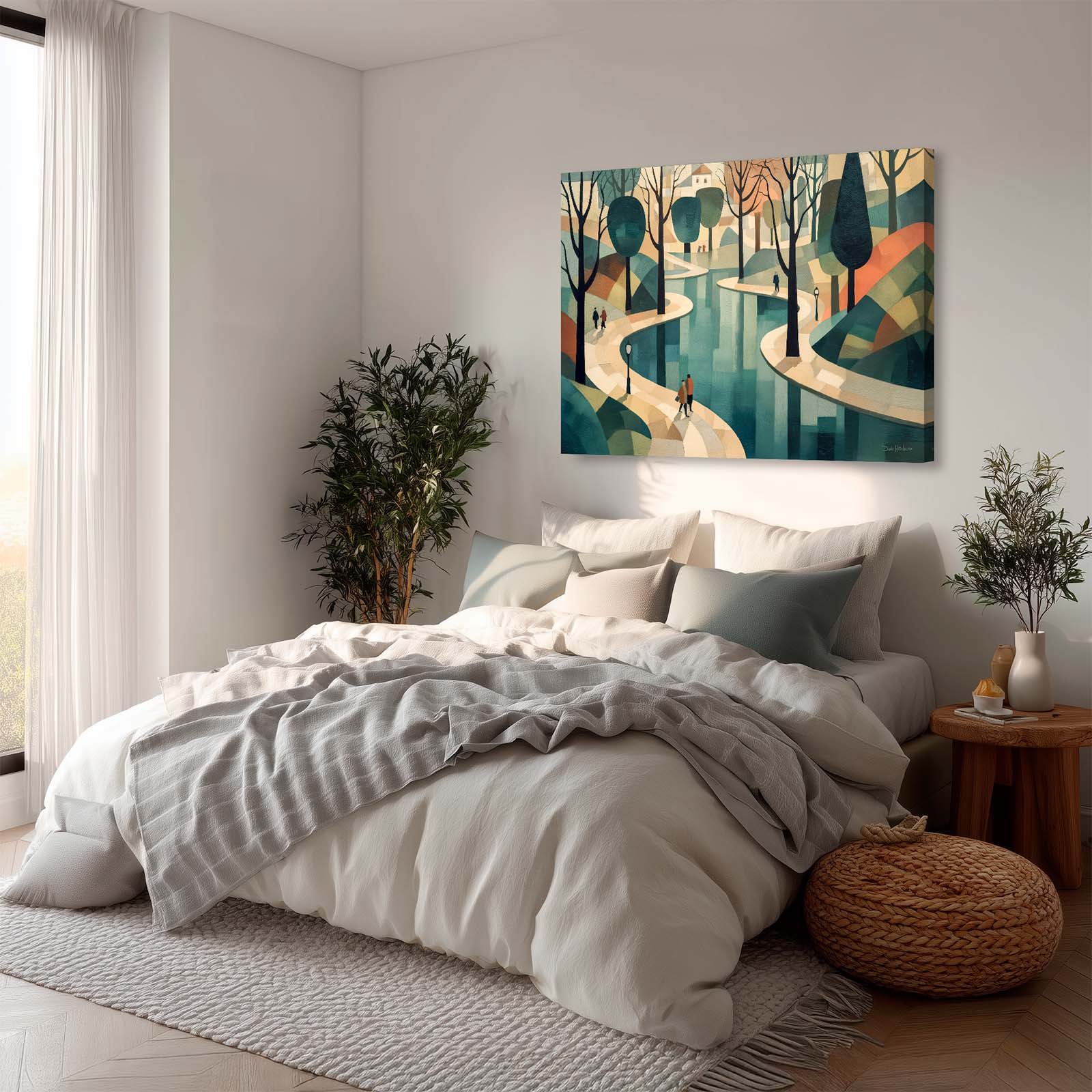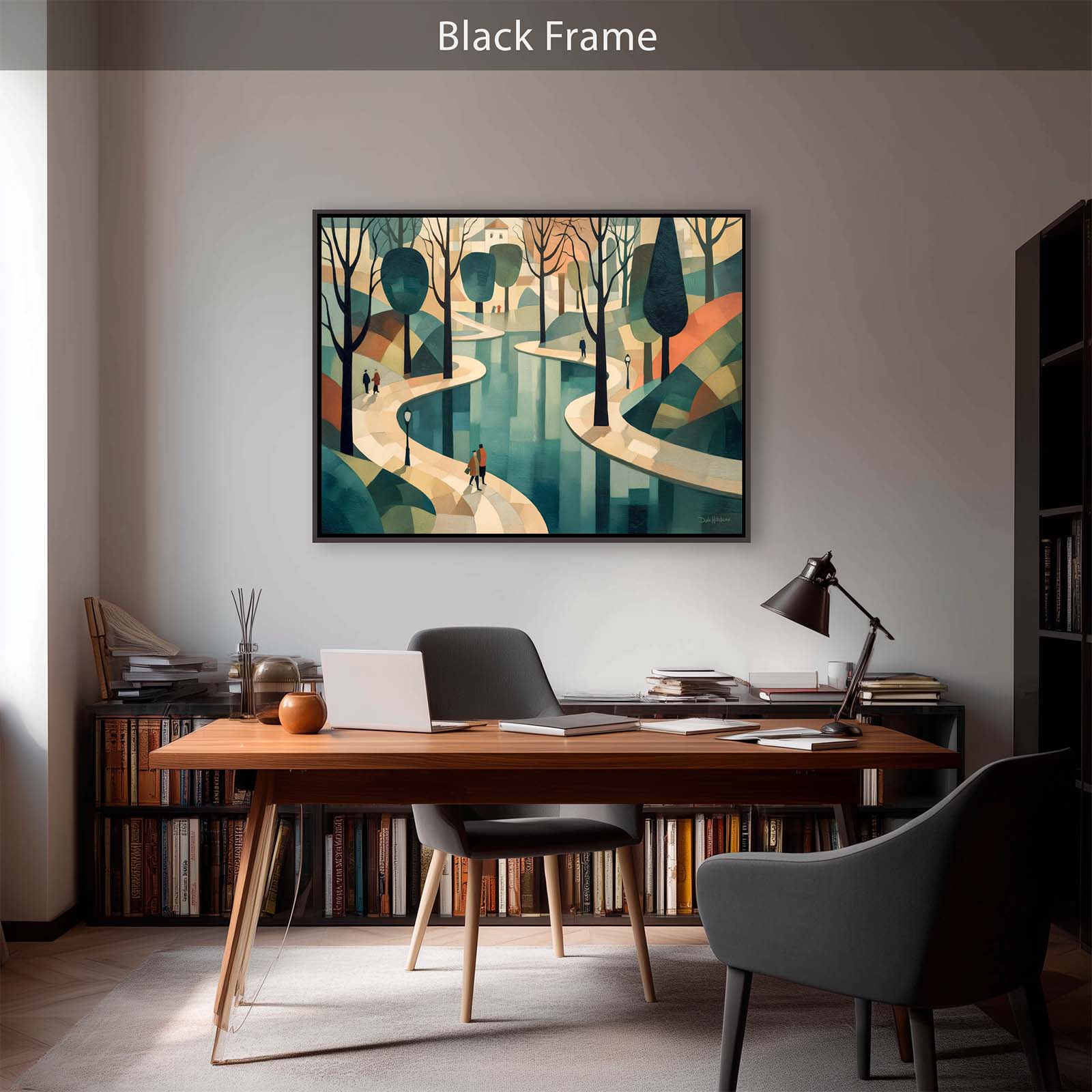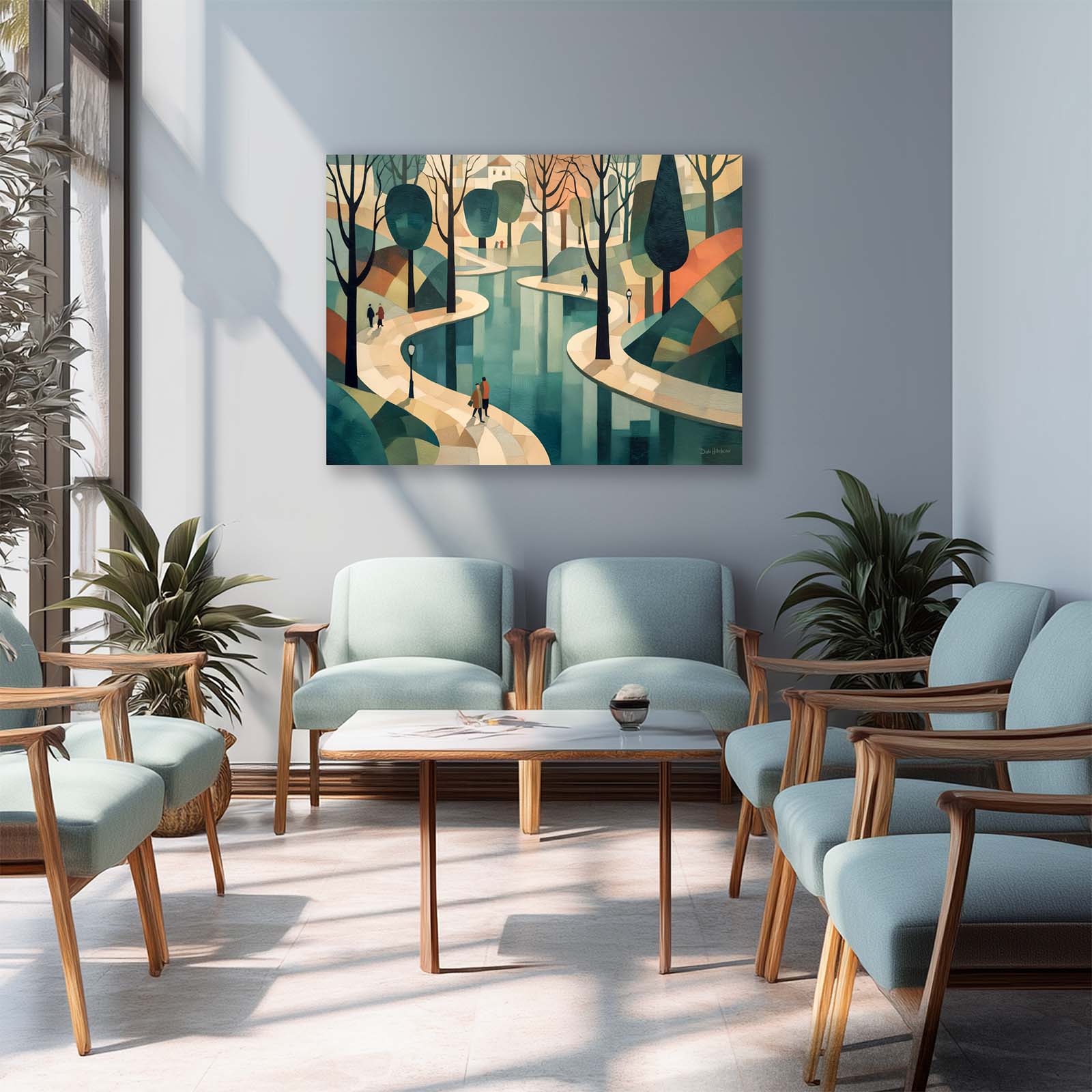 Add life and charm to any room with this semi-cubist canvas print, capturing people strolling beside a serene river in a beautiful city park. Perfect for home or office décor.