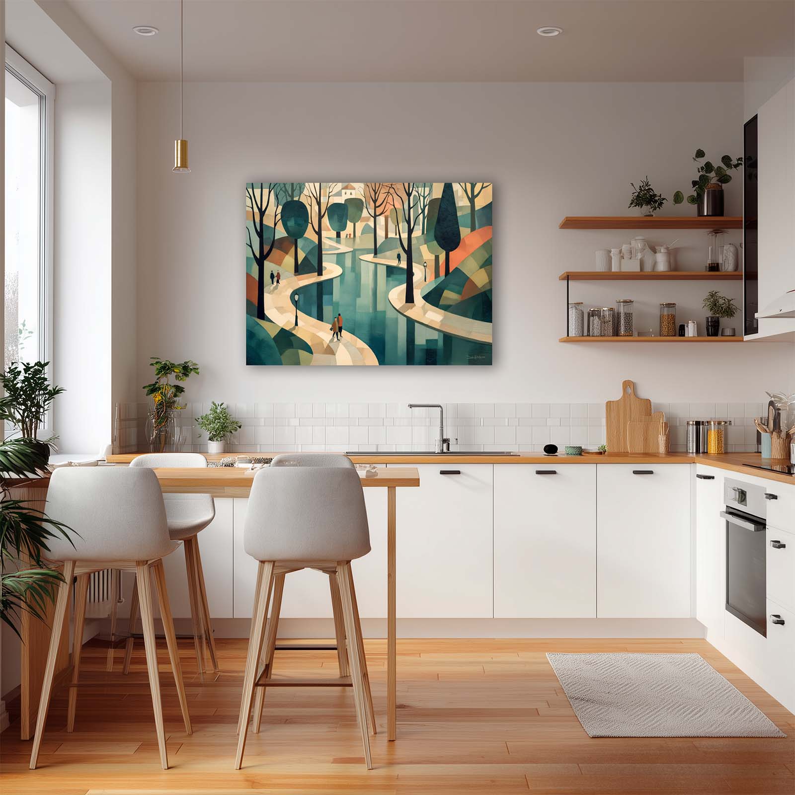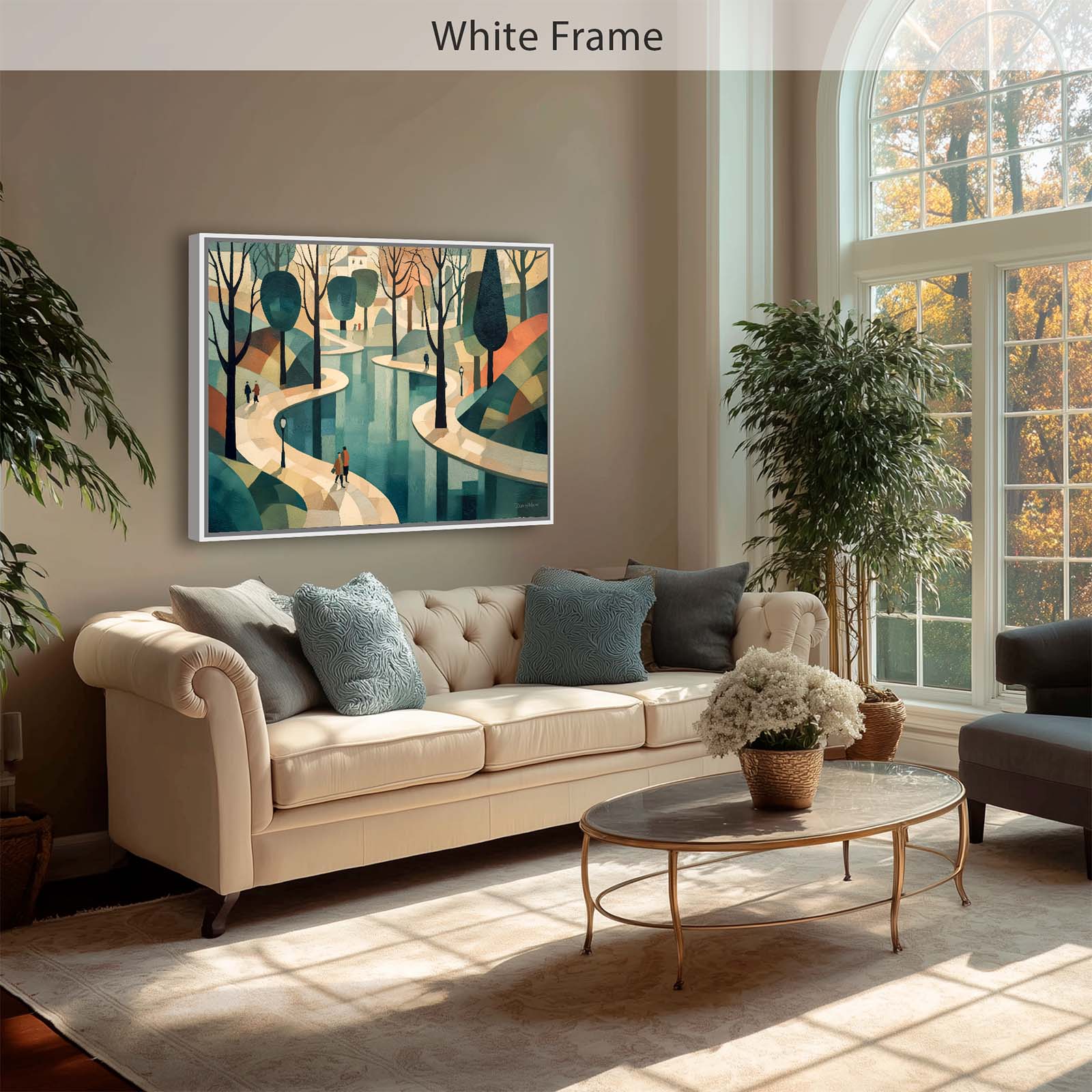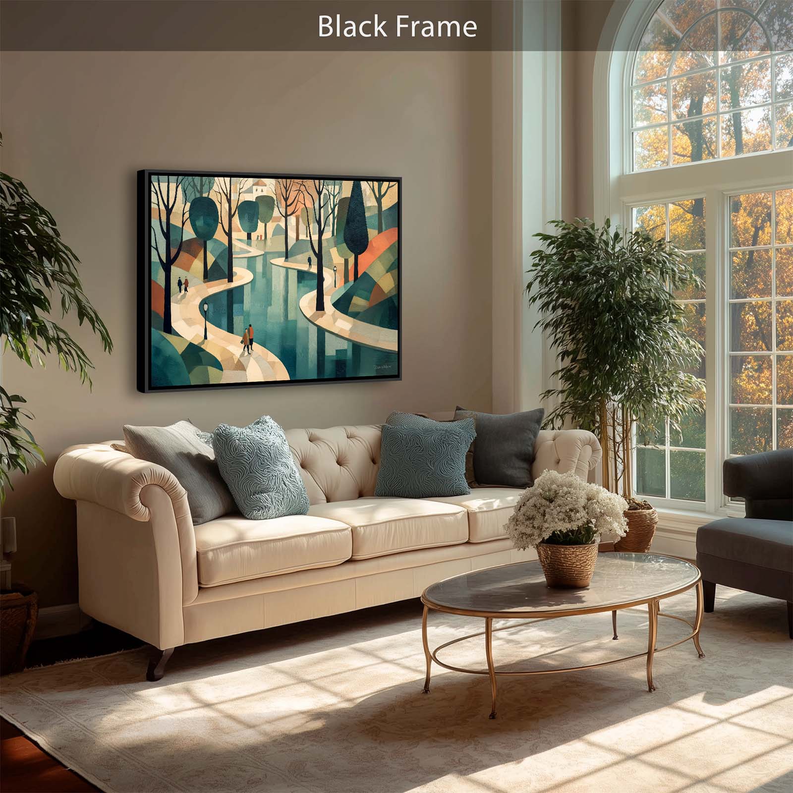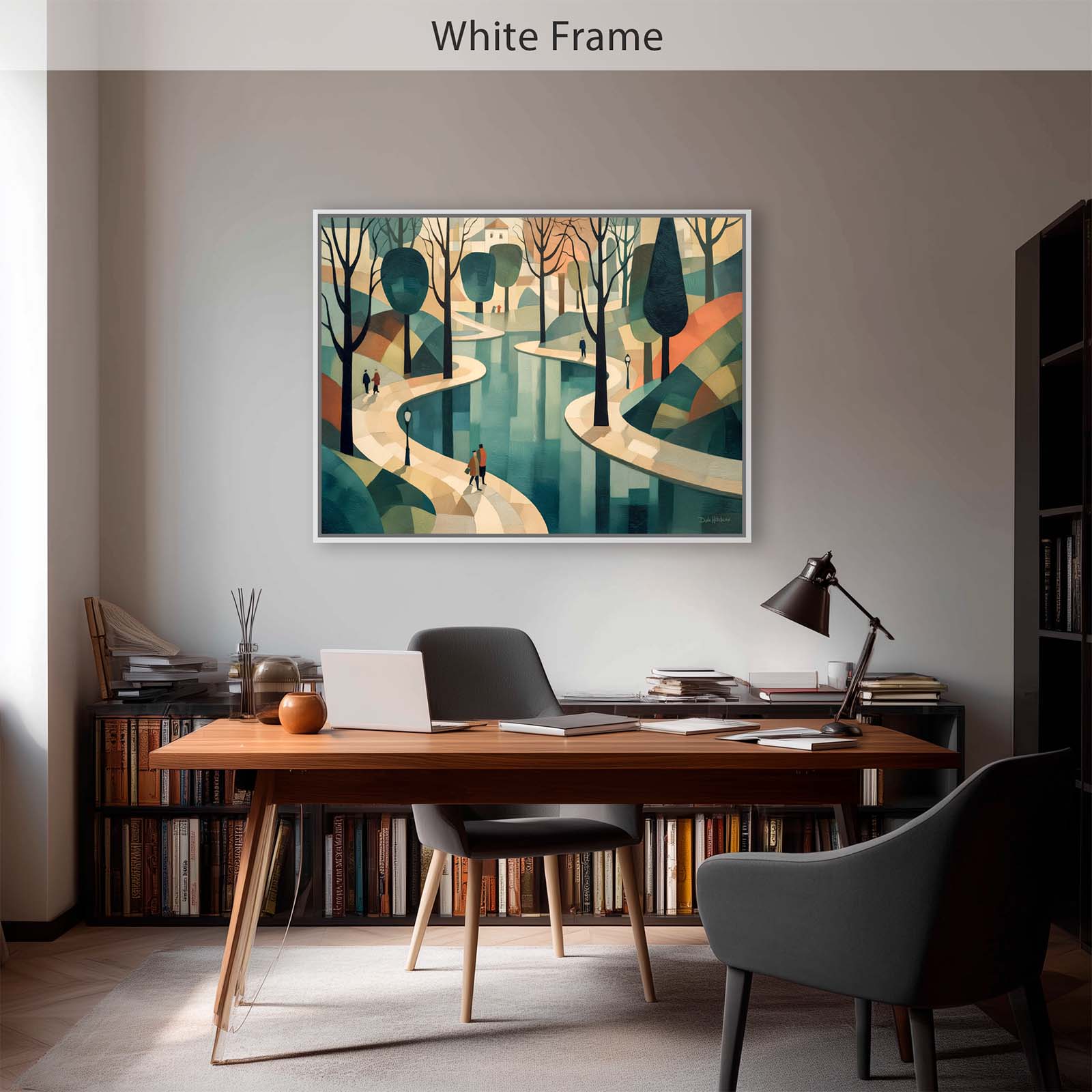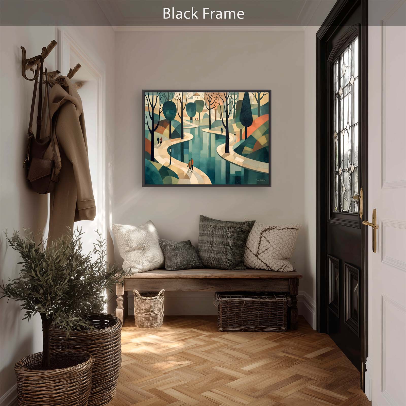 Add life and charm to any room with this semi-cubist canvas print, capturing people strolling beside a serene river in a beautiful city park. Perfect for home or office décor.