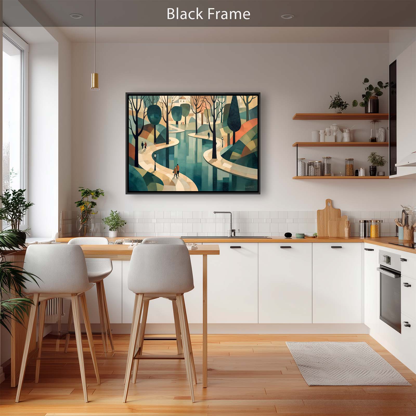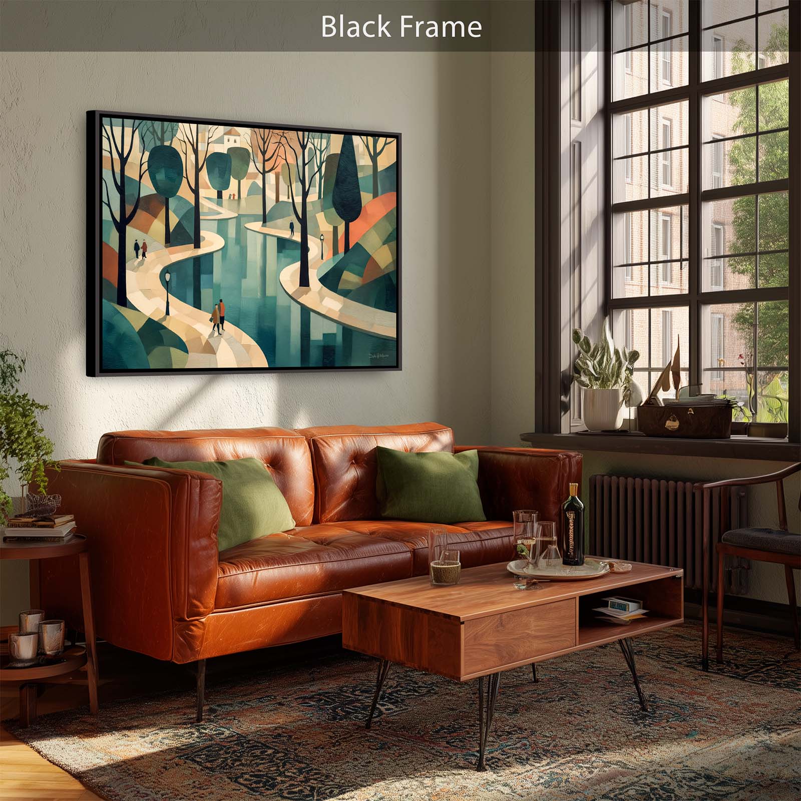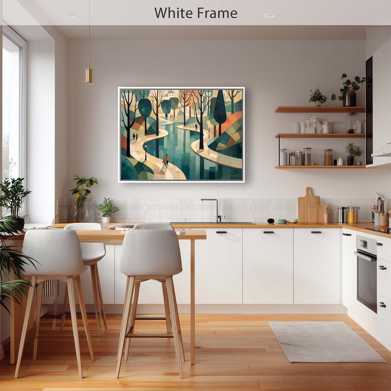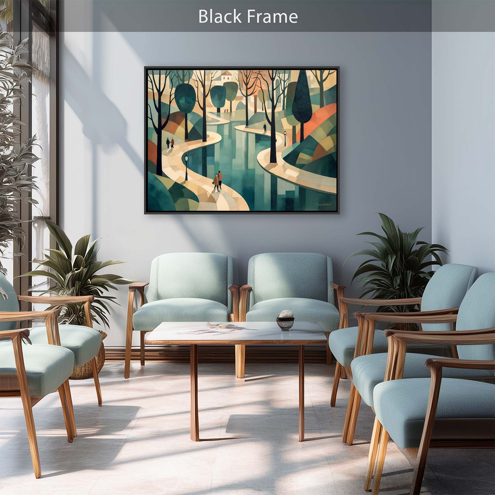 Add life and charm to any room with this semi-cubist canvas print, capturing people strolling beside a serene river in a beautiful city park. Perfect for home or office décor.