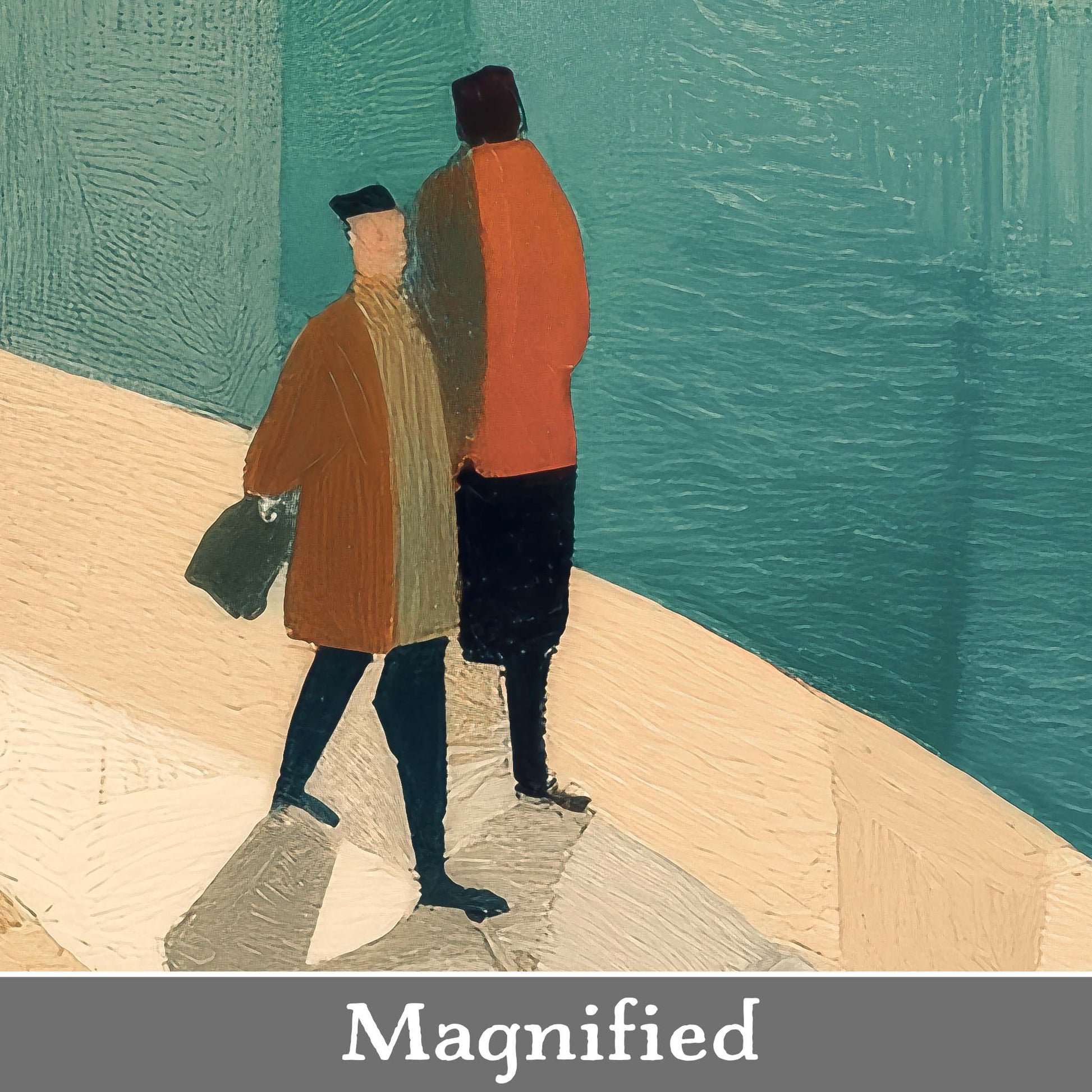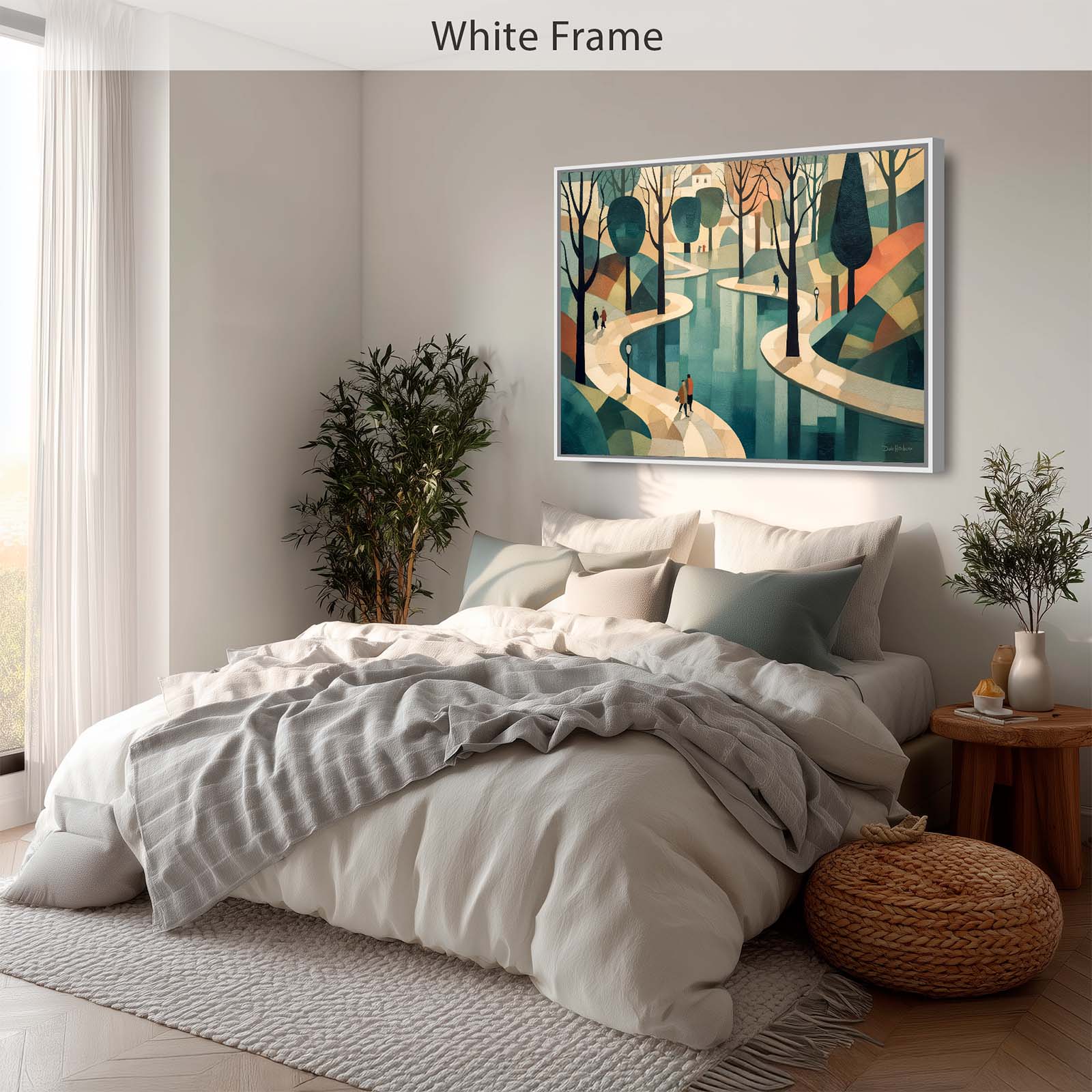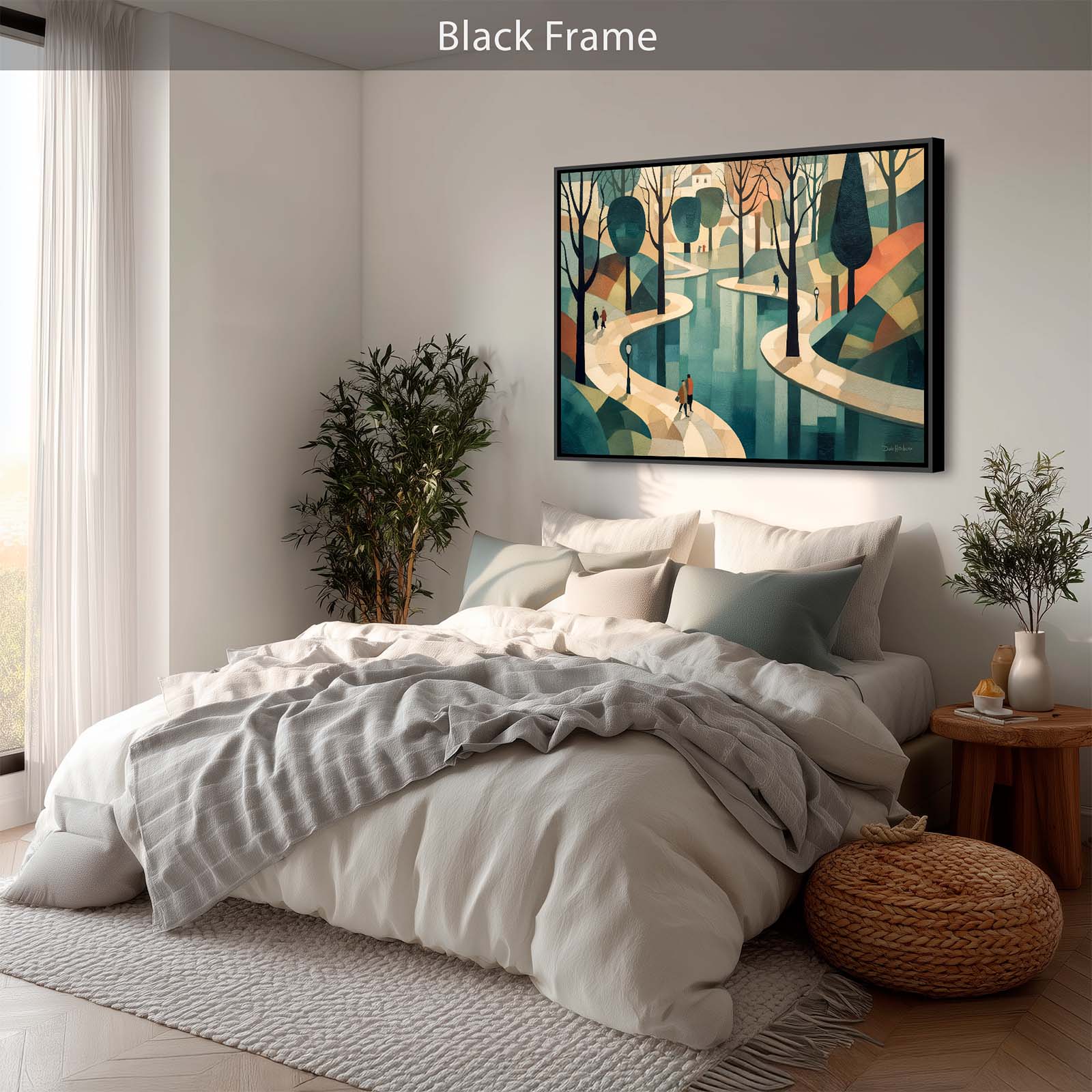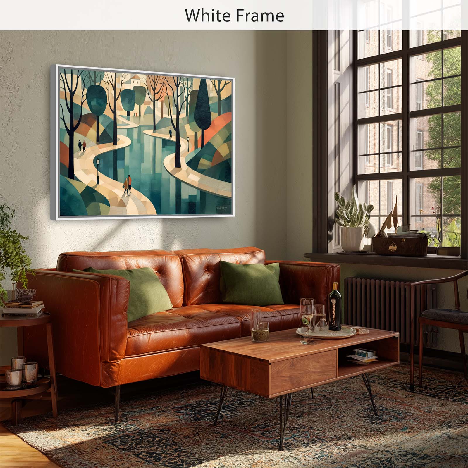 Add life and charm to any room with this semi-cubist canvas print, capturing people strolling beside a serene river in a beautiful city park. Perfect for home or office décor.