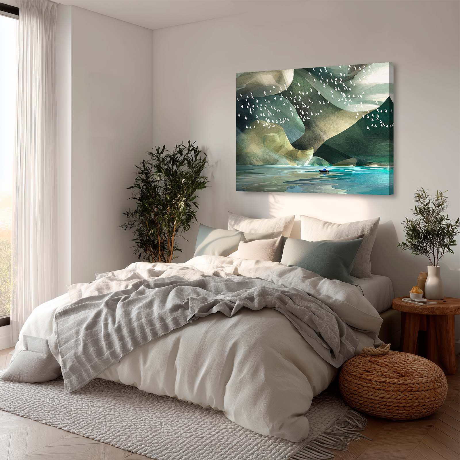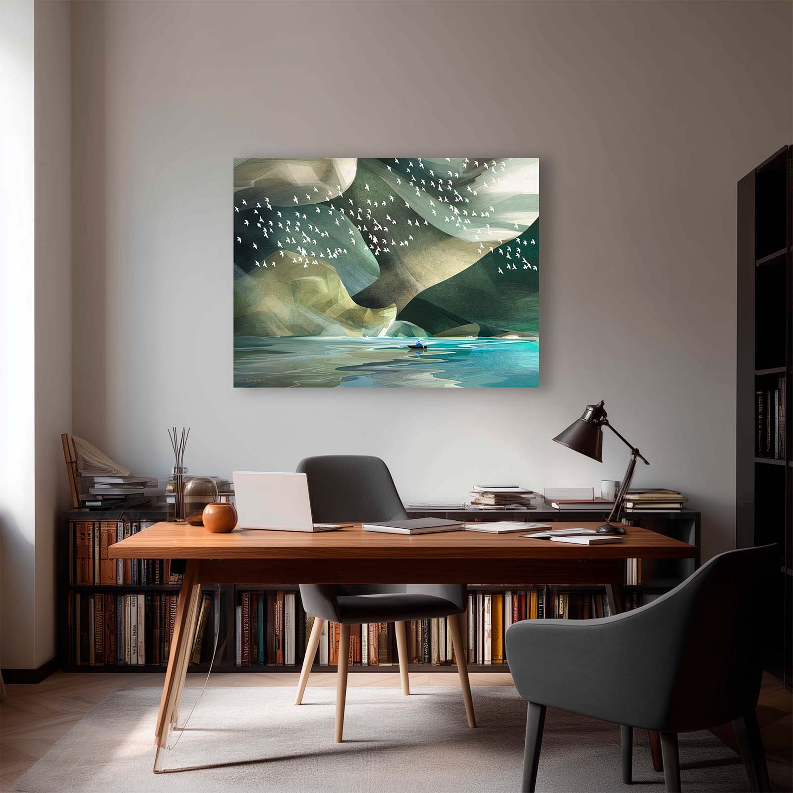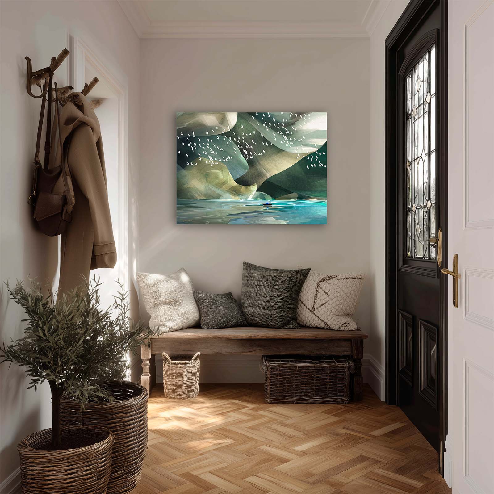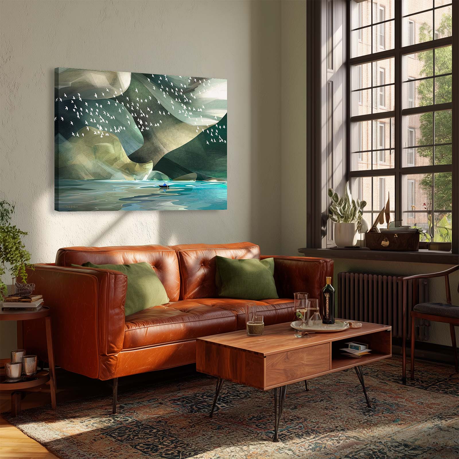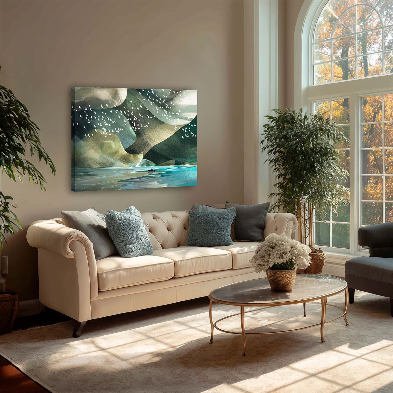 This detailed canvas print captures a solitary boater drifting beneath majestic seaside cliffs as a flock of seabirds arcs gracefully above. The delicate play of light and shadow brings movement and stillness together in perfect balance—creating a peaceful yet dynamic scene full of subtle, delightful shapes. Gentle, refined colors make this piece a harmonious fit for almost any room or décor style.