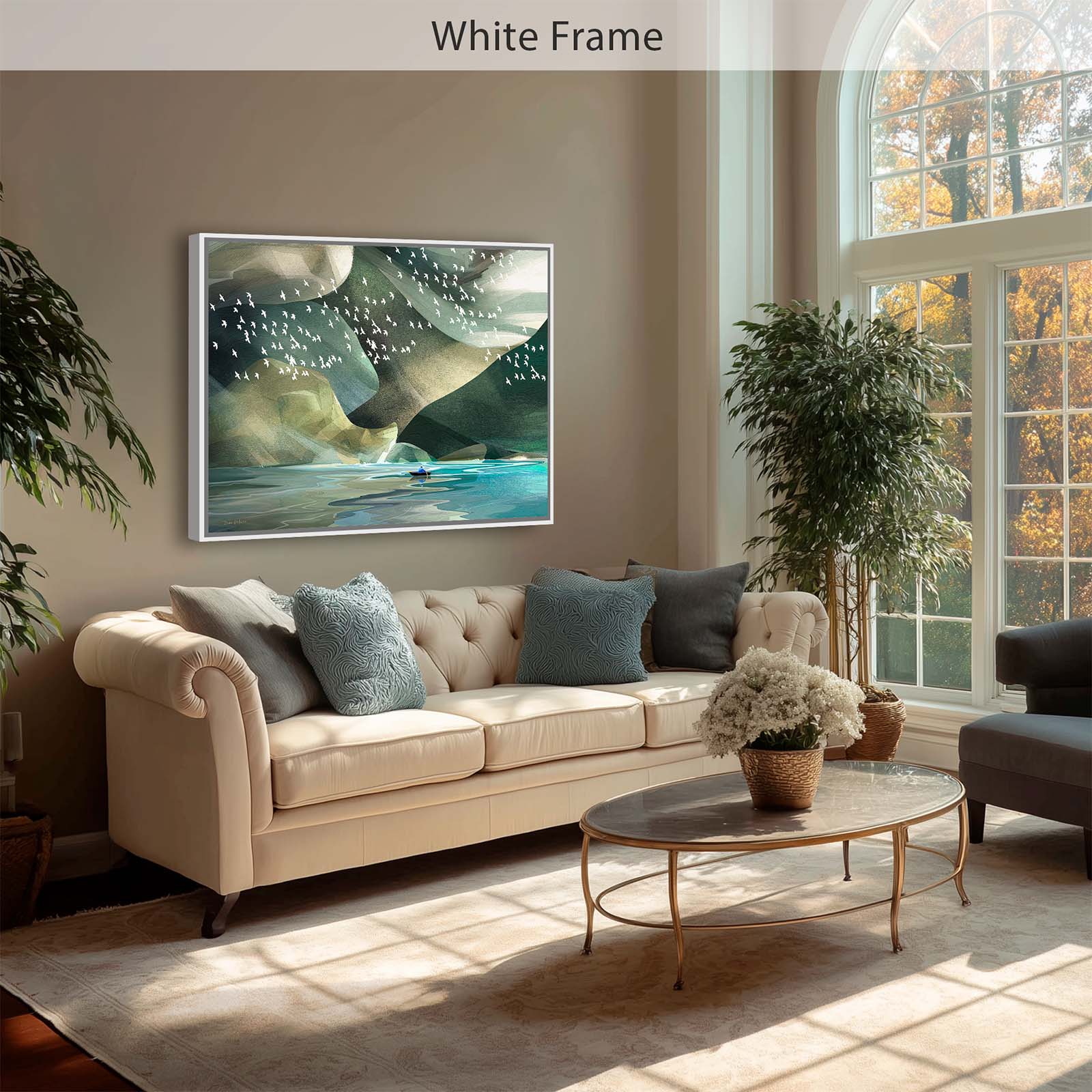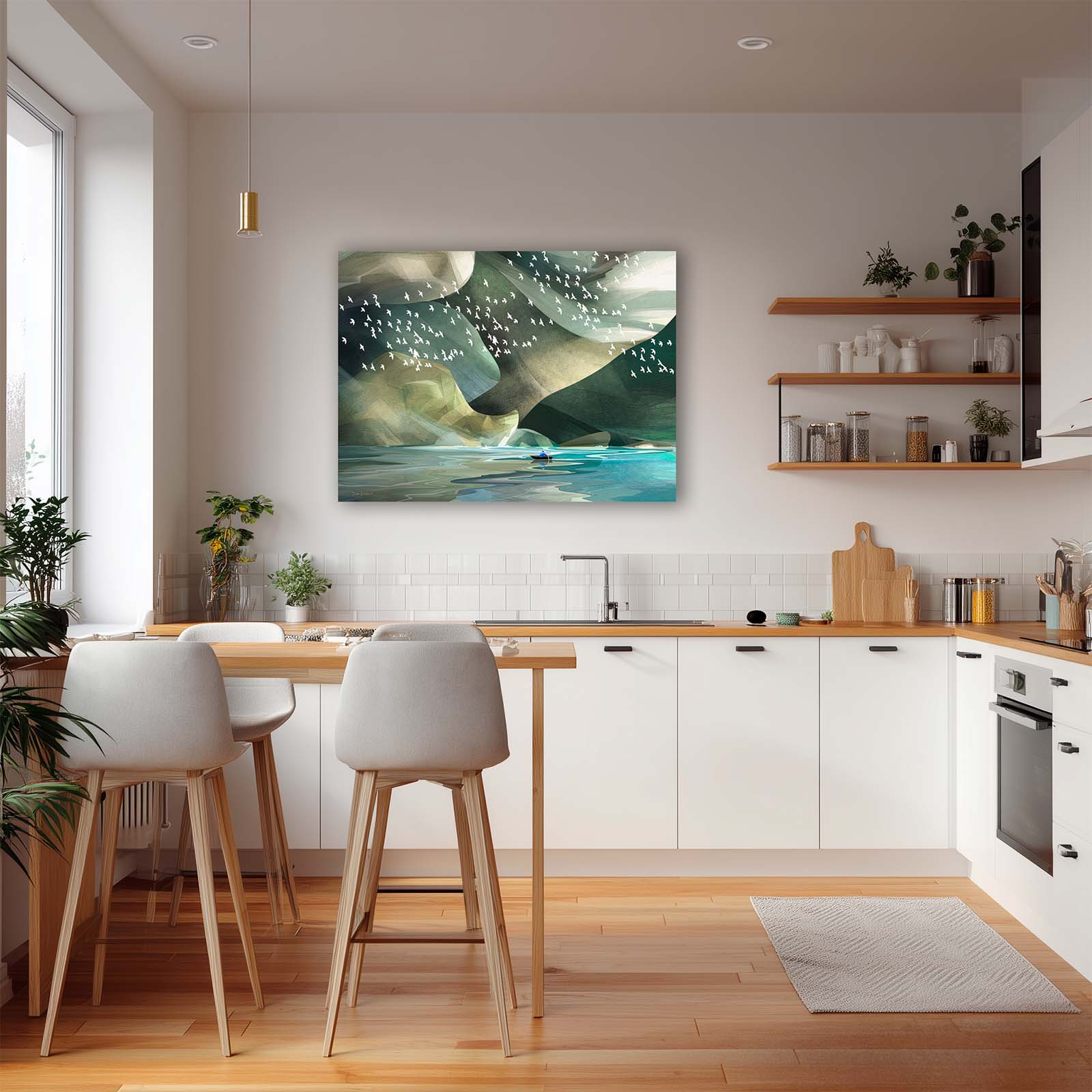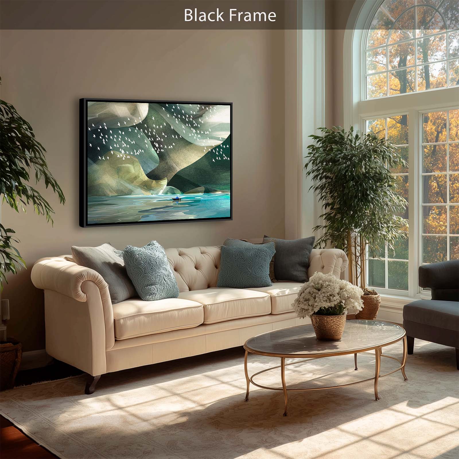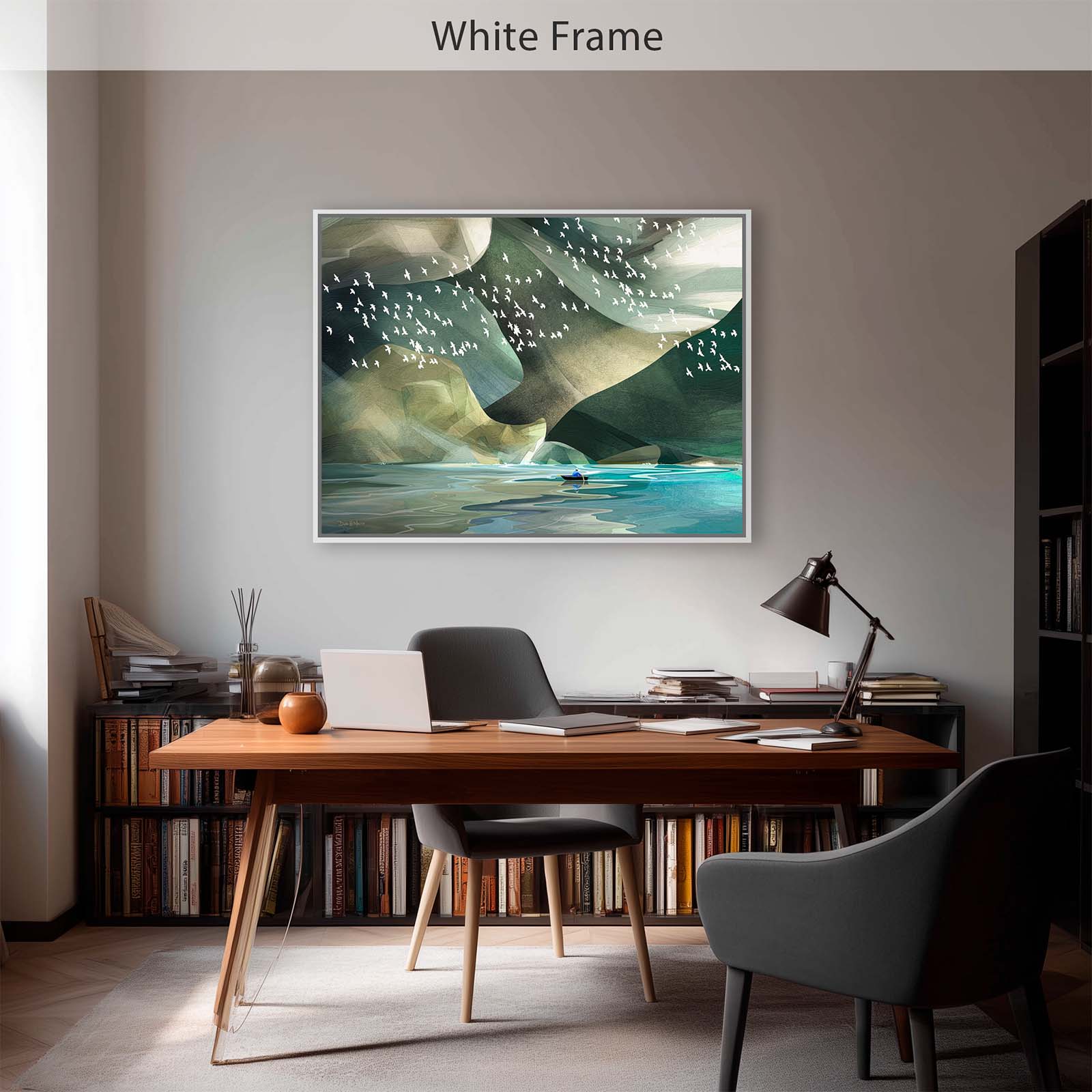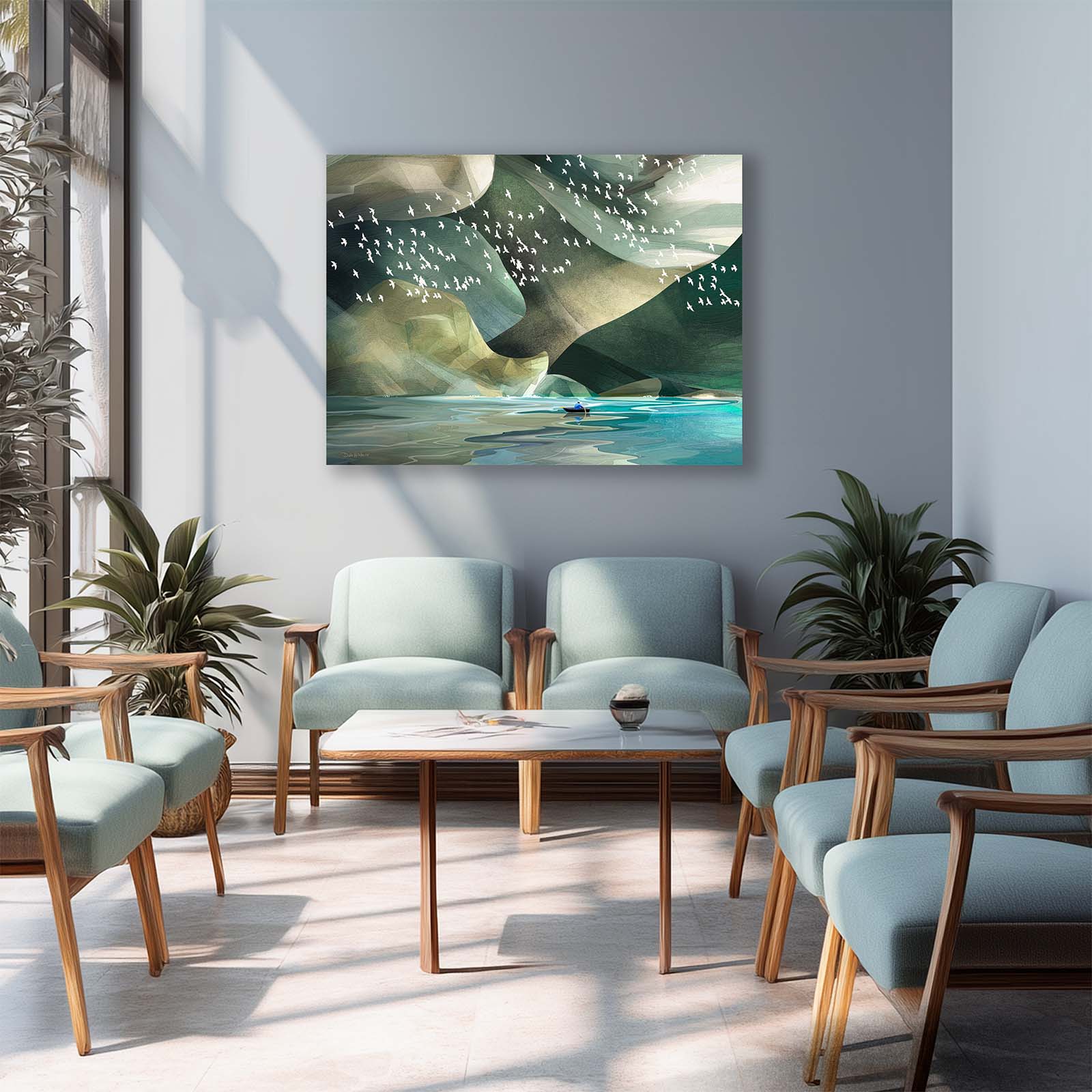 This detailed canvas print captures a solitary boater drifting beneath majestic seaside cliffs as a flock of seabirds arcs gracefully above. The delicate play of light and shadow brings movement and stillness together in perfect balance—creating a peaceful yet dynamic scene full of subtle, delightful shapes. Gentle, refined colors make this piece a harmonious fit for almost any room or décor style.