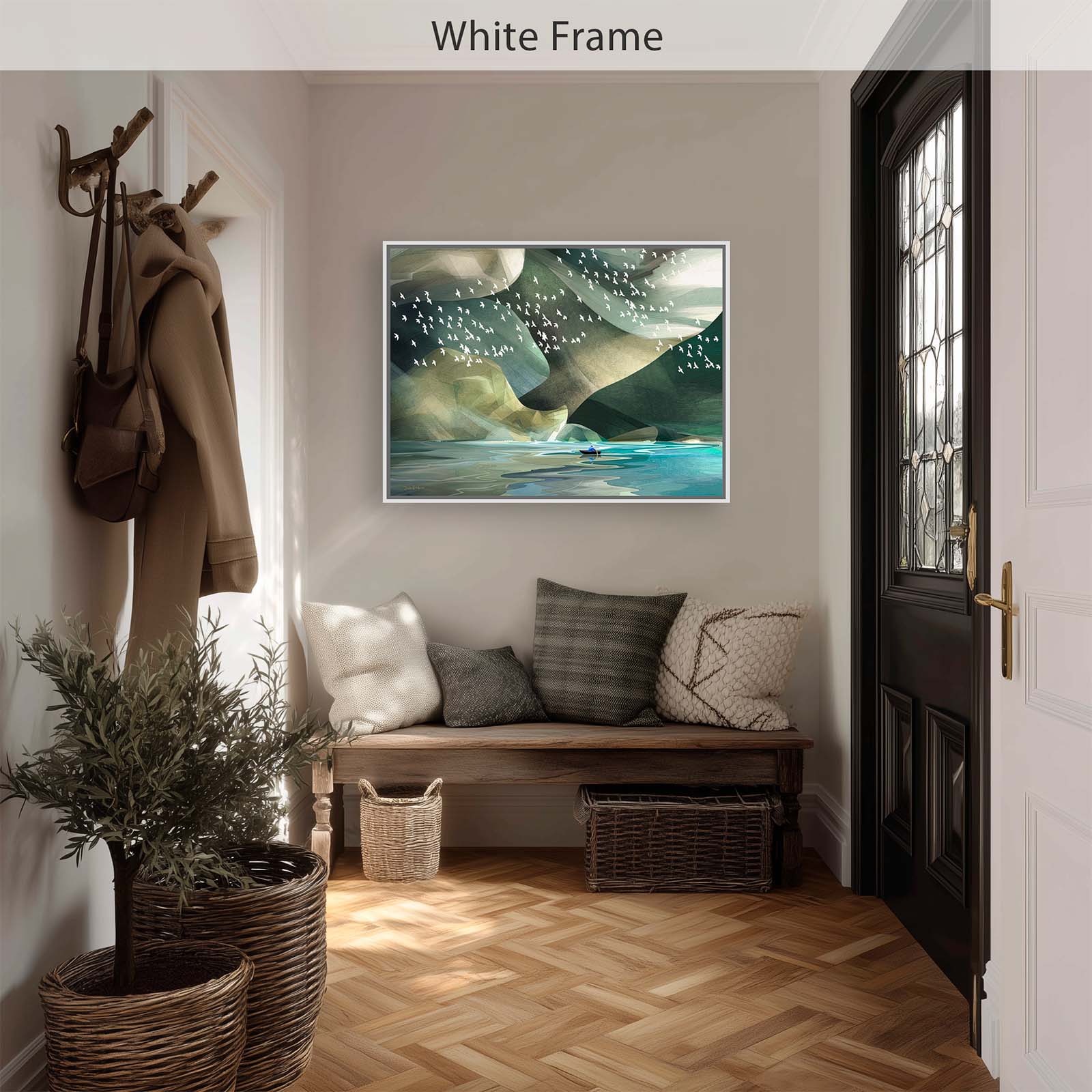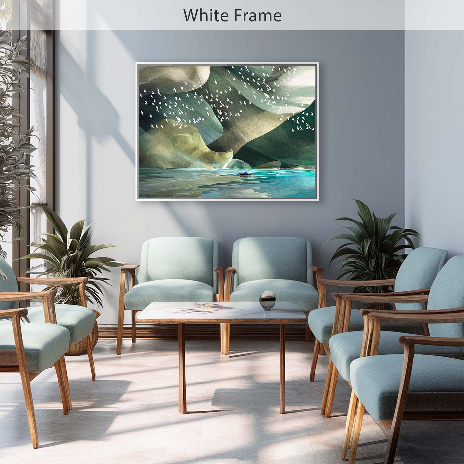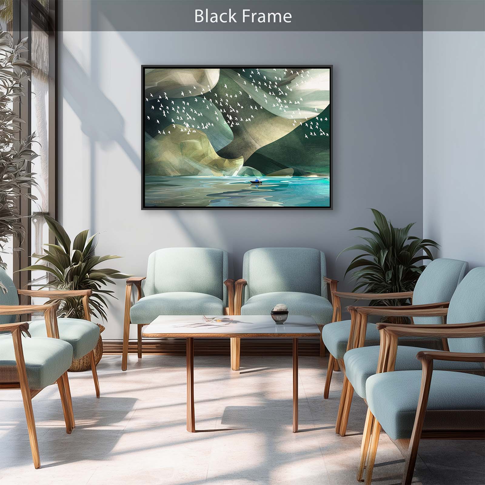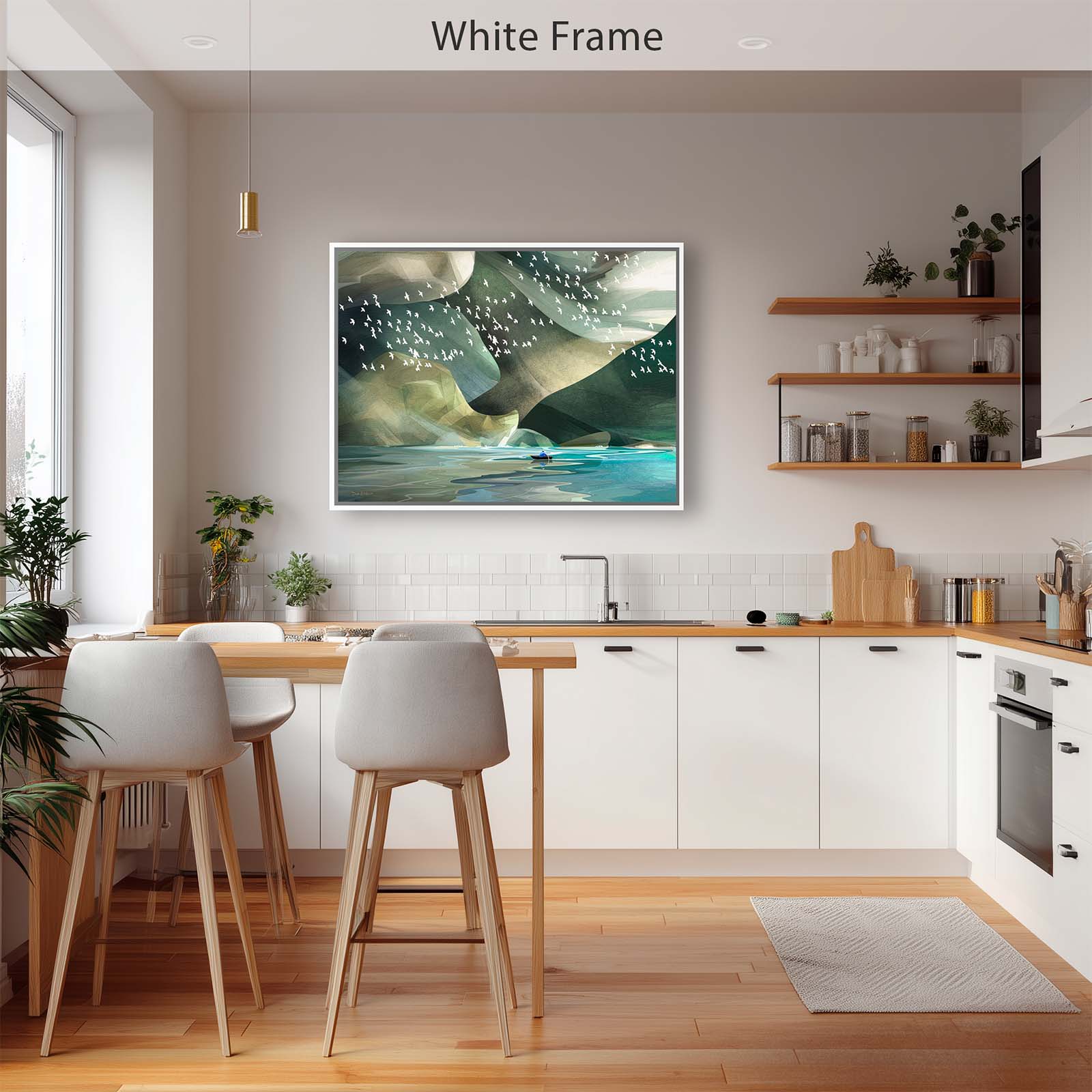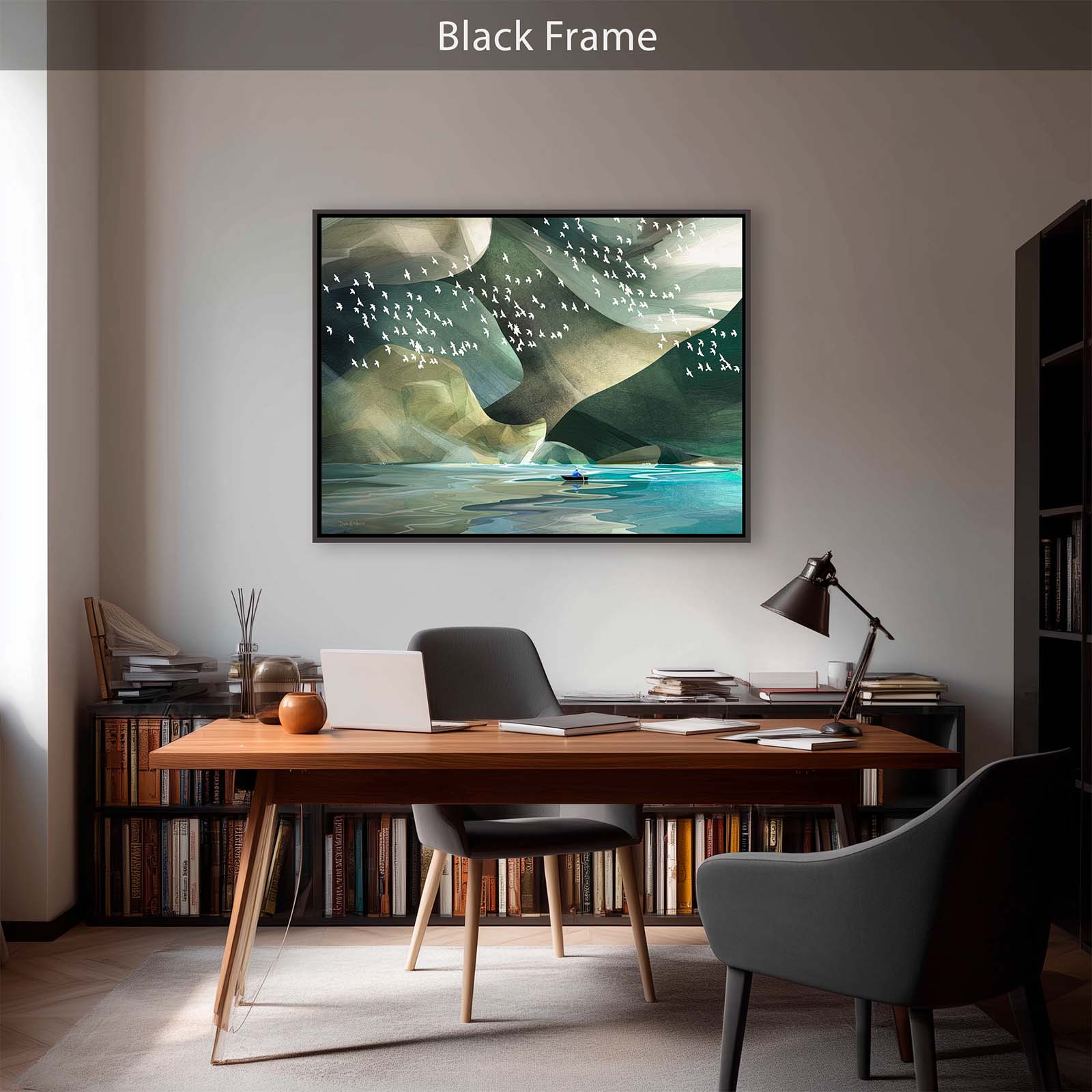 This detailed canvas print captures a solitary boater drifting beneath majestic seaside cliffs as a flock of seabirds arcs gracefully above. The delicate play of light and shadow brings movement and stillness together in perfect balance—creating a peaceful yet dynamic scene full of subtle, delightful shapes. Gentle, refined colors make this piece a harmonious fit for almost any room or décor style.